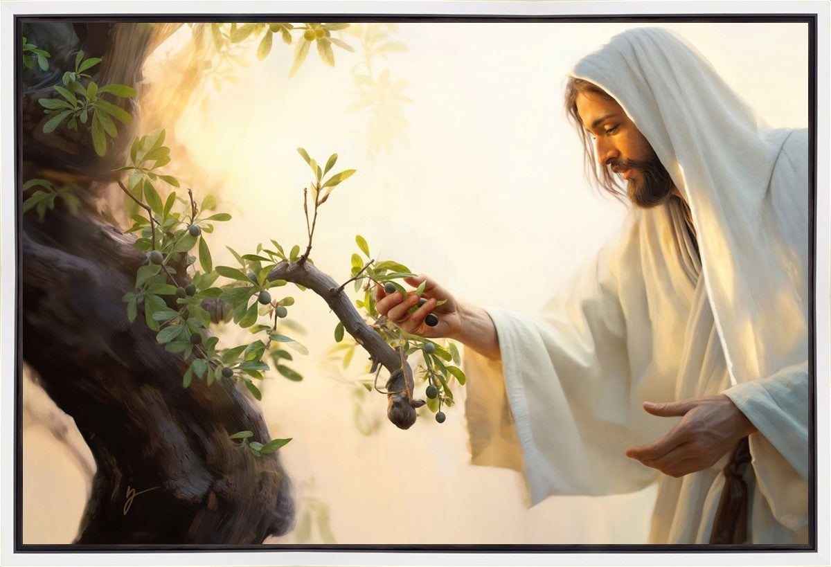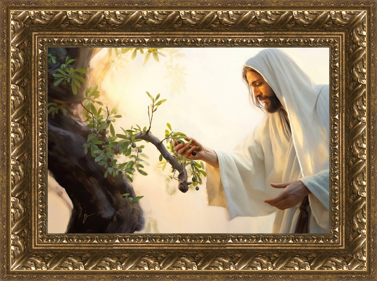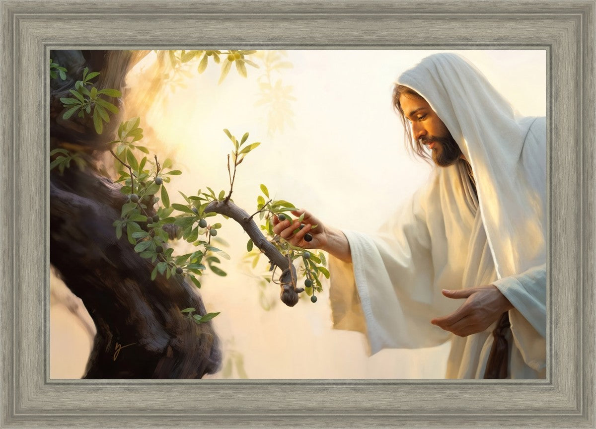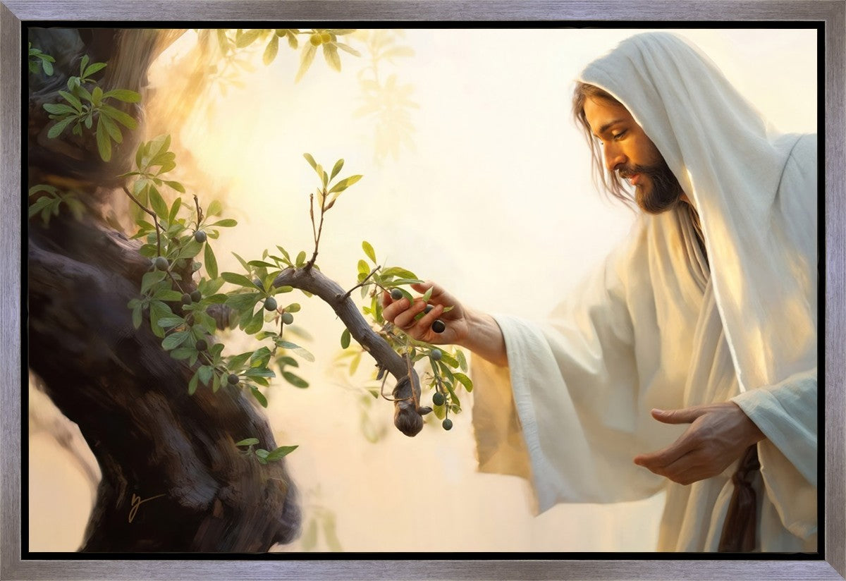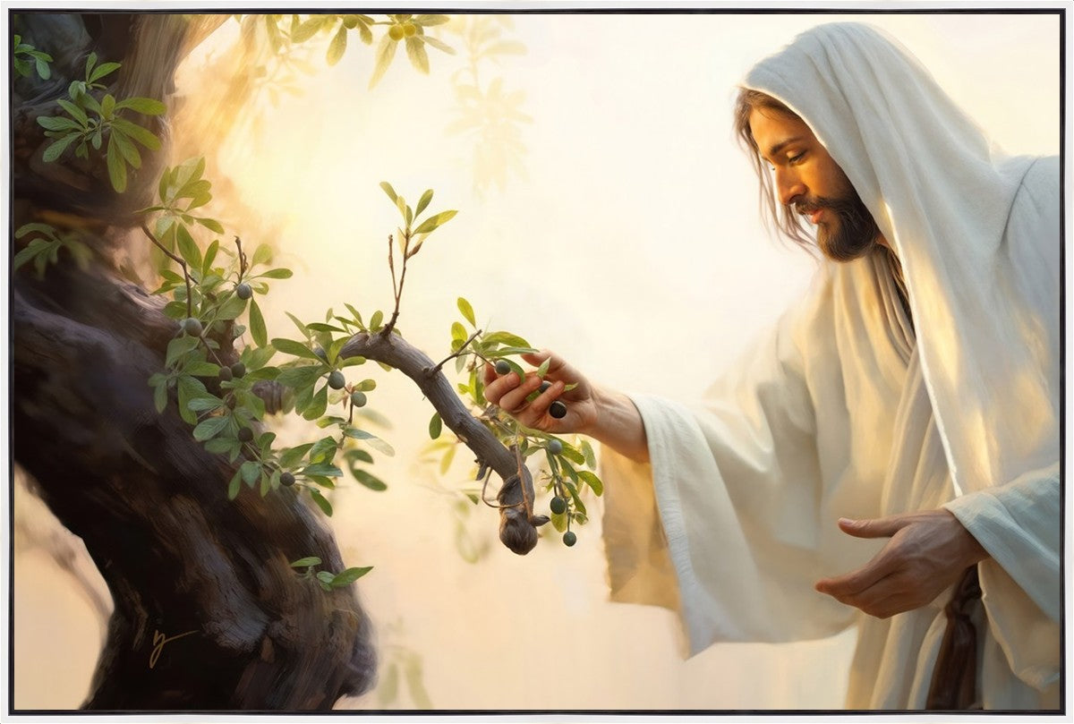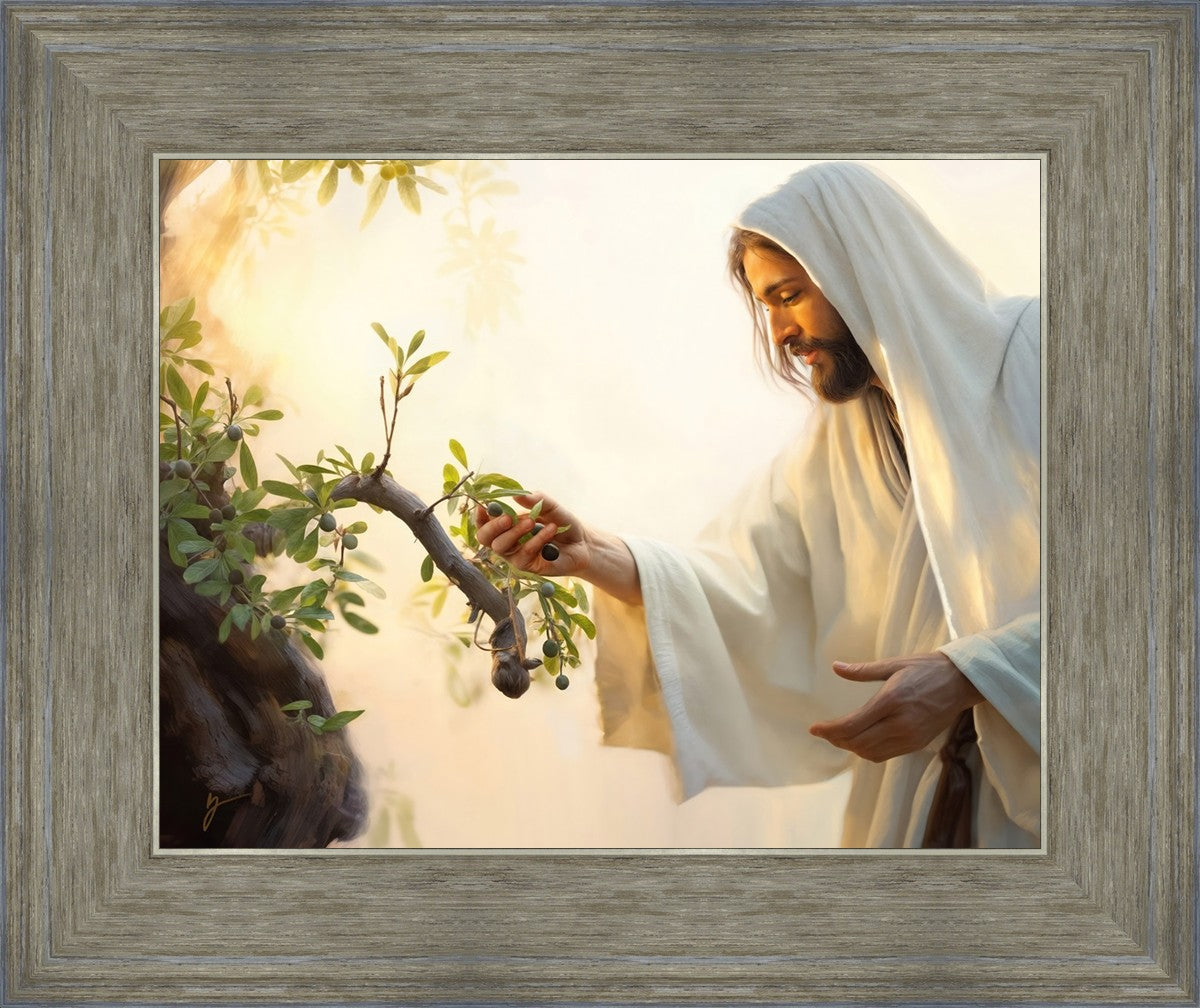 In this captivating moment, Jesus gathers olives from the branches, each fruit representing a soul chosen to be gathered unto Him. The radiant sun heralds the arrival of a new day, symbolizing the dawn of the final harvest where faithful saints are gathered in with the Lord. His head is veiled, a sign of His humility and devotion to the sacred task at hand.