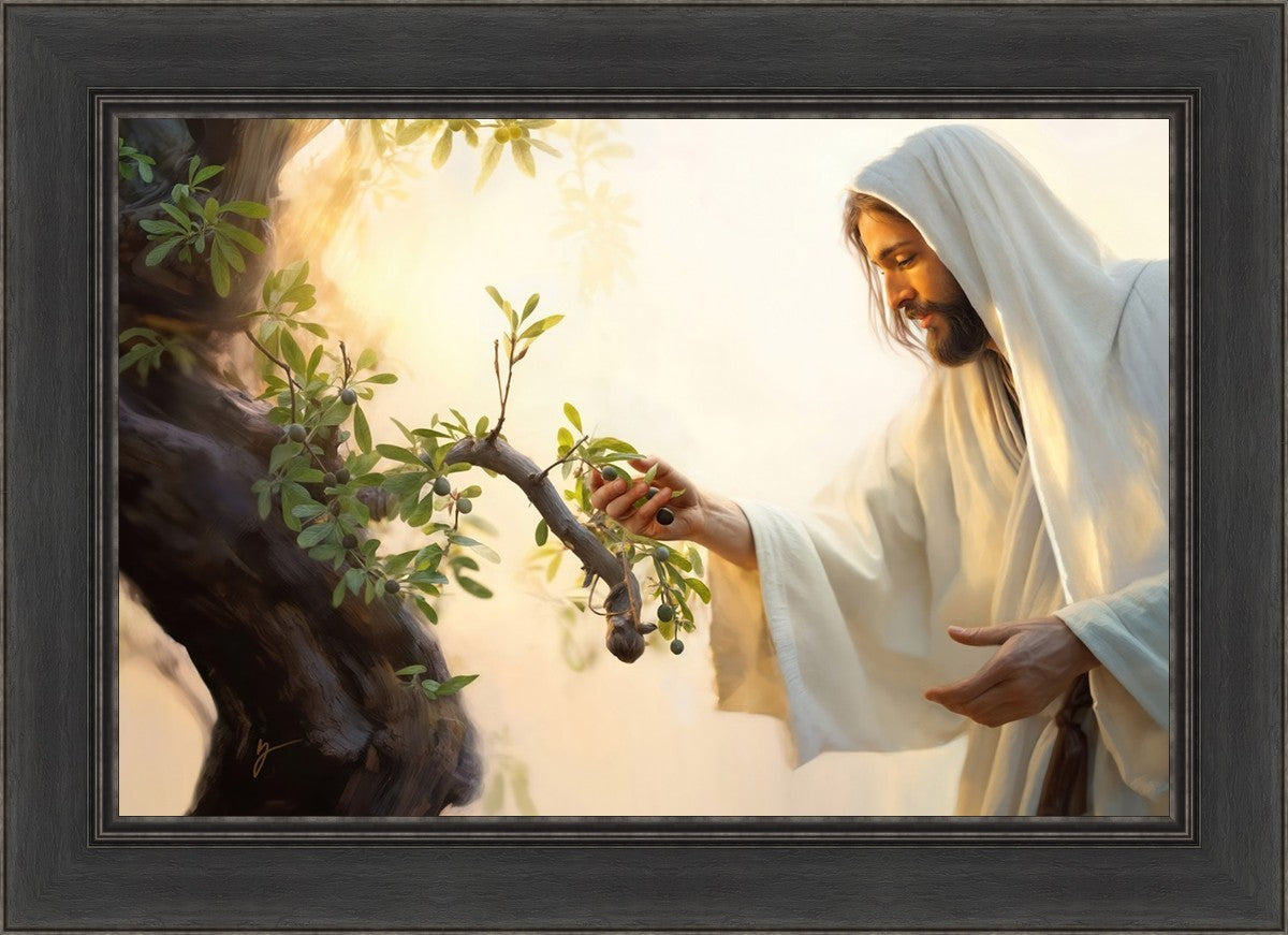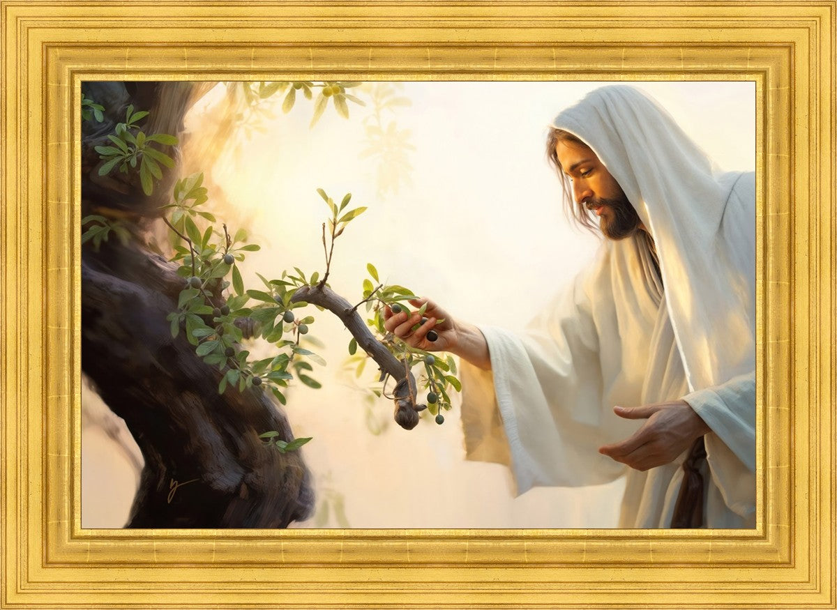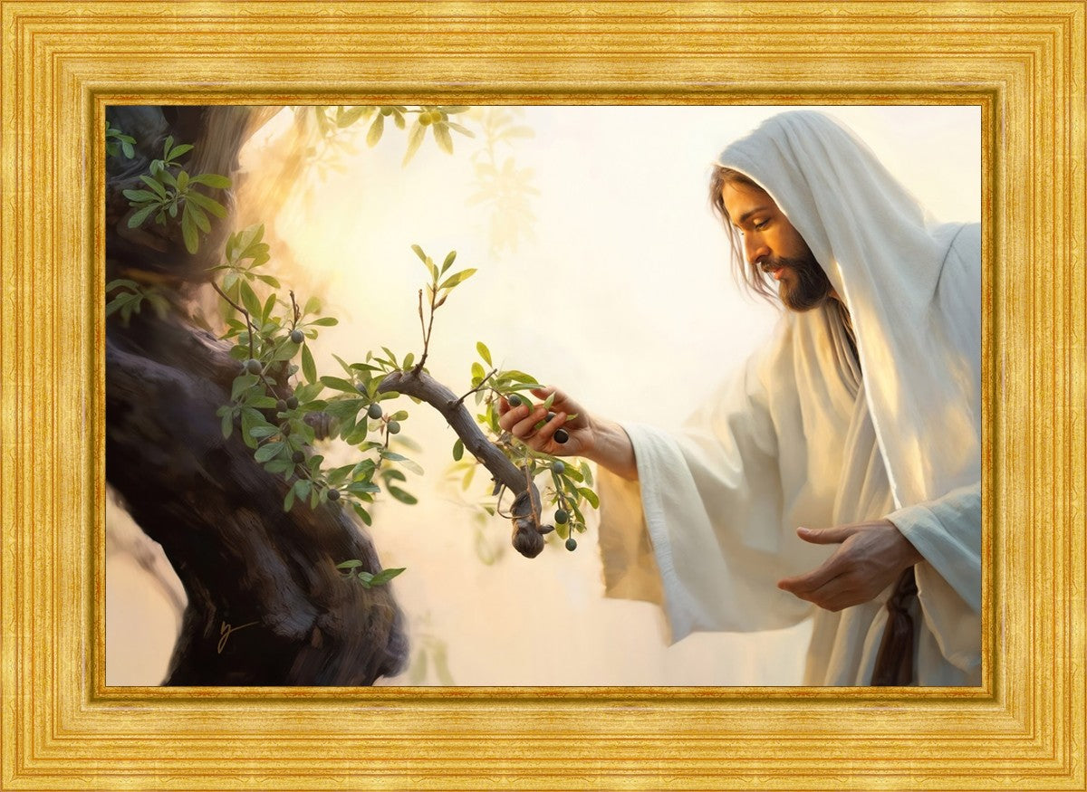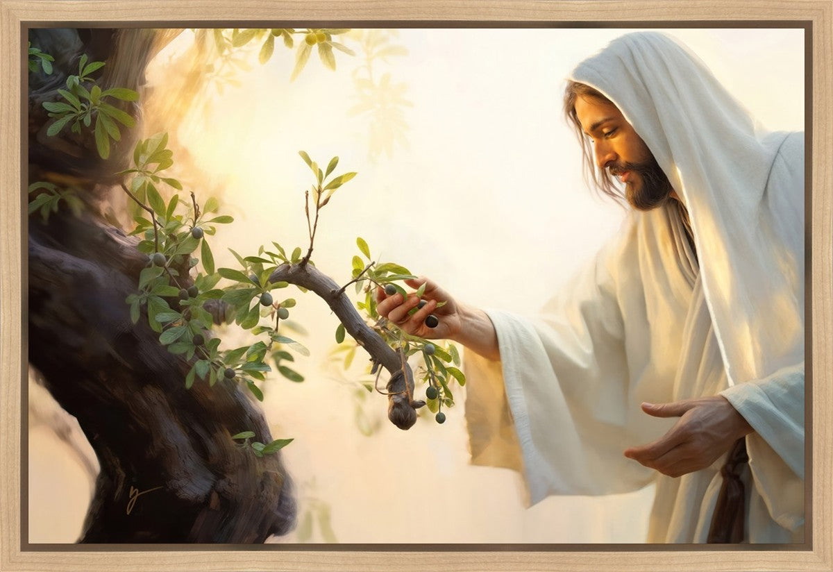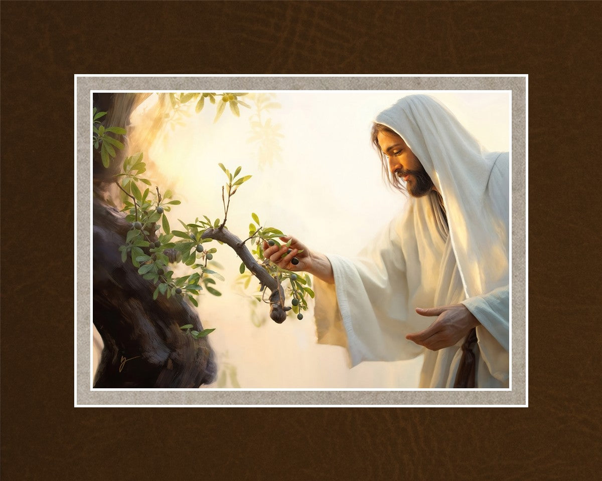 In this captivating moment, Jesus gathers olives from the branches, each fruit representing a soul chosen to be gathered unto Him. The radiant sun heralds the arrival of a new day, symbolizing the dawn of the final harvest where faithful saints are gathered in with the Lord. His head is veiled, a sign of His humility and devotion to the sacred task at hand.