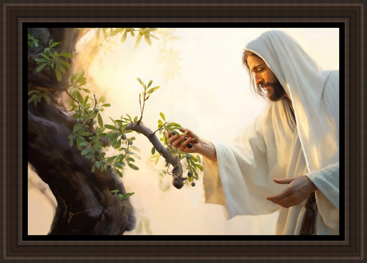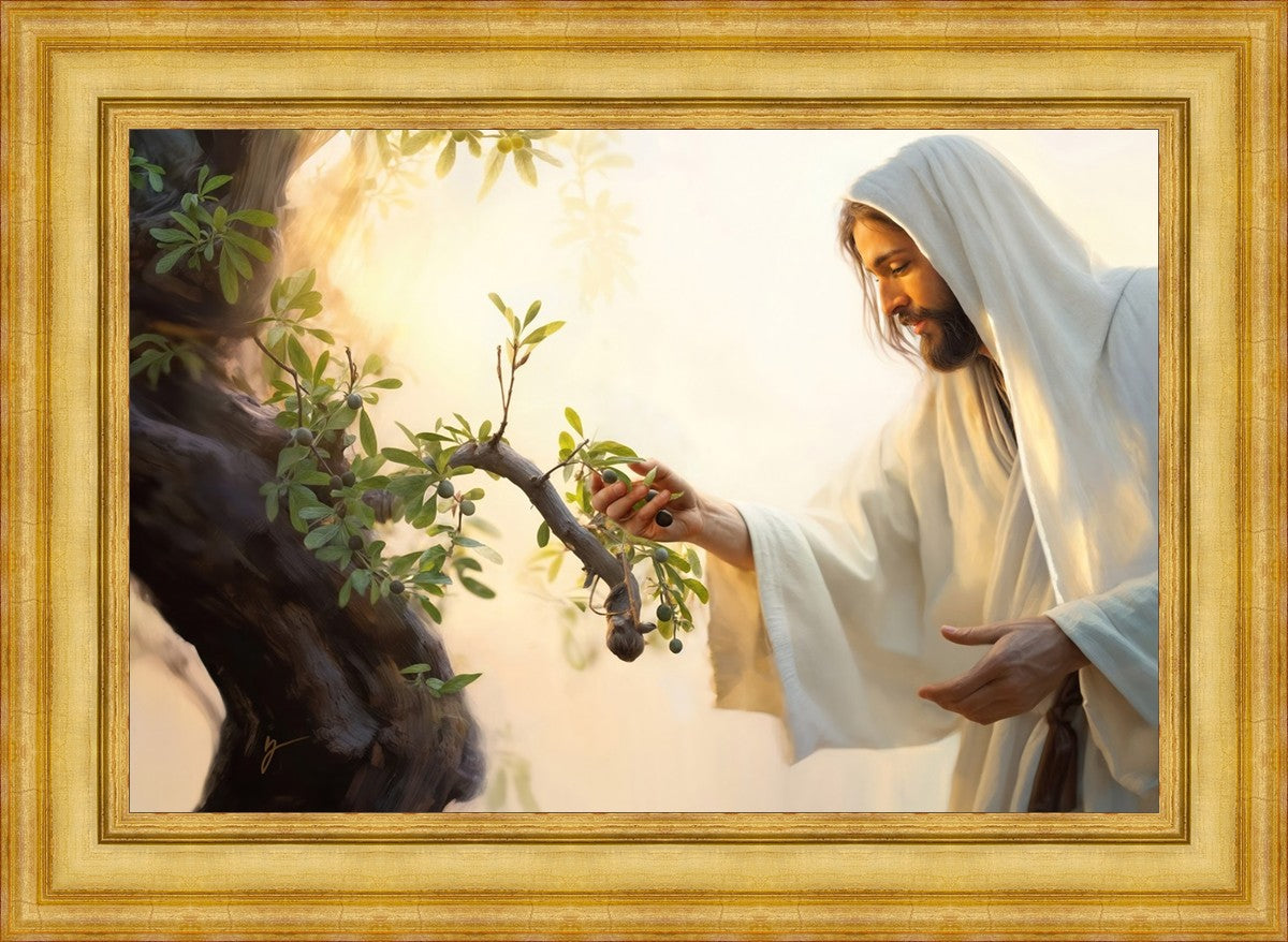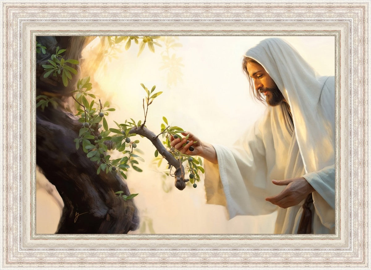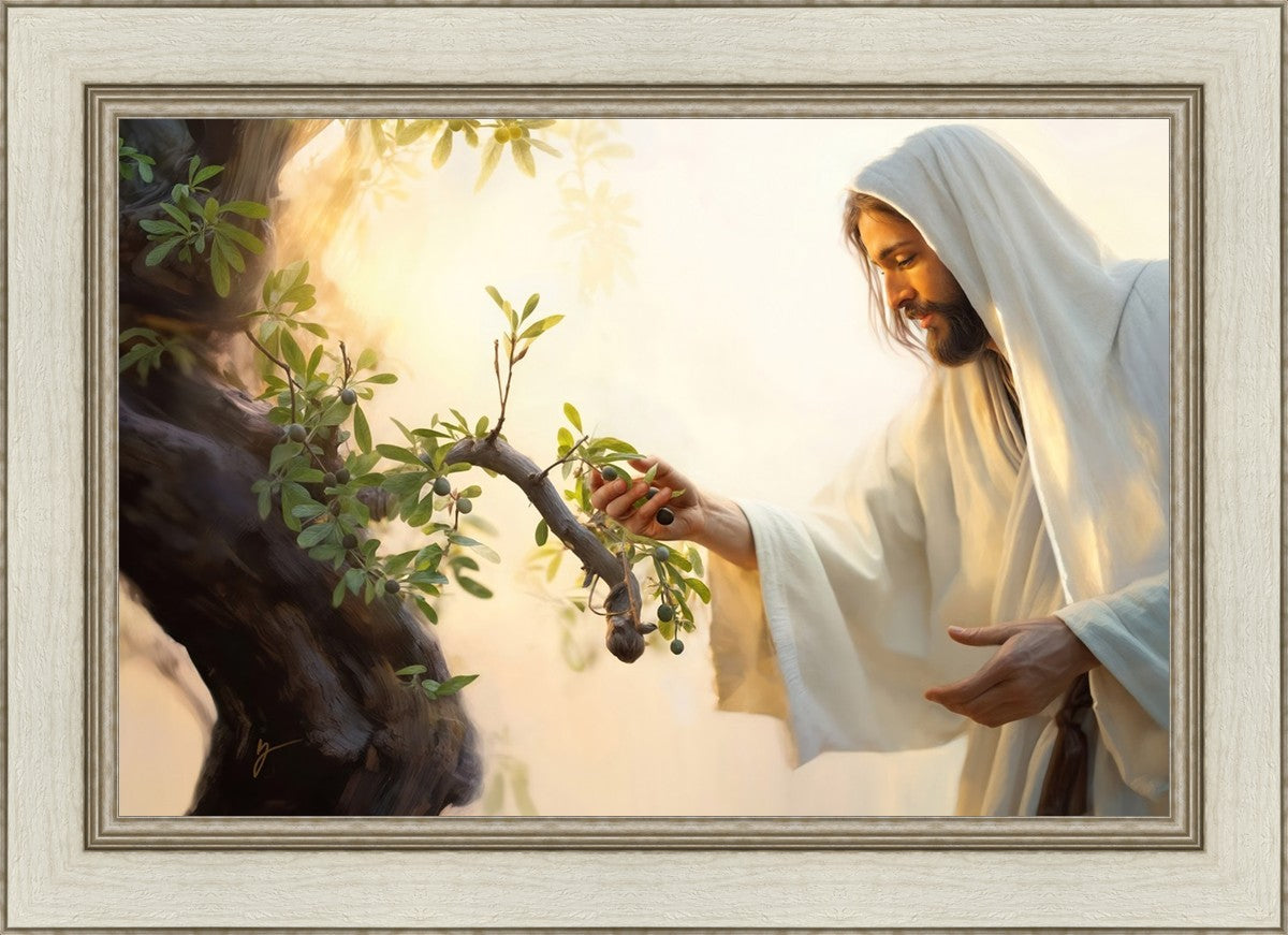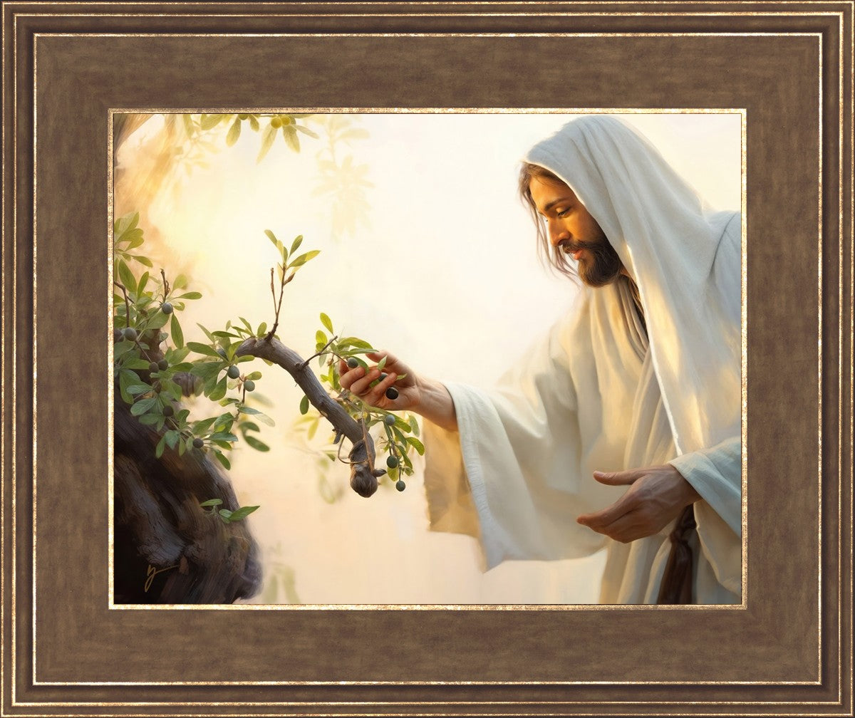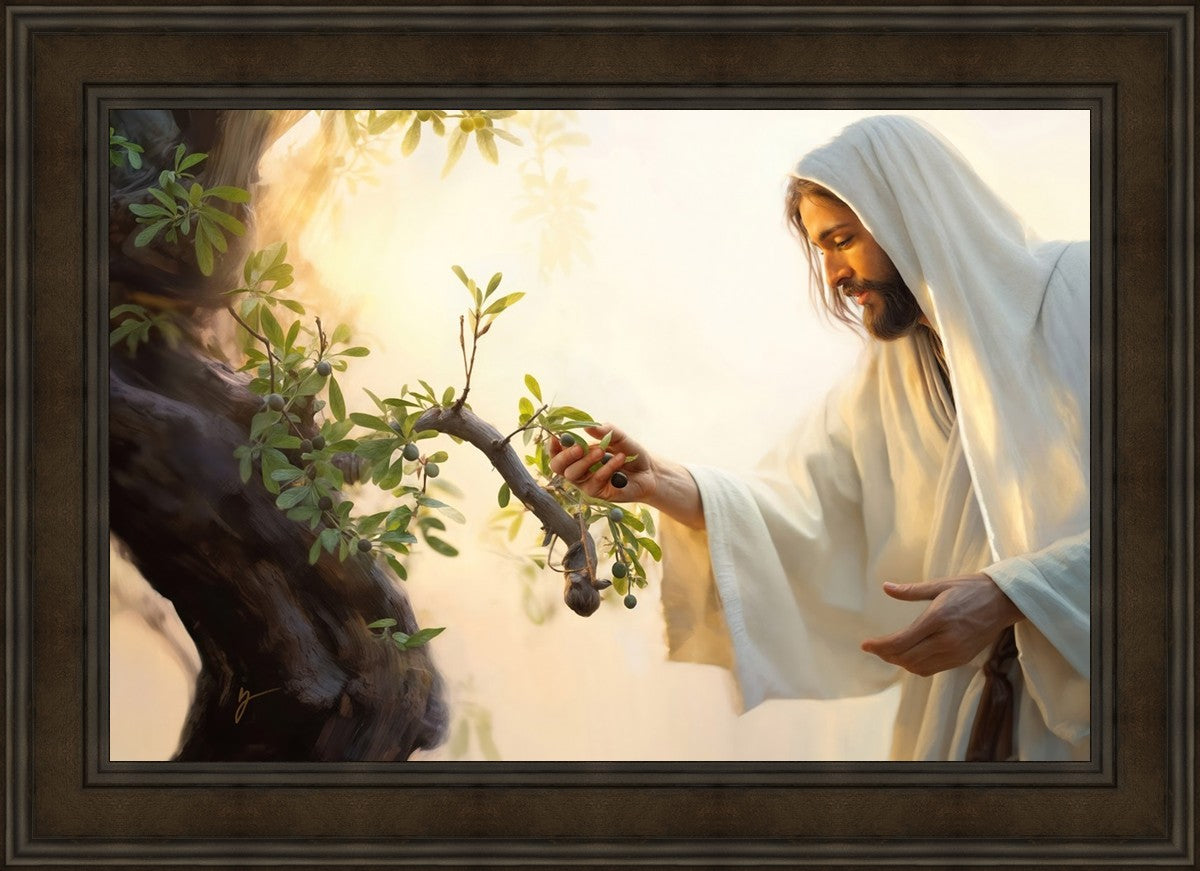 In this captivating moment, Jesus gathers olives from the branches, each fruit representing a soul chosen to be gathered unto Him. The radiant sun heralds the arrival of a new day, symbolizing the dawn of the final harvest where faithful saints are gathered in with the Lord. His head is veiled, a sign of His humility and devotion to the sacred task at hand.