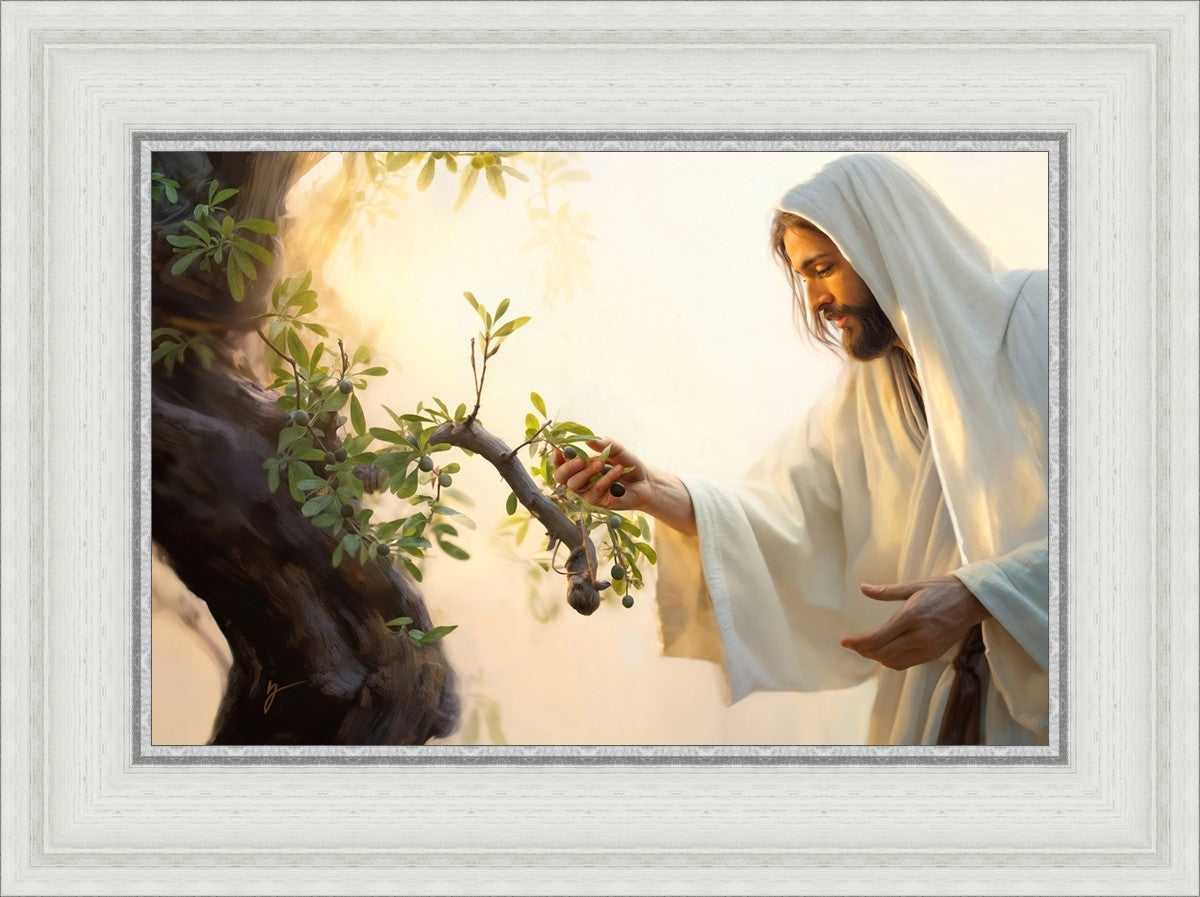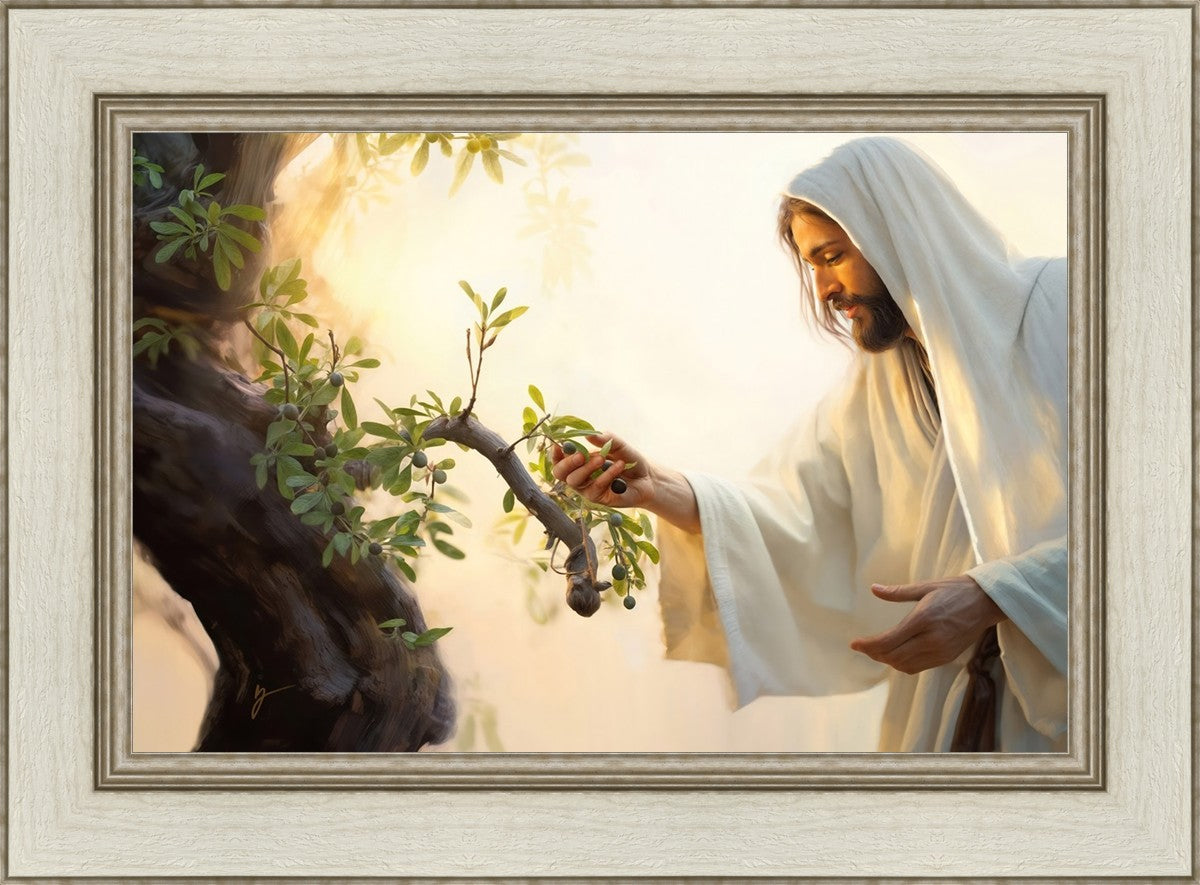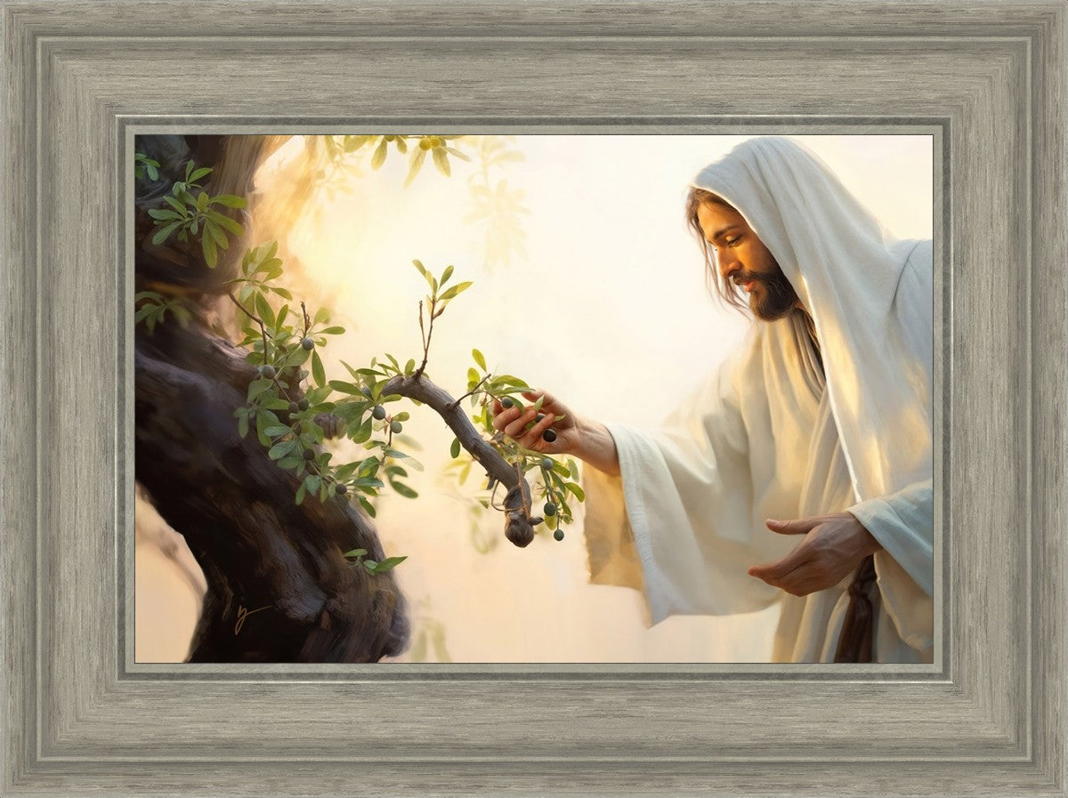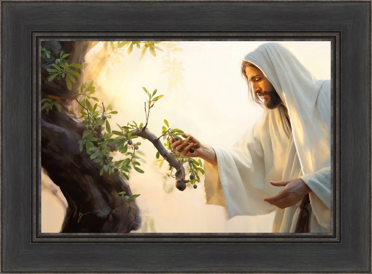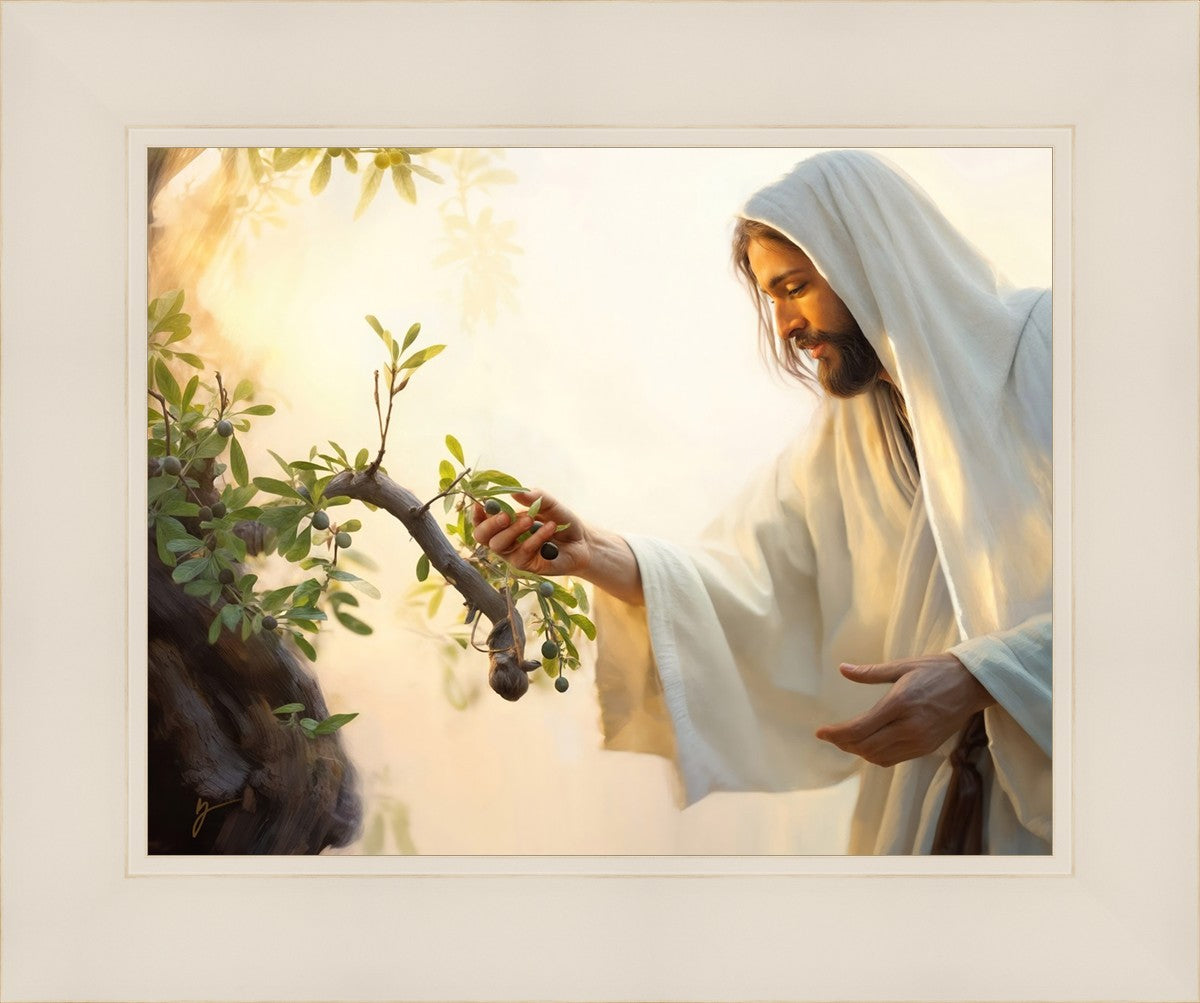 In this captivating moment, Jesus gathers olives from the branches, each fruit representing a soul chosen to be gathered unto Him. The radiant sun heralds the arrival of a new day, symbolizing the dawn of the final harvest where faithful saints are gathered in with the Lord. His head is veiled, a sign of His humility and devotion to the sacred task at hand.