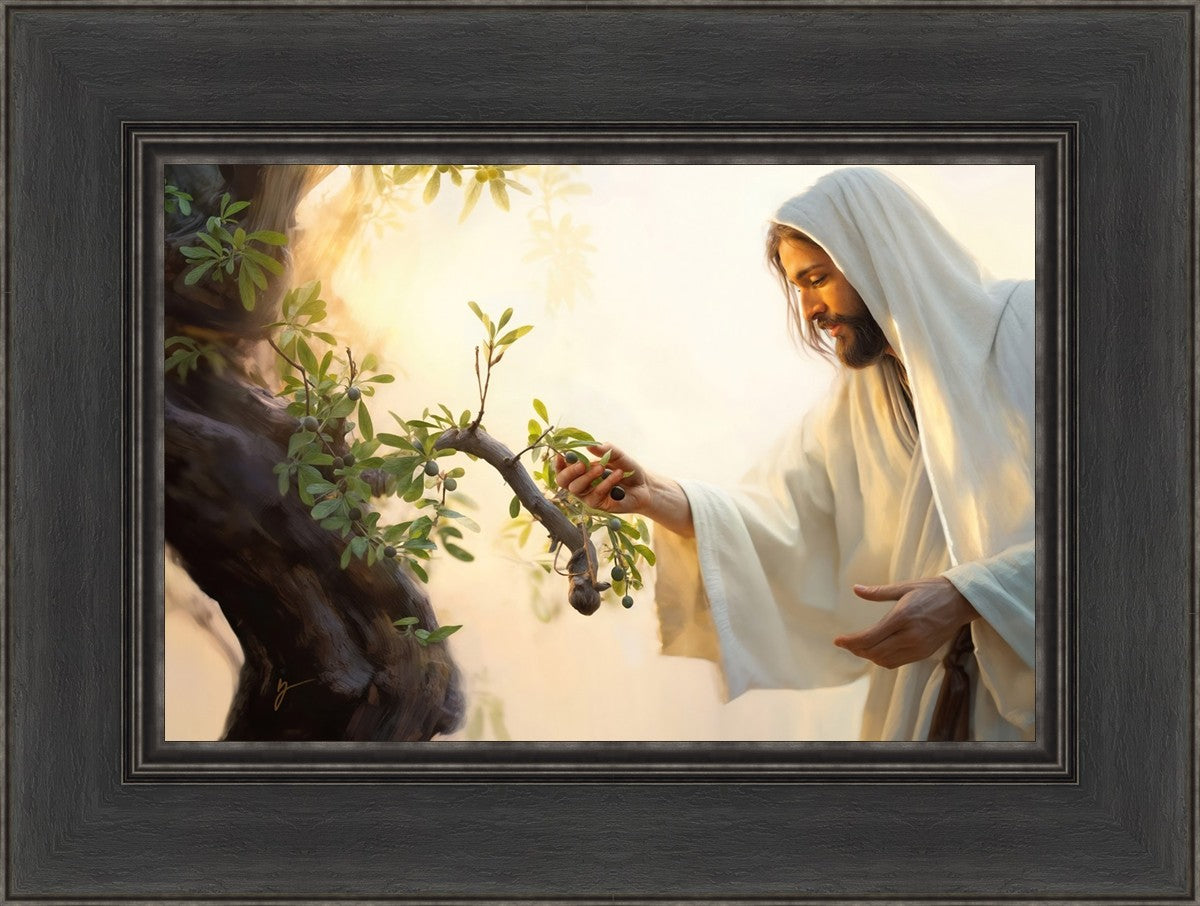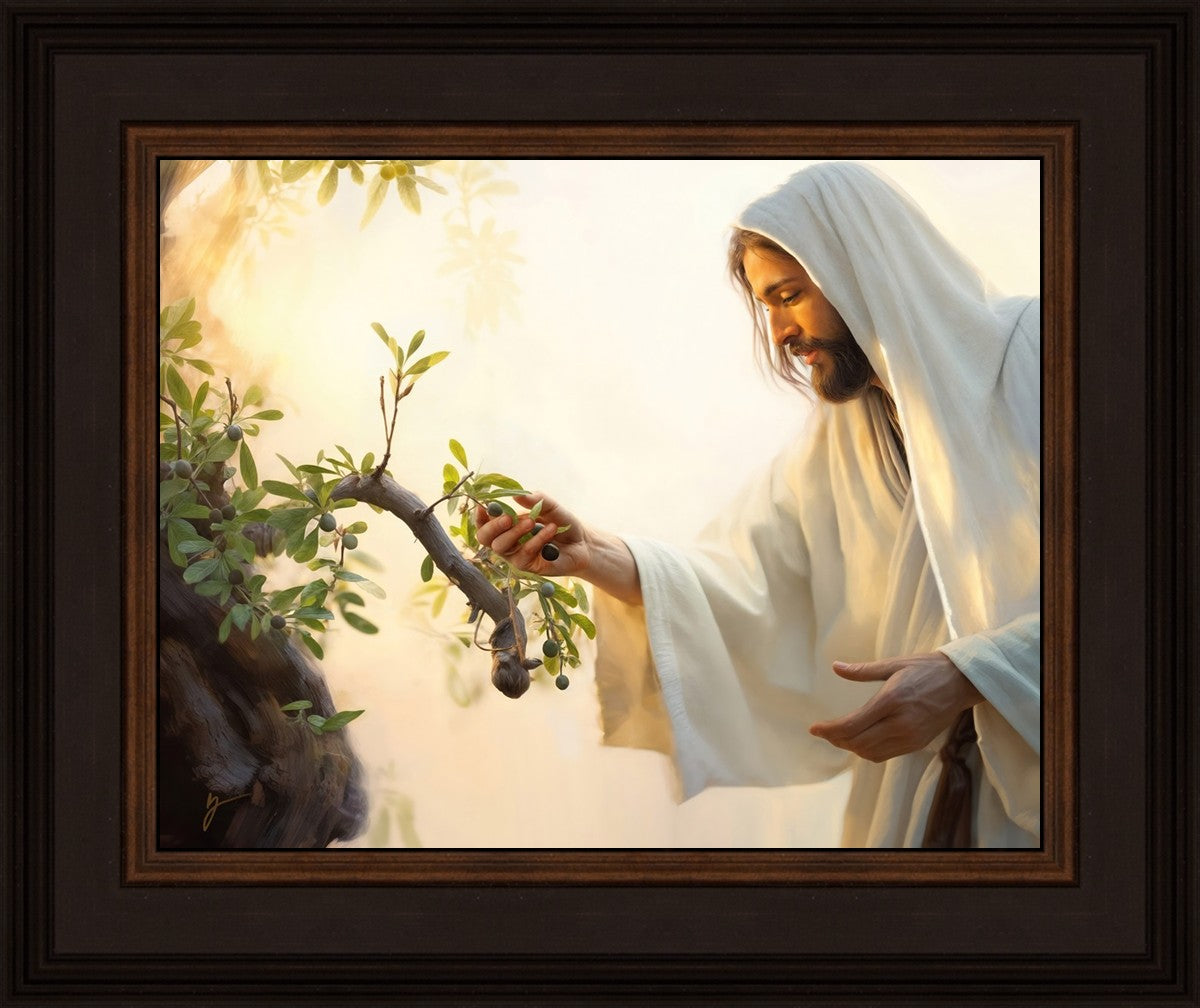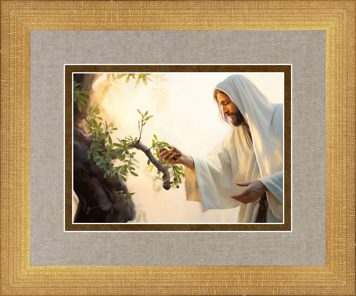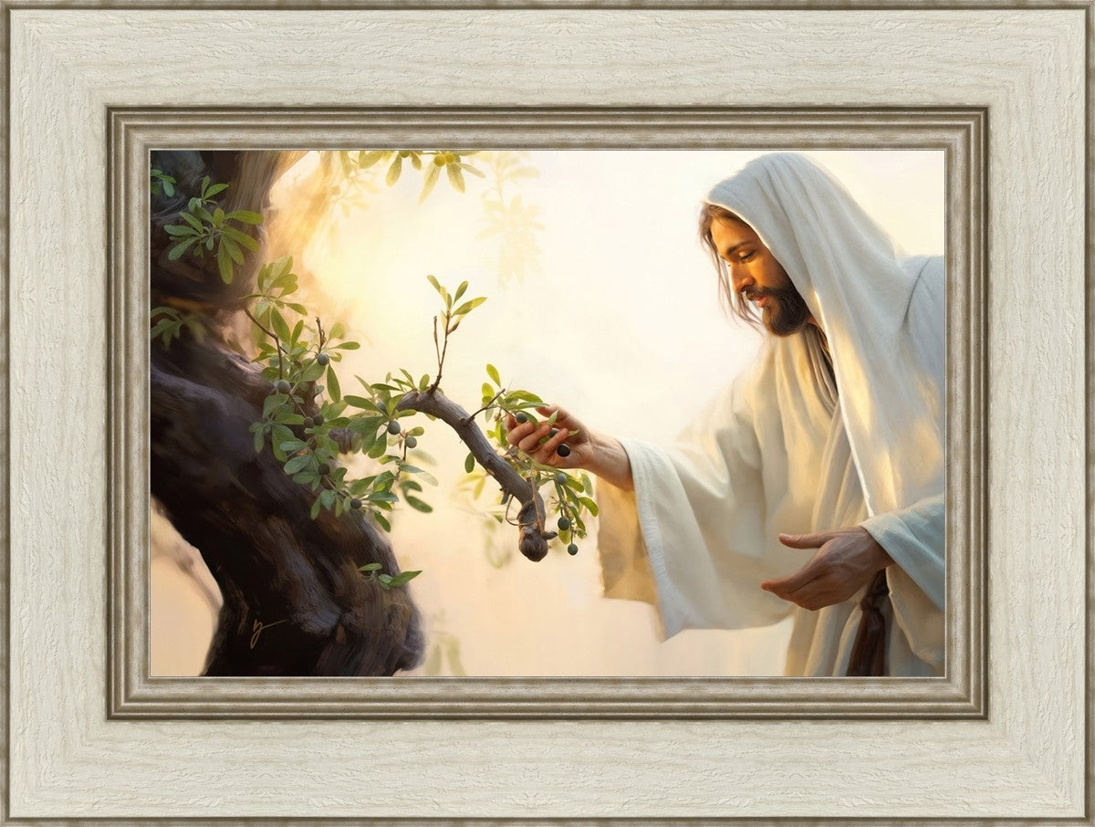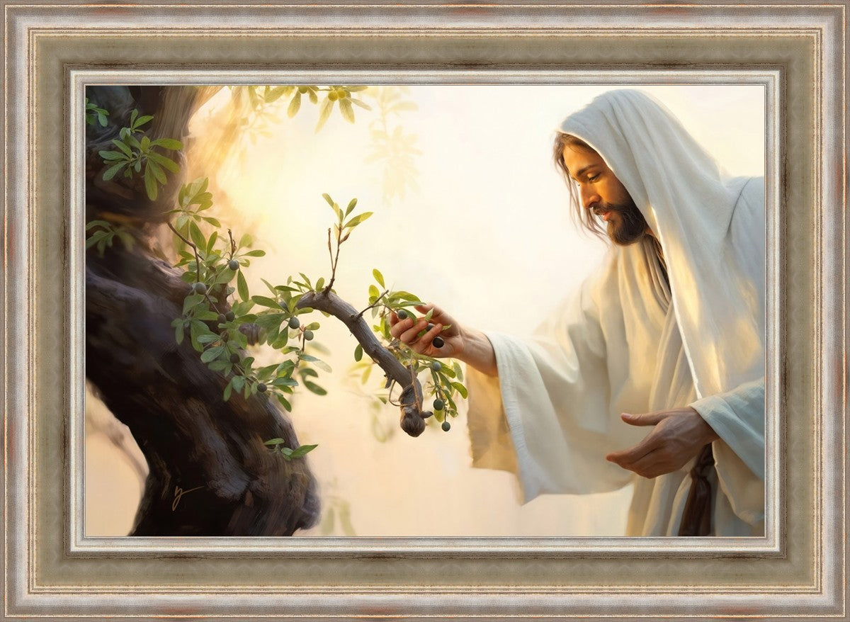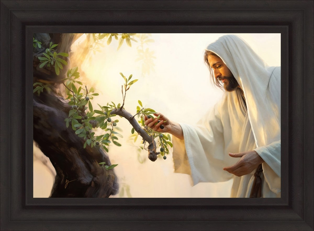 In this captivating moment, Jesus gathers olives from the branches, each fruit representing a soul chosen to be gathered unto Him. The radiant sun heralds the arrival of a new day, symbolizing the dawn of the final harvest where faithful saints are gathered in with the Lord. His head is veiled, a sign of His humility and devotion to the sacred task at hand.