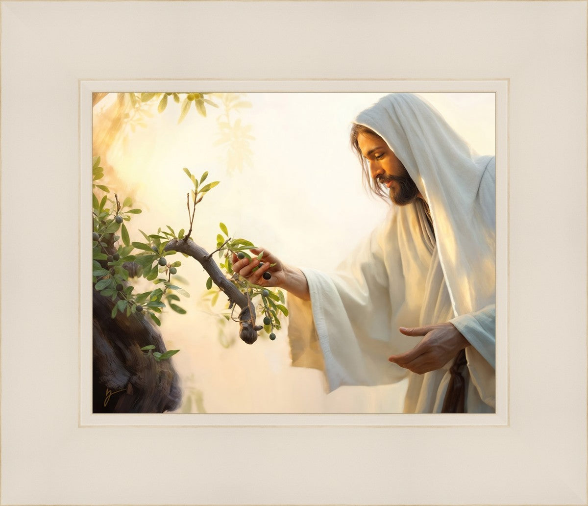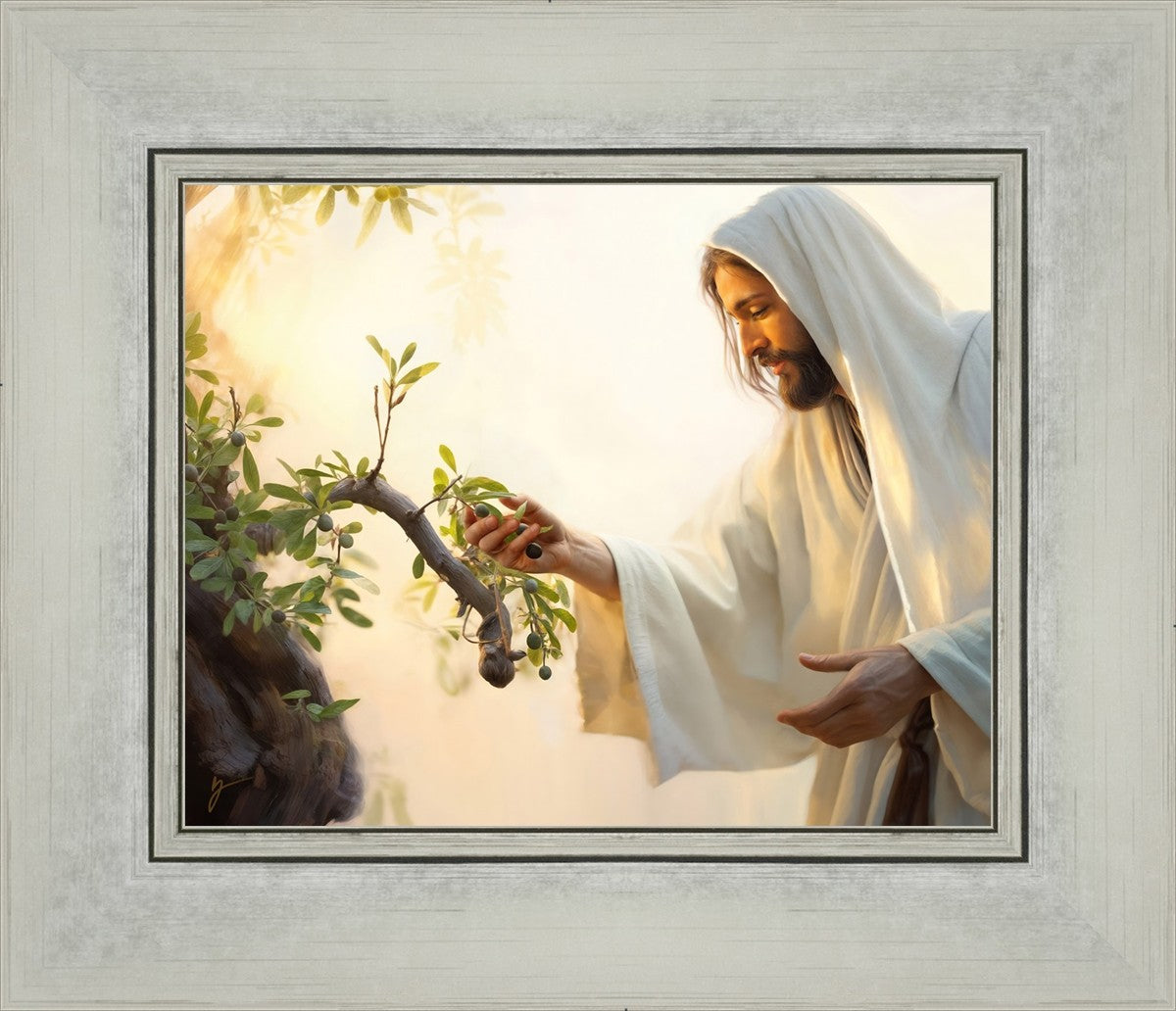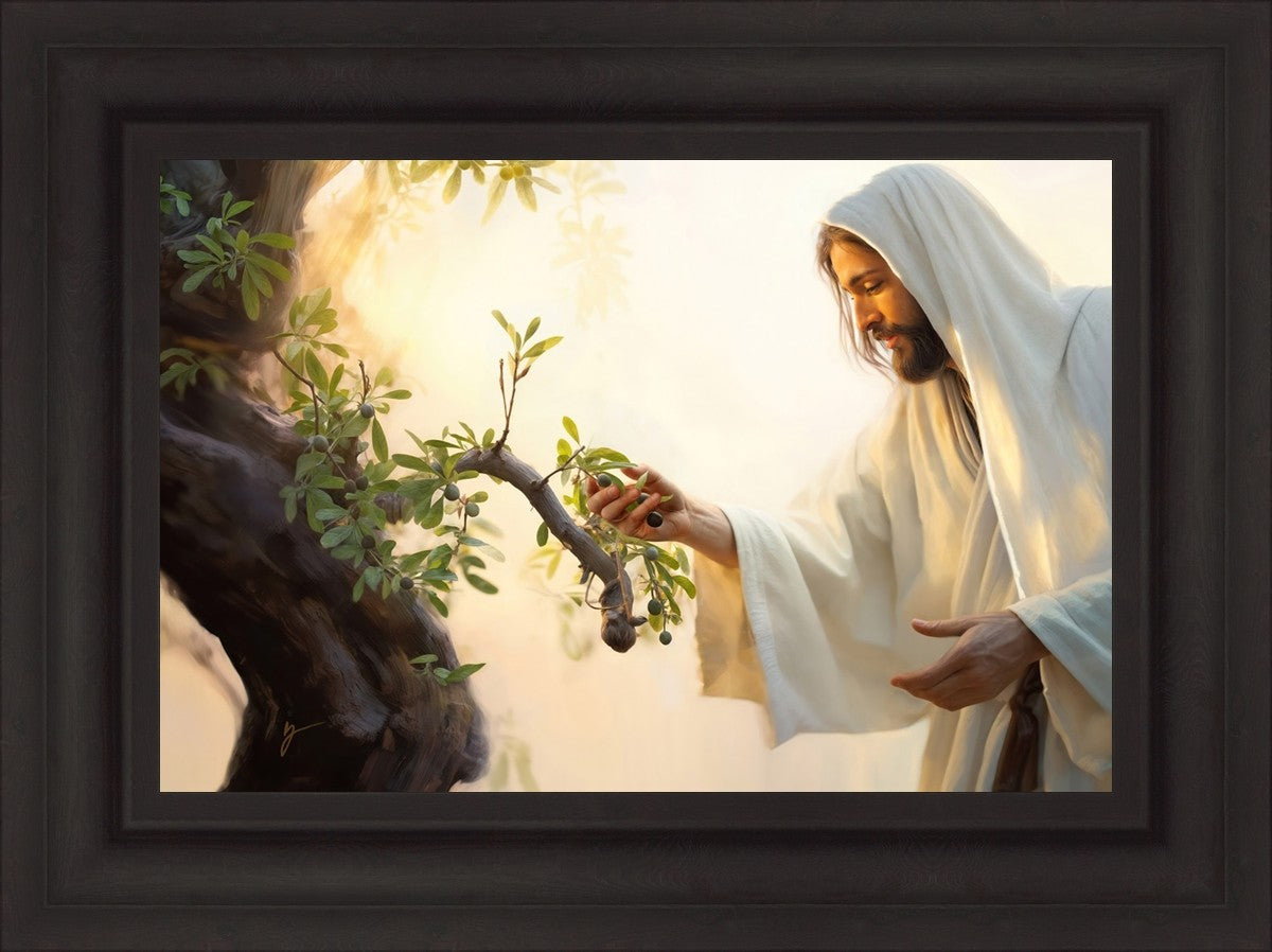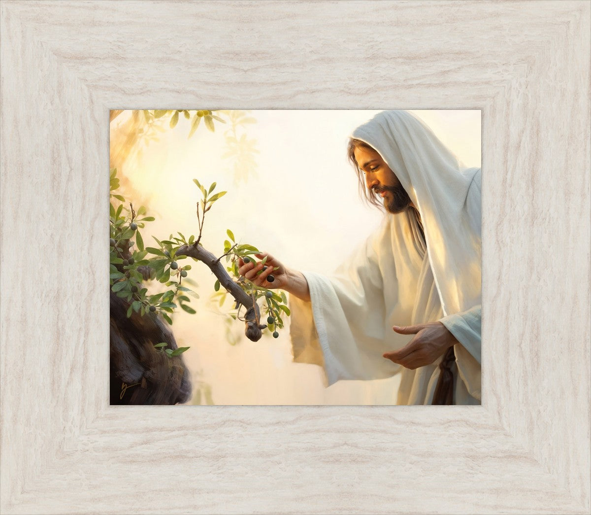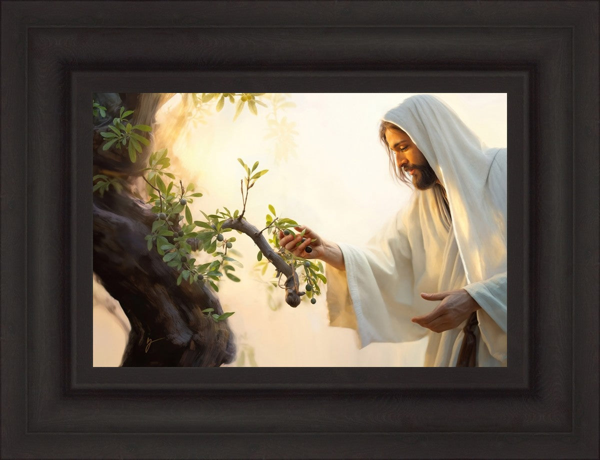 In this captivating moment, Jesus gathers olives from the branches, each fruit representing a soul chosen to be gathered unto Him. The radiant sun heralds the arrival of a new day, symbolizing the dawn of the final harvest where faithful saints are gathered in with the Lord. His head is veiled, a sign of His humility and devotion to the sacred task at hand.