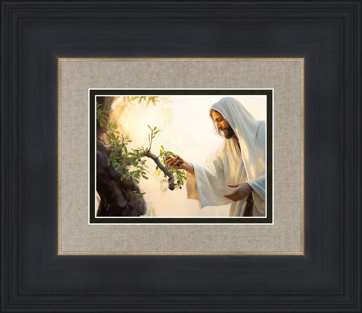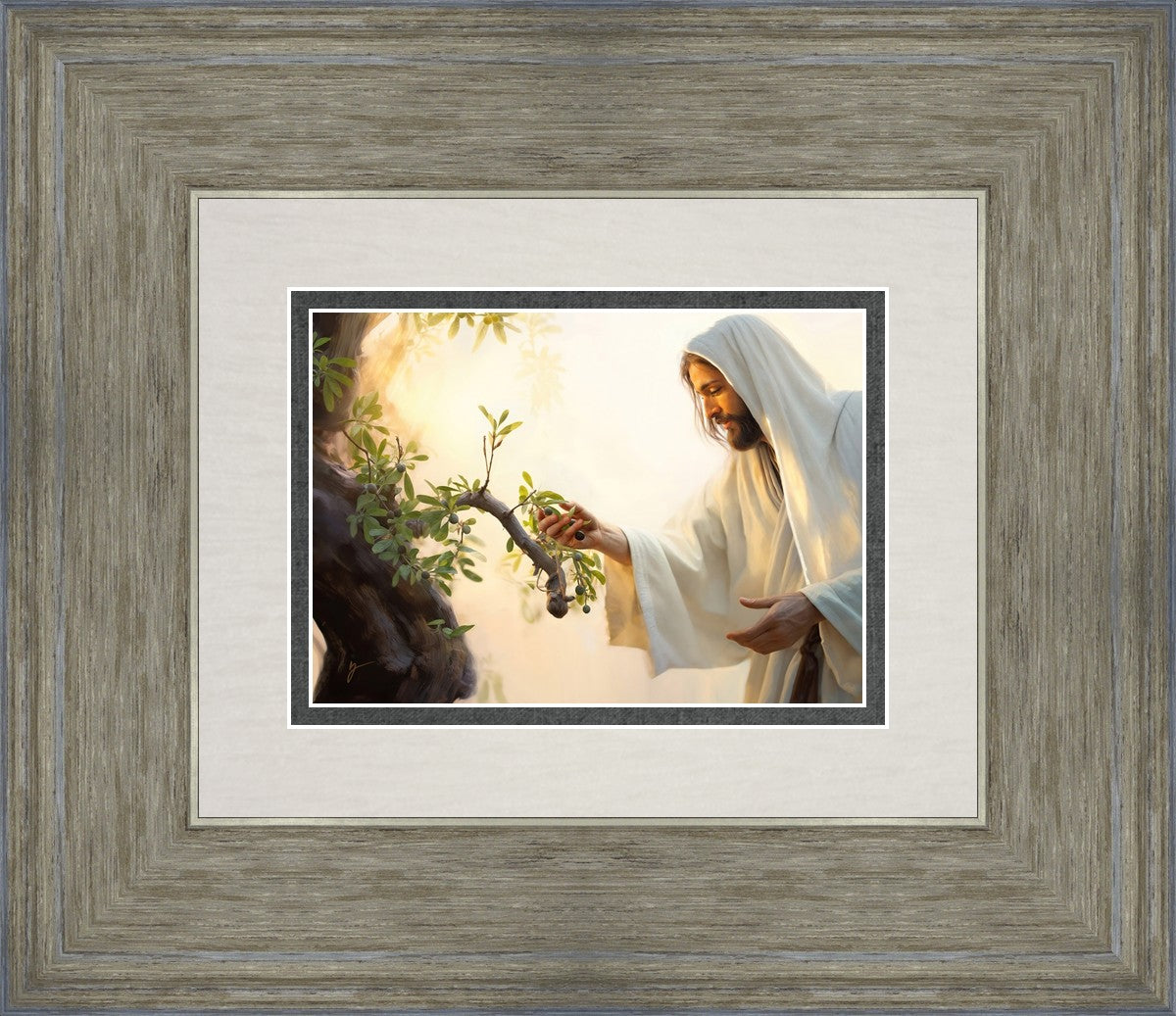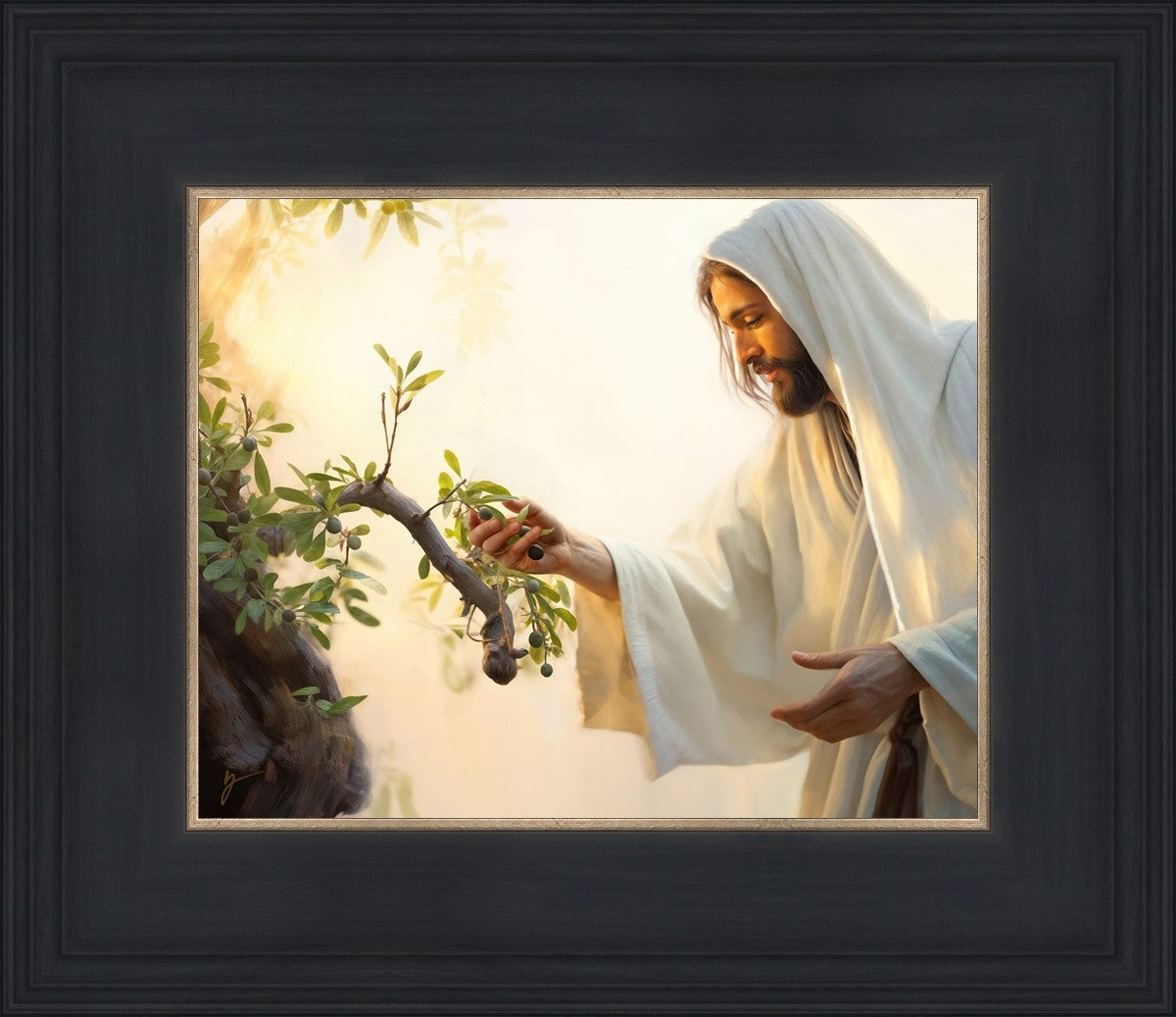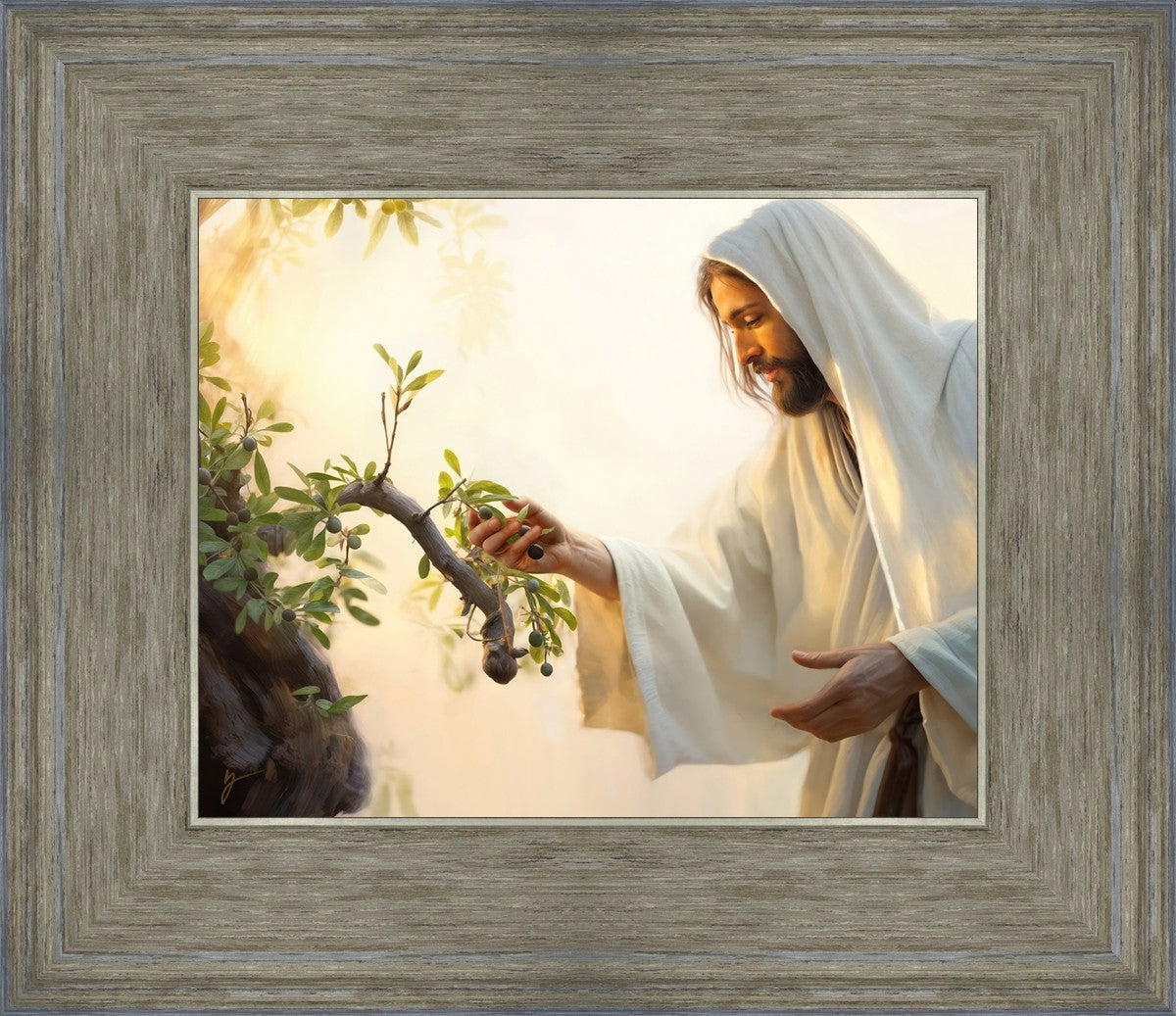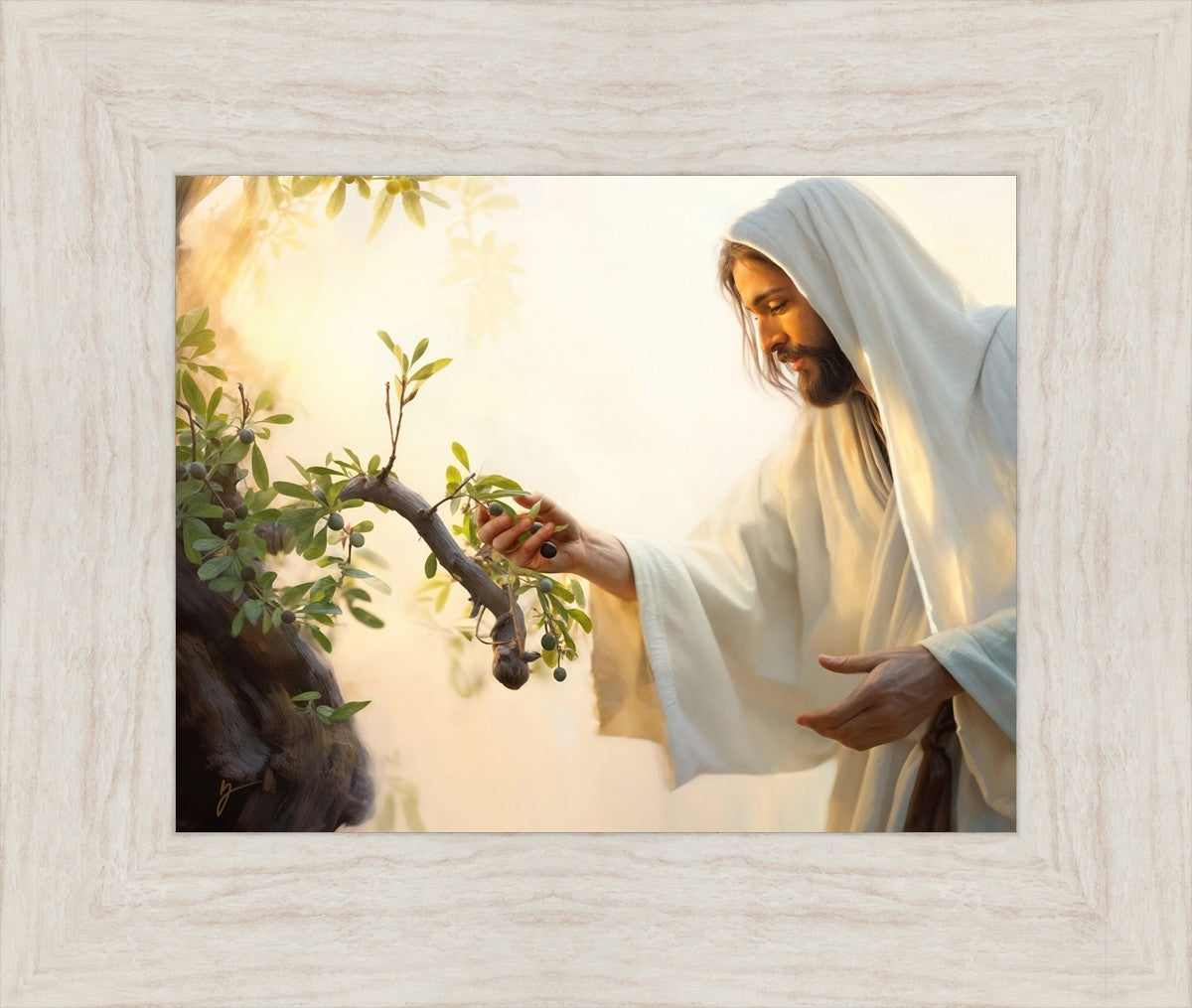 In this captivating moment, Jesus gathers olives from the branches, each fruit representing a soul chosen to be gathered unto Him. The radiant sun heralds the arrival of a new day, symbolizing the dawn of the final harvest where faithful saints are gathered in with the Lord. His head is veiled, a sign of His humility and devotion to the sacred task at hand.