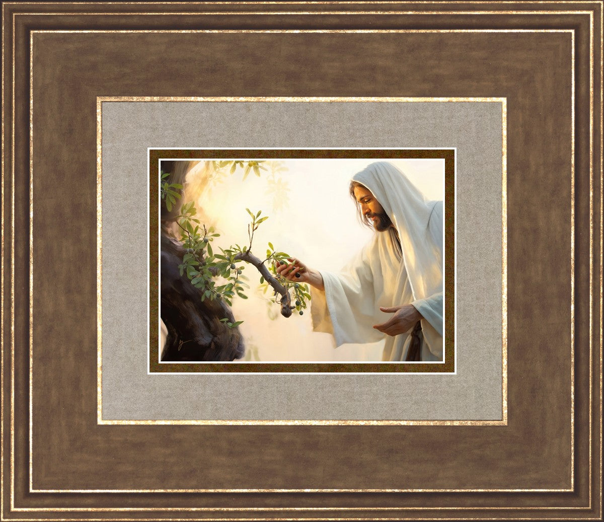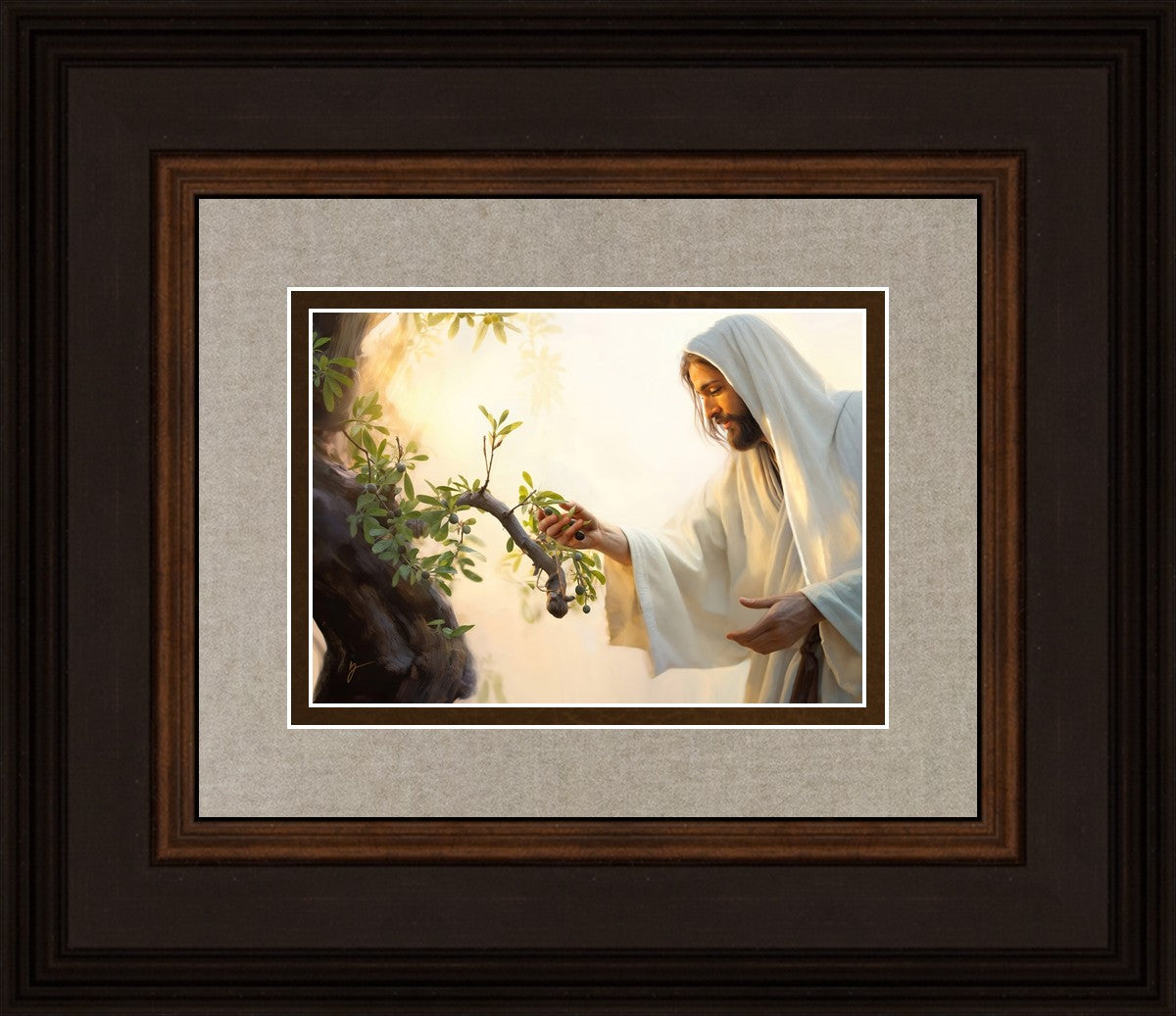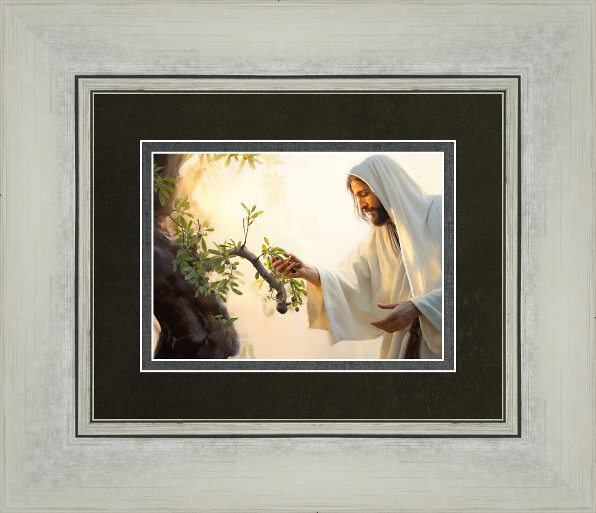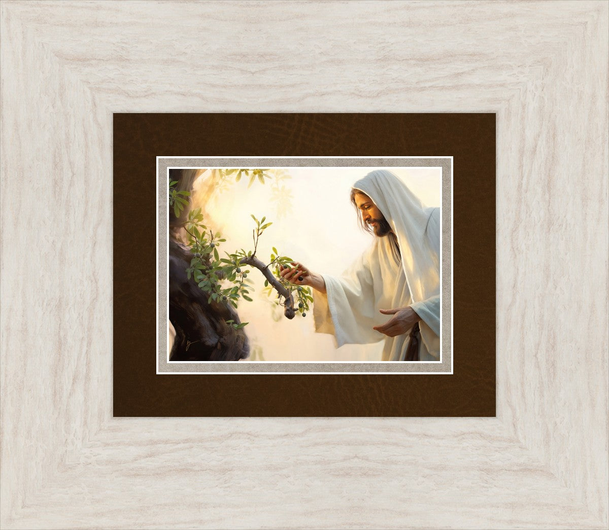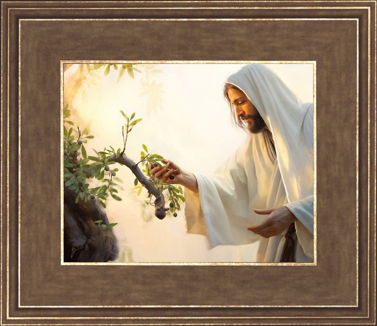 In this captivating moment, Jesus gathers olives from the branches, each fruit representing a soul chosen to be gathered unto Him. The radiant sun heralds the arrival of a new day, symbolizing the dawn of the final harvest where faithful saints are gathered in with the Lord. His head is veiled, a sign of His humility and devotion to the sacred task at hand.