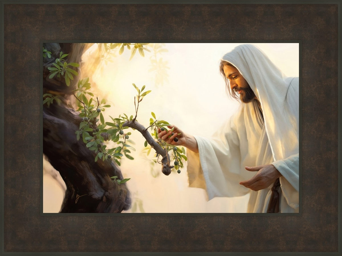 In "Dawn of the Harvest," we are transported to a scene of exquisite beauty and profound spiritual significance. The canvas is awash in the soft, golden hues of morning's first light, casting an ethereal glow upon everything it touches. Here, Jesus Christ, the Lord of the Harvest, stands beneath an ancient olive tree, a symbol of peace and abundance.