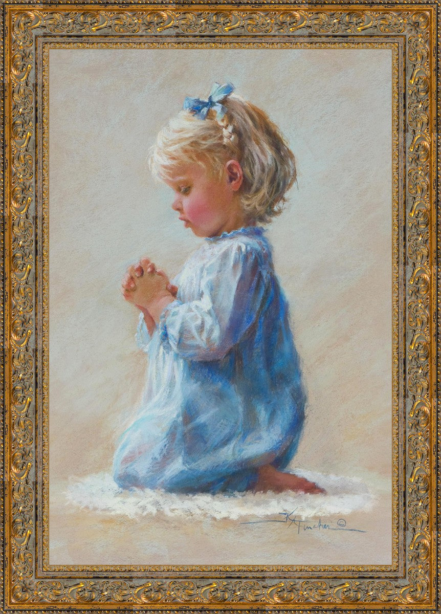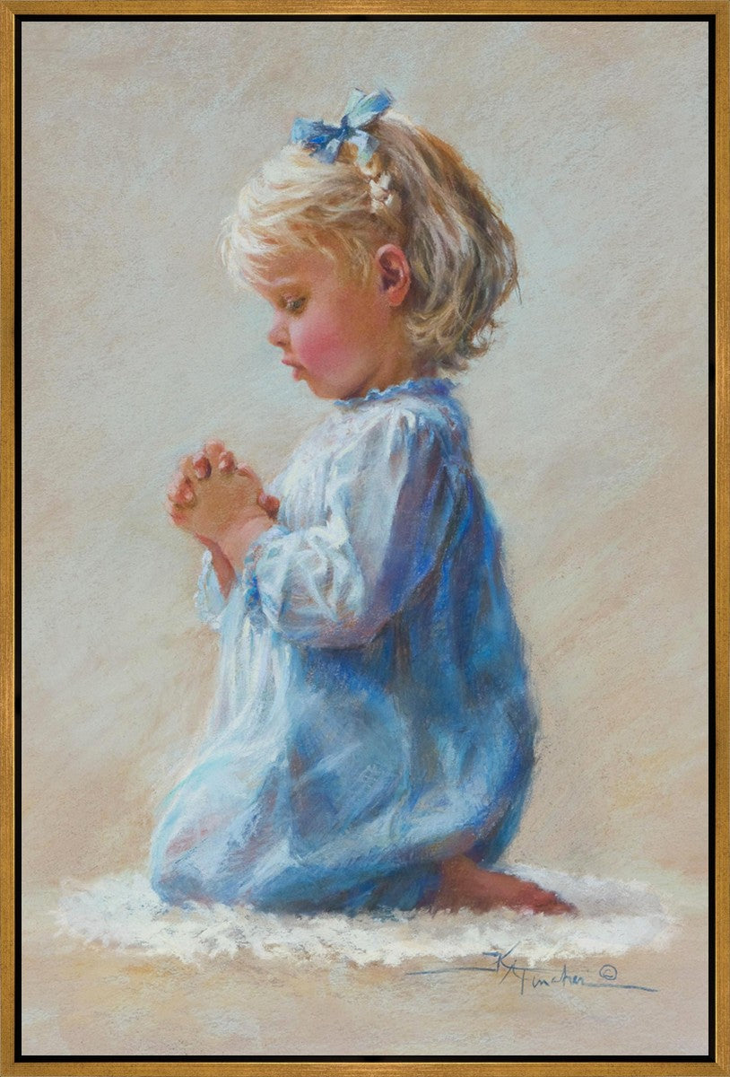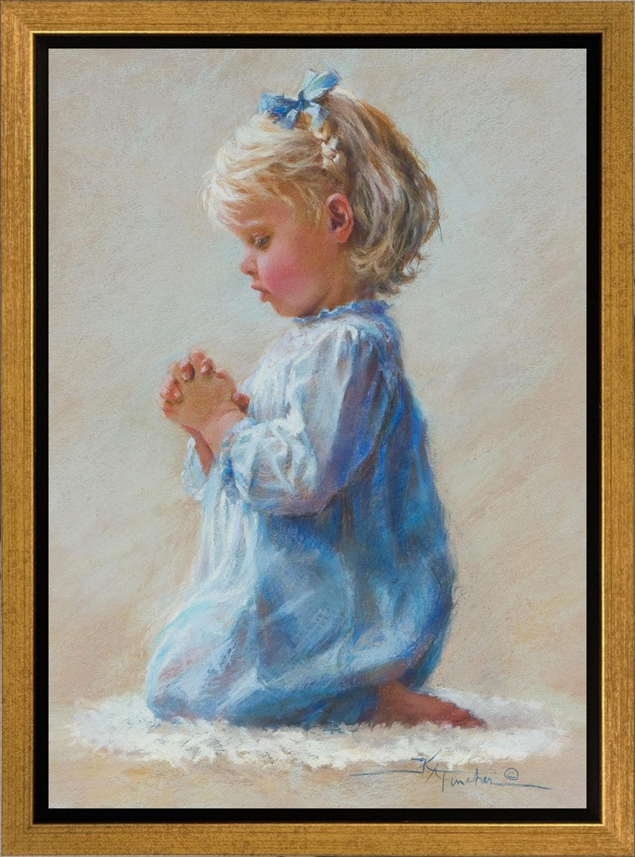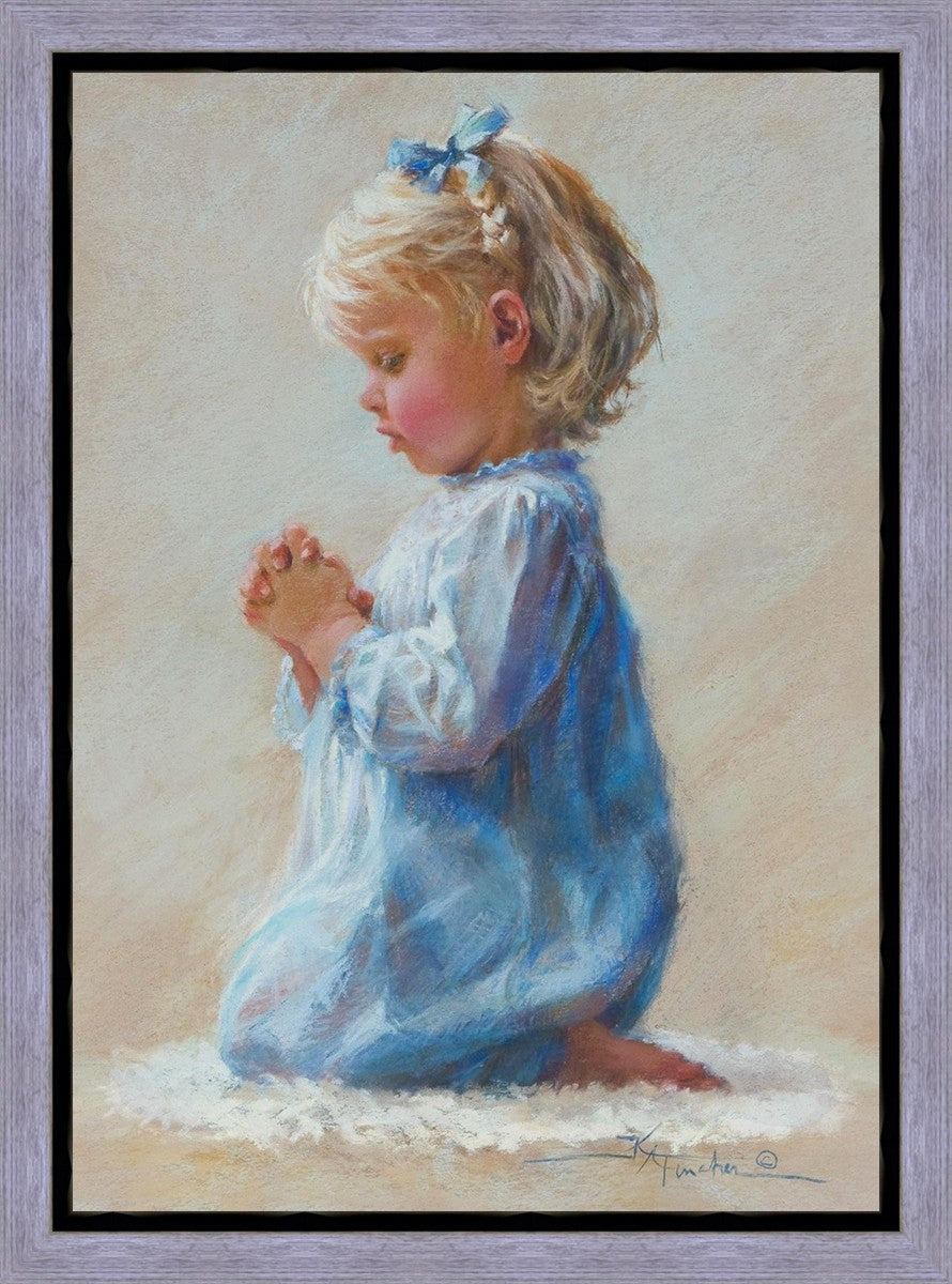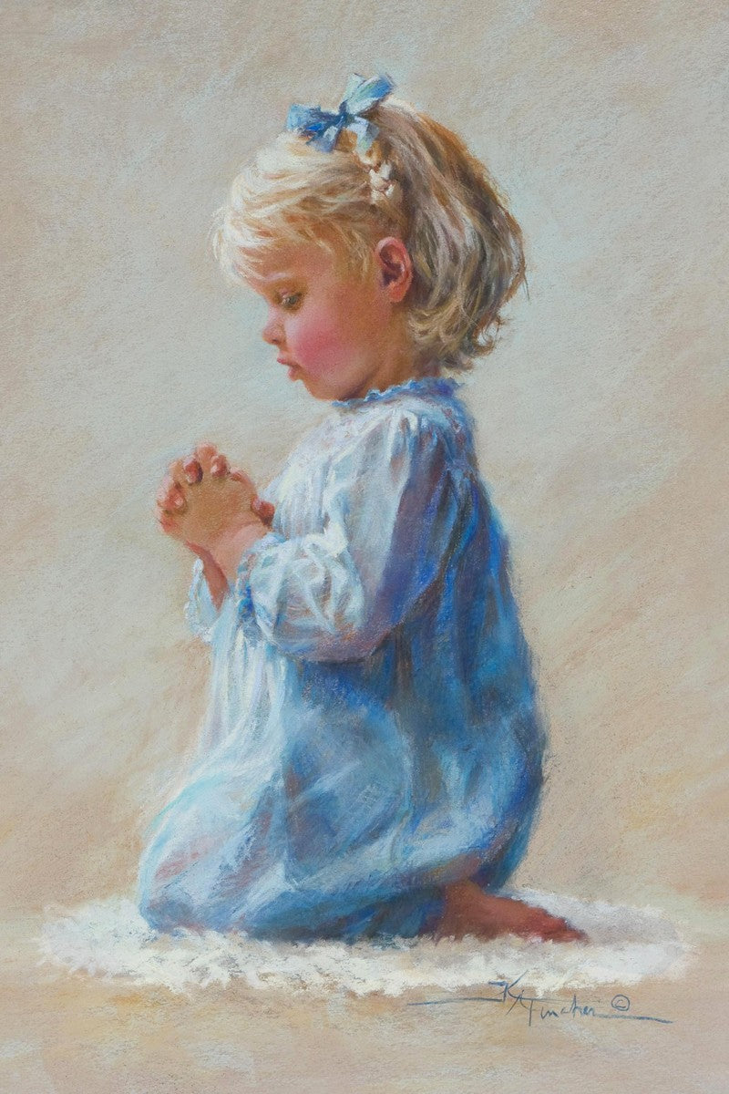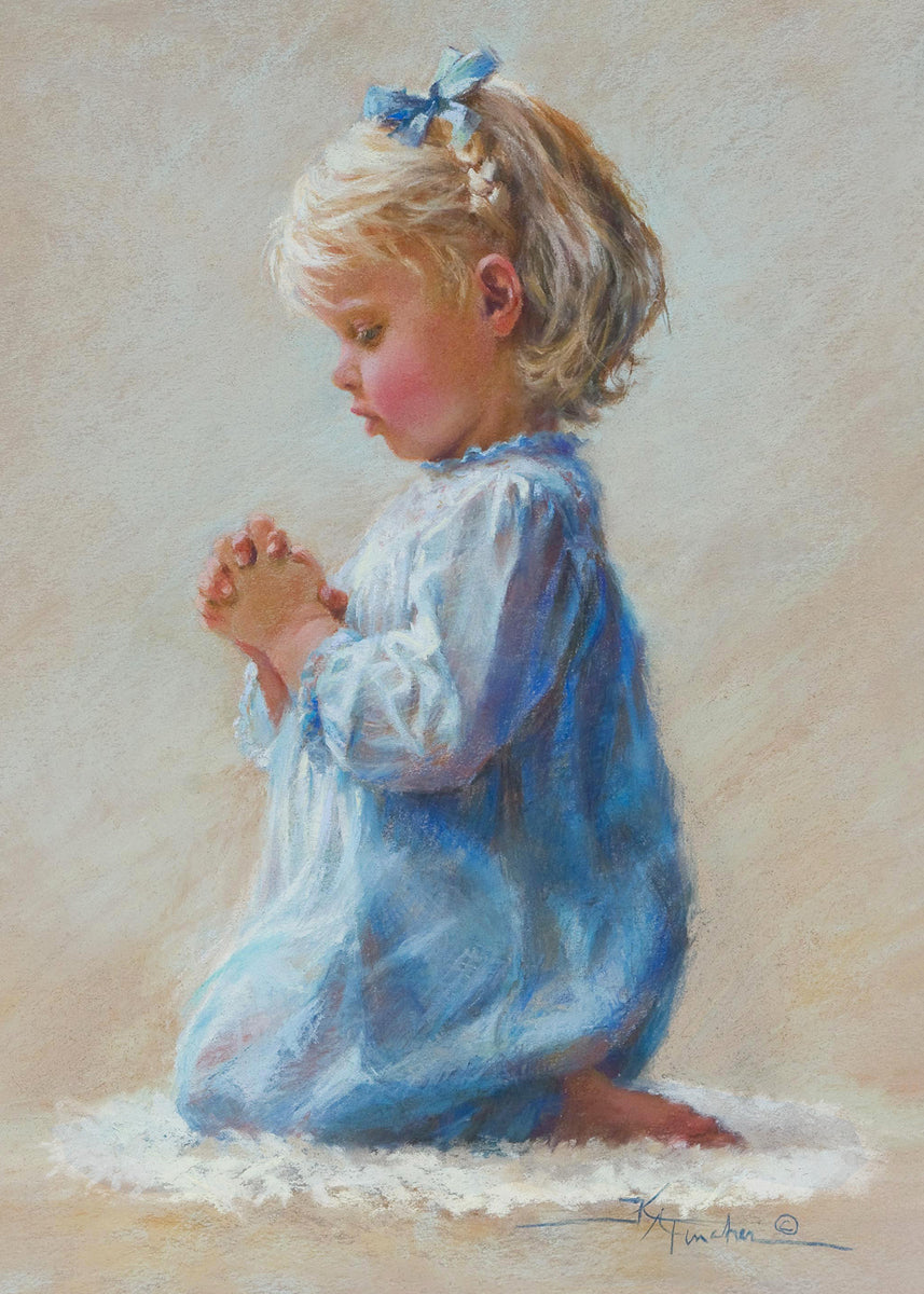“Dear Jesus” is a modern-day interpretation of the timeless Prayer Children painted in 1940 by Bessie Pease Gutmann. A copy of Gutmann’s prayer girl was painted by my mother, a portrait painter, in the ‘50’s and hung over my bed with “Kathy’s Prayer” written across the bottom.