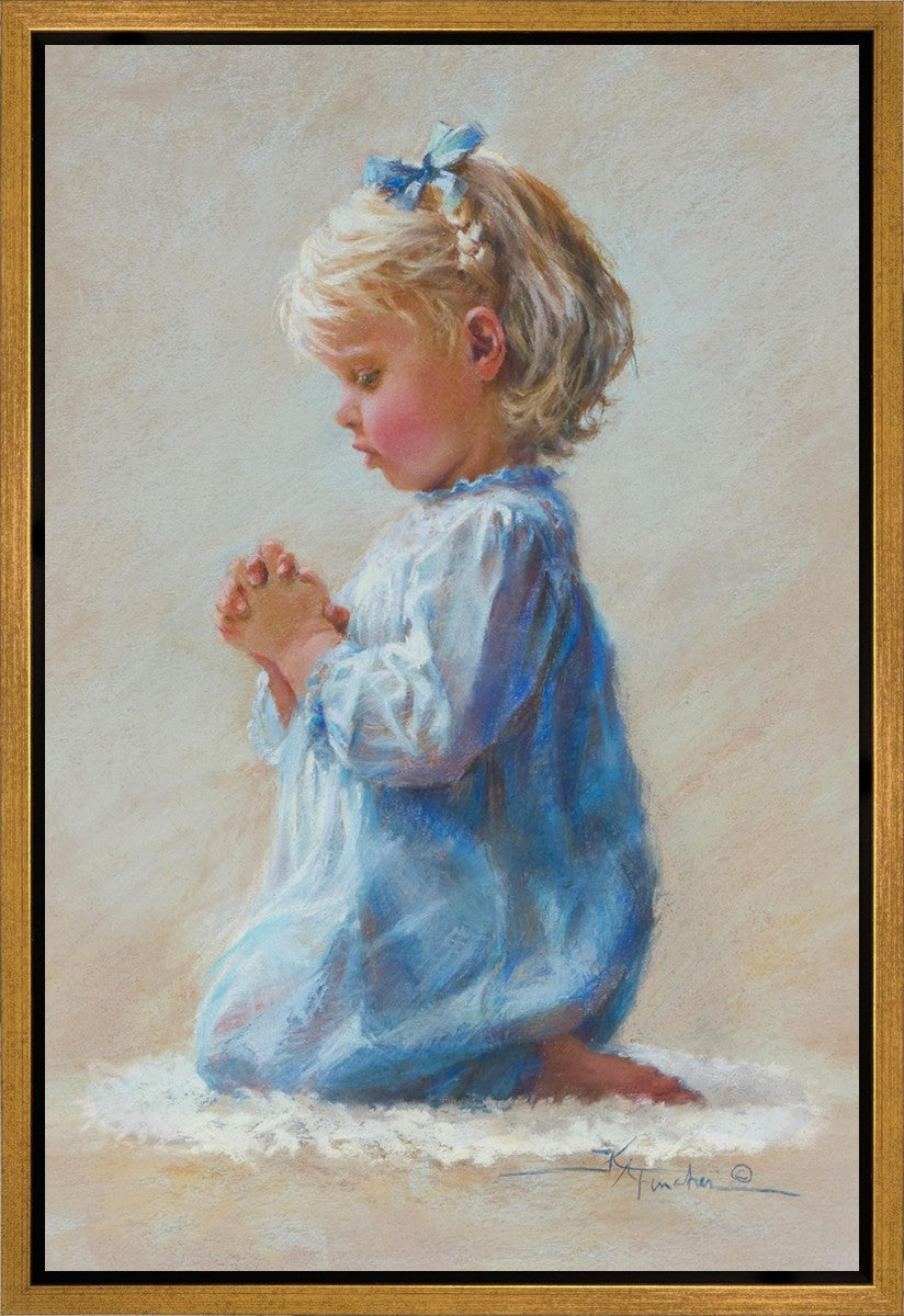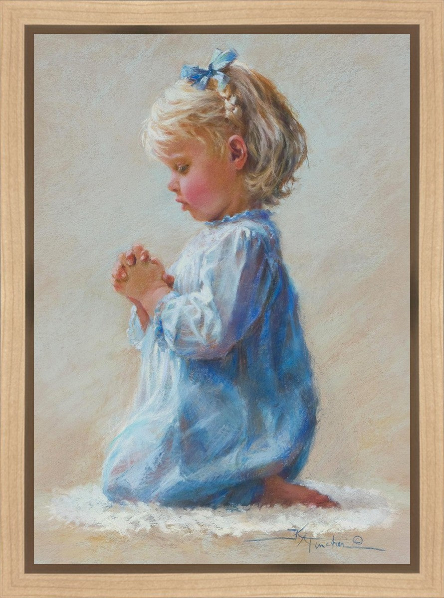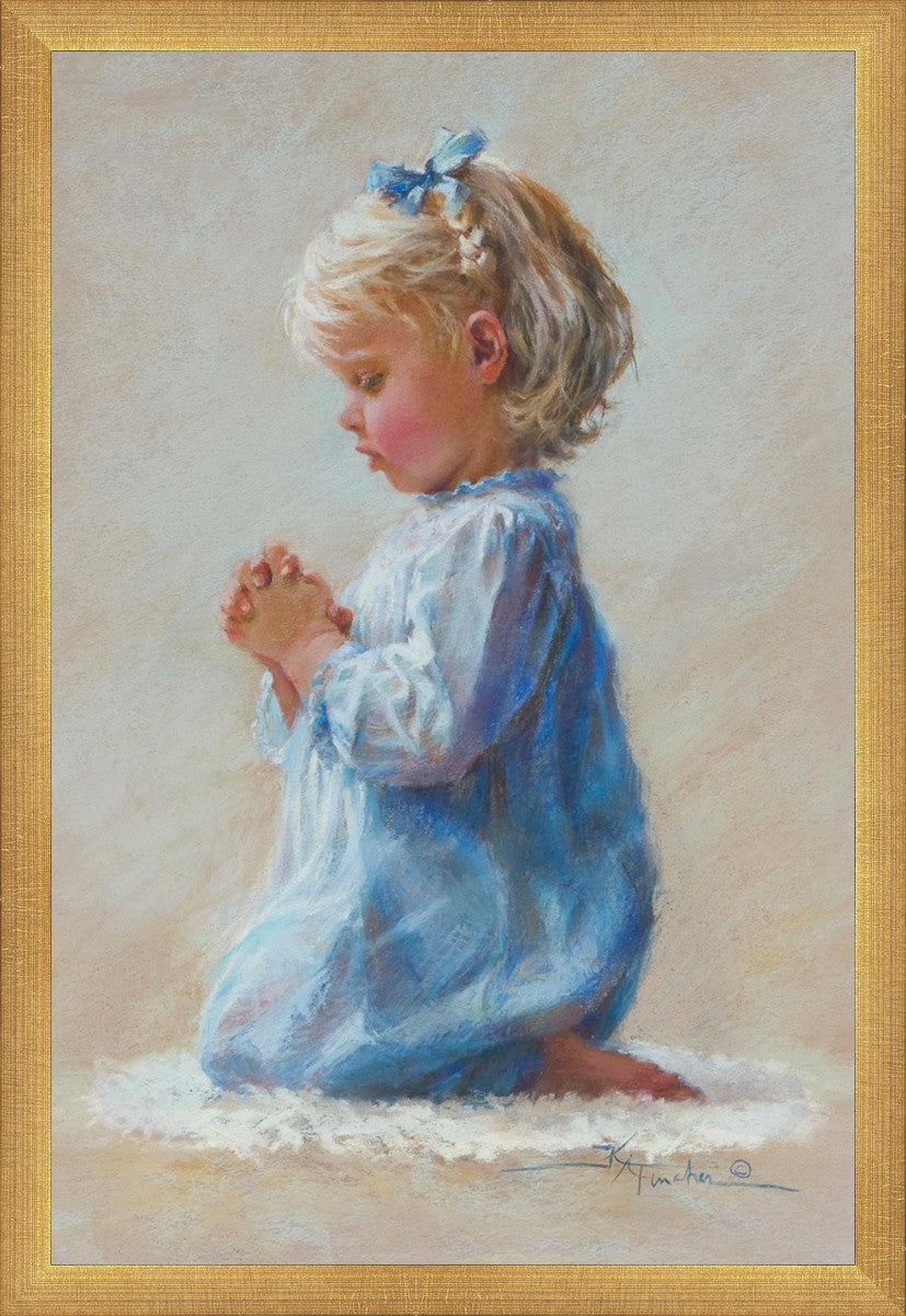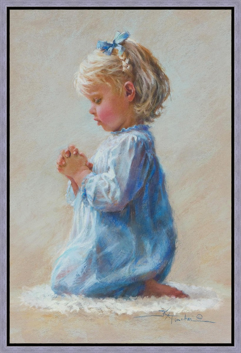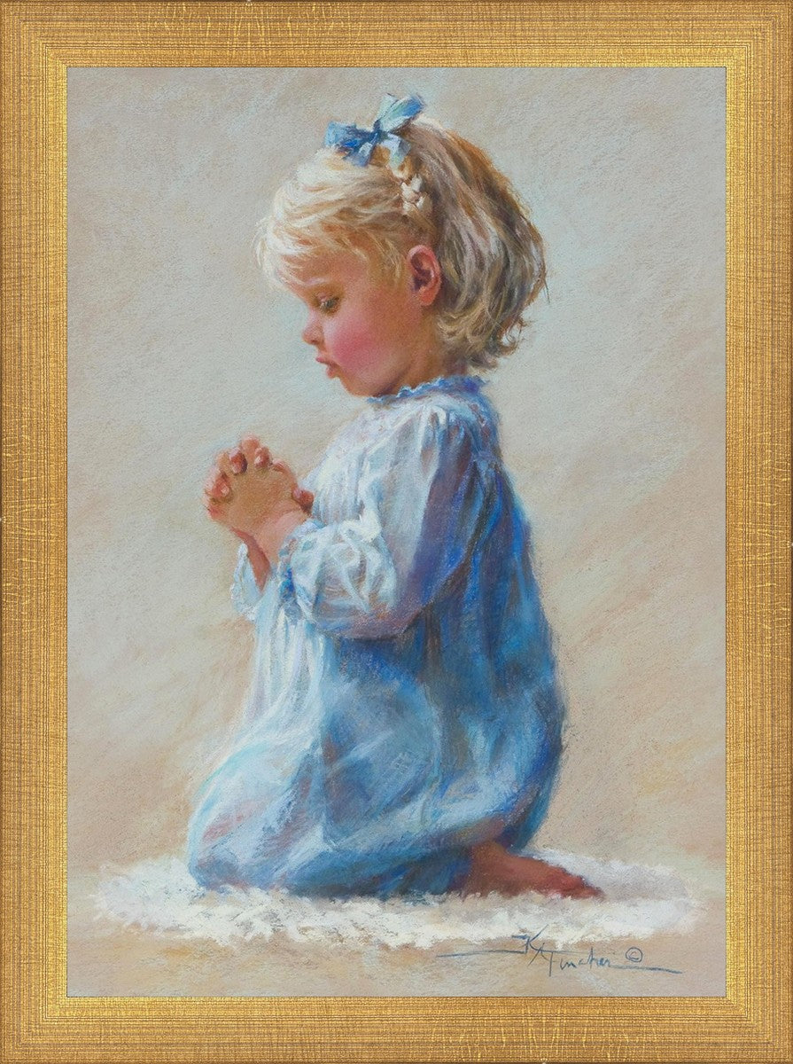 “Dear Jesus” is a modern-day interpretation of the timeless Prayer Children painted in 1940 by Bessie Pease Gutmann. A copy of Gutmann’s prayer girl was painted by my mother, a portrait painter, in the ‘50’s and hung over my bed with “Kathy’s Prayer” written across the bottom.