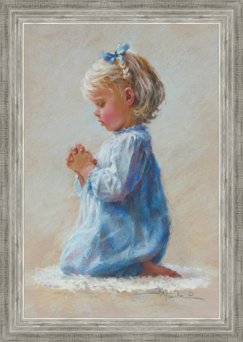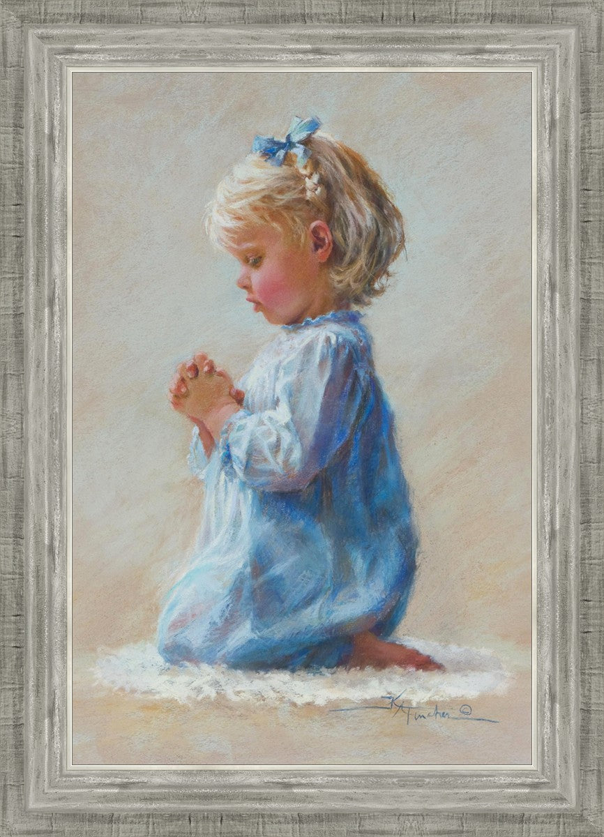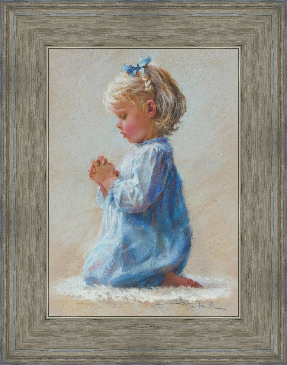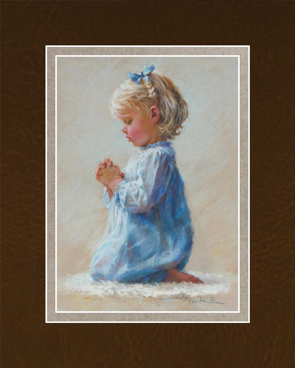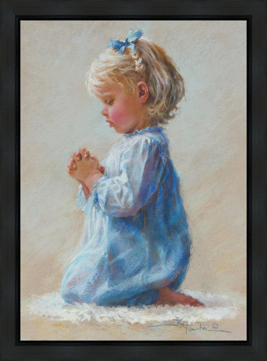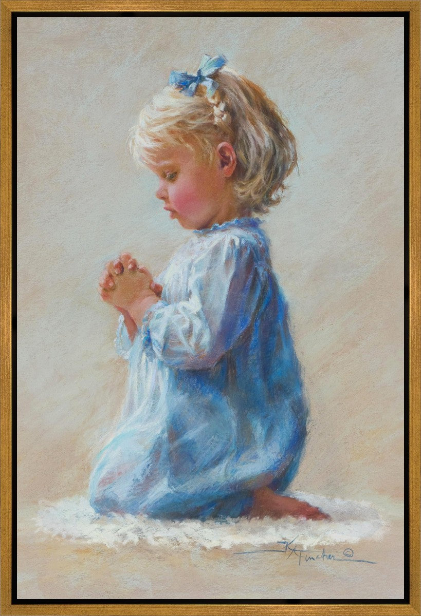“Dear Jesus” is a modern-day interpretation of the timeless Prayer Children painted in 1940 by Bessie Pease Gutmann. A copy of Gutmann’s prayer girl was painted by my mother, a portrait painter, in the ‘50’s and hung over my bed with “Kathy’s Prayer” written across the bottom.