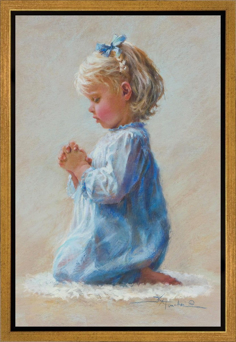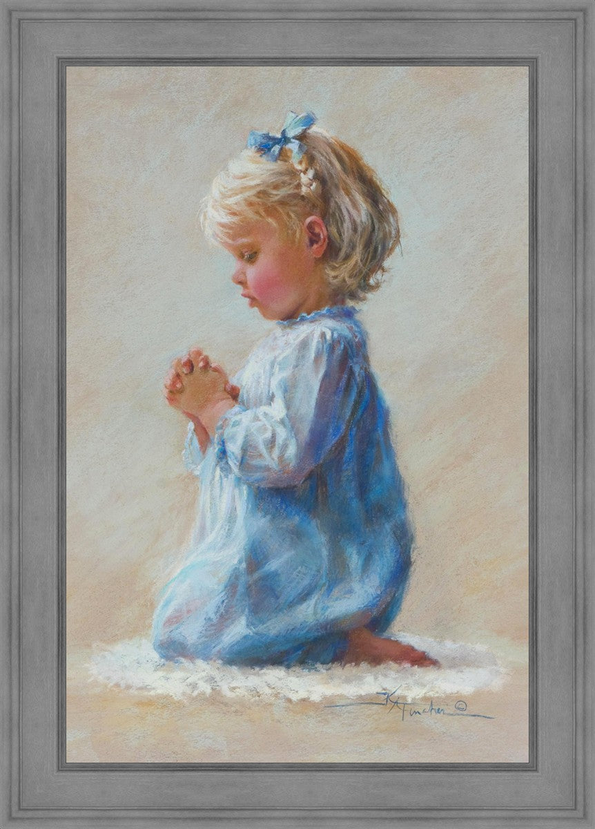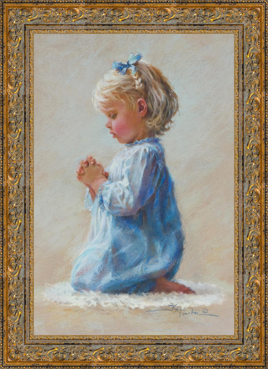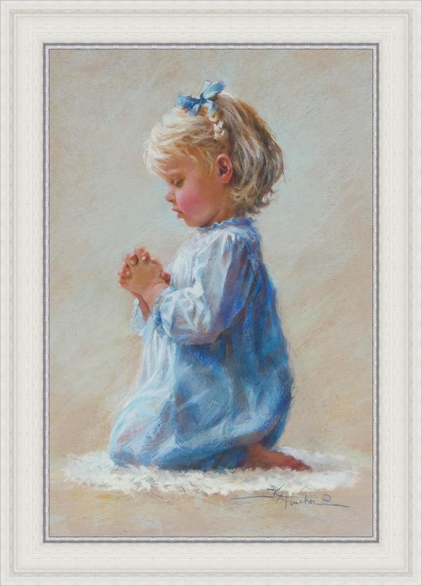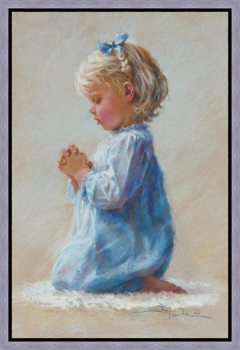 “Dear Jesus” is a modern-day interpretation of the timeless Prayer Children painted in 1940 by Bessie Pease Gutmann. A copy of Gutmann’s prayer girl was painted by my mother, a portrait painter, in the ‘50’s and hung over my bed with “Kathy’s Prayer” written across the bottom.