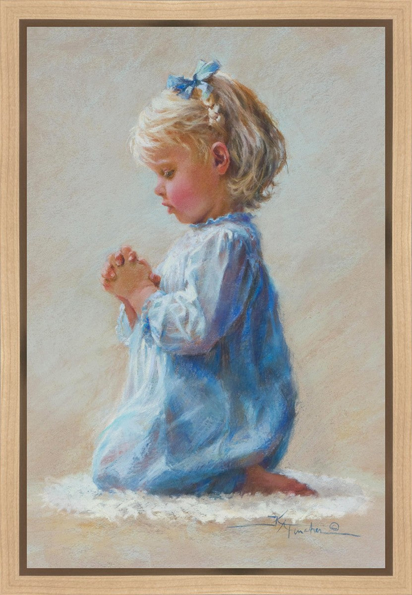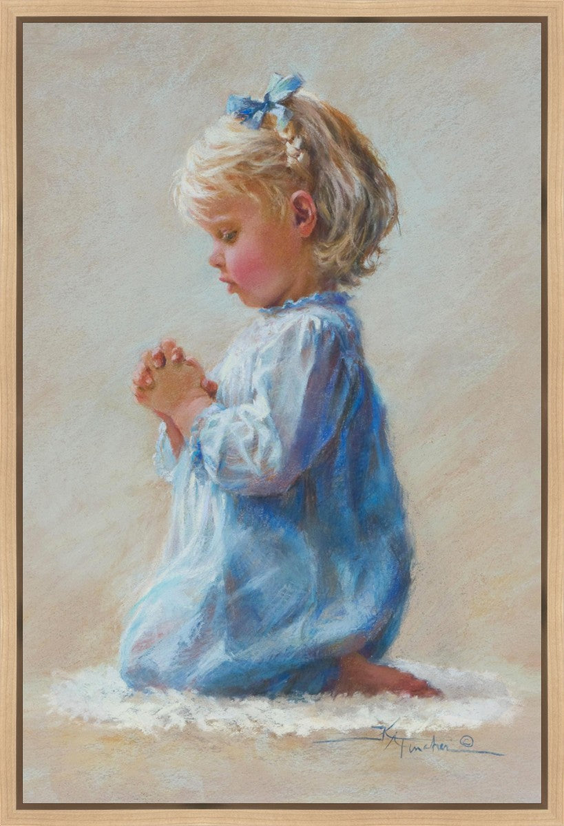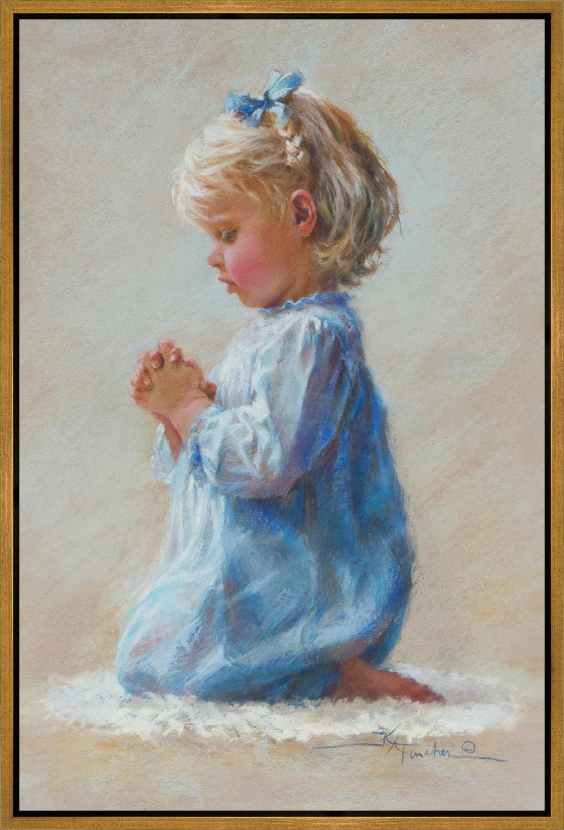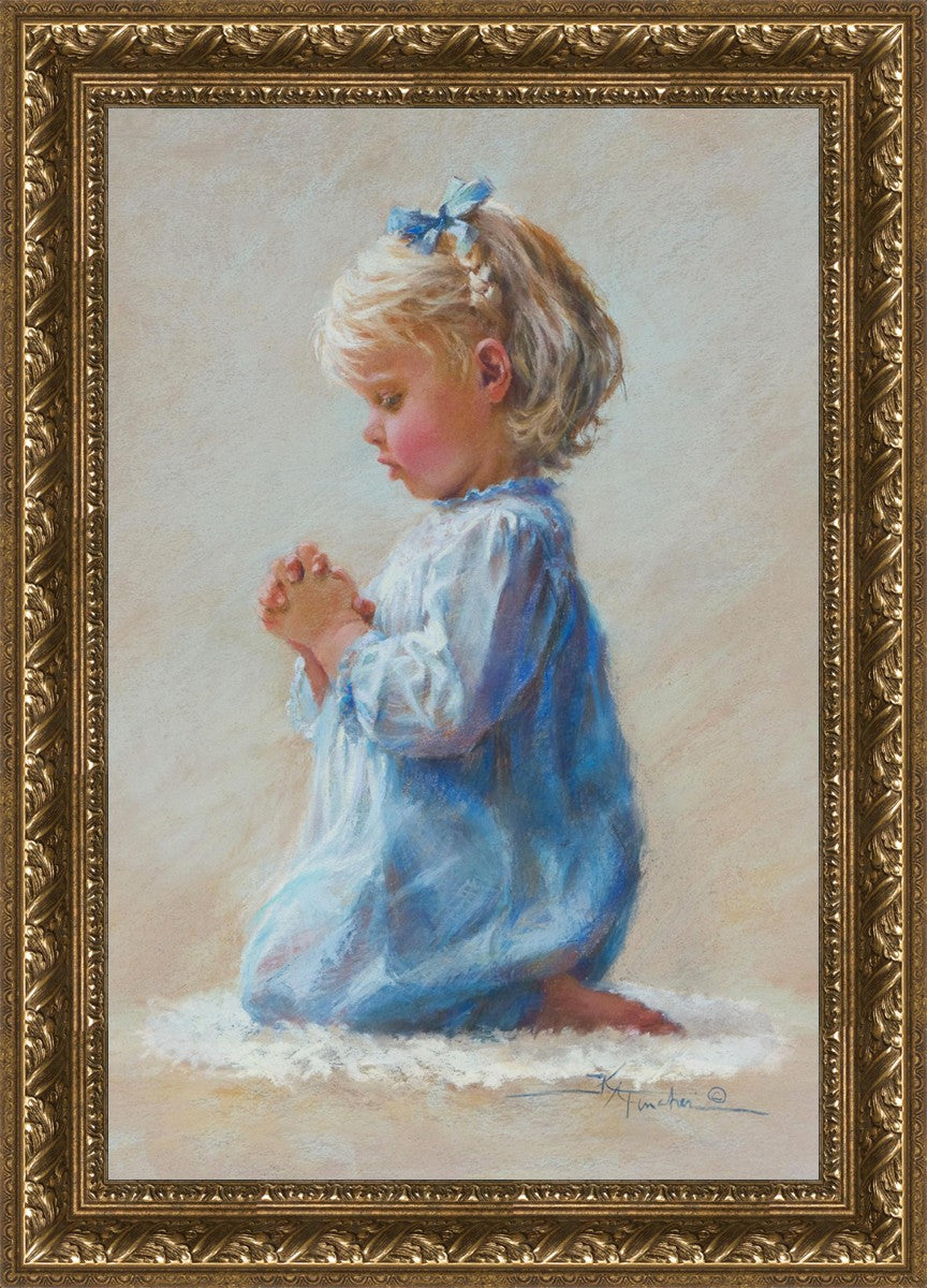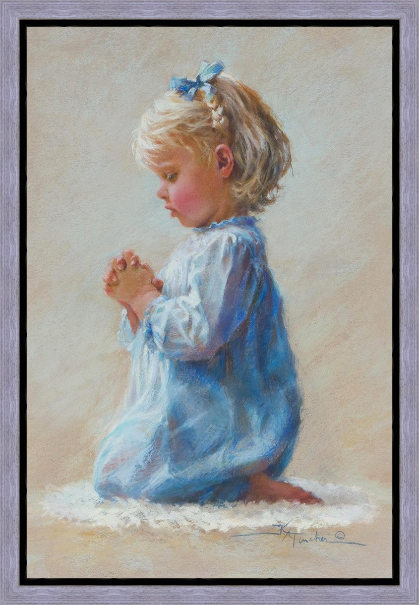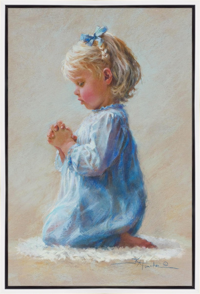 “Dear Jesus” is a modern-day interpretation of the timeless Prayer Children painted in 1940 by Bessie Pease Gutmann. A copy of Gutmann’s prayer girl was painted by my mother, a portrait painter, in the ‘50’s and hung over my bed with “Kathy’s Prayer” written across the bottom.