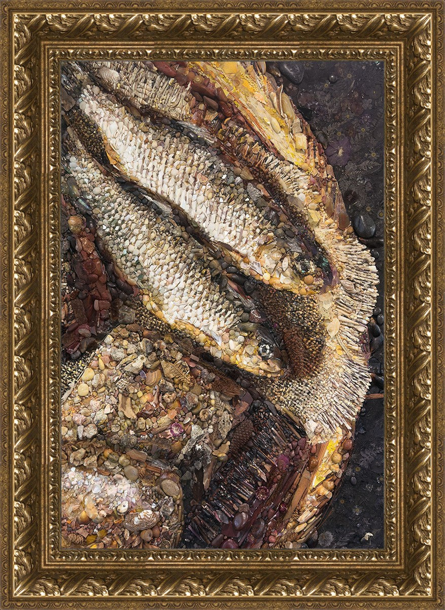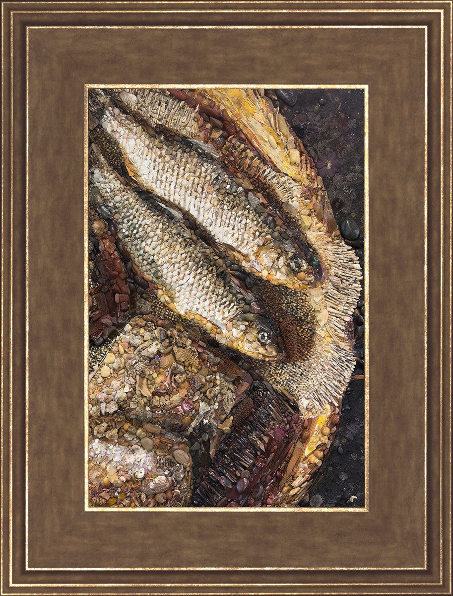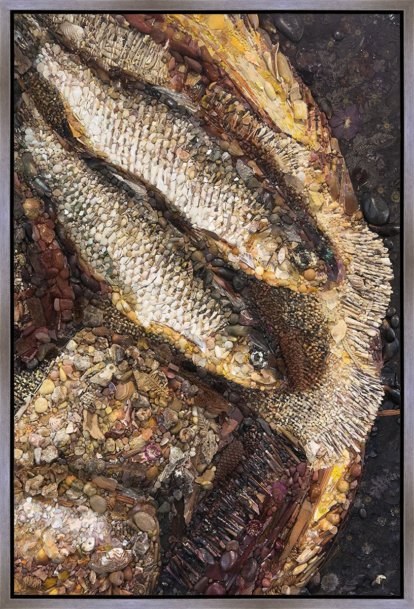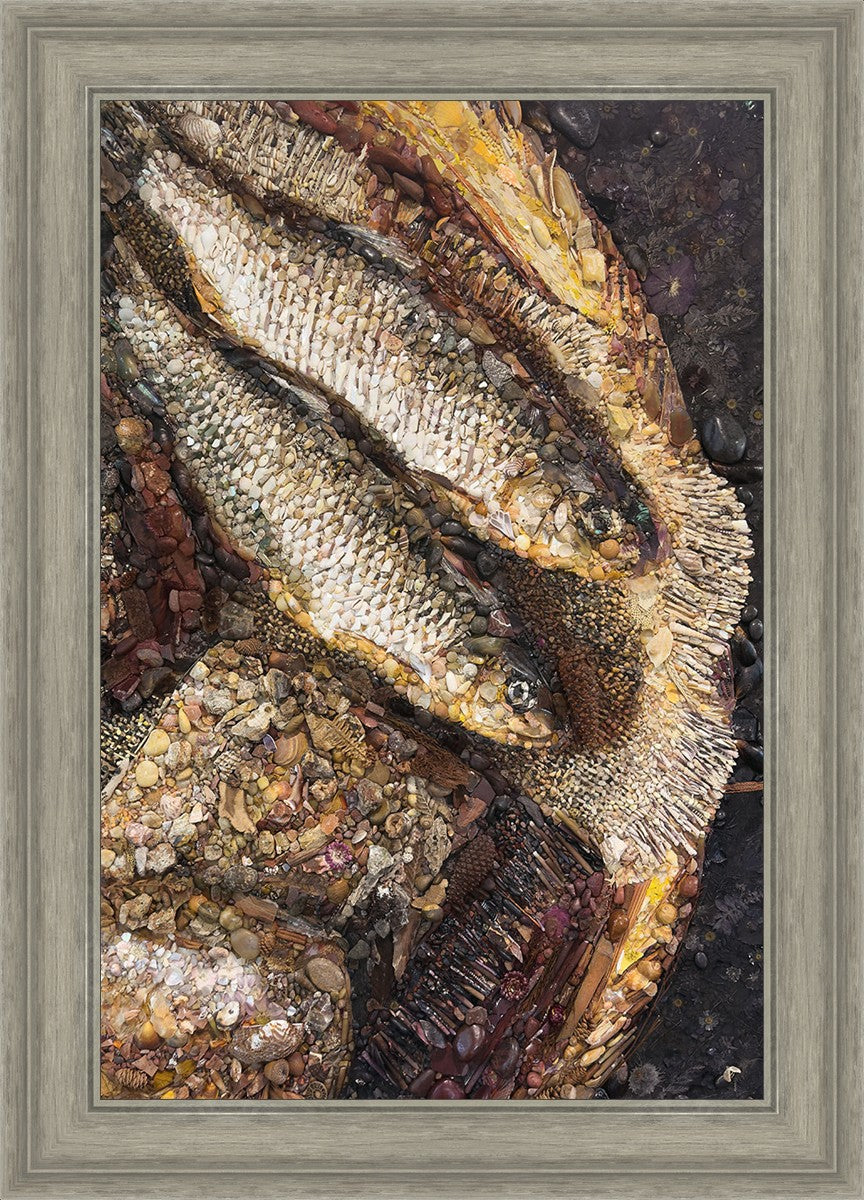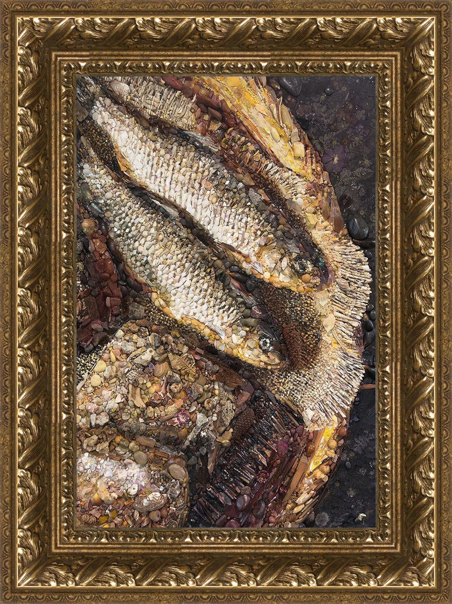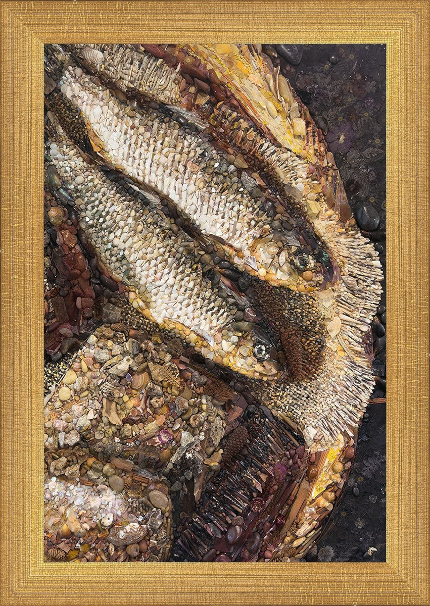 Collage artwork assembled out of natural materials depicting a cropped view of fish and loaves of bread that fed the 5,000 people.