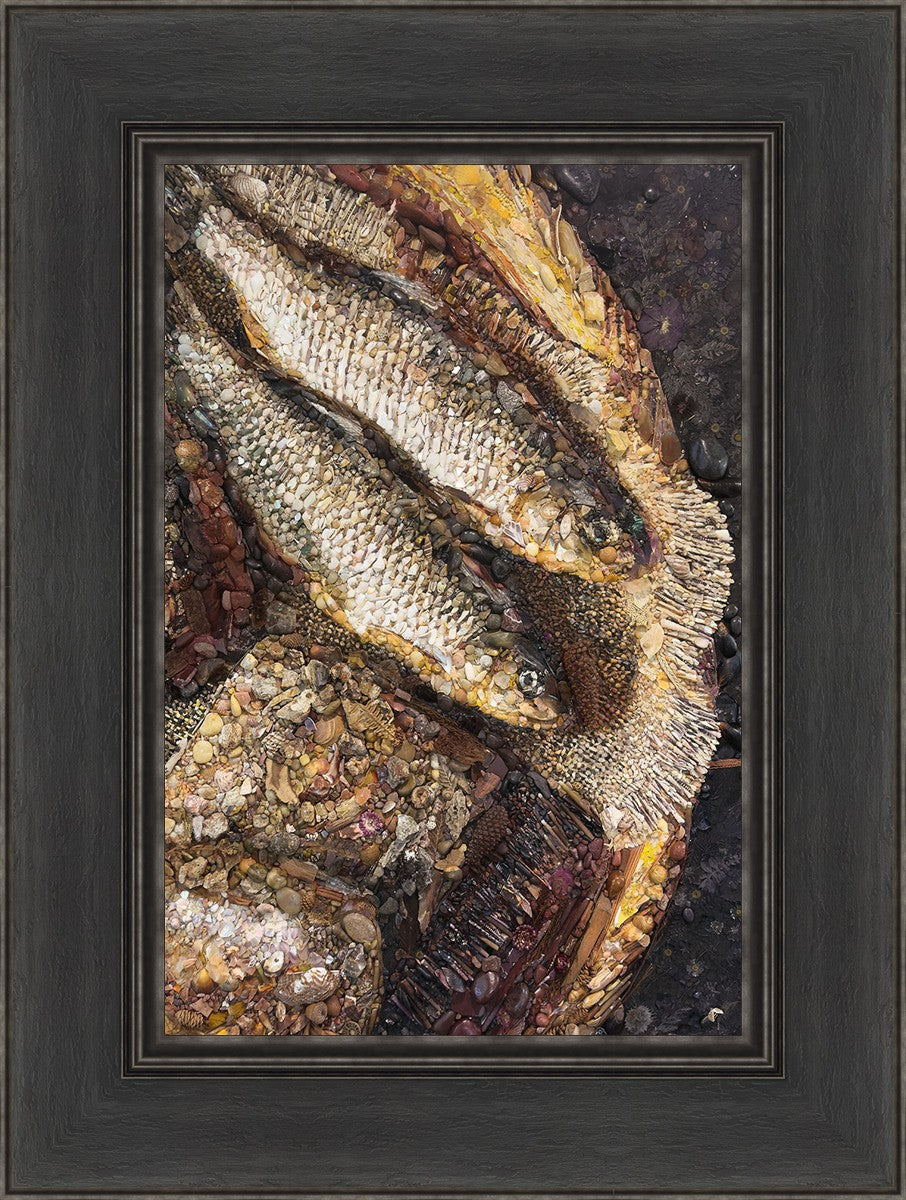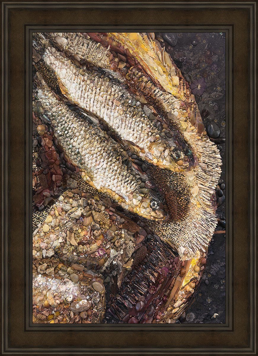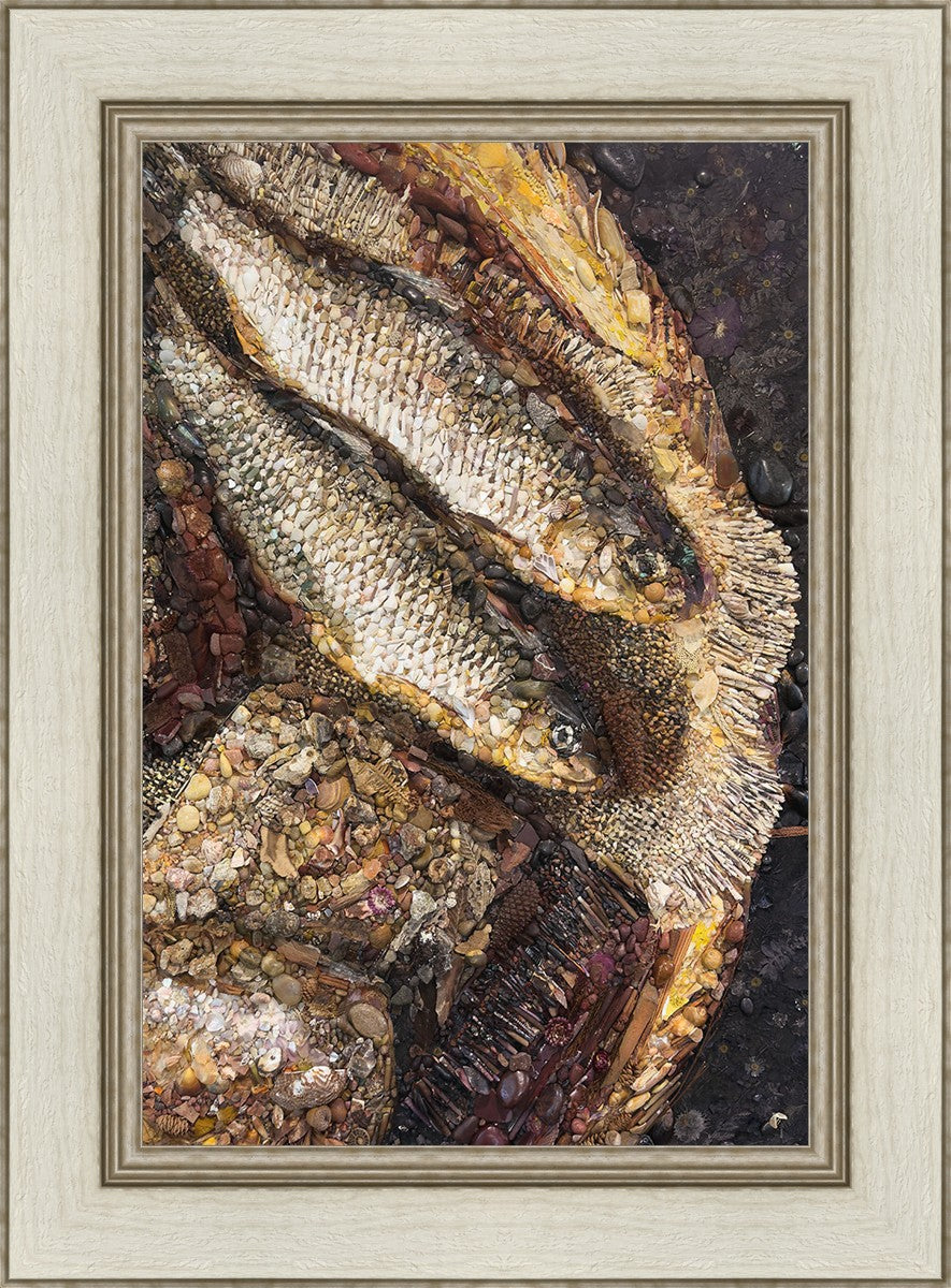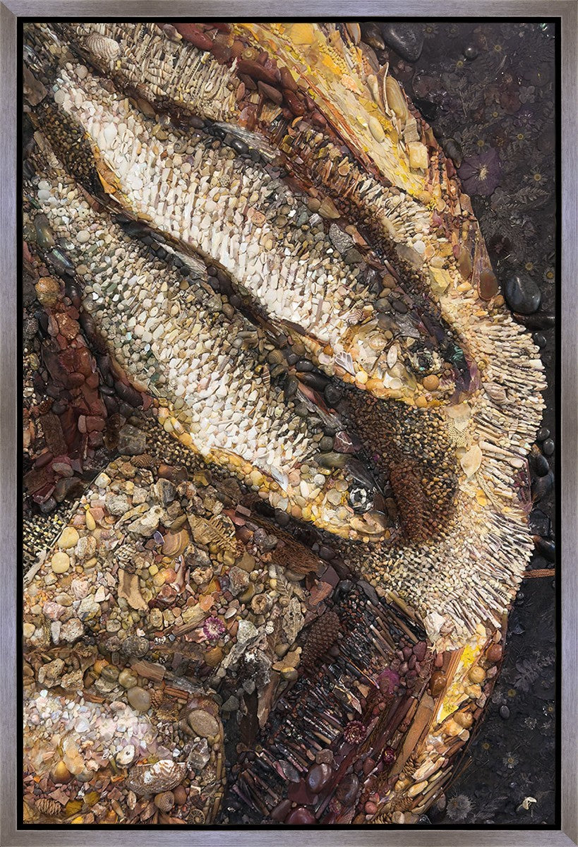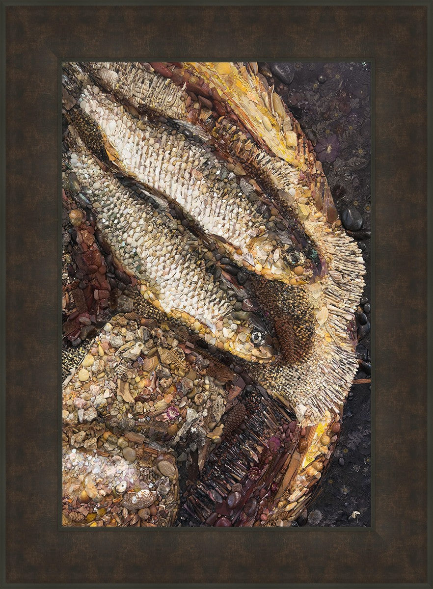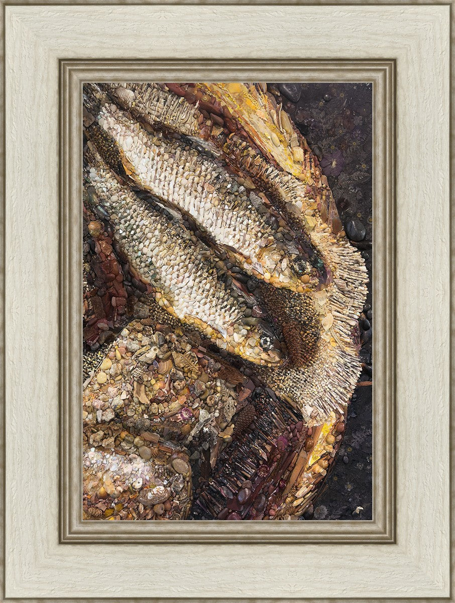 Collage artwork assembled out of natural materials depicting a cropped view of fish and loaves of bread that fed the 5,000 people.