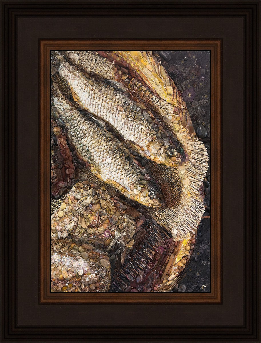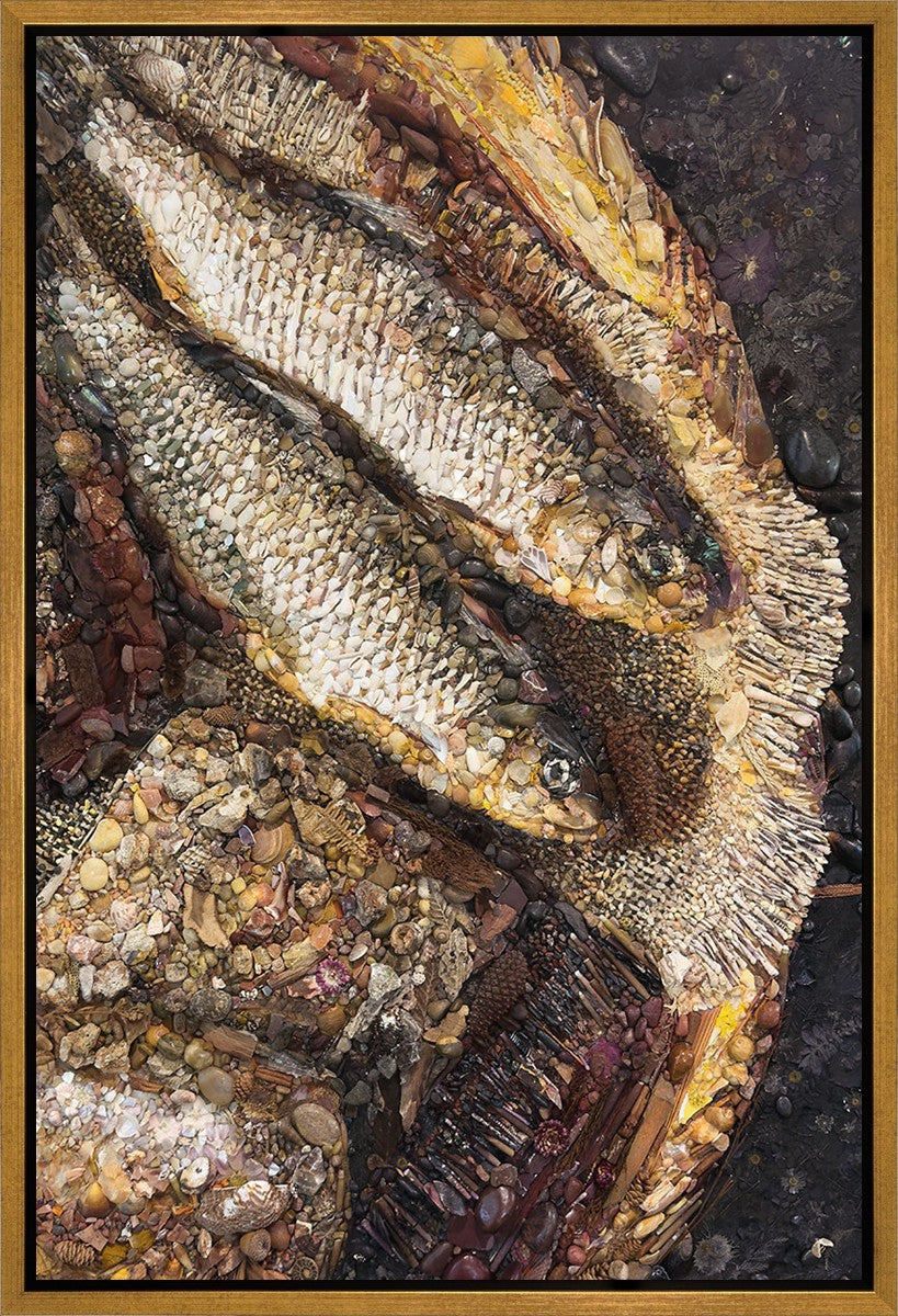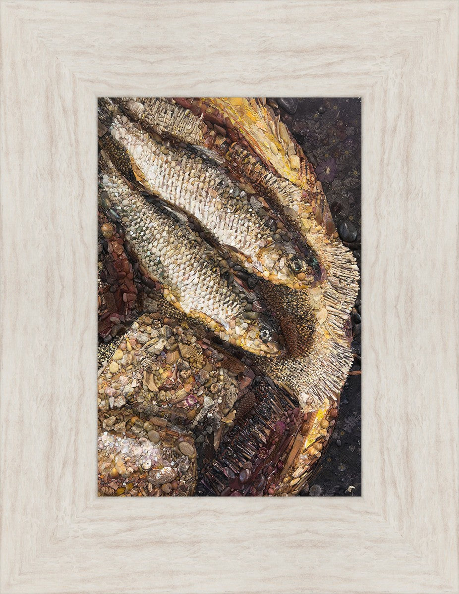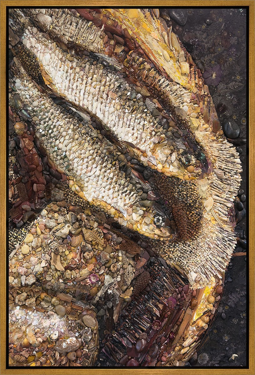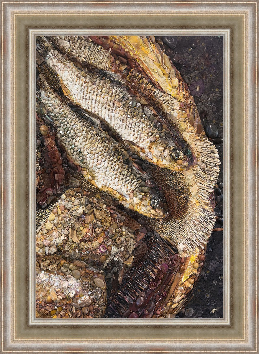 Collage artwork assembled out of natural materials depicting a cropped view of fish and loaves of bread that fed the 5,000 people.
