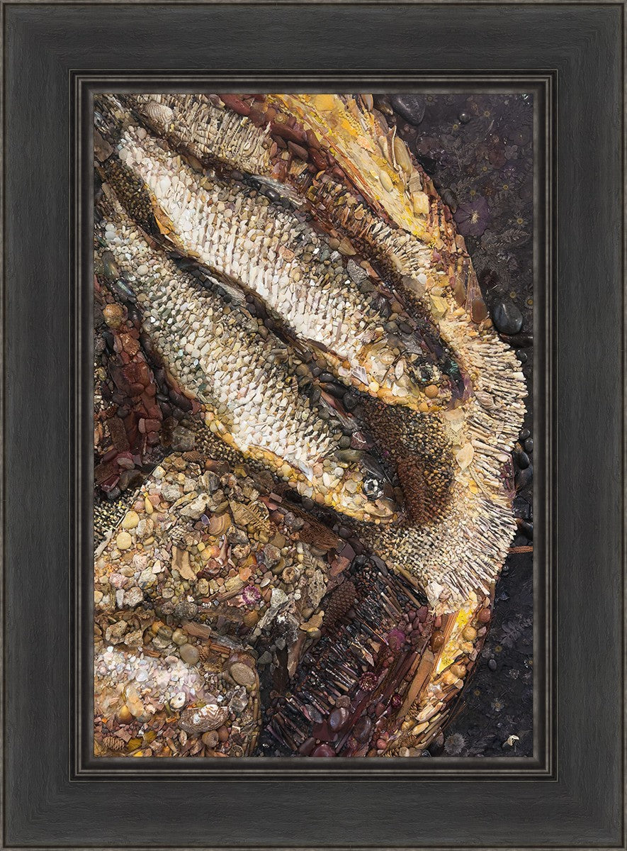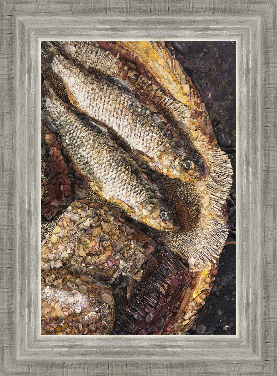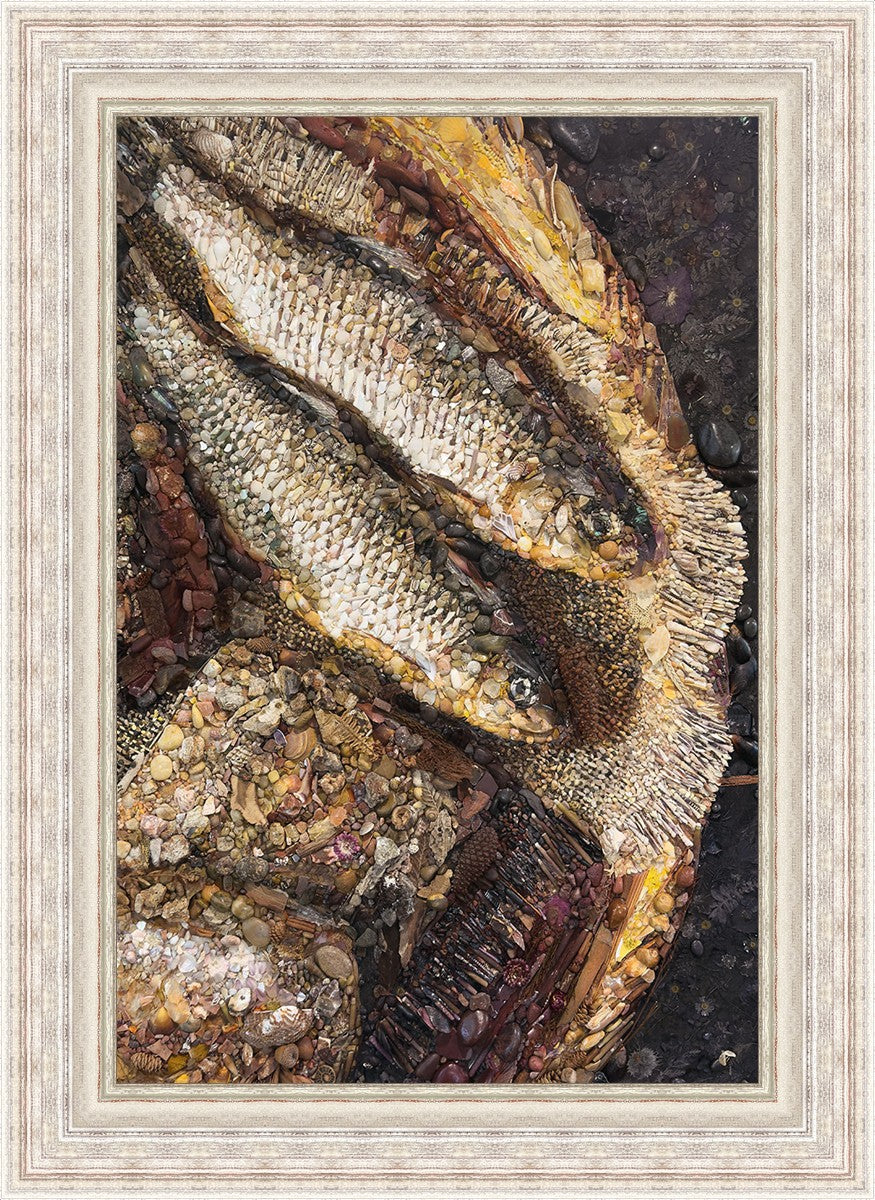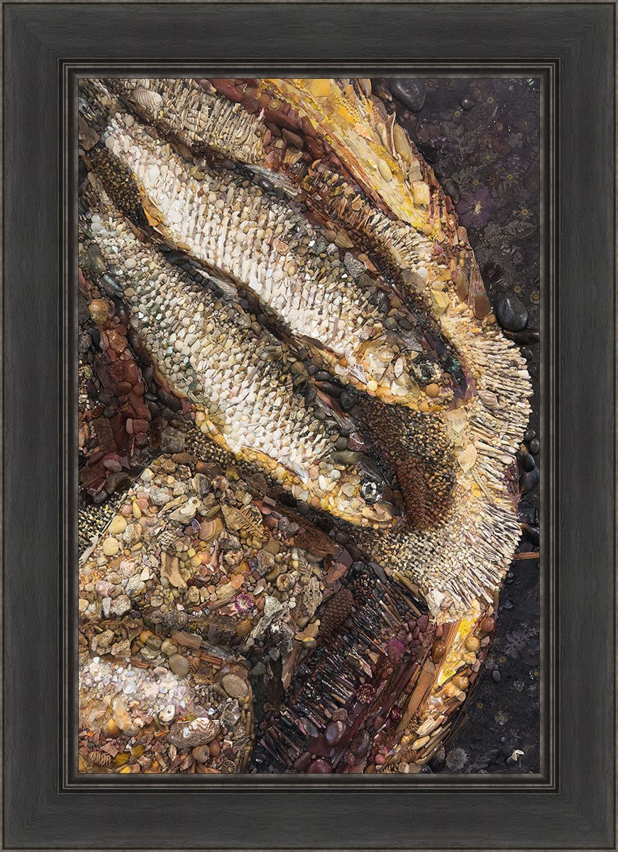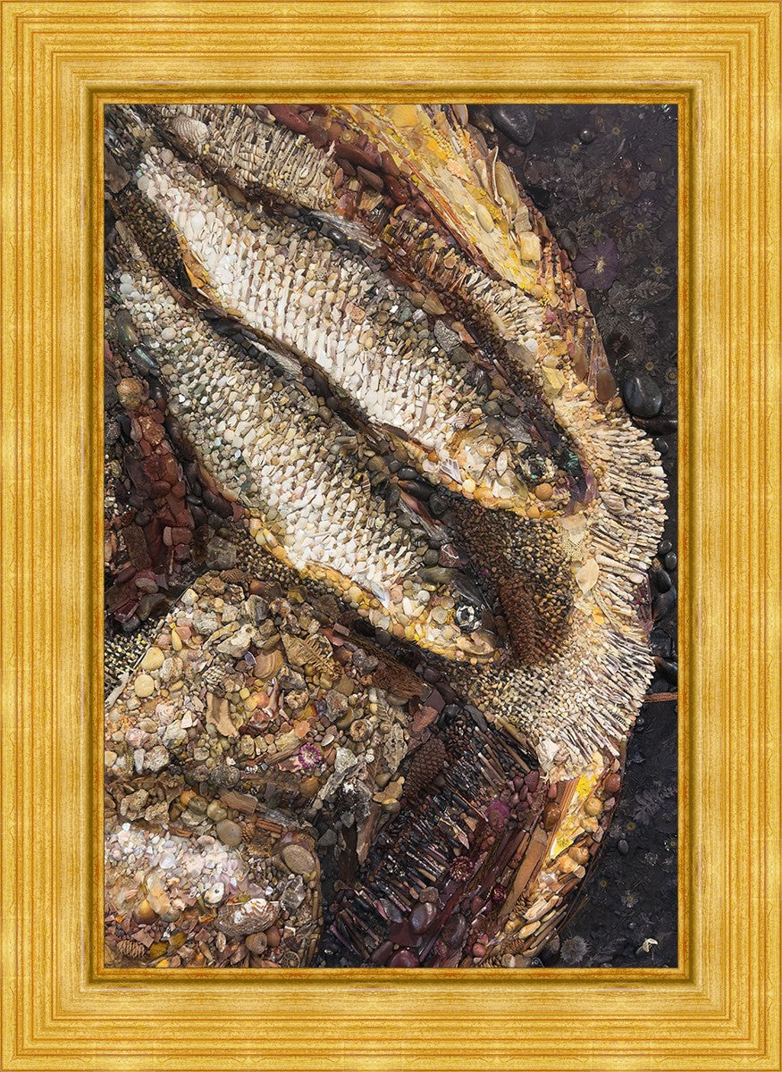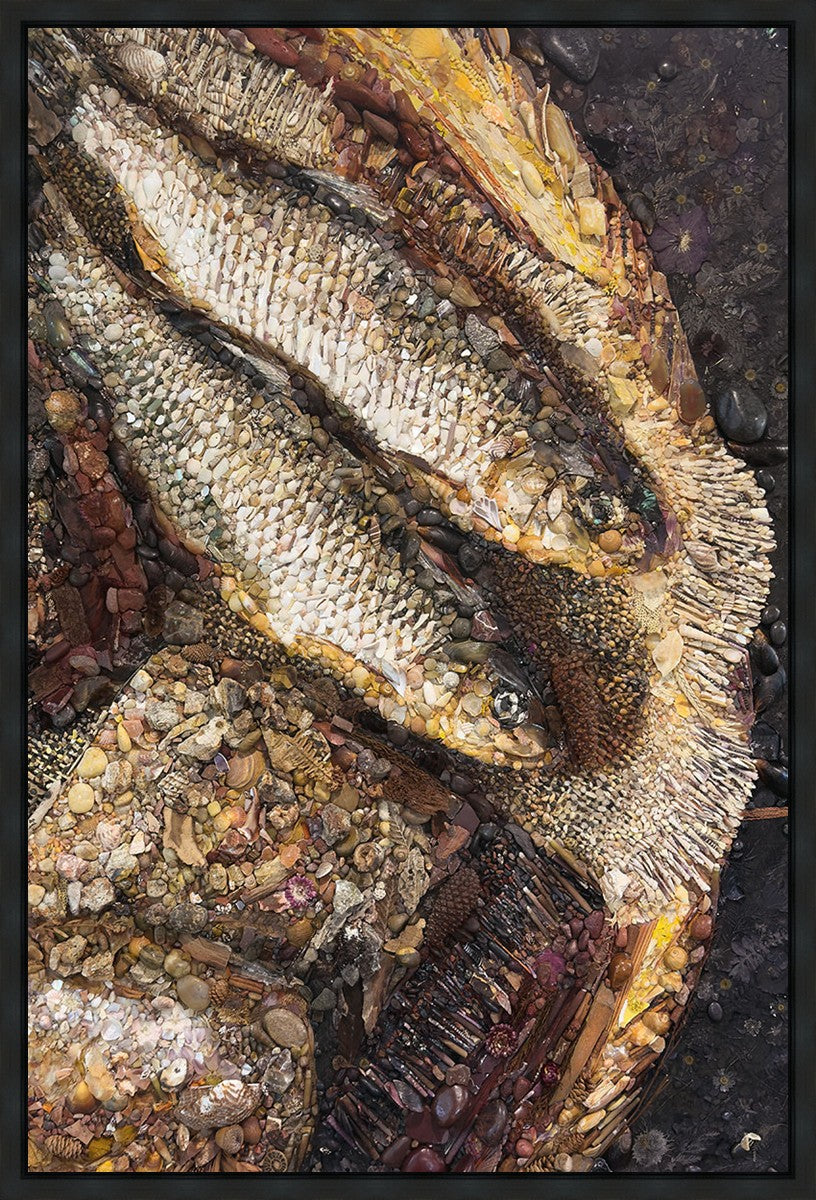 Collage artwork assembled out of natural materials depicting a cropped view of fish and loaves of bread that fed the 5,000 people.
