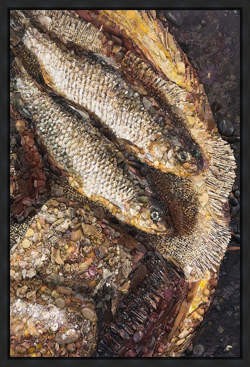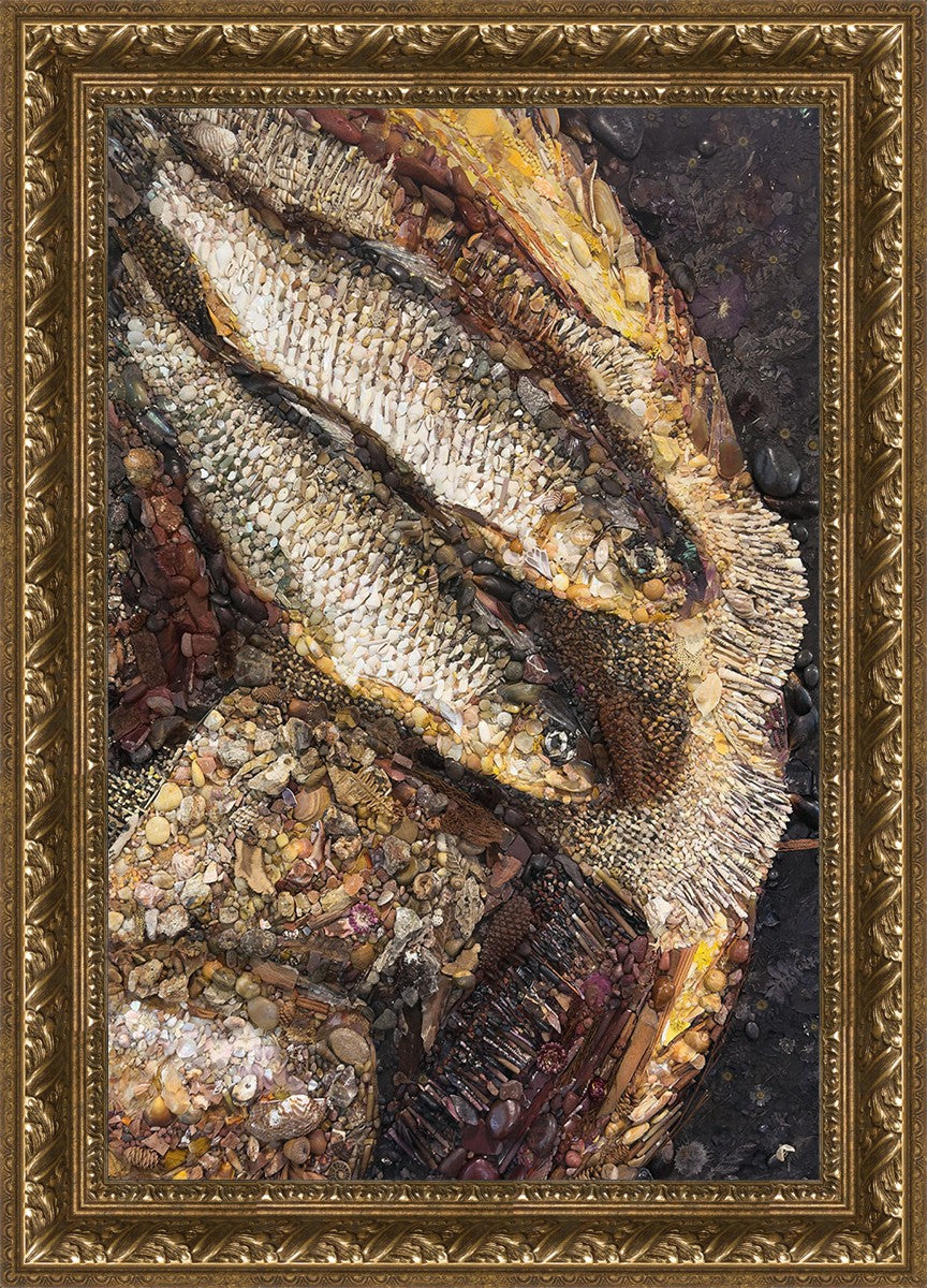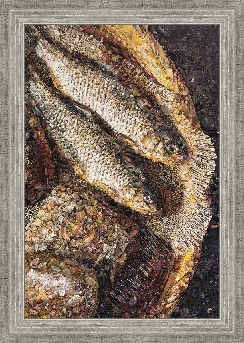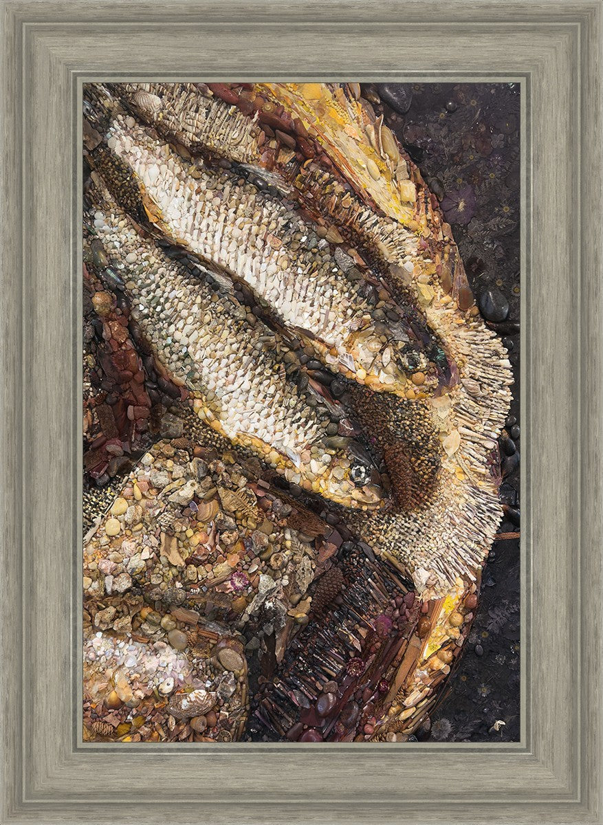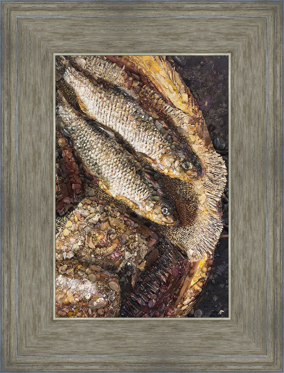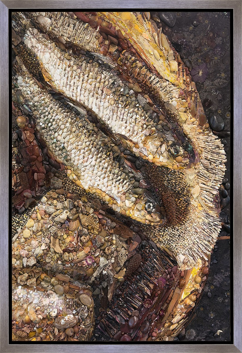 Collage artwork assembled out of natural materials depicting a cropped view of fish and loaves of bread that fed the 5,000 people.