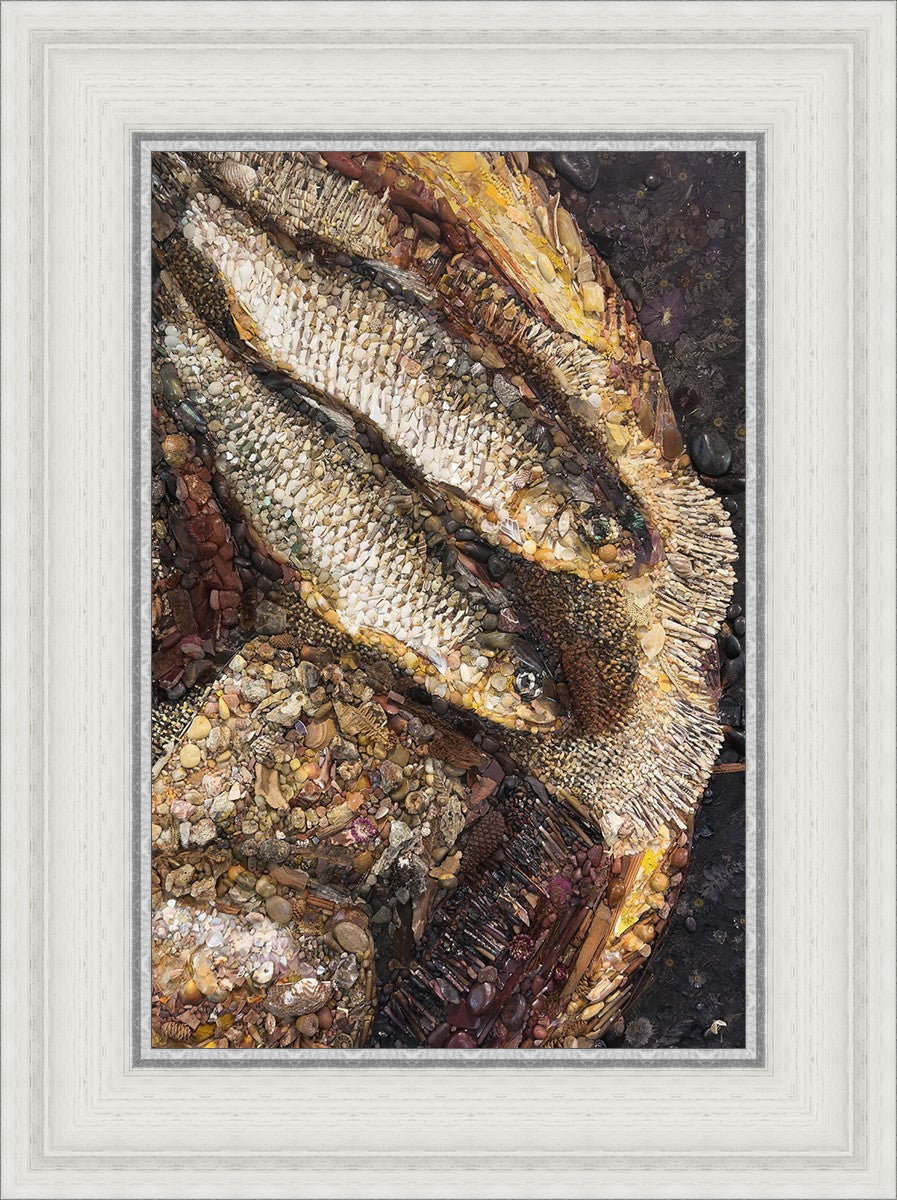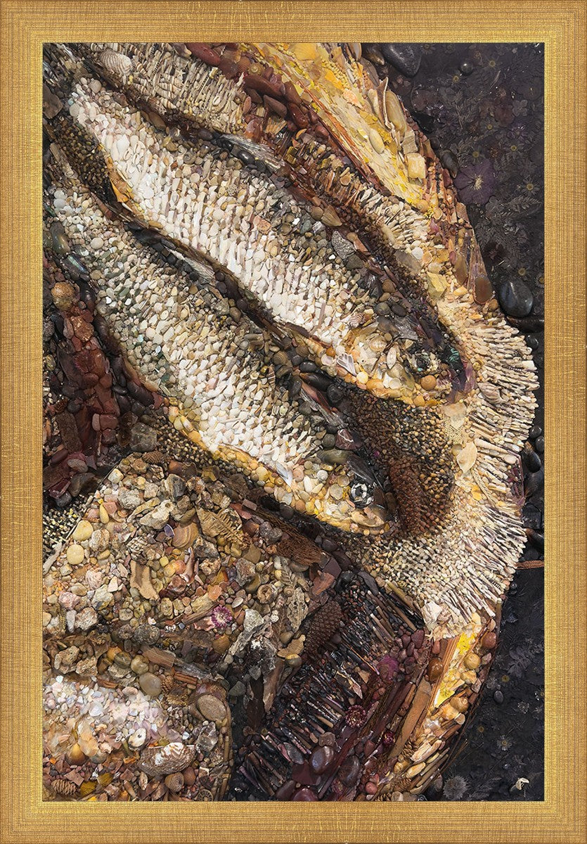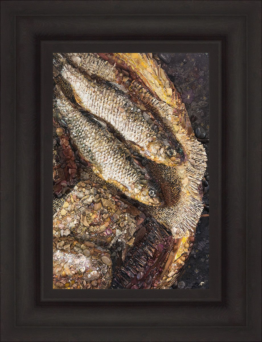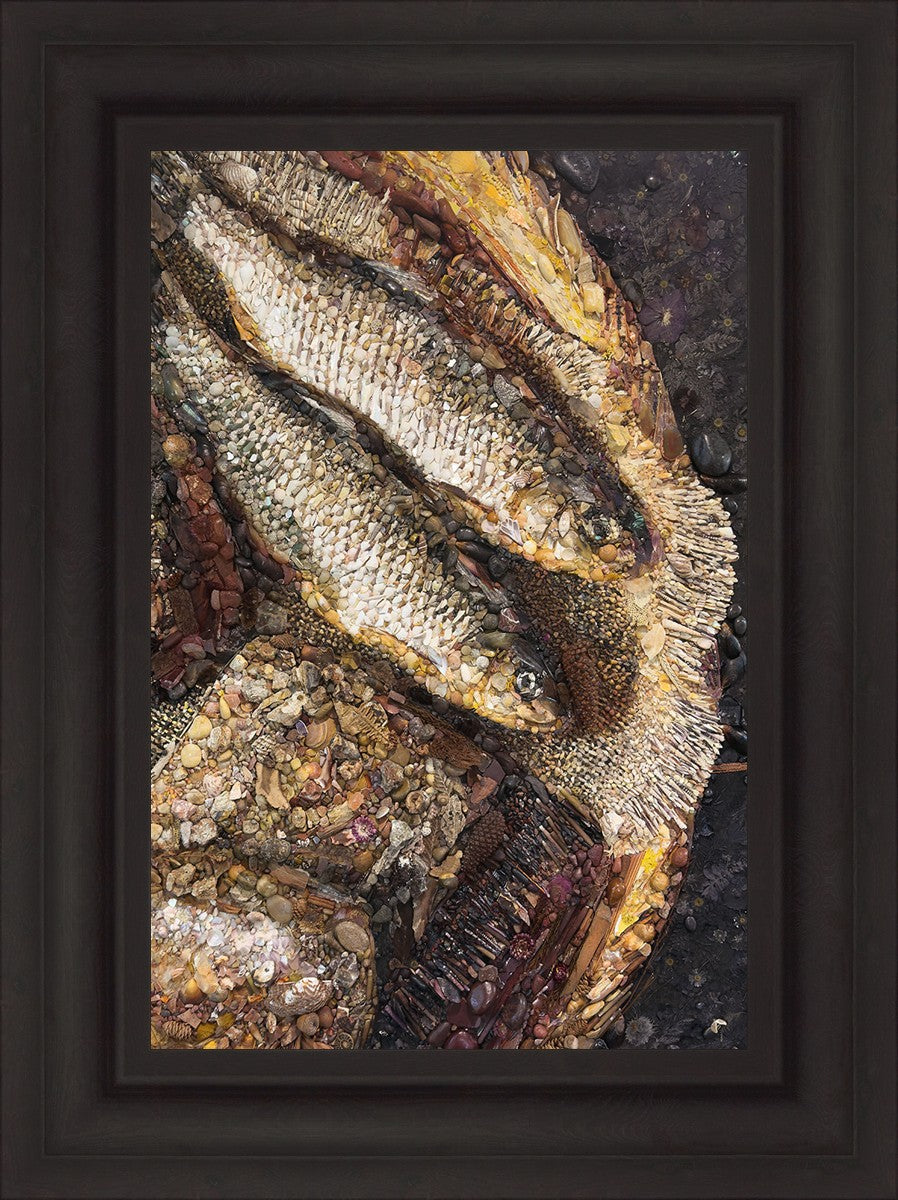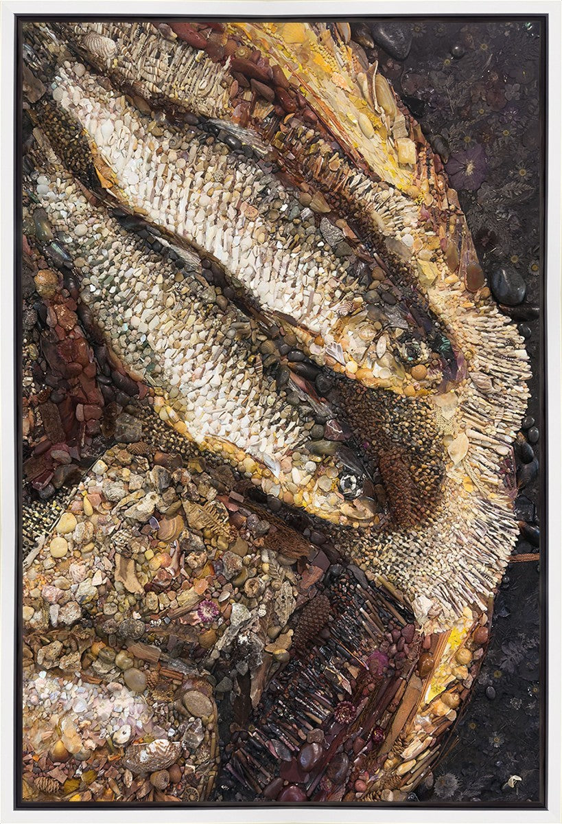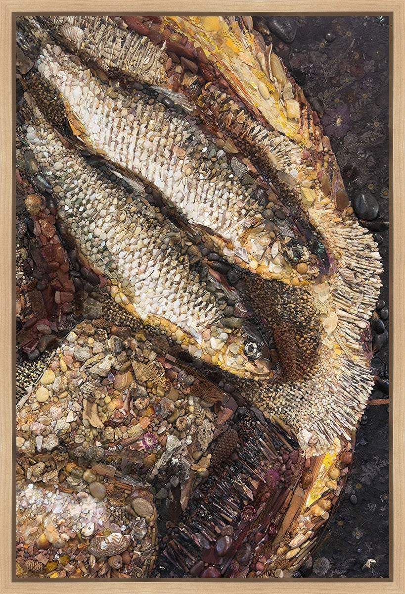 Collage artwork assembled out of natural materials depicting a cropped view of fish and loaves of bread that fed the 5,000 people.