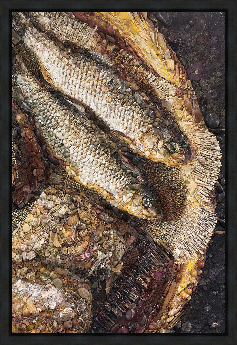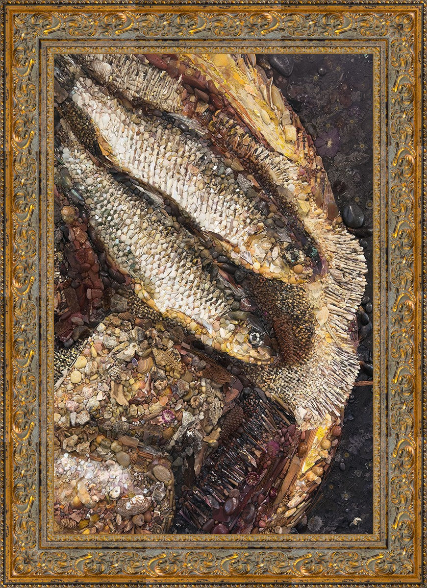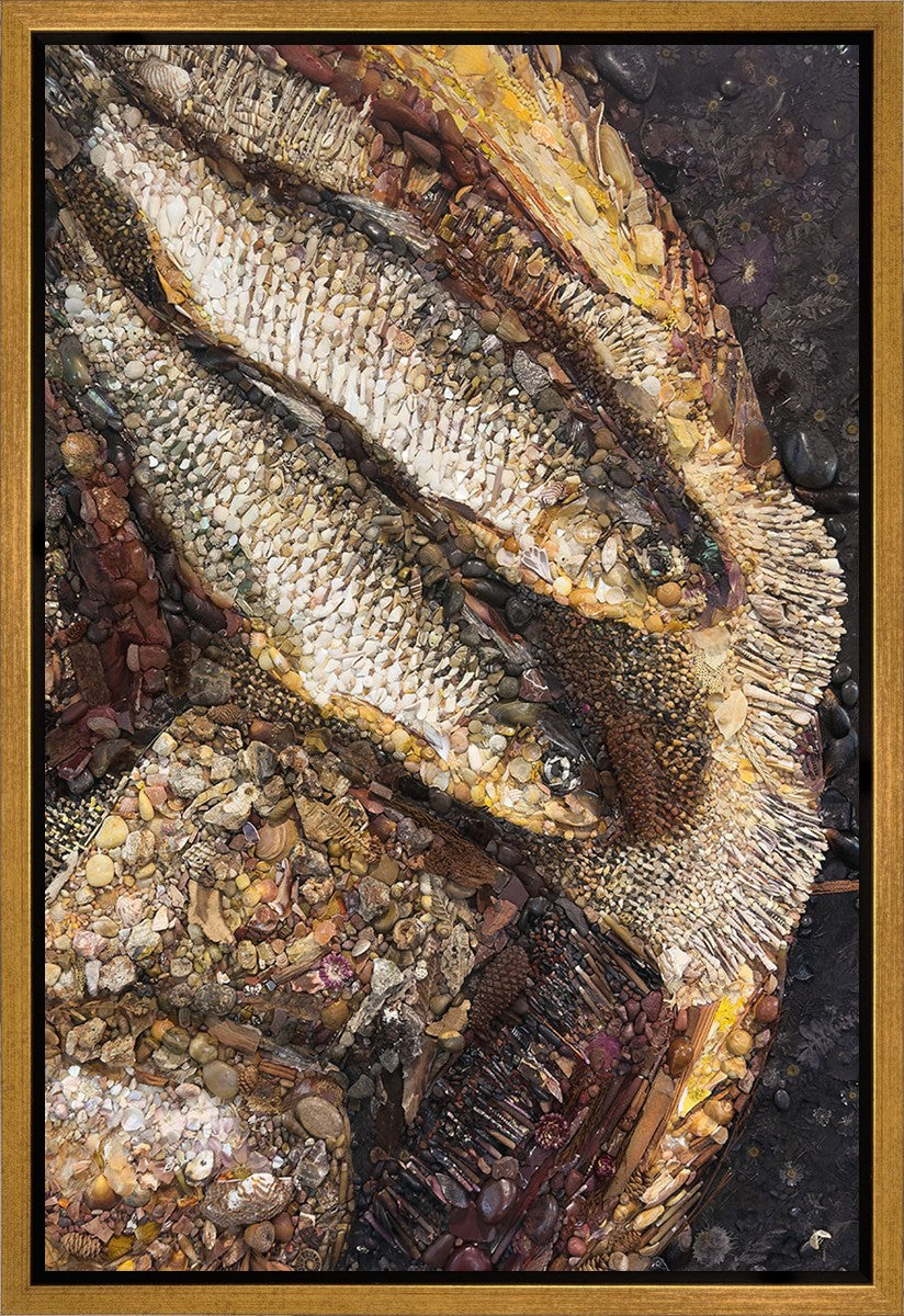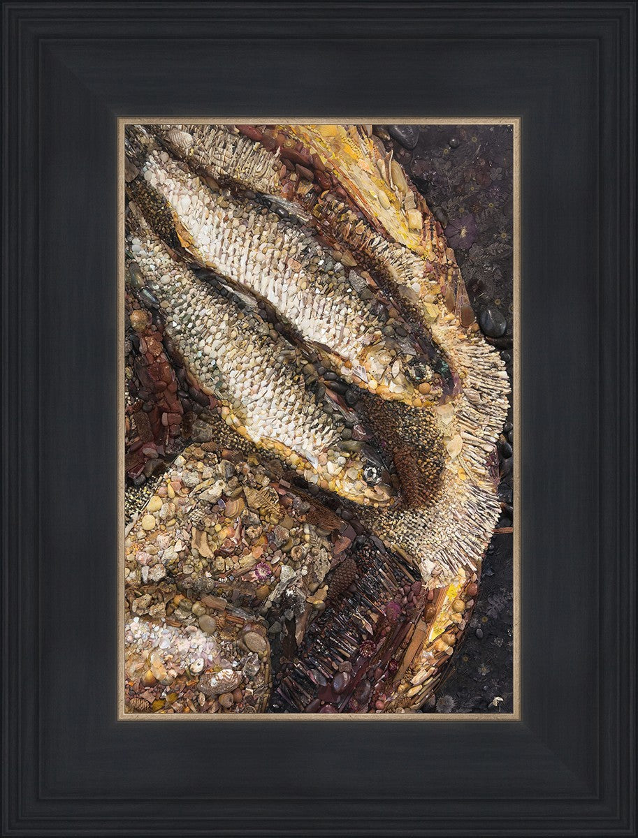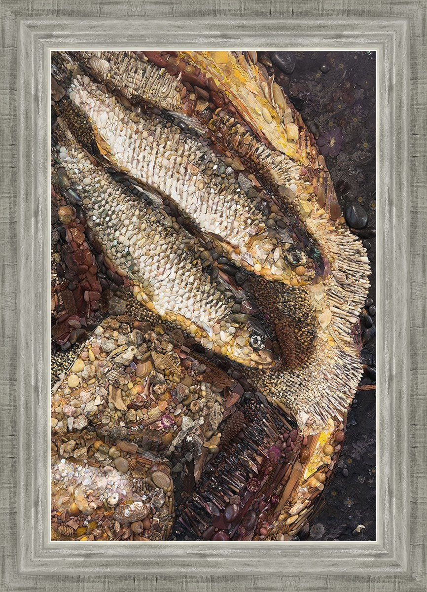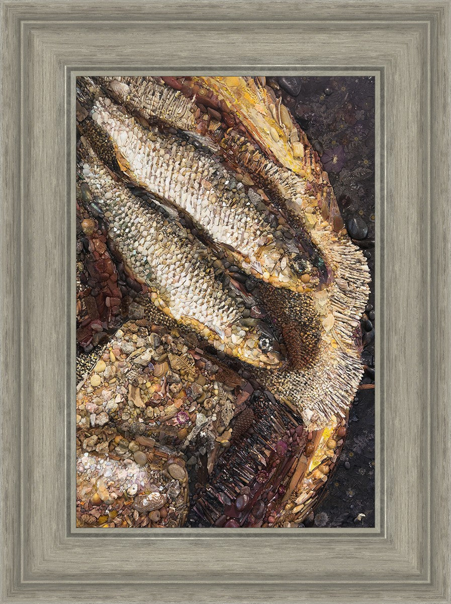 Collage artwork assembled out of natural materials depicting a cropped view of fish and loaves of bread that fed the 5,000 people.