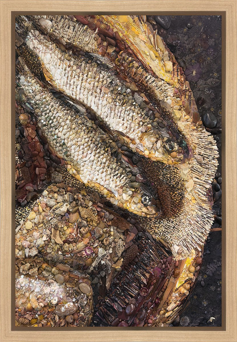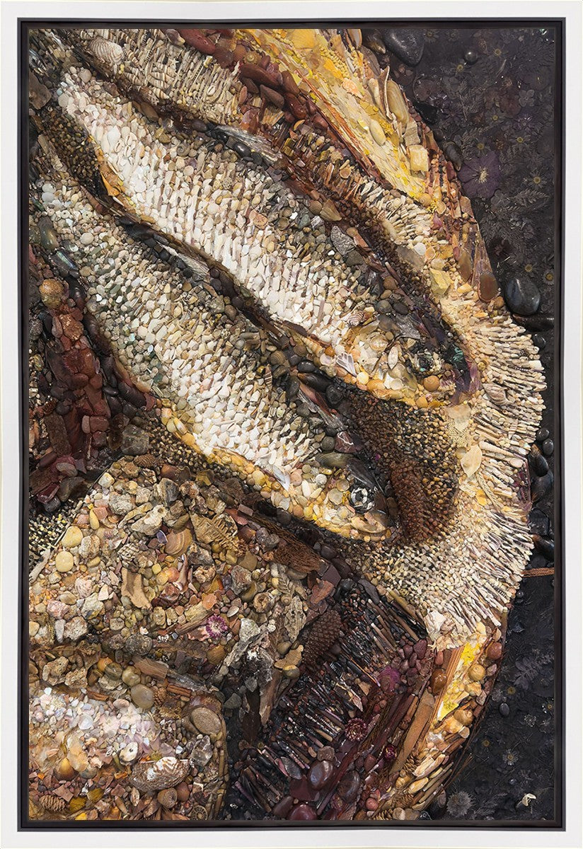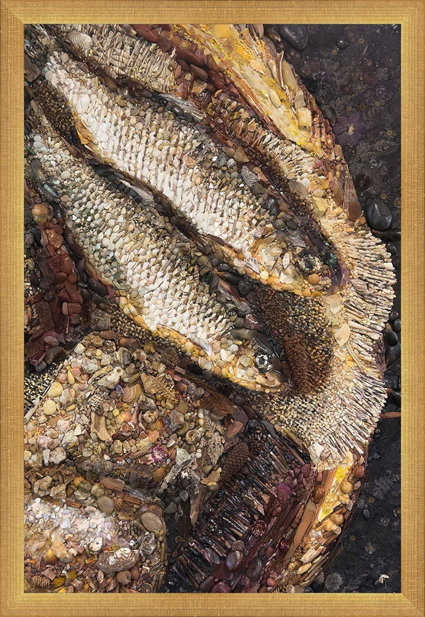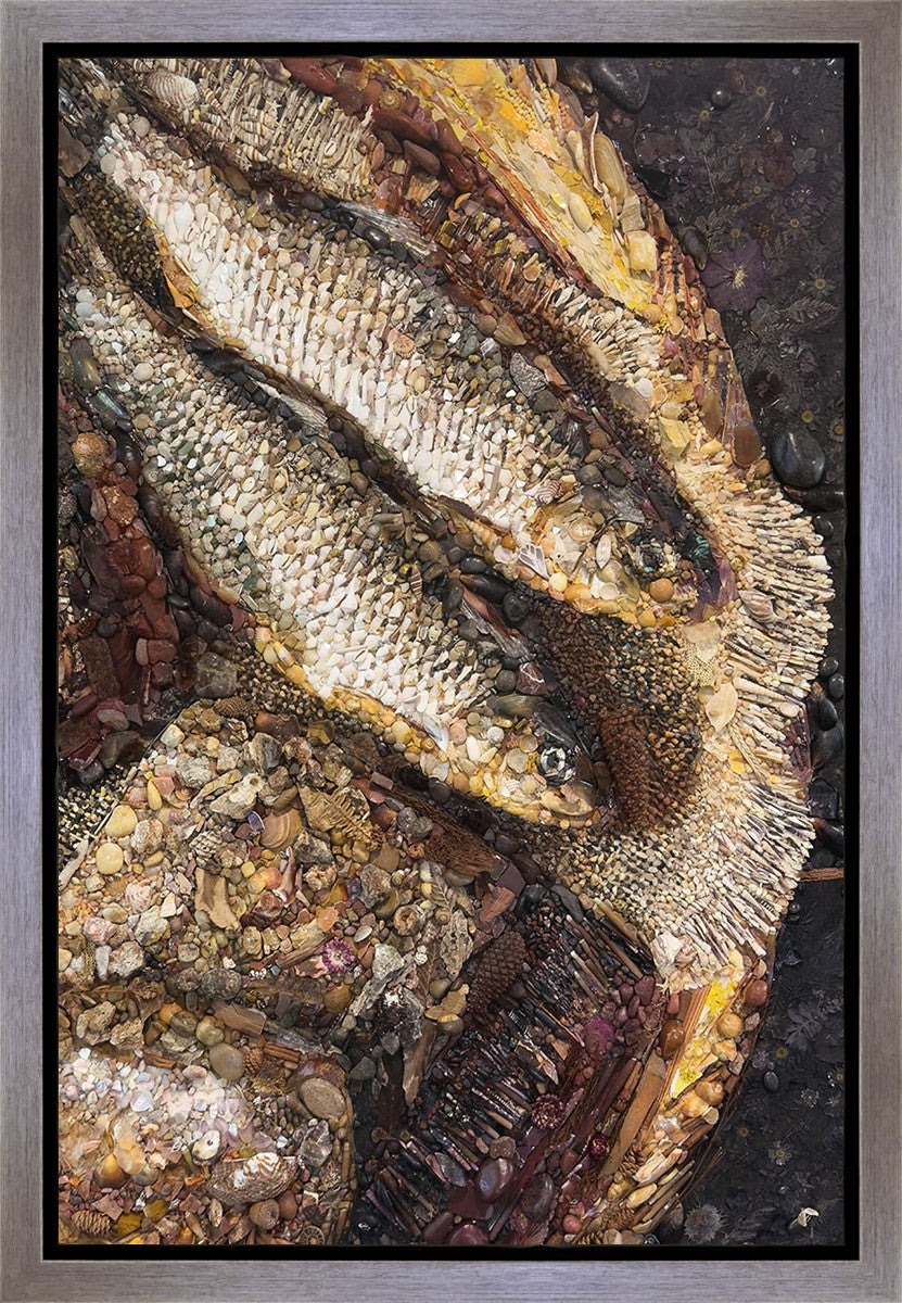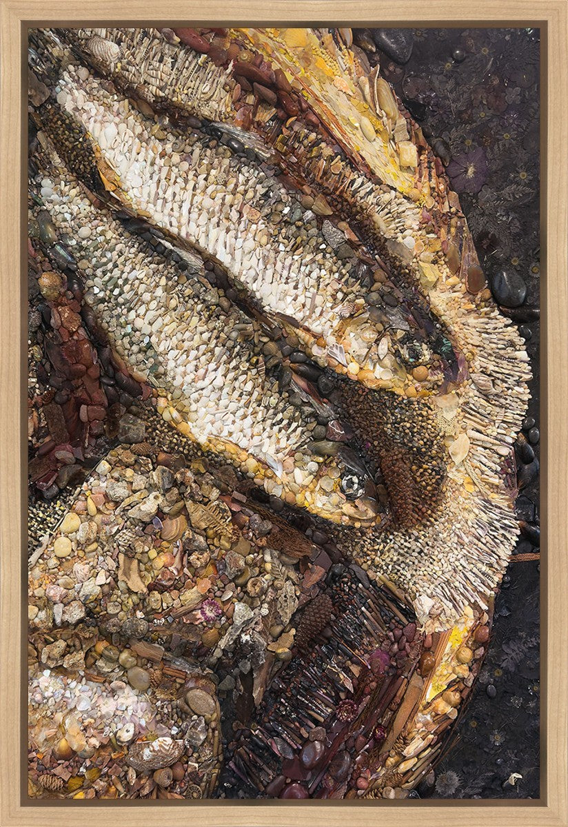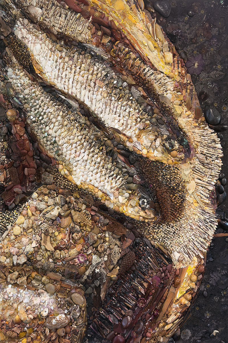 Collage artwork assembled out of natural materials depicting a cropped view of fish and loaves of bread that fed the 5,000 people.