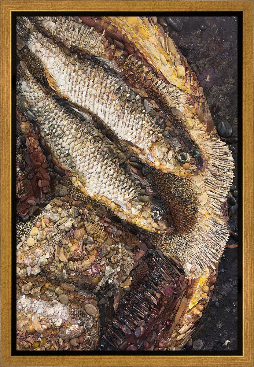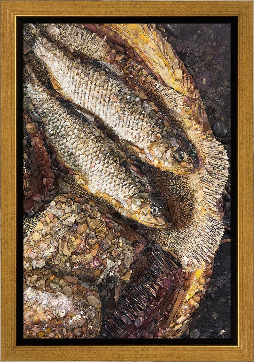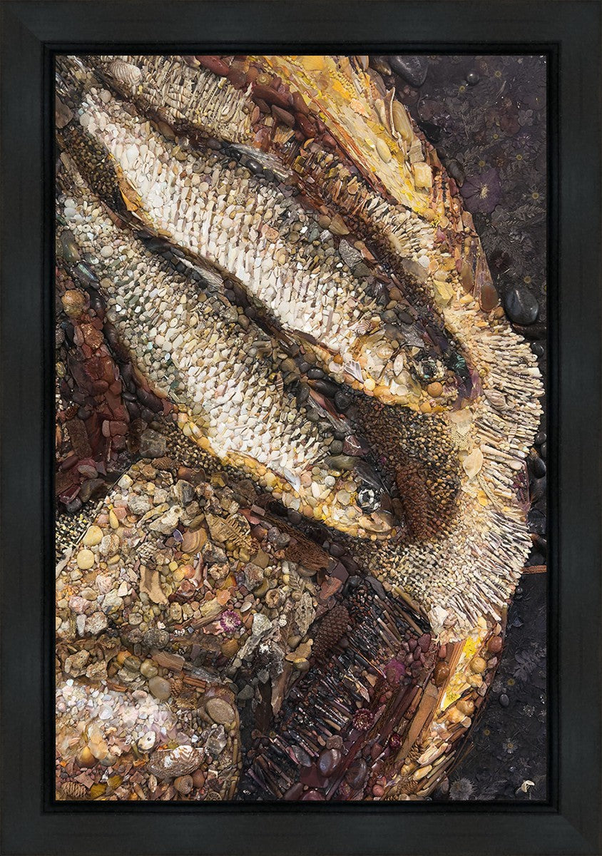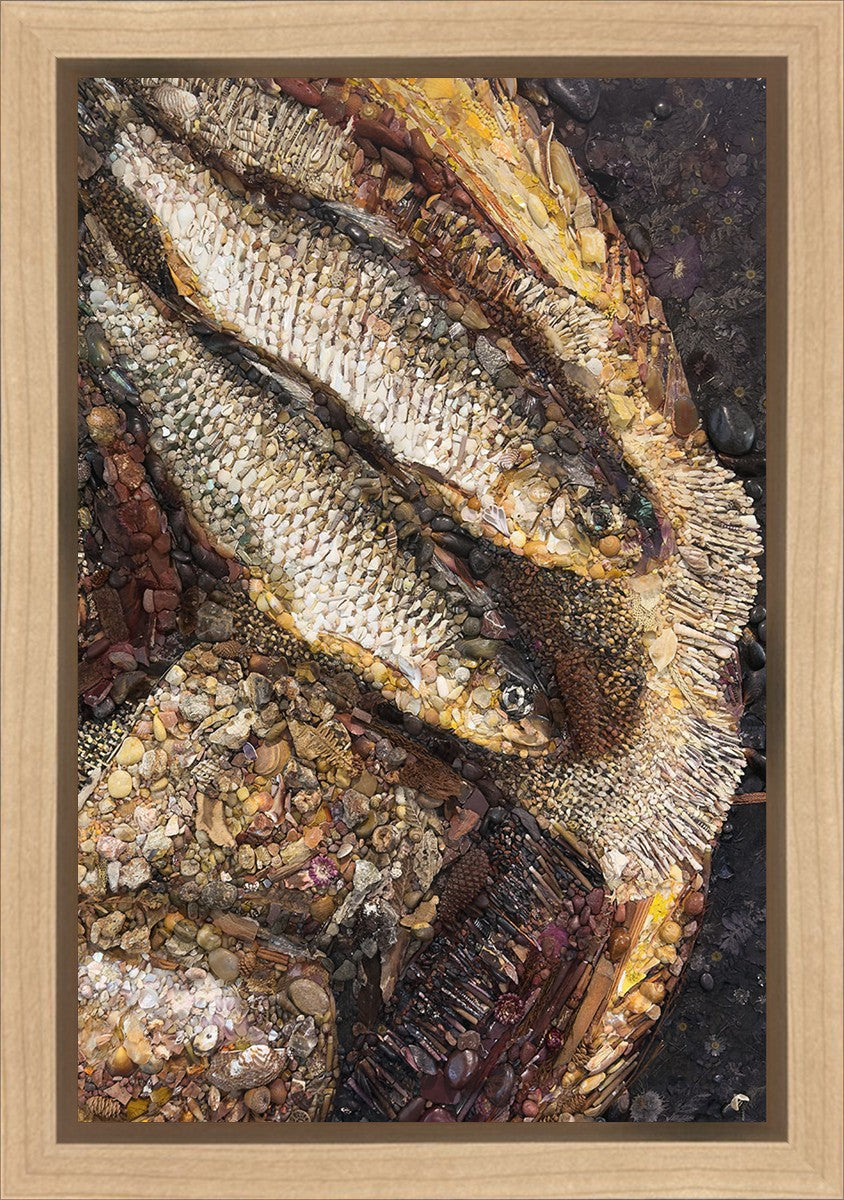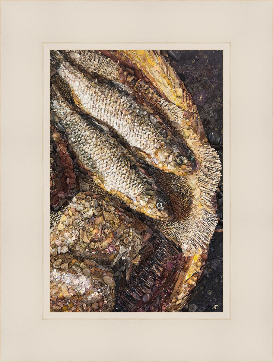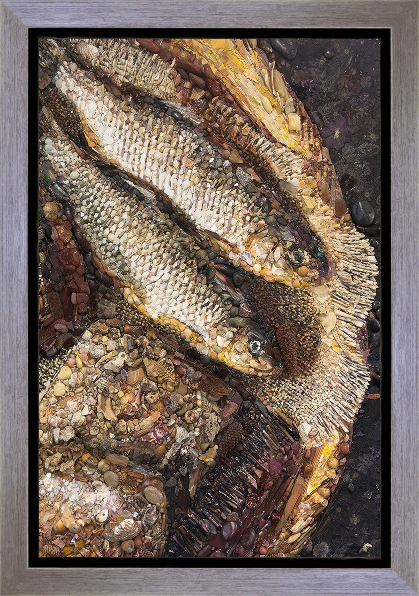 Collage artwork assembled out of natural materials depicting a cropped view of fish and loaves of bread that fed the 5,000 people.