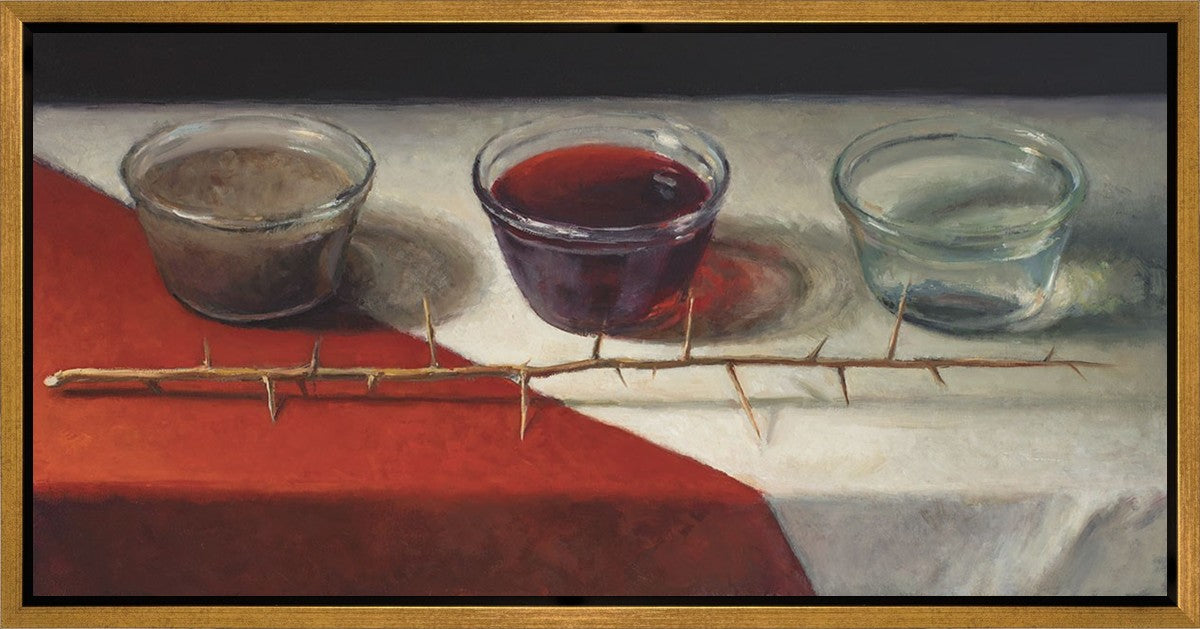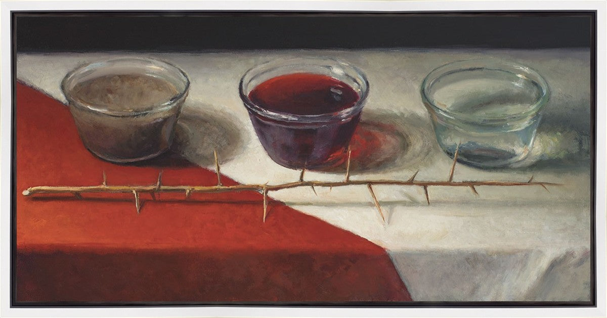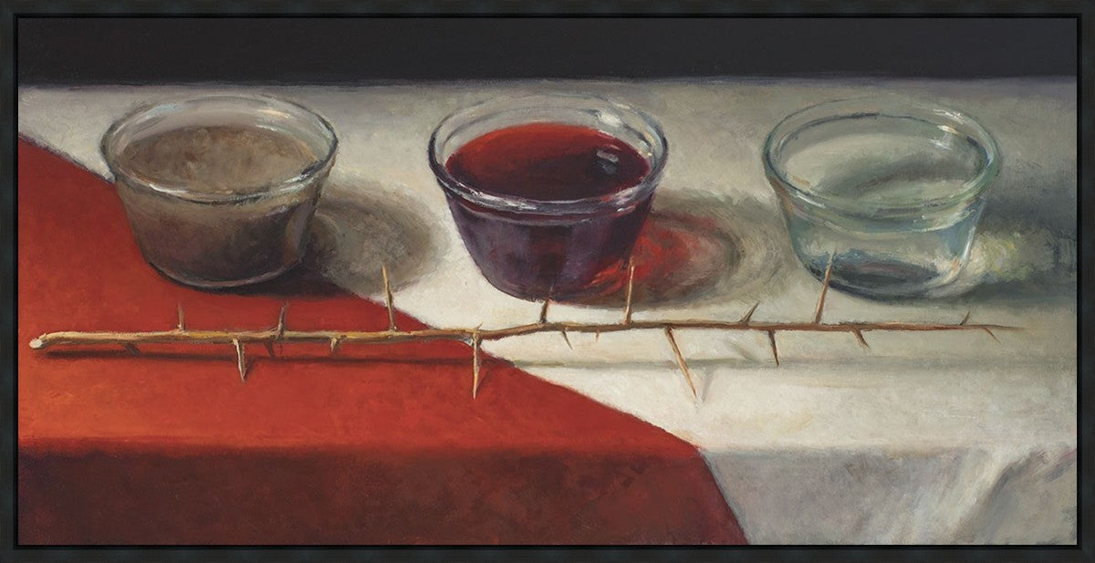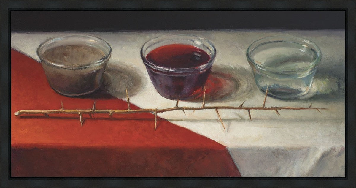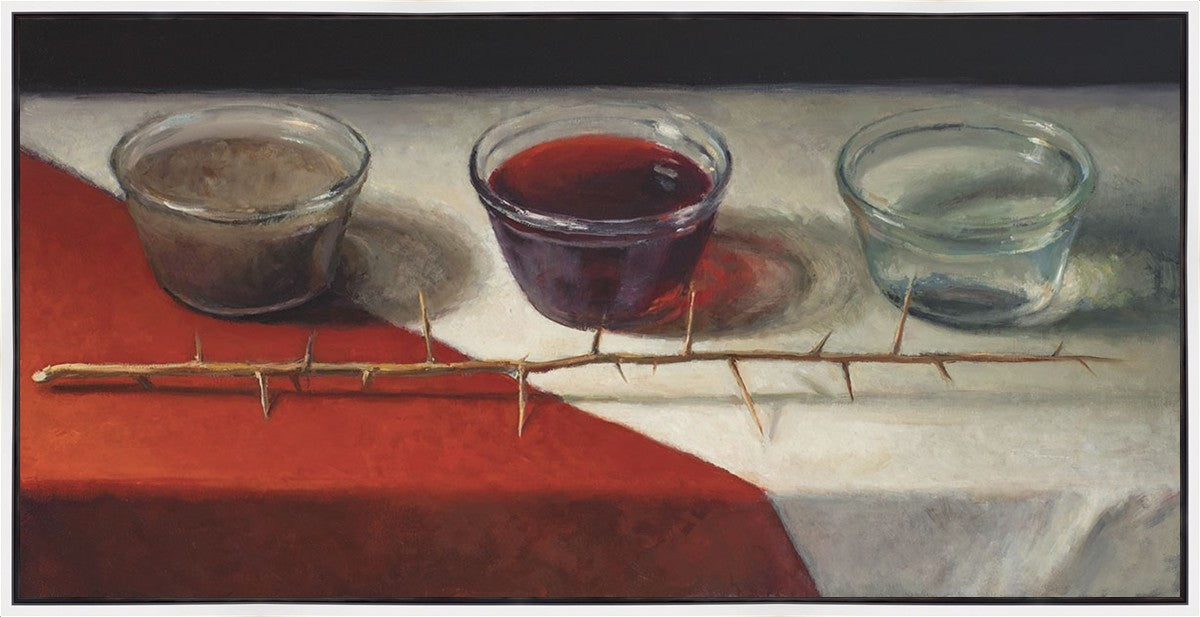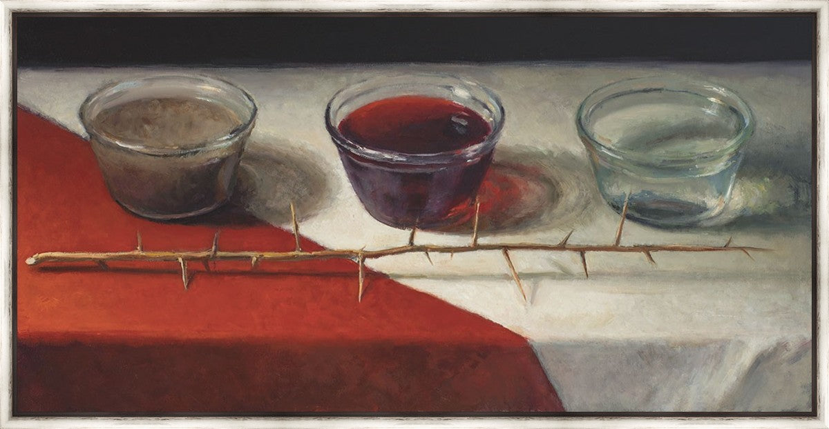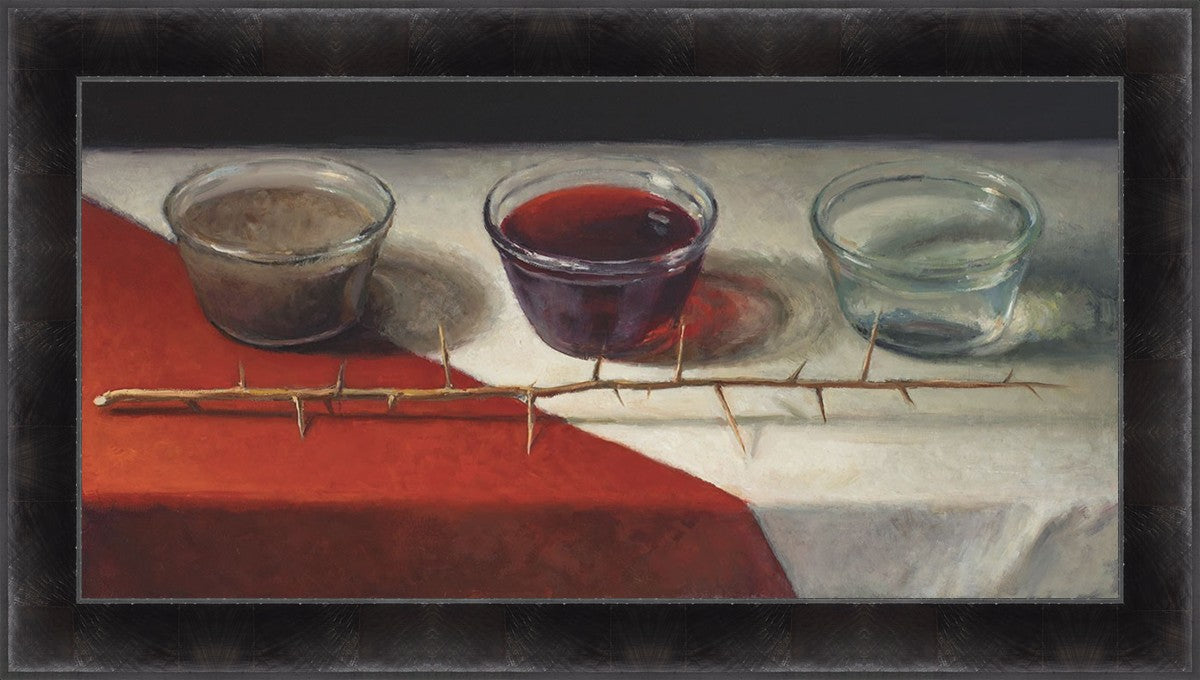 This piece about the Atonement of Christ - the dirty water is cleansed by the blood, resulting in pure, clean water. A Russian olive branch that sits in front. The red and white table cloth is also a representation of Christ.