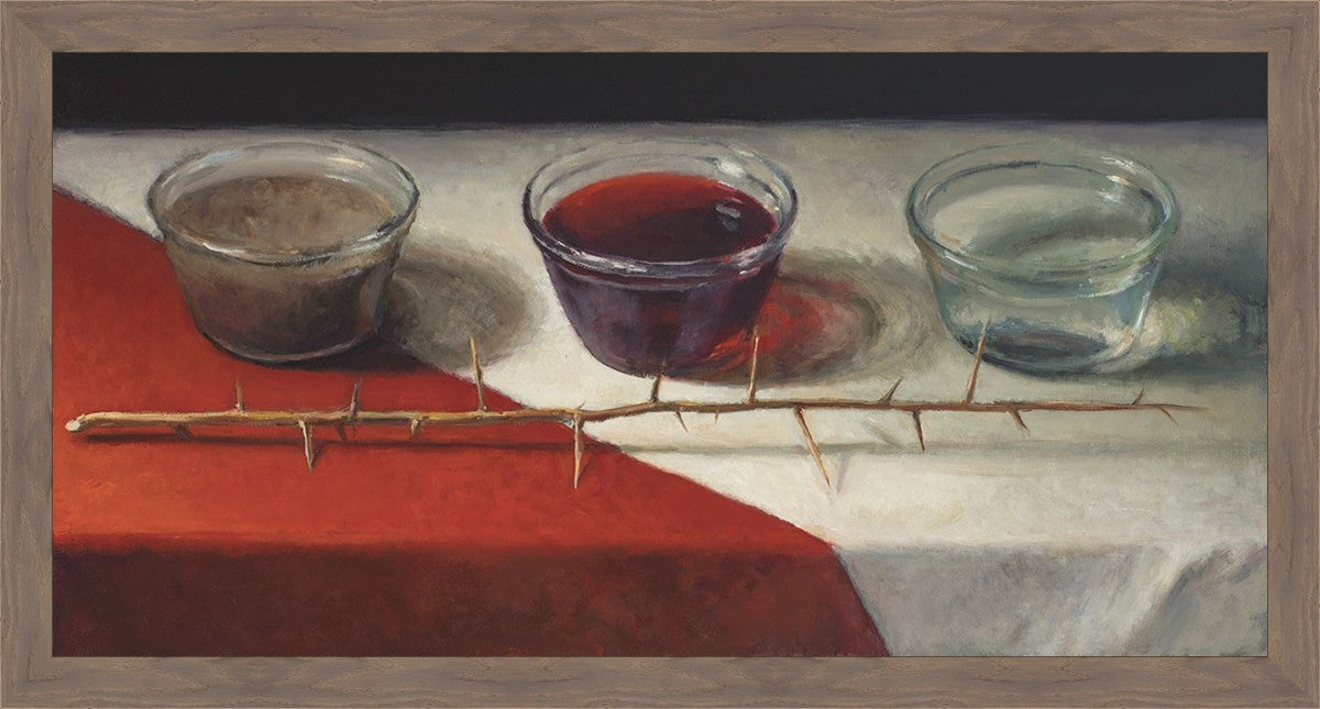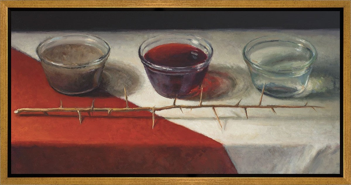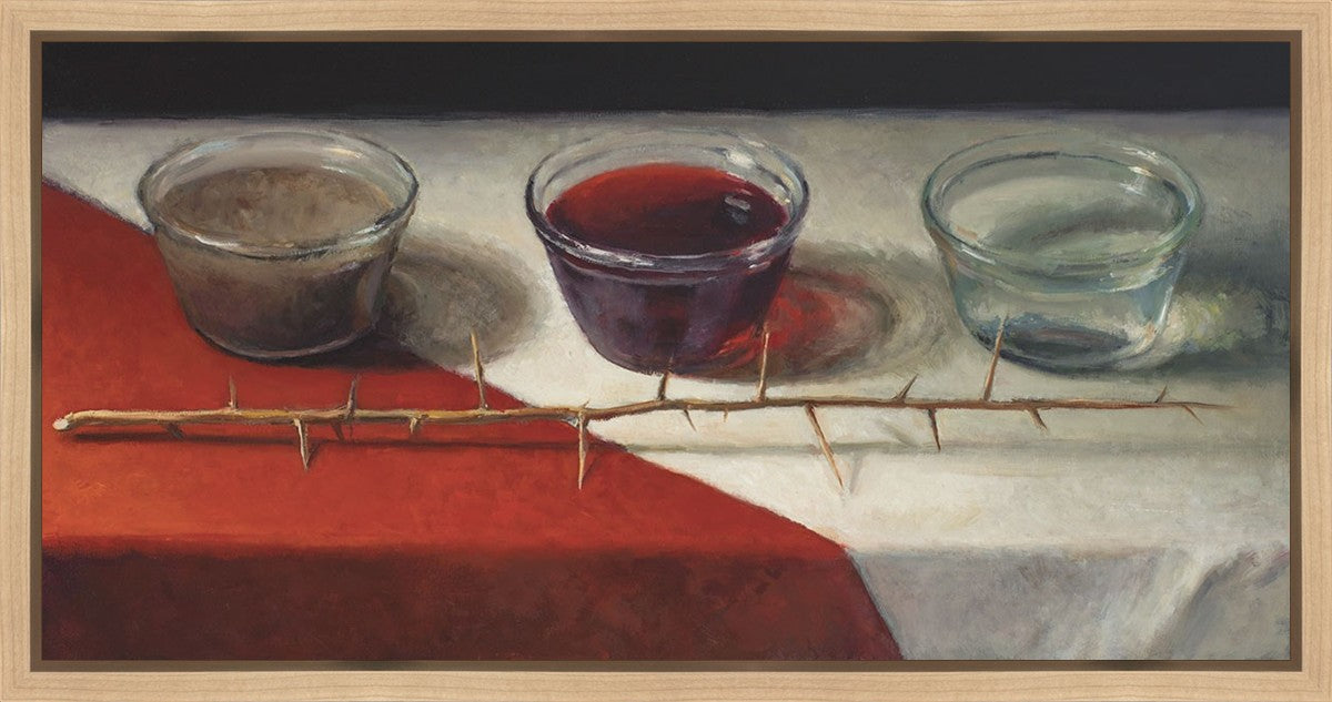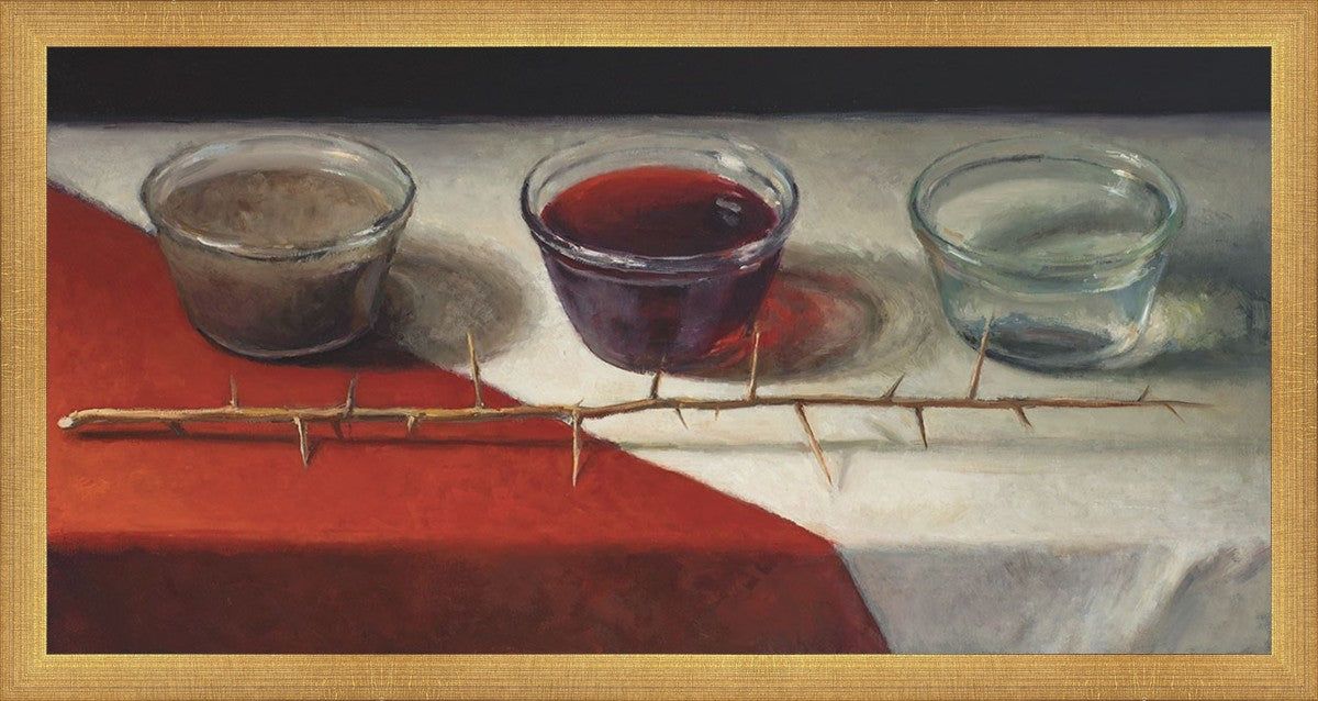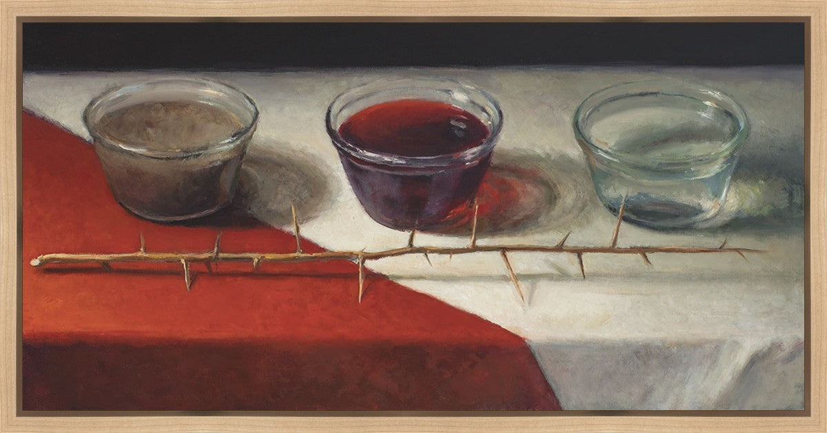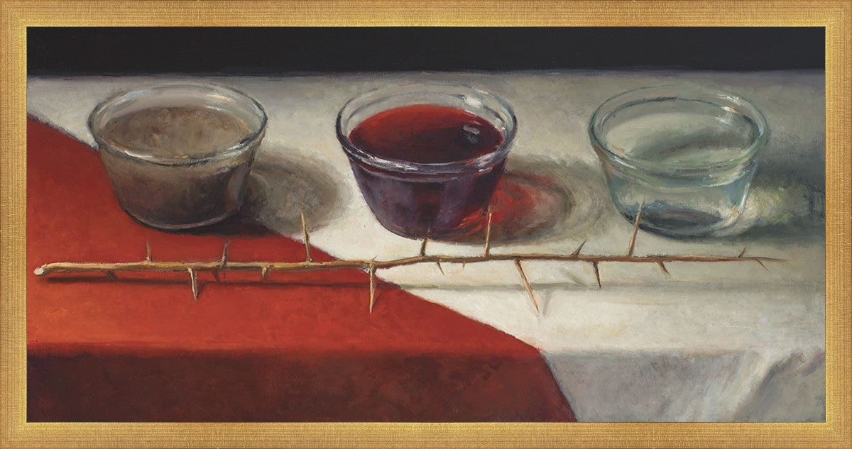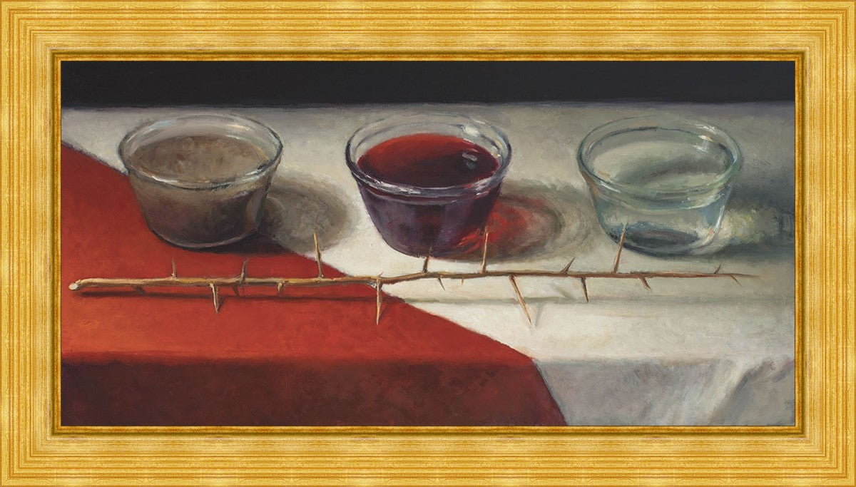 This piece about the Atonement of Christ - the dirty water is cleansed by the blood, resulting in pure, clean water. A Russian olive branch that sits in front. The red and white table cloth is also a representation of Christ.