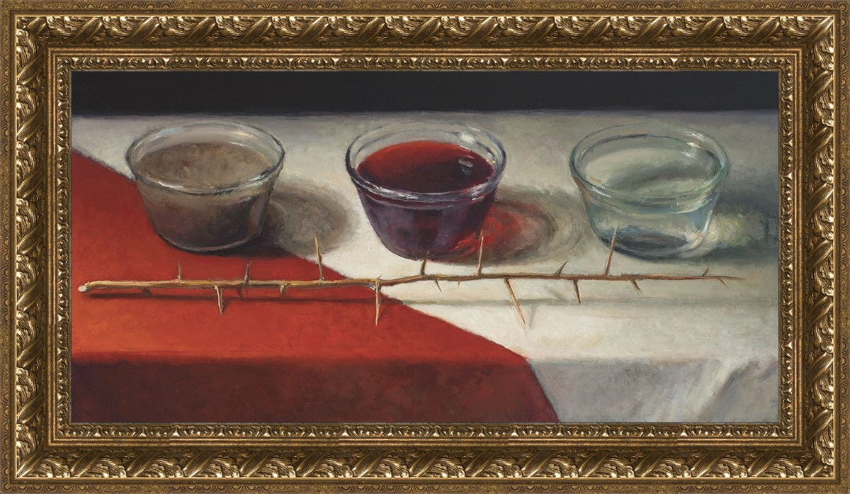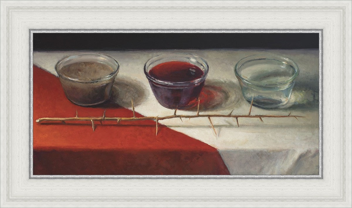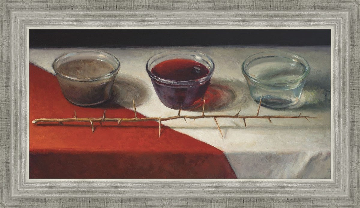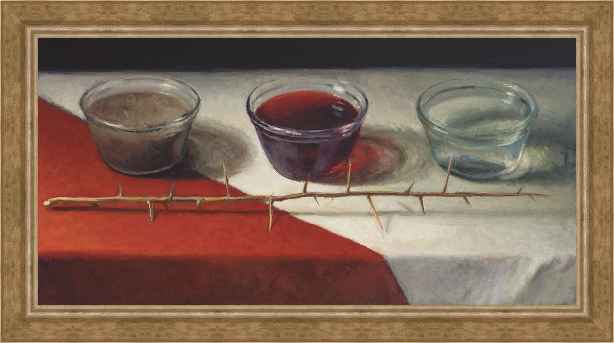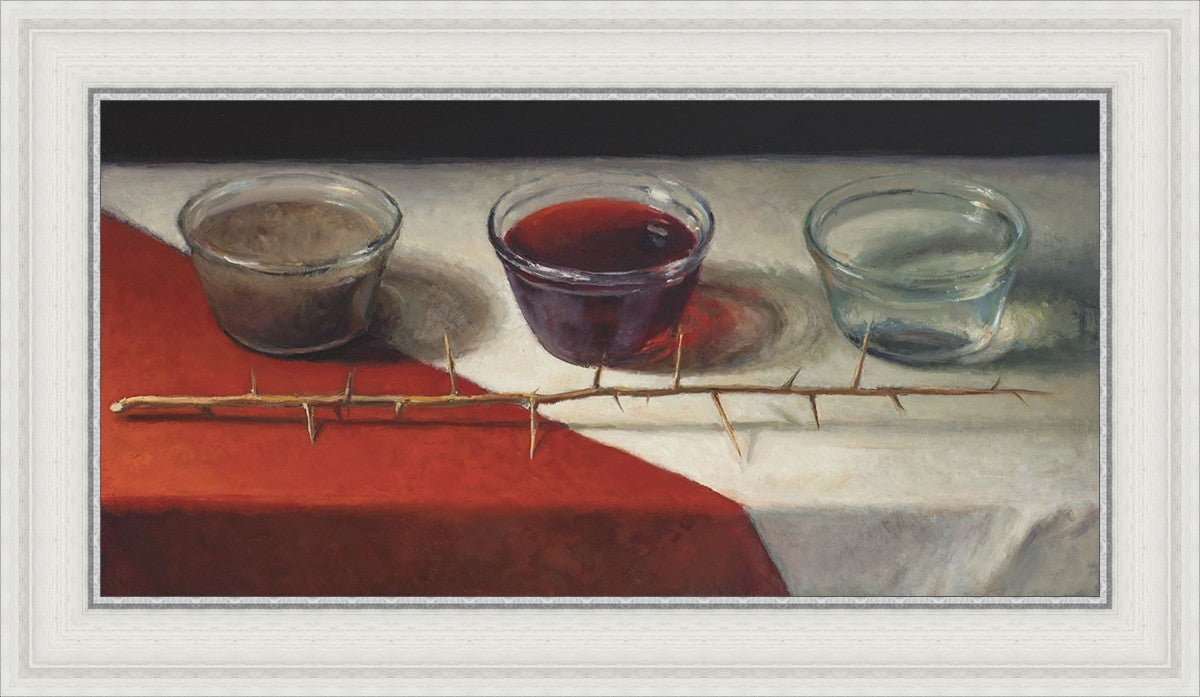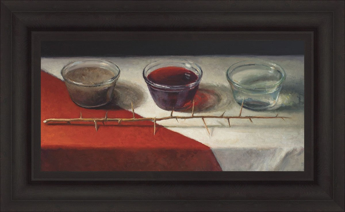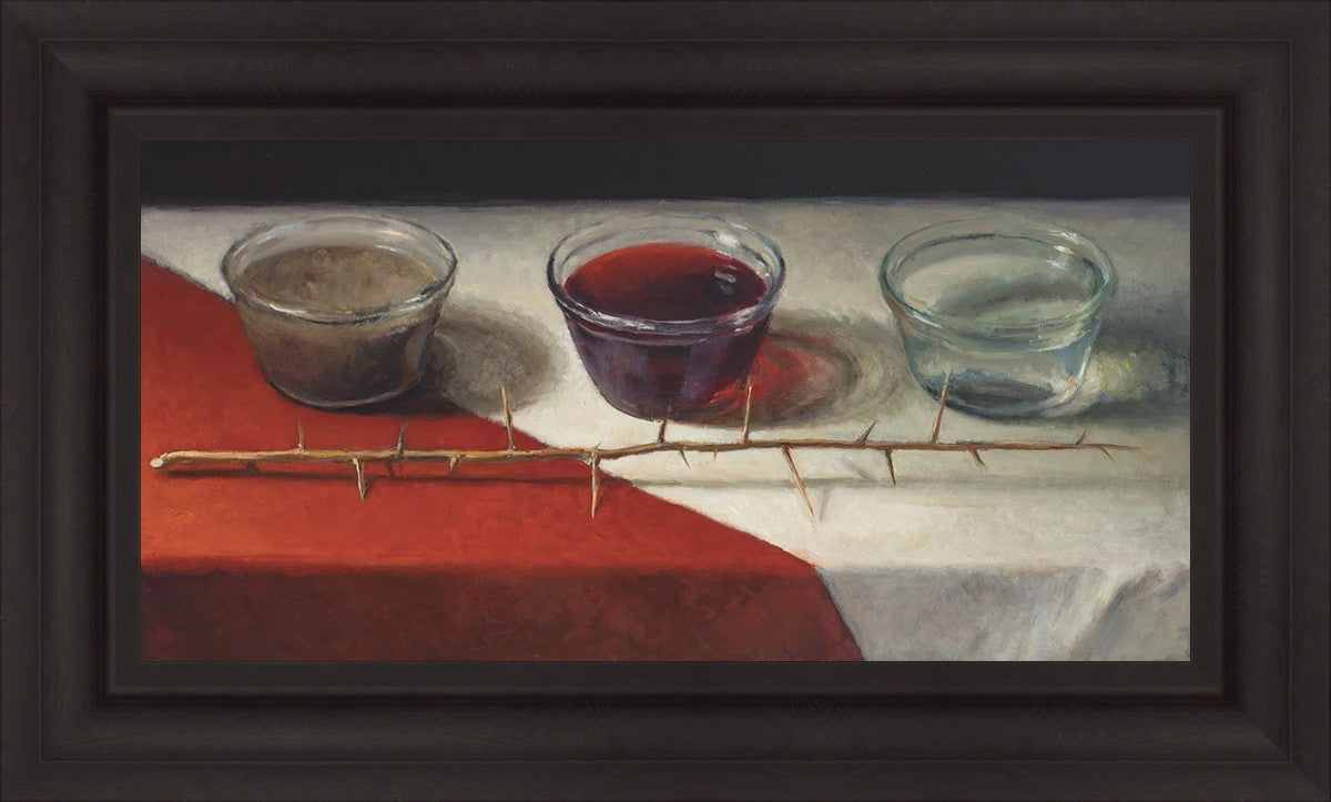 This piece about the Atonement of Christ - the dirty water is cleansed by the blood, resulting in pure, clean water. A Russian olive branch that sits in front. The red and white table cloth is also a representation of Christ.