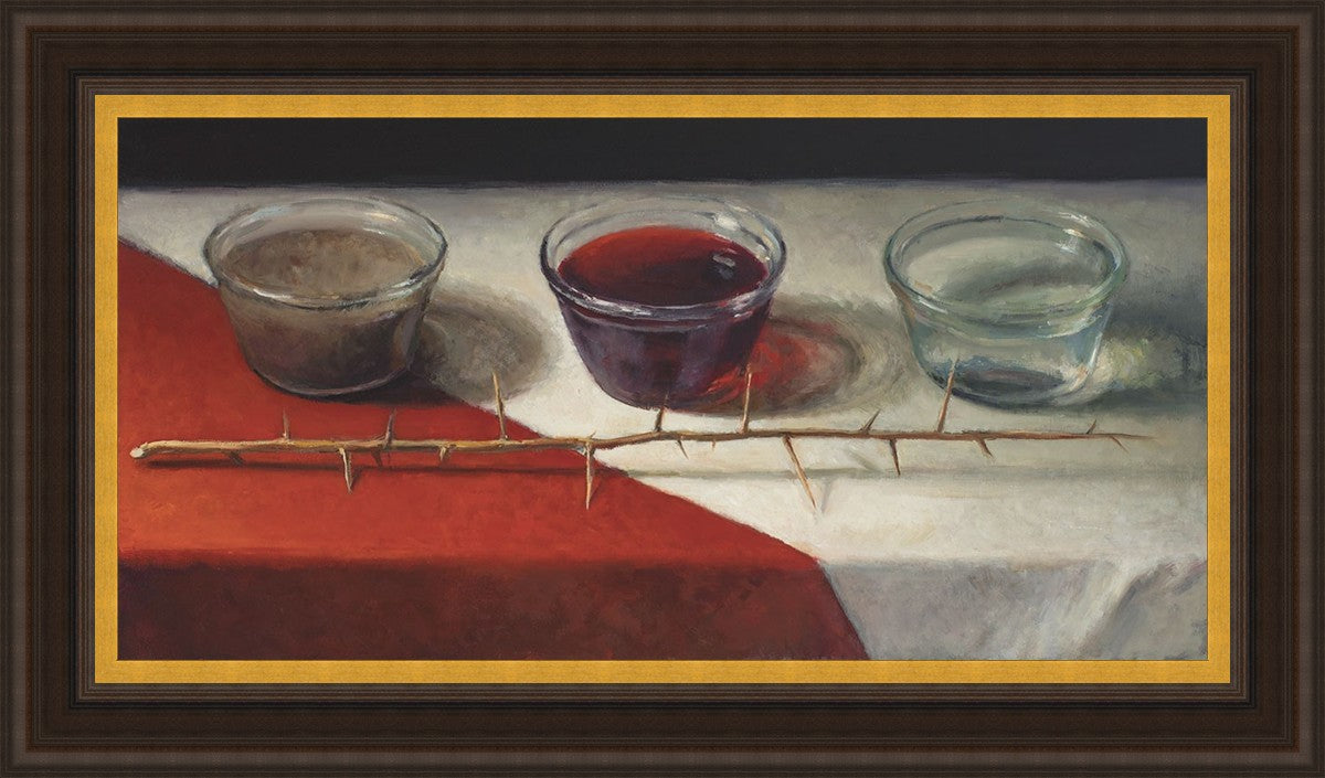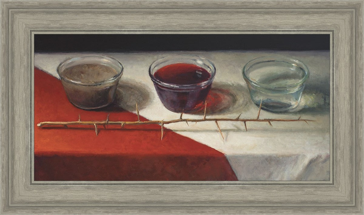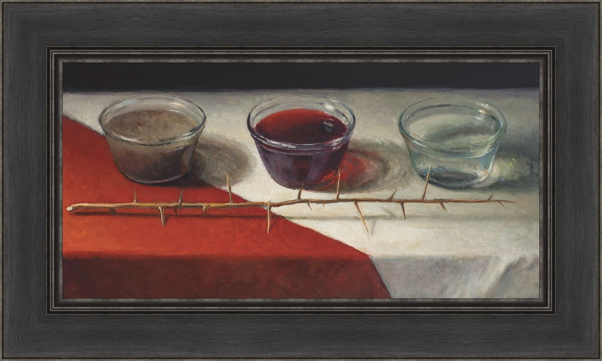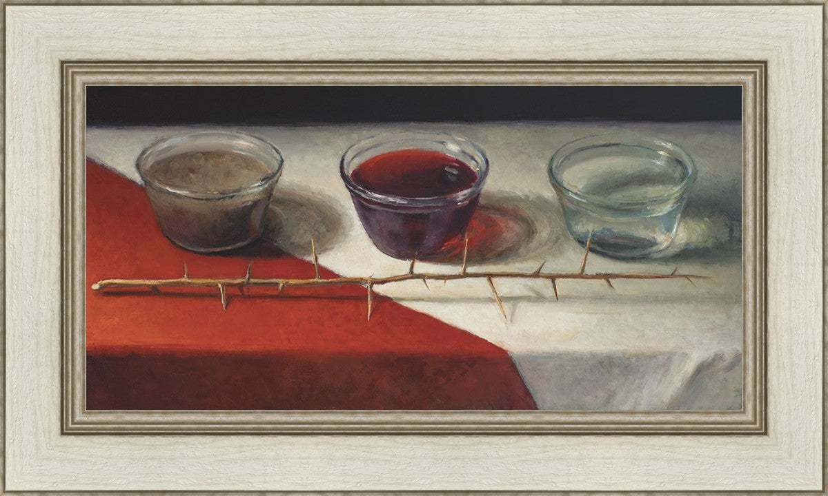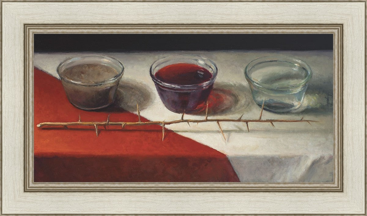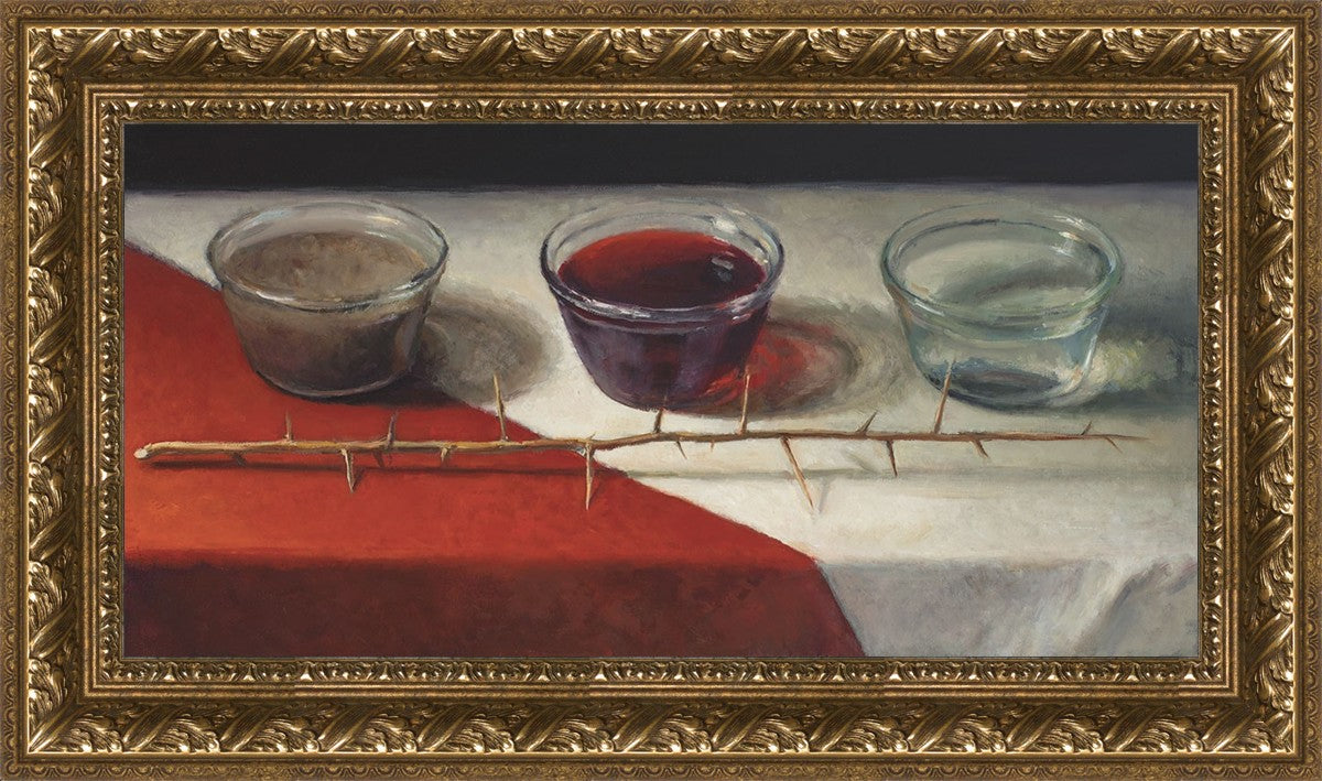 This piece about the Atonement of Christ - the dirty water is cleansed by the blood, resulting in pure, clean water. A Russian olive branch that sits in front. The red and white table cloth is also a representation of Christ.