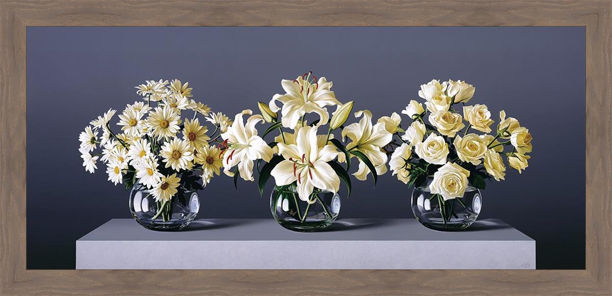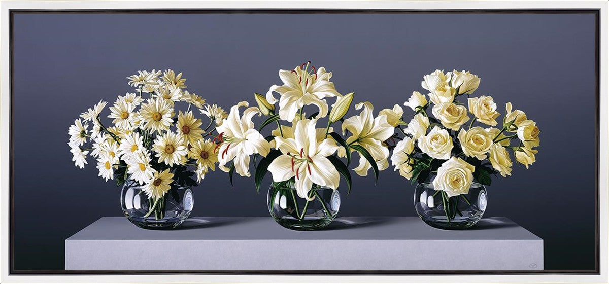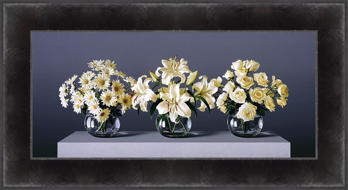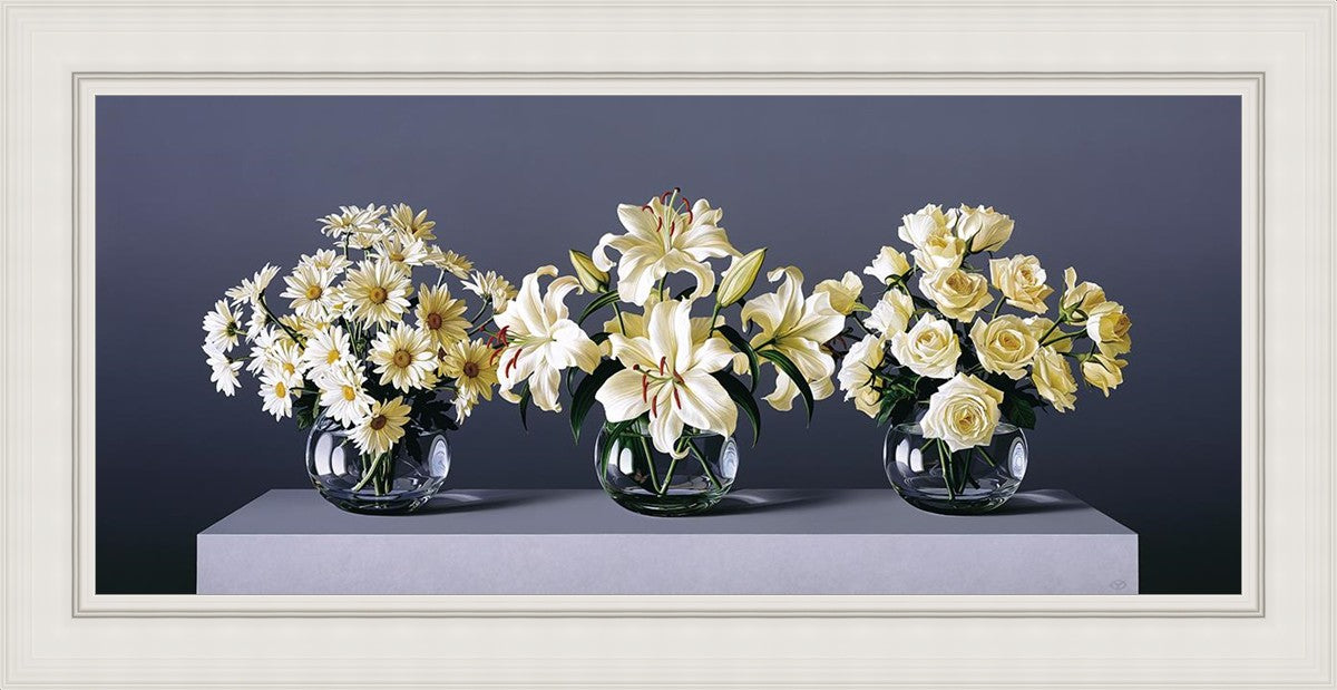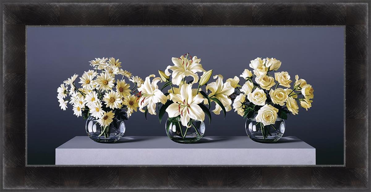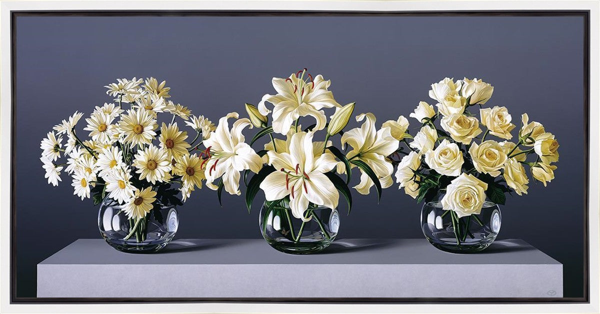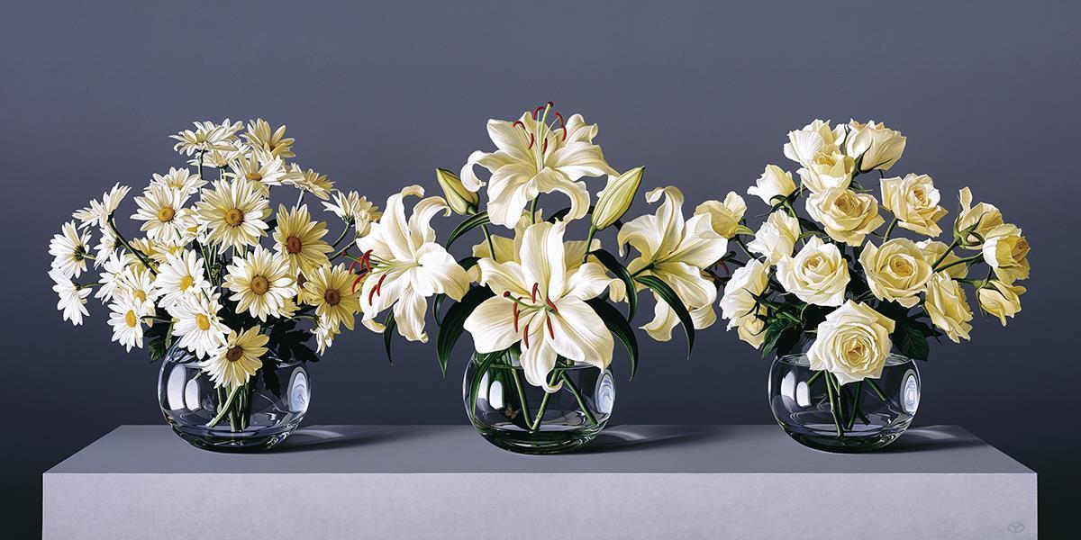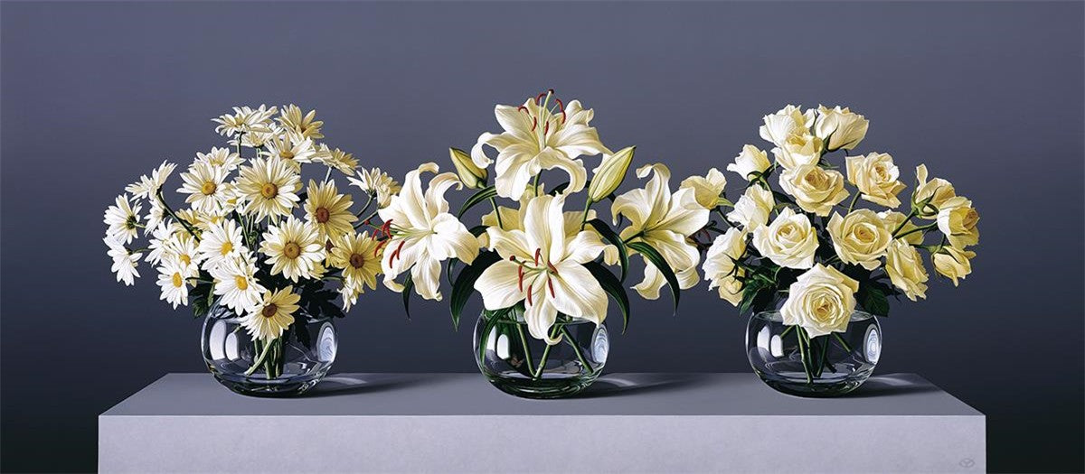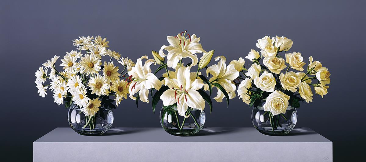 Chris Young's Faith Hope and Charity begins starts all the flowers chosen presented in white for purity. The daisy, ancient greek for "star", is commonly shown for Faith. The lily, a symbol for both Christ and the Virgin Mary, is for the Hope we find in faith. The white rose, cousin of the red for love, is Charity.