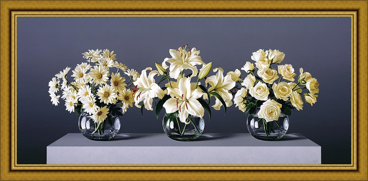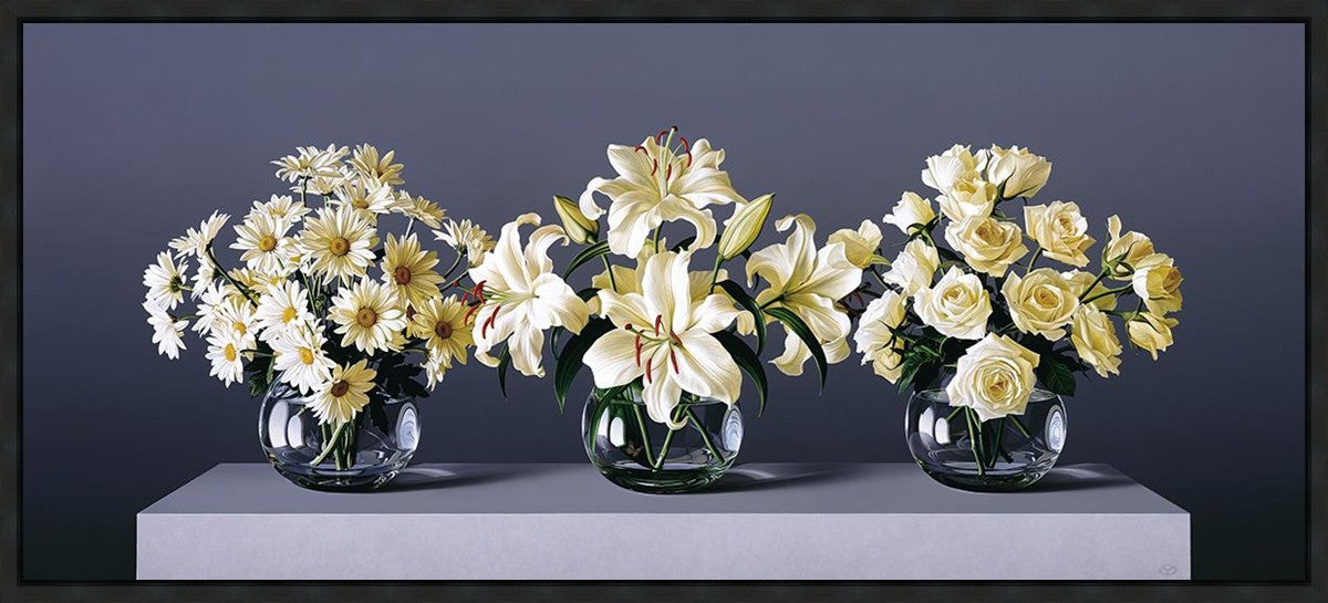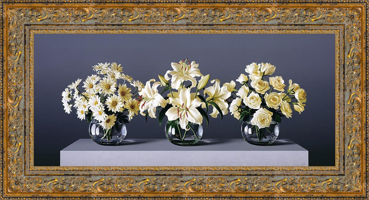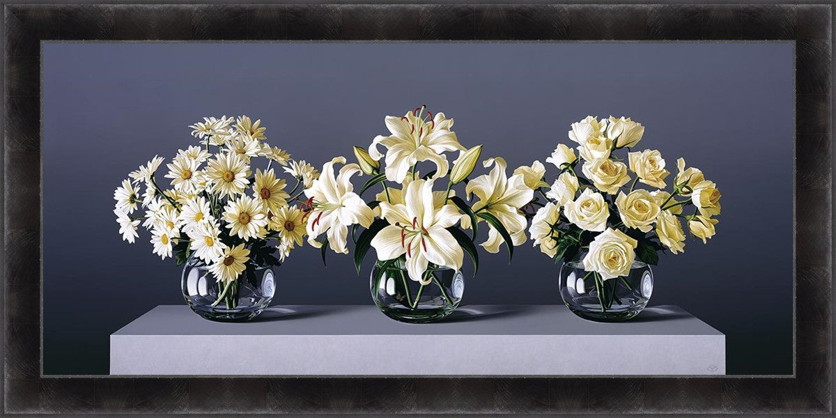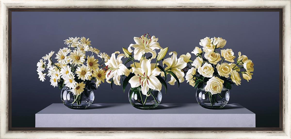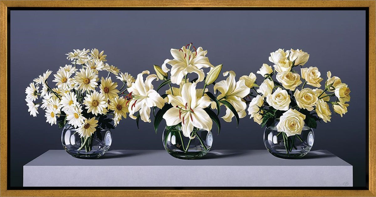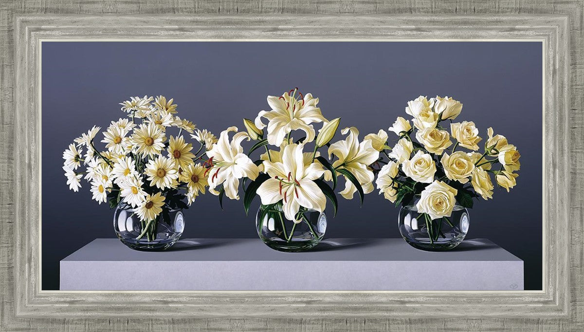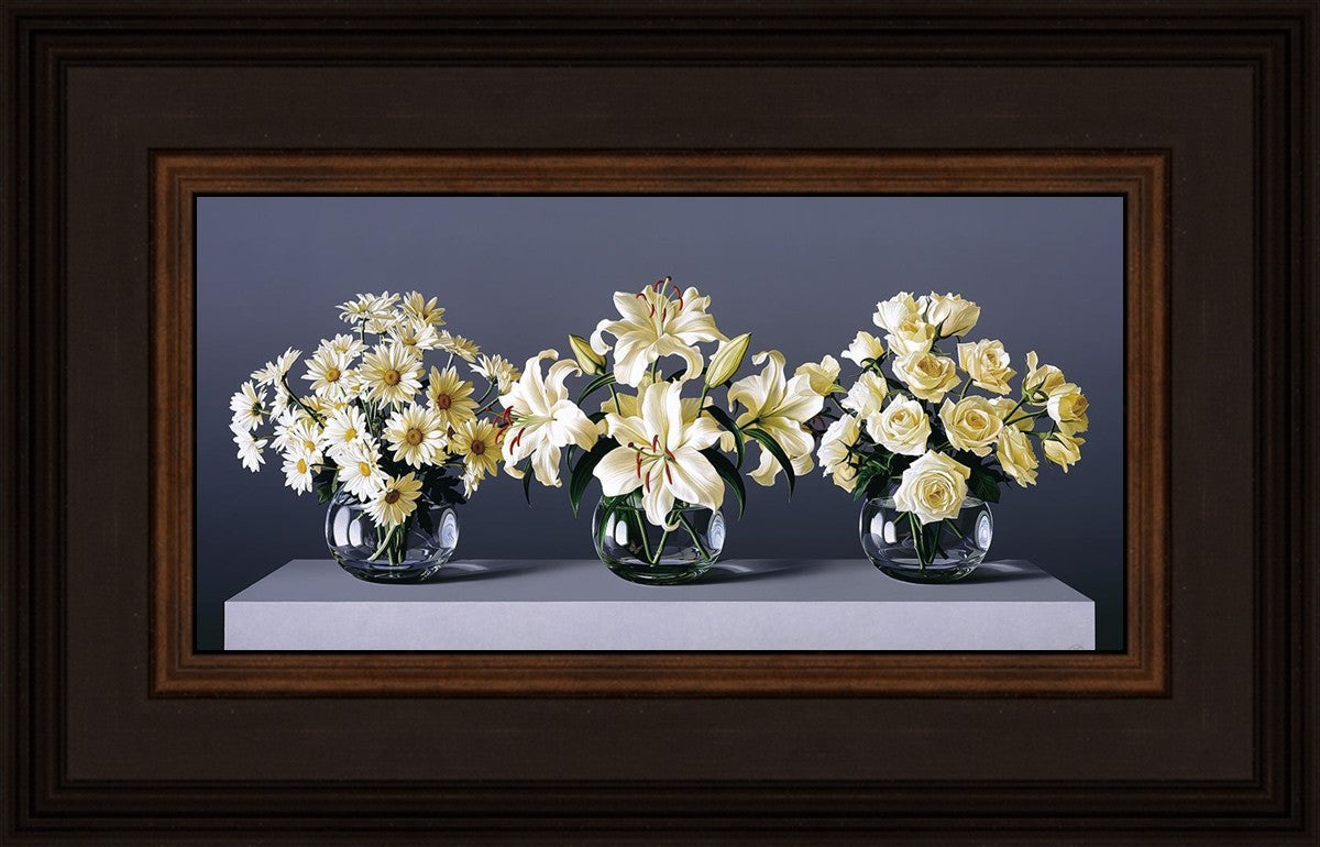 Chris Young's Faith Hope and Charity begins starts all the flowers chosen presented in white for purity. The daisy, ancient greek for "star", is commonly shown for Faith. The lily, a symbol for both Christ and the Virgin Mary, is for the Hope we find in faith. The white rose, cousin of the red for love, is Charity.