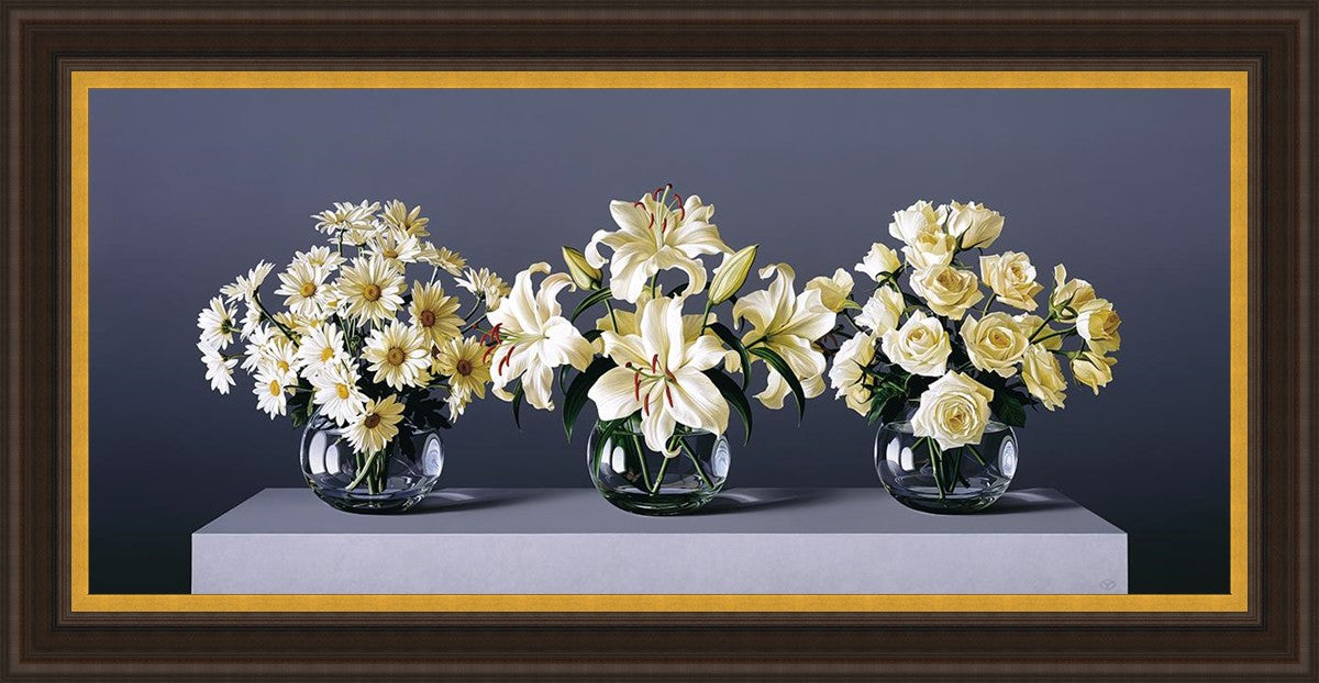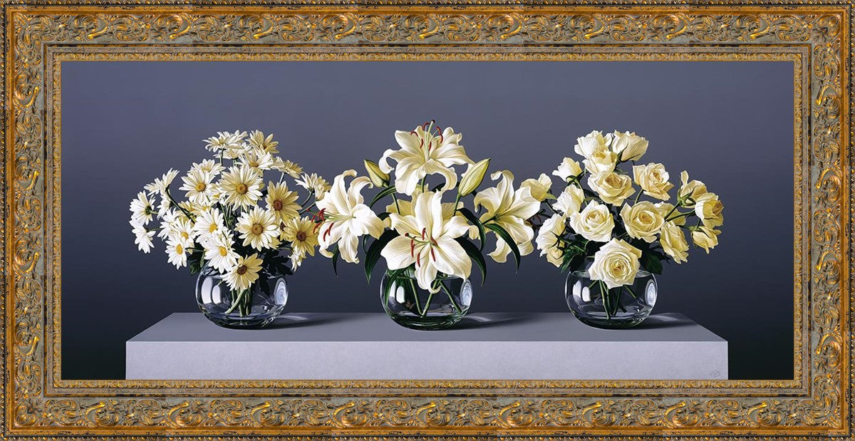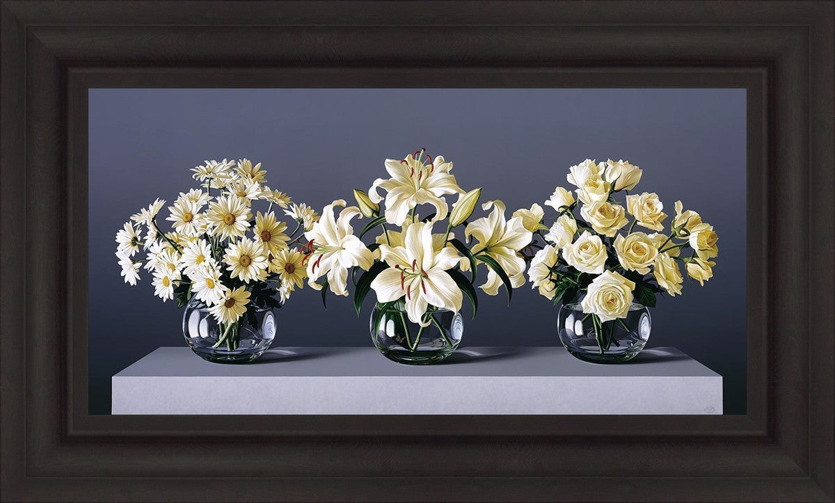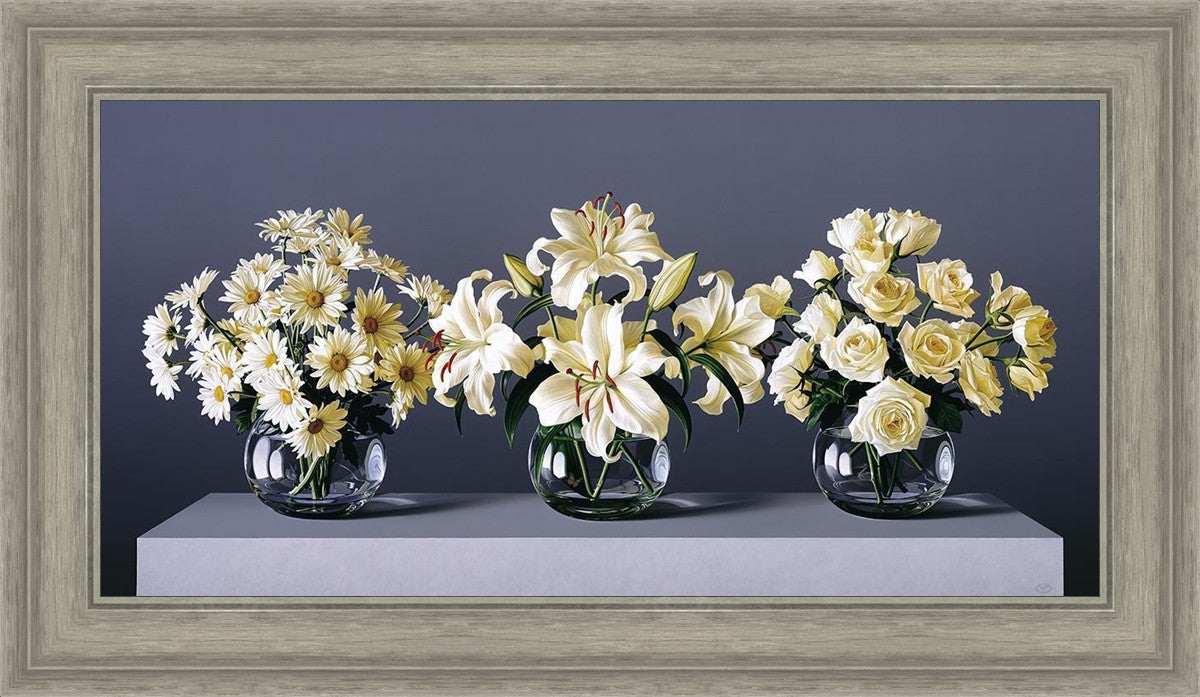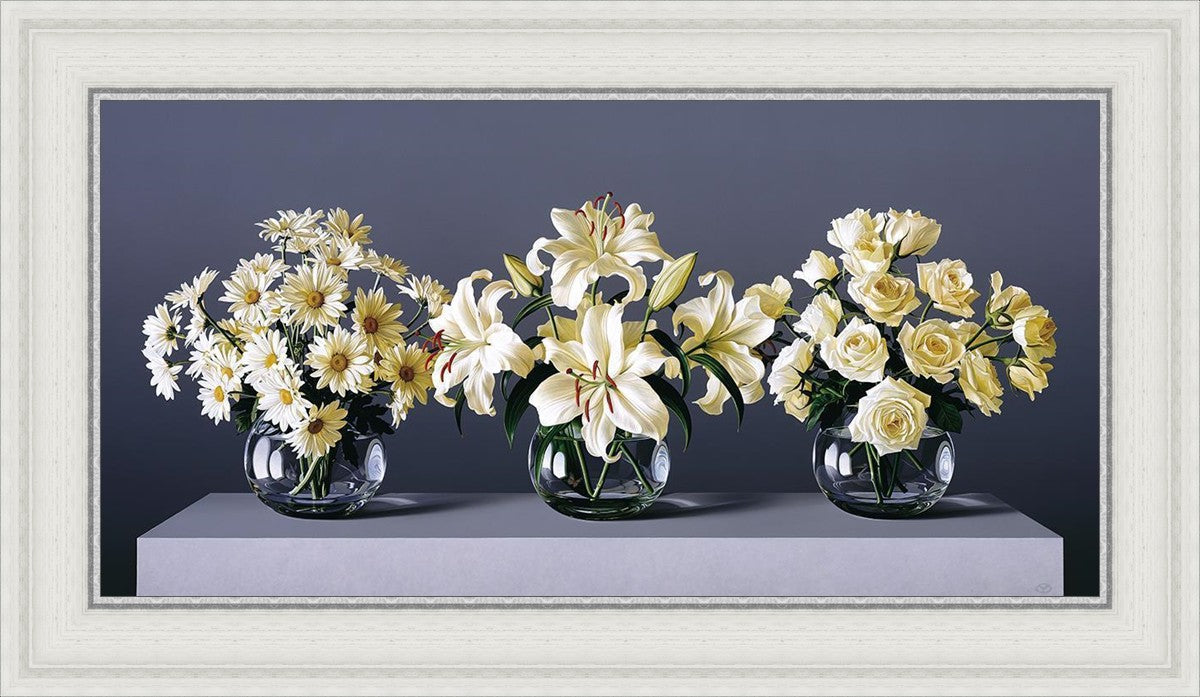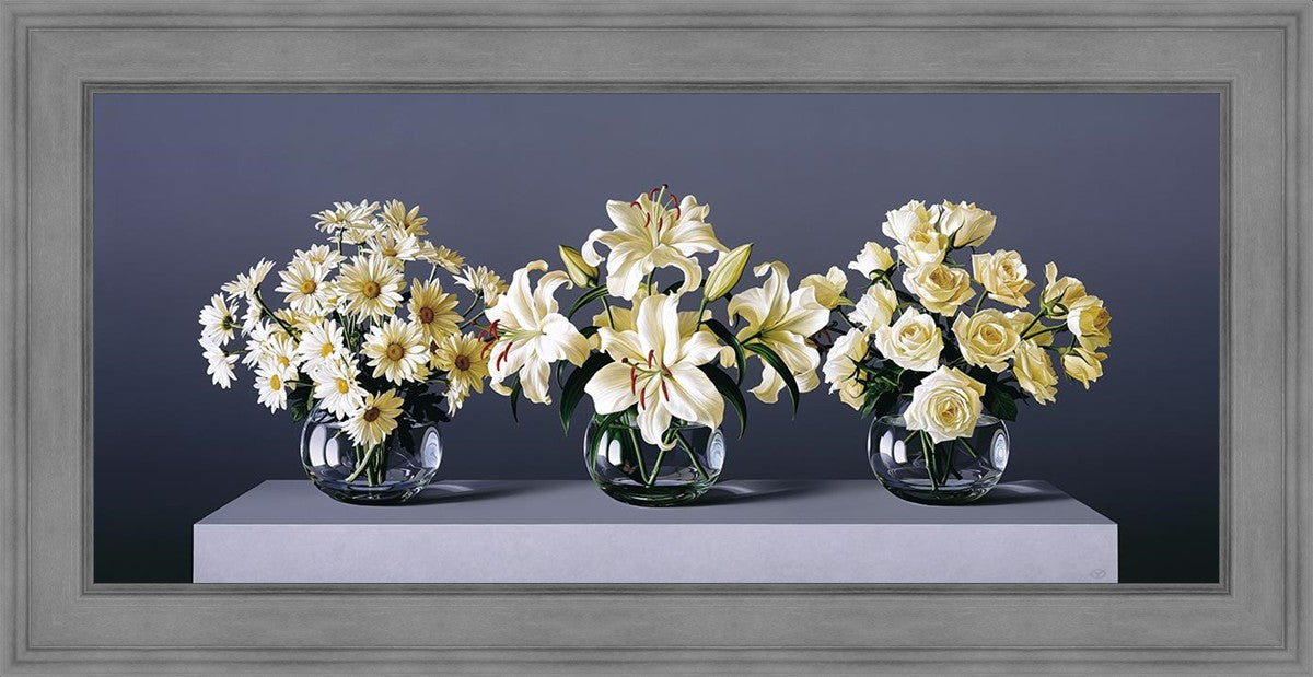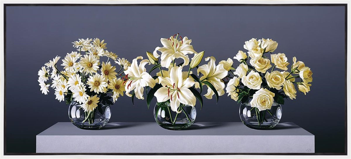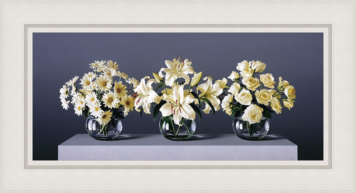 Chris Young's Faith Hope and Charity begins starts all the flowers chosen presented in white for purity. The daisy, ancient greek for "star", is commonly shown for Faith. The lily, a symbol for both Christ and the Virgin Mary, is for the Hope we find in faith. The white rose, cousin of the red for love, is Charity.