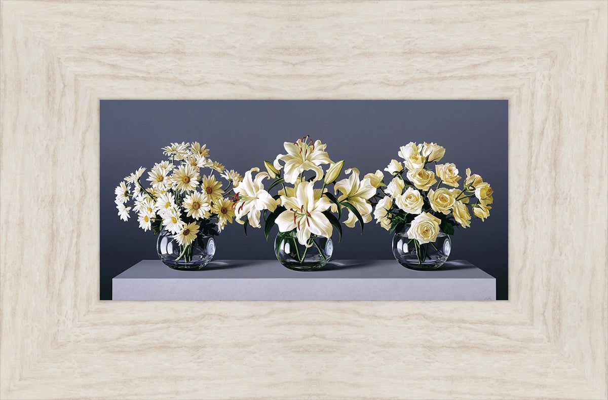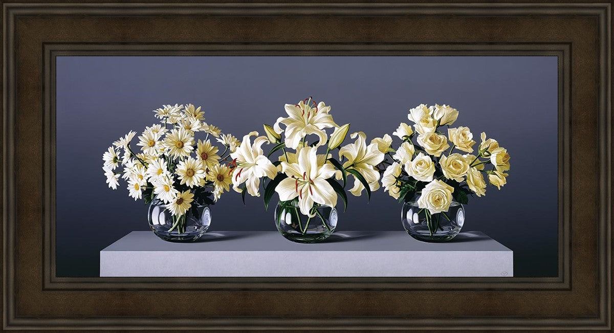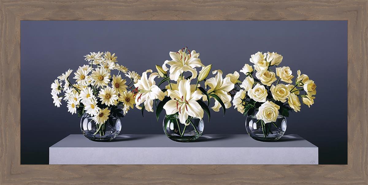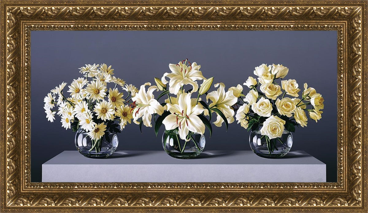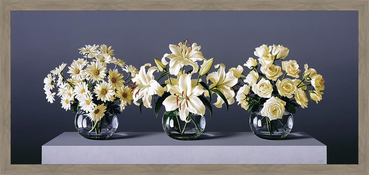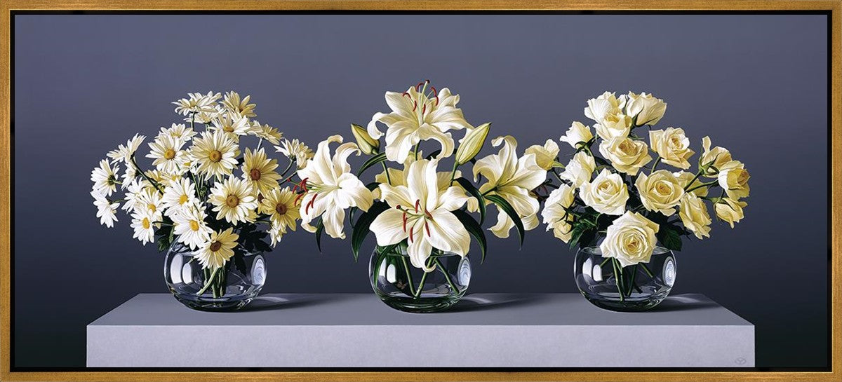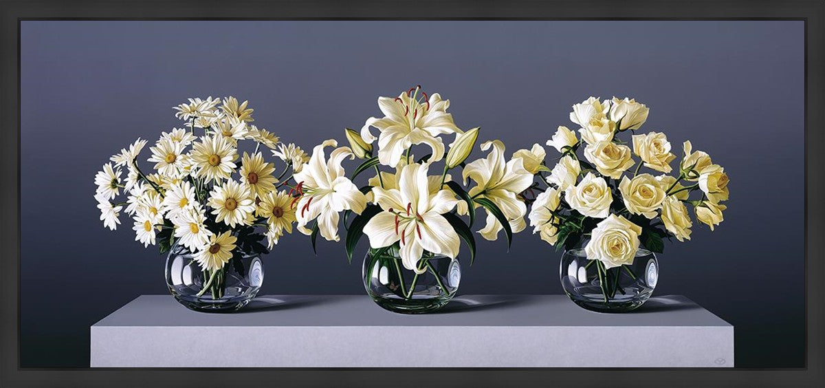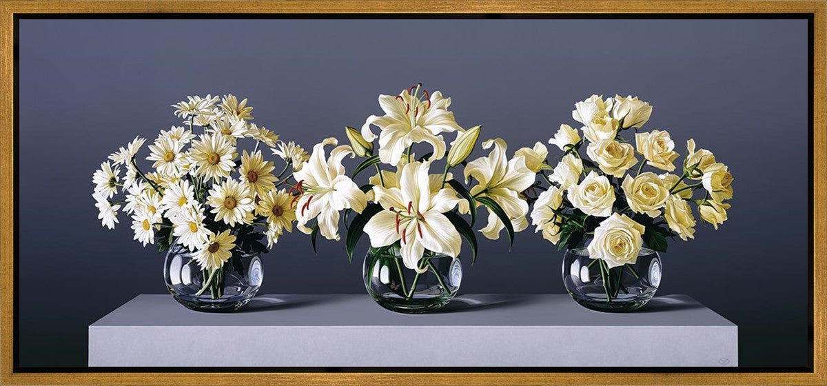 Chris Young's Faith Hope and Charity begins starts all the flowers chosen presented in white for purity. The daisy, ancient greek for "star", is commonly shown for Faith. The lily, a symbol for both Christ and the Virgin Mary, is for the Hope we find in faith. The white rose, cousin of the red for love, is Charity.