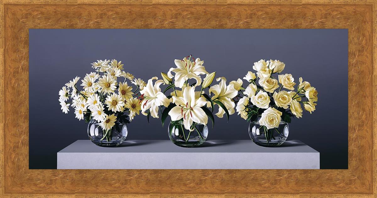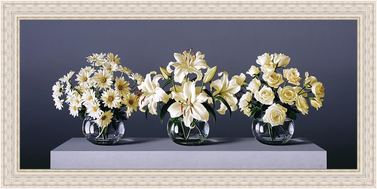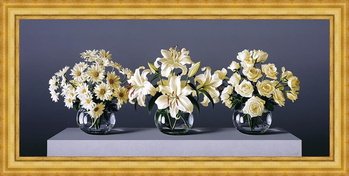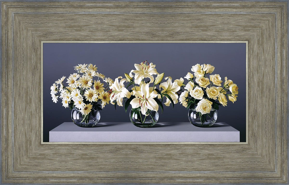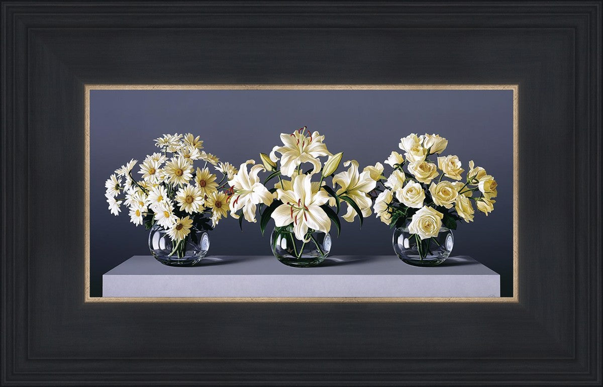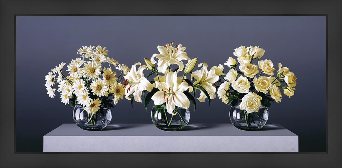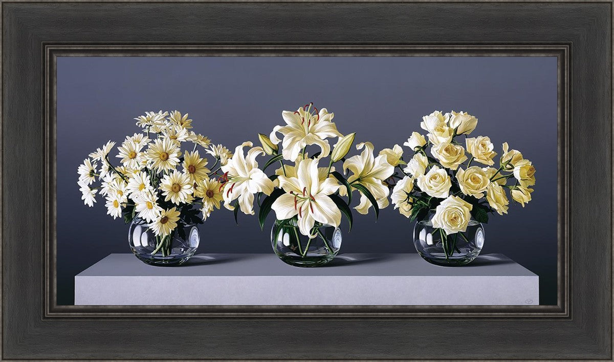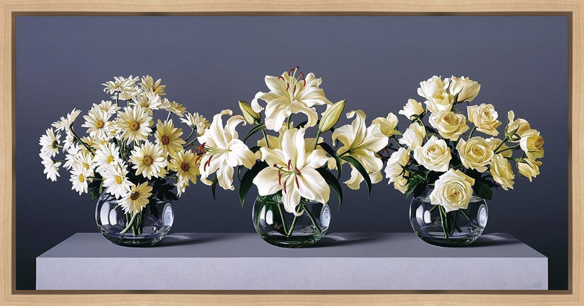 Chris Young's Faith Hope and Charity begins starts all the flowers chosen presented in white for purity. The daisy, ancient greek for "star", is commonly shown for Faith. The lily, a symbol for both Christ and the Virgin Mary, is for the Hope we find in faith. The white rose, cousin of the red for love, is Charity.