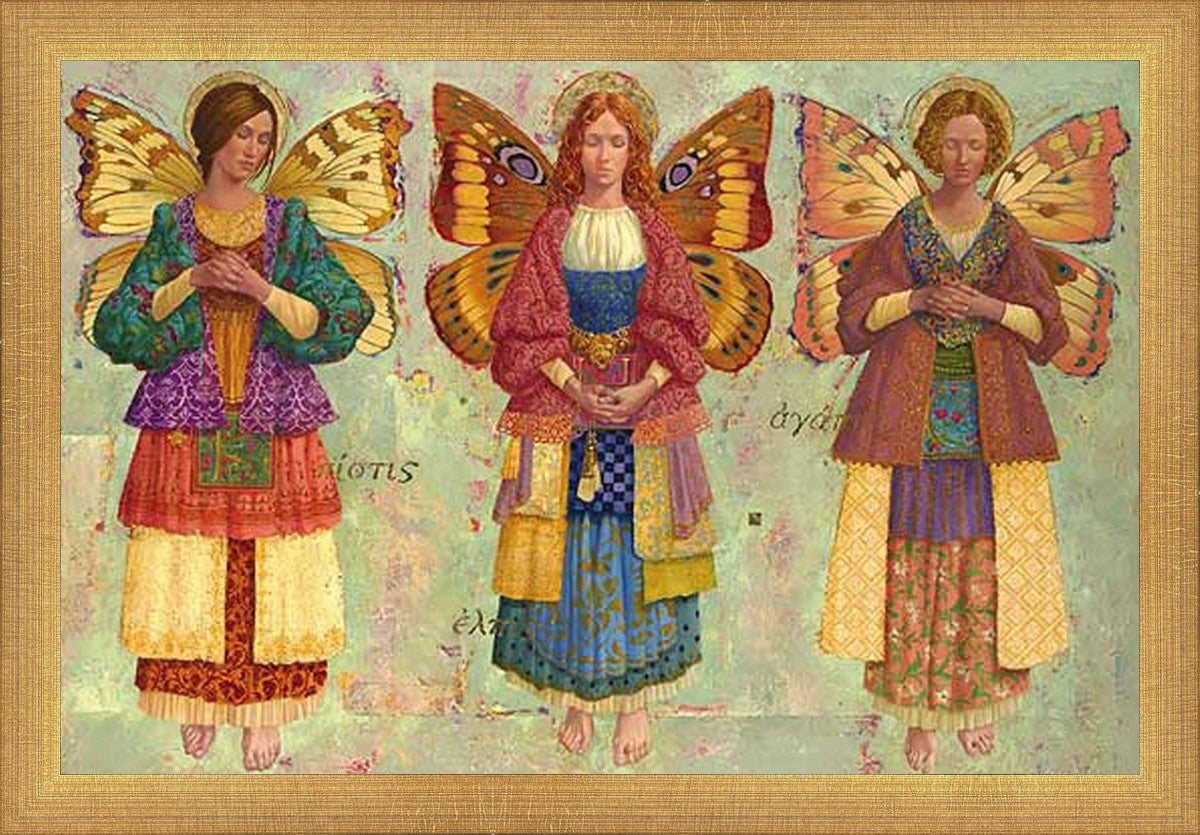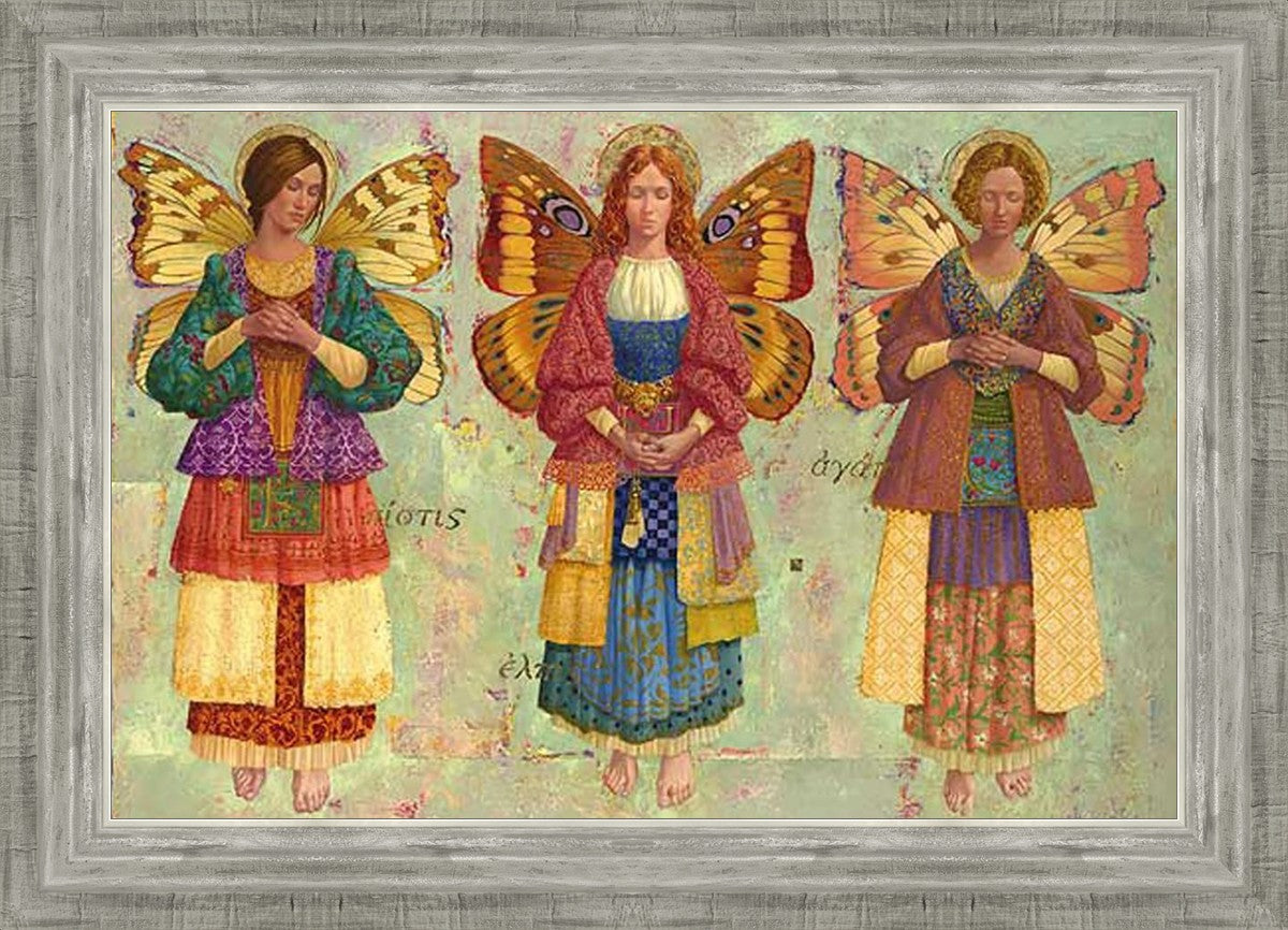 Inspired by a recent mural project, James Christensen set out on an awfully big adventure. Wanting to do something grand and romantic while exploring the texture, surface and richness of paint, James chose for his subject three of Paul's greatest virtues - in the form of three women. "This piece is a little bit of a departure," Jim says. "But these gifts of the spirit are important qualities for us to remind each other about." The words in gold leaf identify the three as their names appear in the original Greek Biblical text.