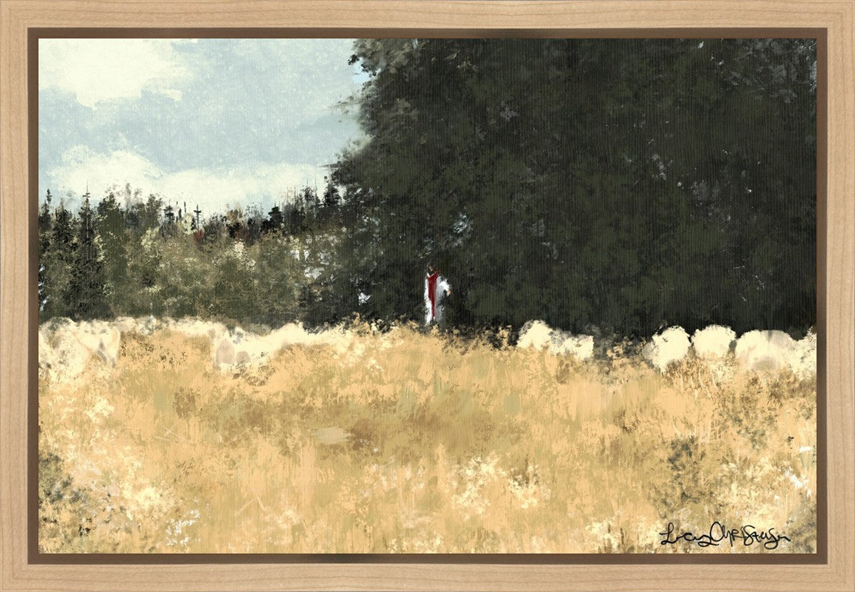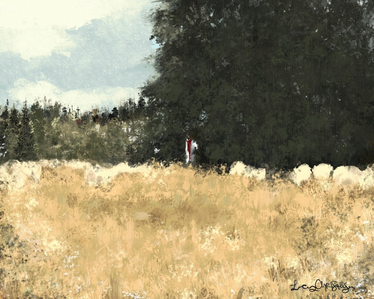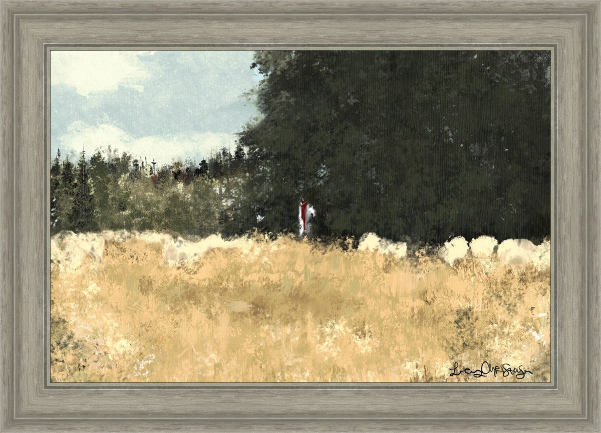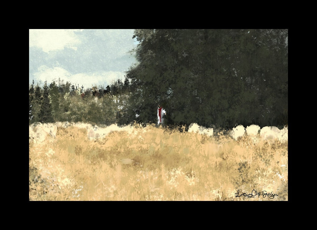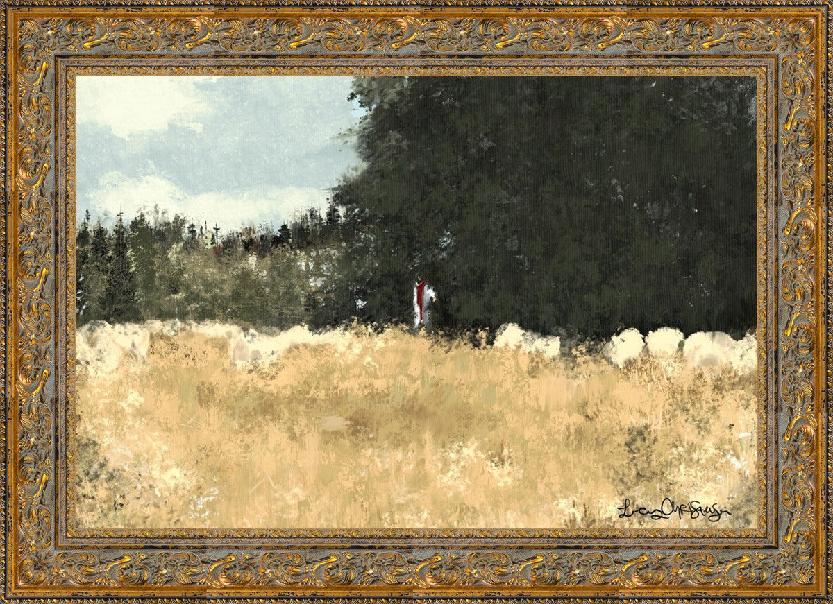 This Painting simply means a lot to me. Again it was something that I let the Spirit guide me on. It seemed as though I always came to this painting when I was trying to figure something out.. most of the time it was me trying to over come Fear about one thing or another. Up until yesterday there was no Christ at all in this painting. I kept wondering why this, its not coming together for me.. I love sheep and nature but Where’s Christ I feel like he should be here. Then I saw him perfectly. It was bone chilling and I covered my mouth even. There he was coming through out of the beautiful dark trees and I could see him perfectly. The whole painting came together with my thoughts I’d been having. Faith over Fear! Christ always triumphs!It was like I opened a door and I felt that happiness and excitement that was waiting.. and the joys I felt seeing Christ in this painting was just the best yet in all my creations. How many times have I simply thought, but where are you? I’ve had complete Faith, what more? And in the nick of time.. There he is. I always feel so bad when I have those moments but they are real.. Just like, Jesus The Christ is real.