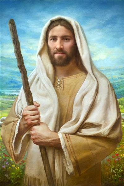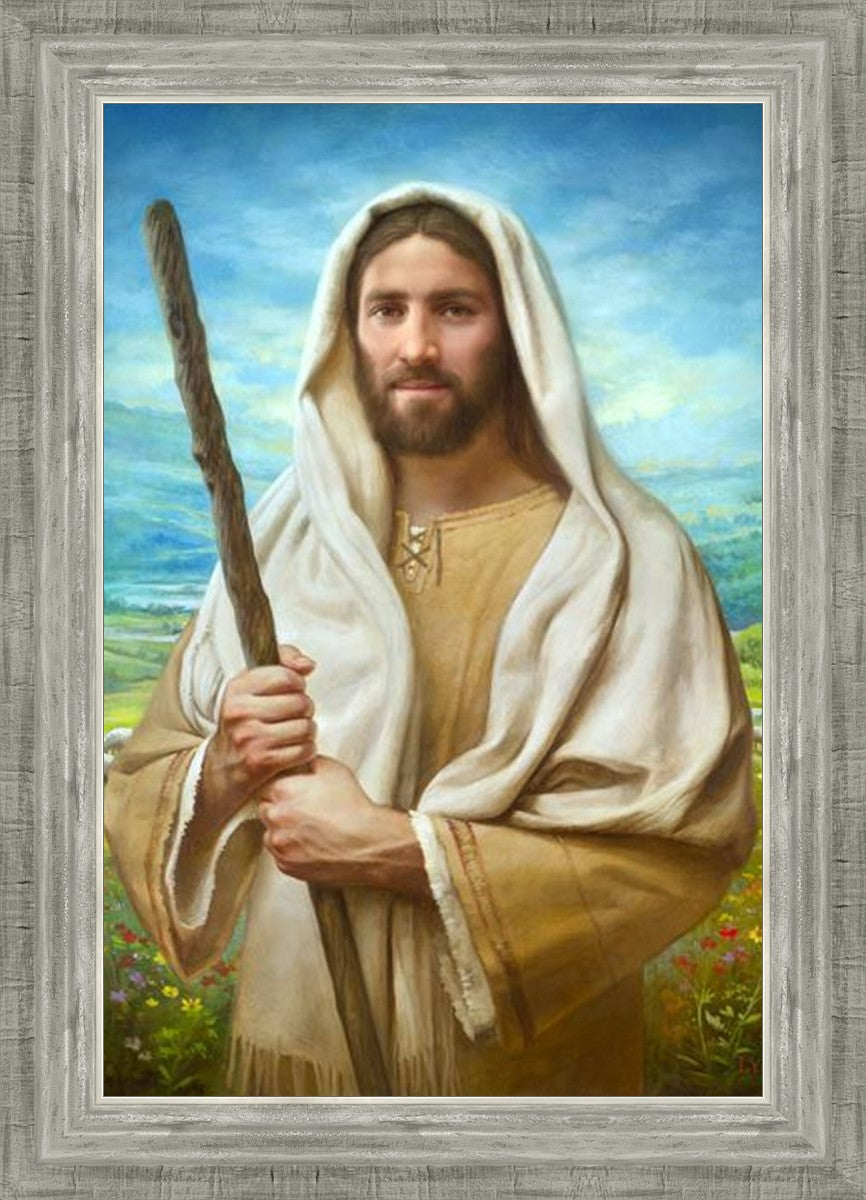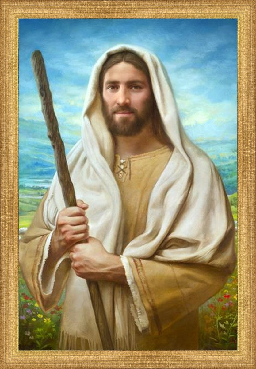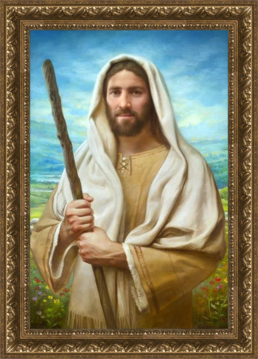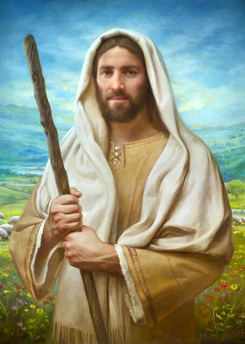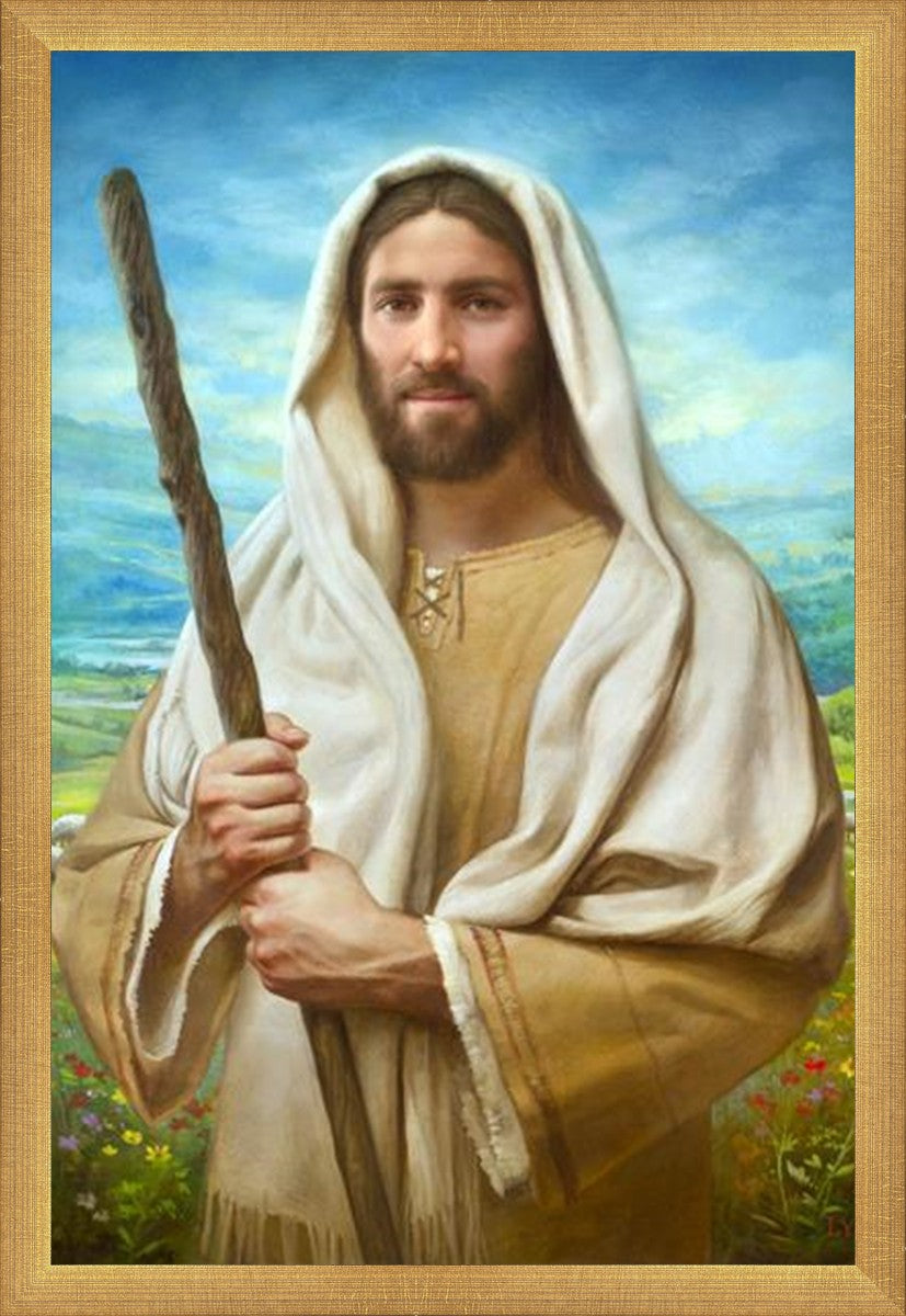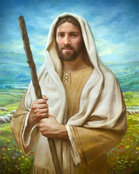 John 21:17 …Lovest thou me? And he said unto him, Lord, thou knowest all things; thou knowest that I love thee. Jesus saith unto him, Feed my sheep. **** In this painting, Christ is depicted in the role of the Good Shepherd. He holds firmly to the rod, representing the law of His Father. It symbolizes the commandments and teachings that help to keep us, His flock, safe. Christ’s countenance expresses the mercy of the Atonement and the path back to our Father. If we should stray from the safety of His flock in this life, we know that our Shepherd will find us if we call out to Him. We have also been given the charge, like Peter, to help our Savior in the work of bringing salvation to His flock, to feed His sheep. We will have the chance to bring nourishment to those who come across our way if we are willing to serve.