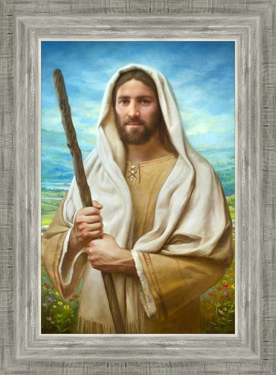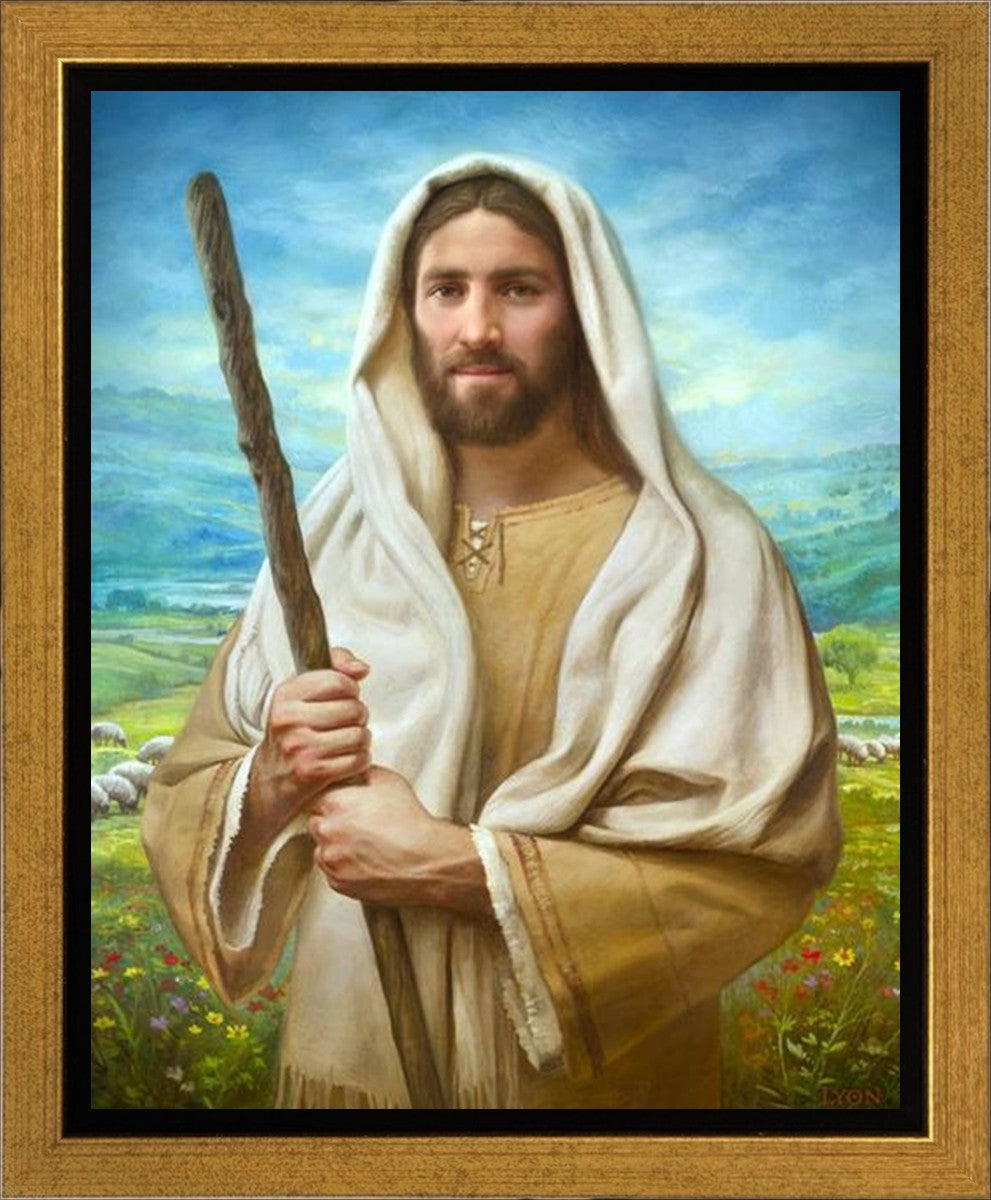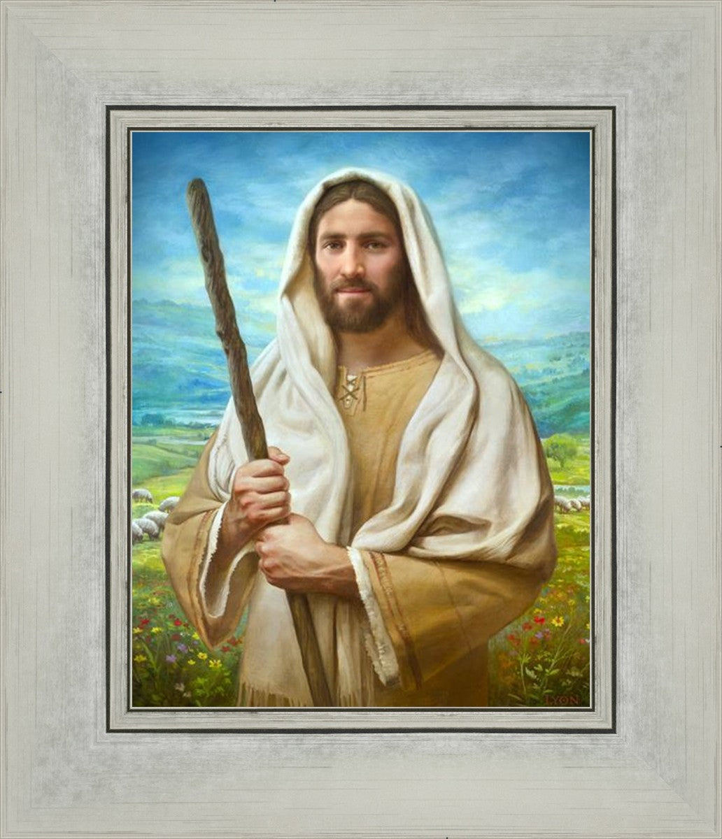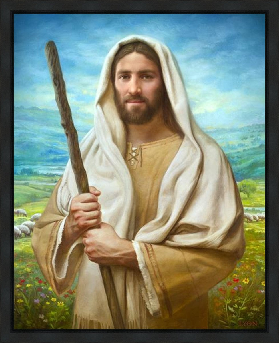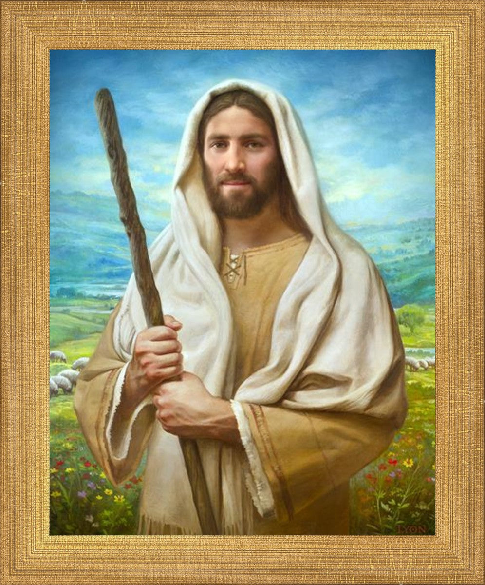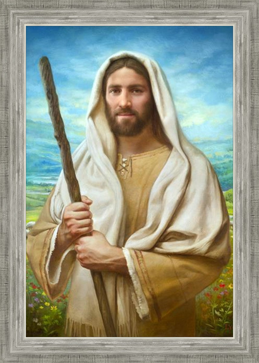 John 21:17 …Lovest thou me? And he said unto him, Lord, thou knowest all things; thou knowest that I love thee. Jesus saith unto him, Feed my sheep. **** In this painting, Christ is depicted in the role of the Good Shepherd. He holds firmly to the rod, representing the law of His Father. It symbolizes the commandments and teachings that help to keep us, His flock, safe. Christ’s countenance expresses the mercy of the Atonement and the path back to our Father. If we should stray from the safety of His flock in this life, we know that our Shepherd will find us if we call out to Him. We have also been given the charge, like Peter, to help our Savior in the work of bringing salvation to His flock, to feed His sheep. We will have the chance to bring nourishment to those who come across our way if we are willing to serve.