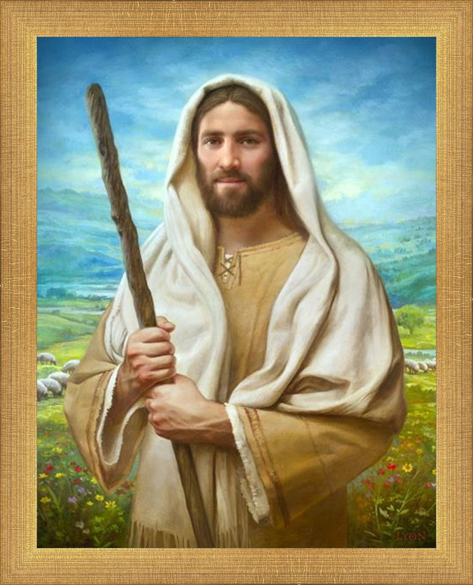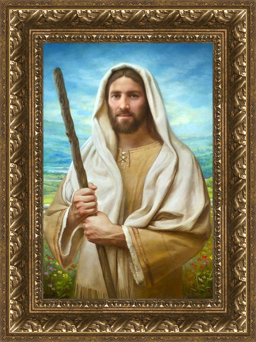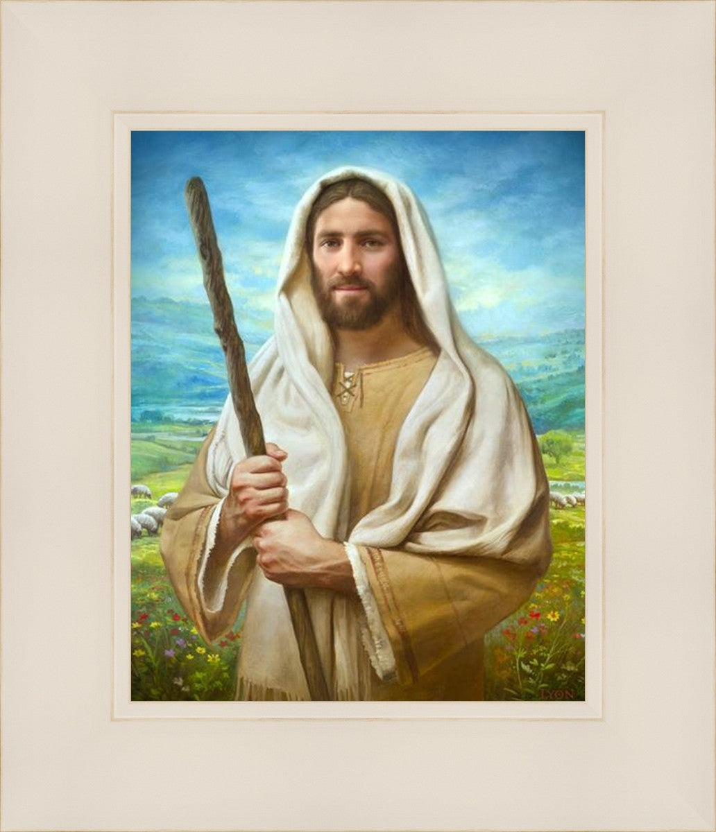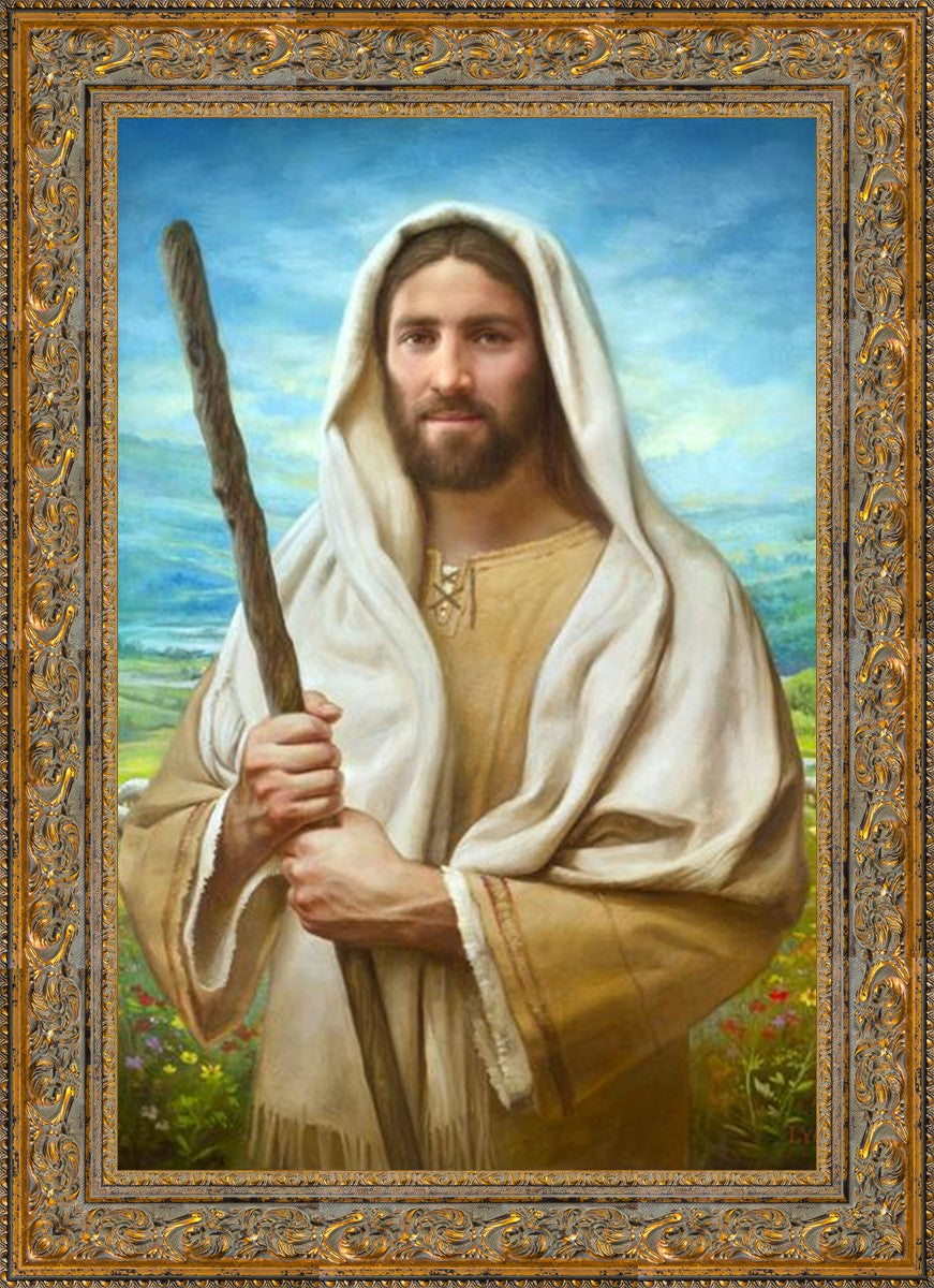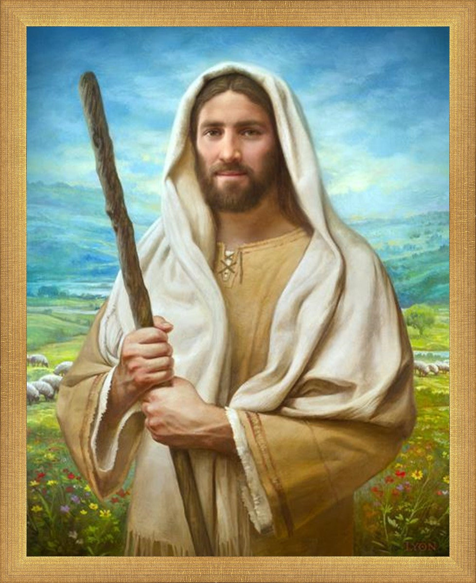 John 21:17 …Lovest thou me? And he said unto him, Lord, thou knowest all things; thou knowest that I love thee. Jesus saith unto him, Feed my sheep. **** In this painting, Christ is depicted in the role of the Good Shepherd. He holds firmly to the rod, representing the law of His Father. It symbolizes the commandments and teachings that help to keep us, His flock, safe. Christ’s countenance expresses the mercy of the Atonement and the path back to our Father. If we should stray from the safety of His flock in this life, we know that our Shepherd will find us if we call out to Him. We have also been given the charge, like Peter, to help our Savior in the work of bringing salvation to His flock, to feed His sheep. We will have the chance to bring nourishment to those who come across our way if we are willing to serve.