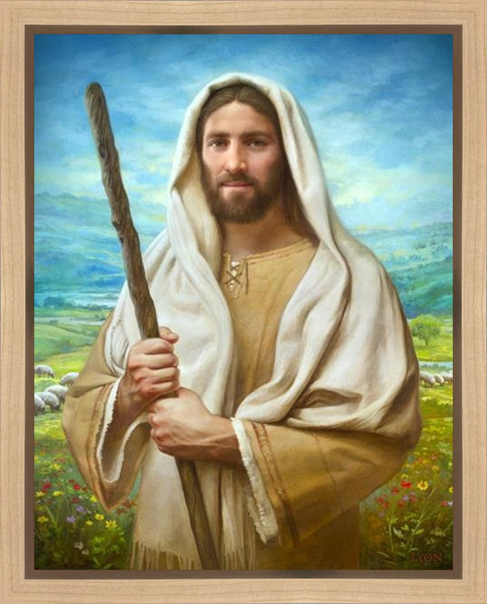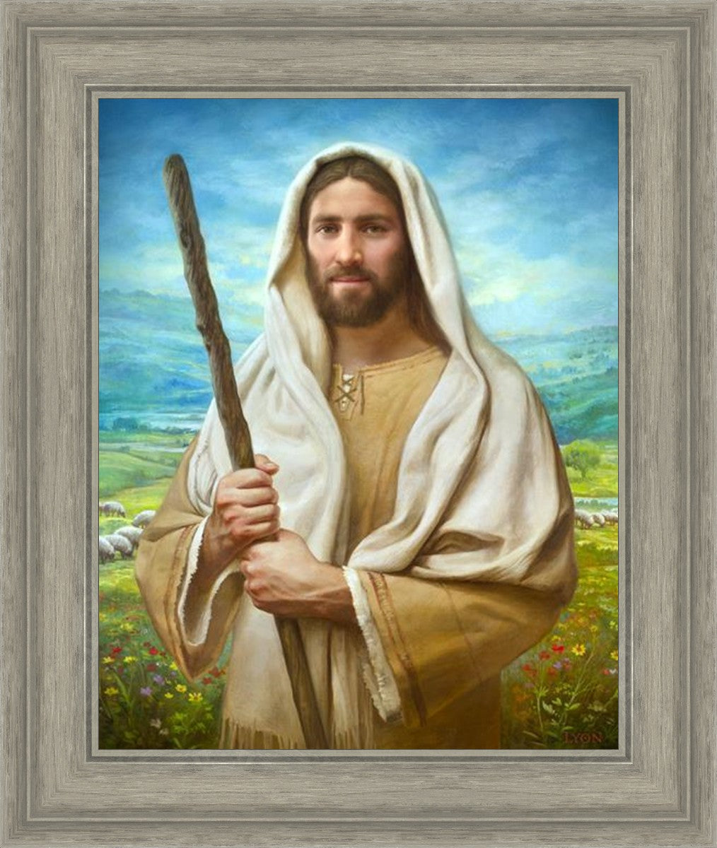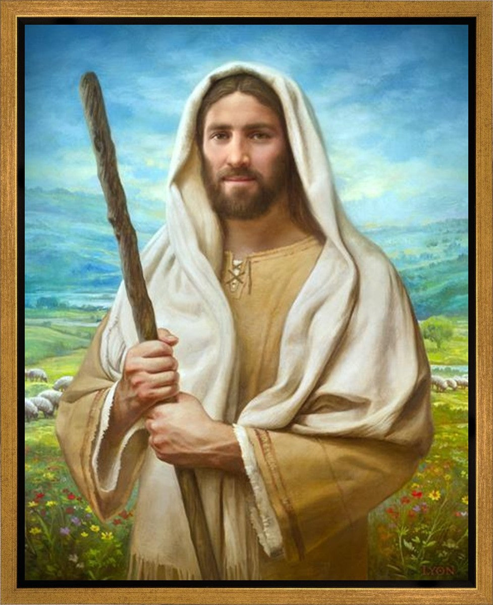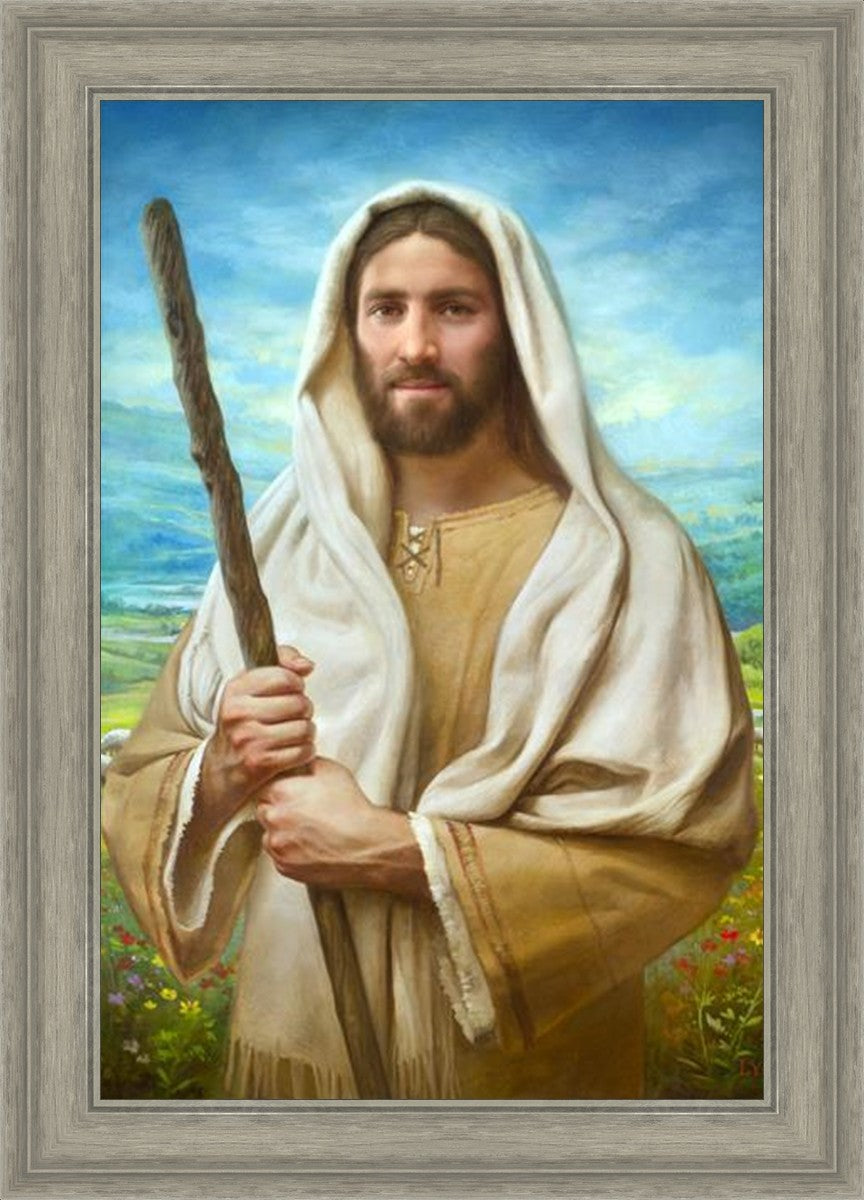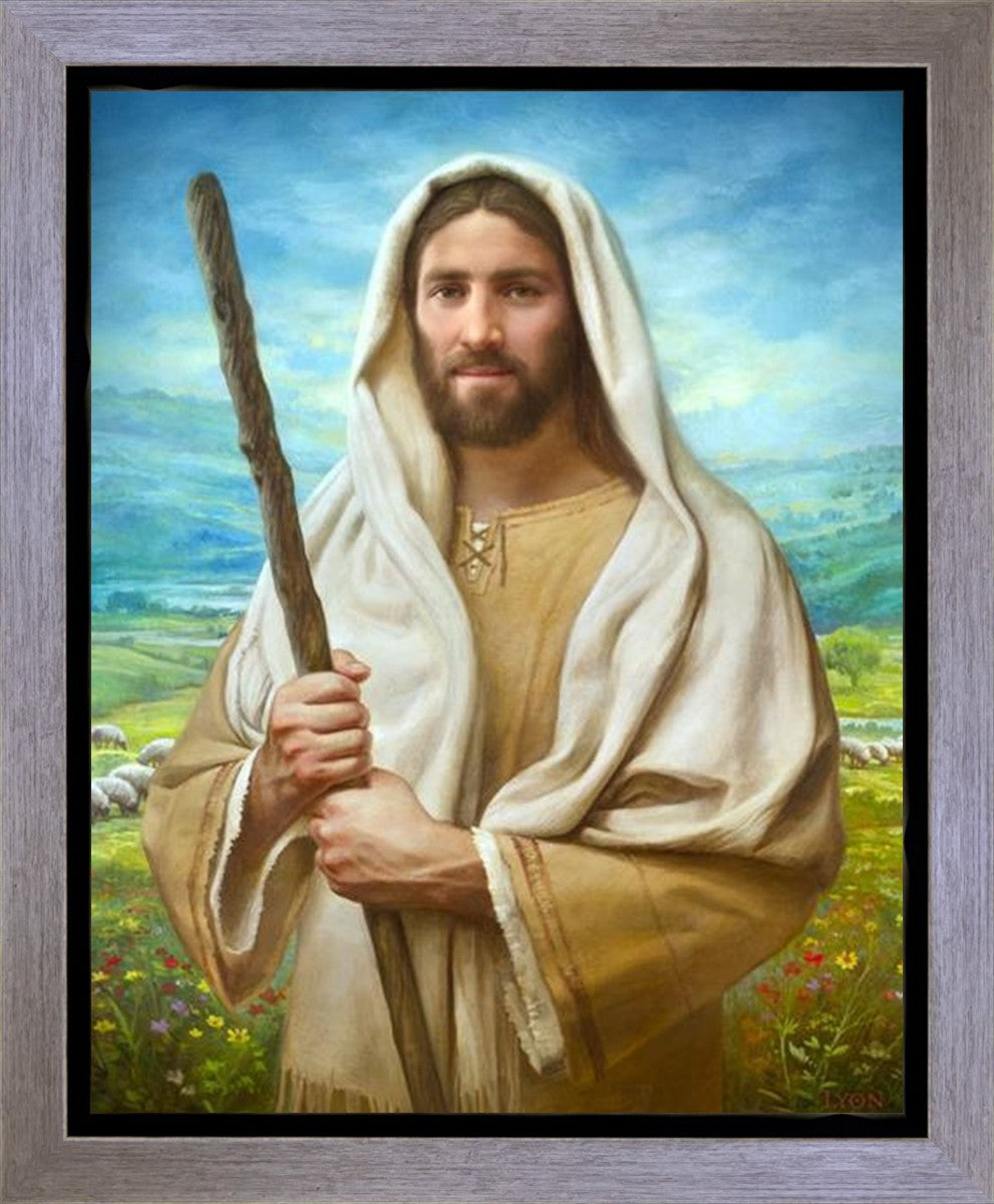 John 21:17 …Lovest thou me? And he said unto him, Lord, thou knowest all things; thou knowest that I love thee. Jesus saith unto him, Feed my sheep. **** In this painting, Christ is depicted in the role of the Good Shepherd. He holds firmly to the rod, representing the law of His Father. It symbolizes the commandments and teachings that help to keep us, His flock, safe. Christ’s countenance expresses the mercy of the Atonement and the path back to our Father. If we should stray from the safety of His flock in this life, we know that our Shepherd will find us if we call out to Him. We have also been given the charge, like Peter, to help our Savior in the work of bringing salvation to His flock, to feed His sheep. We will have the chance to bring nourishment to those who come across our way if we are willing to serve.