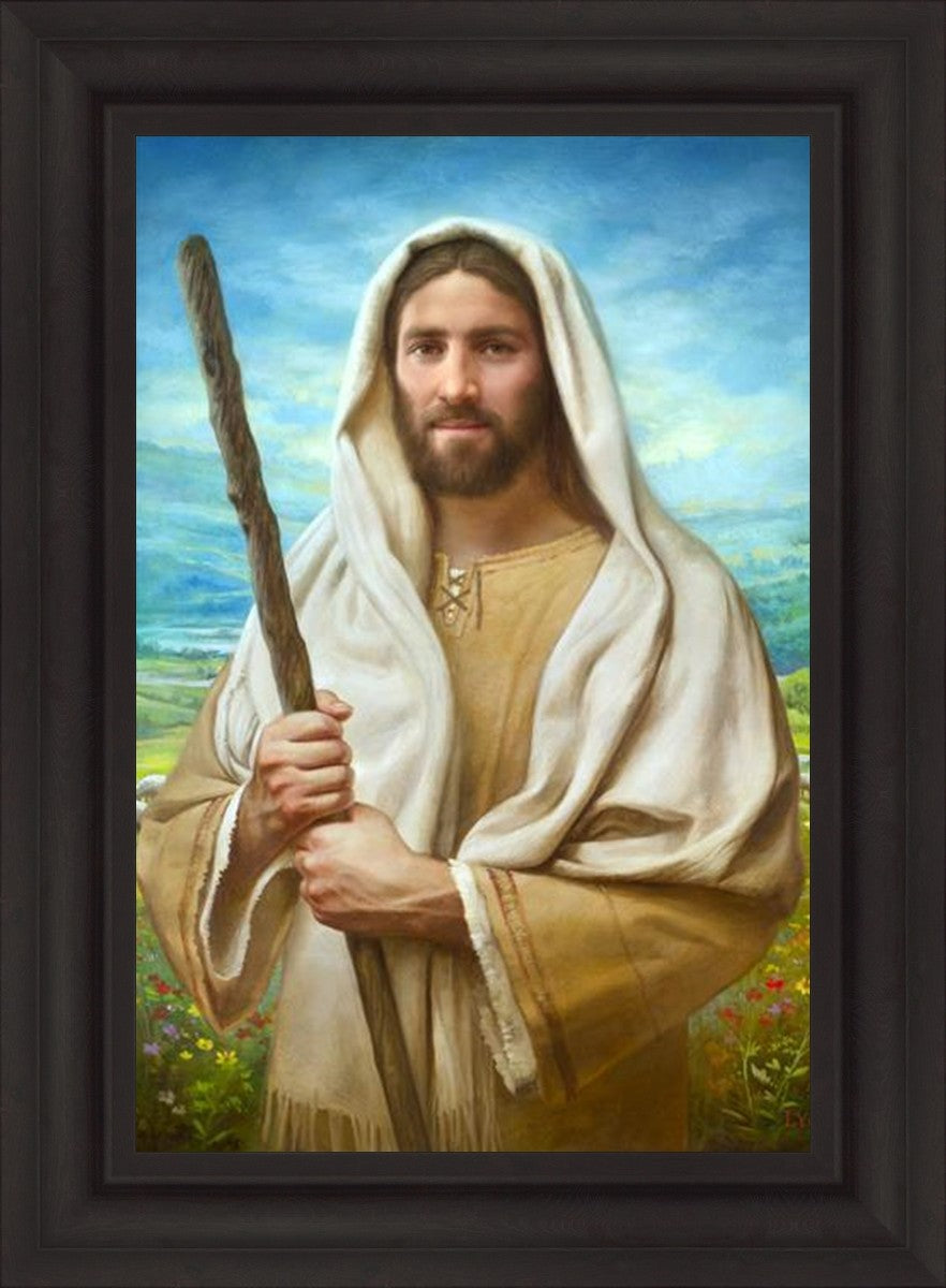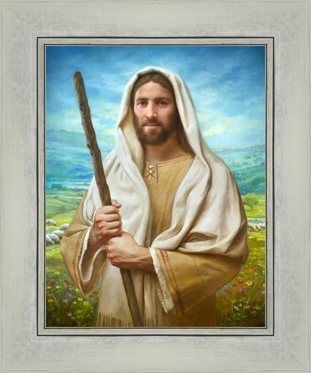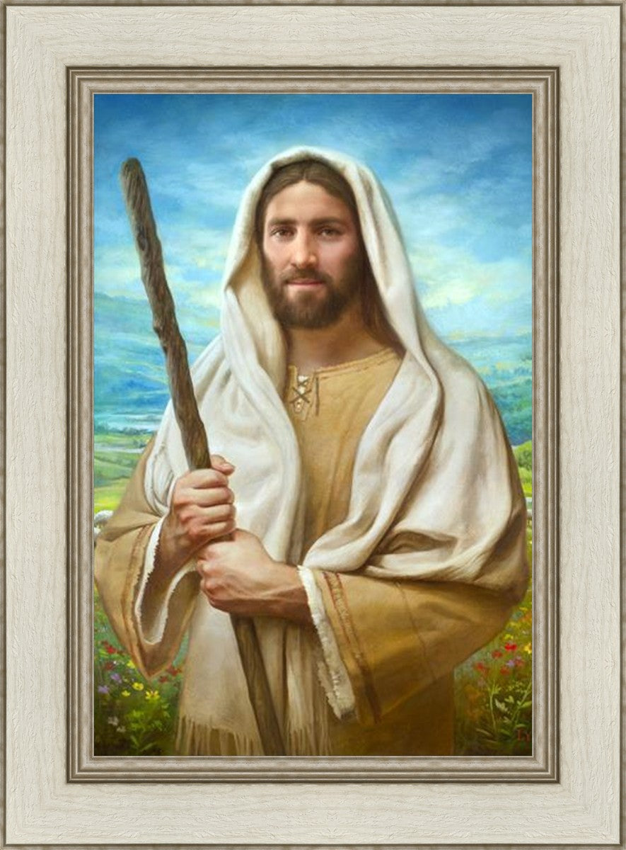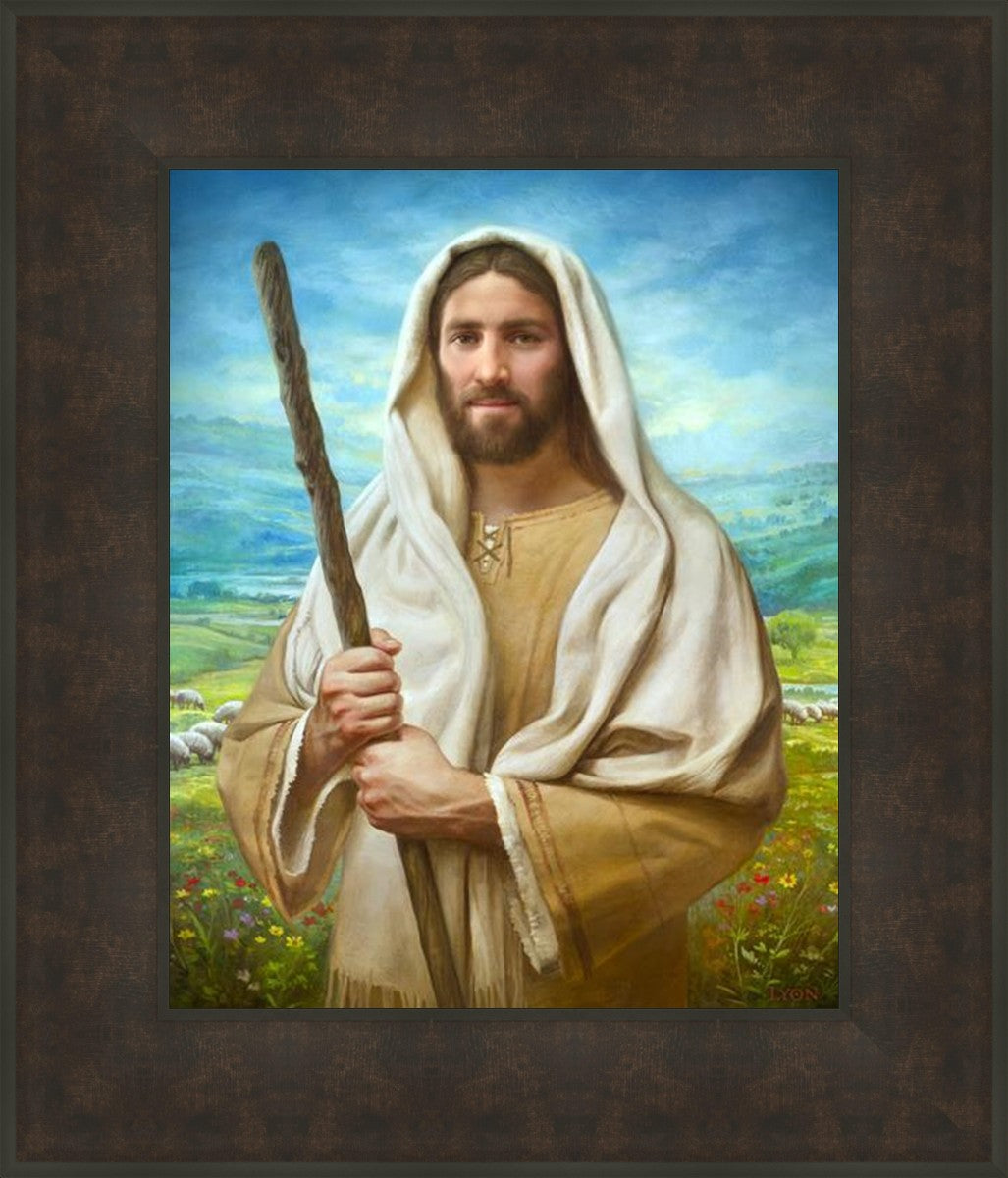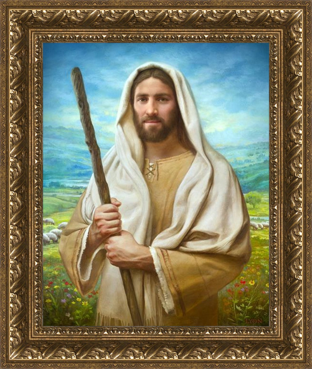 John 21:17 …Lovest thou me? And he said unto him, Lord, thou knowest all things; thou knowest that I love thee. Jesus saith unto him, Feed my sheep. **** In this painting, Christ is depicted in the role of the Good Shepherd. He holds firmly to the rod, representing the law of His Father. It symbolizes the commandments and teachings that help to keep us, His flock, safe. Christ’s countenance expresses the mercy of the Atonement and the path back to our Father. If we should stray from the safety of His flock in this life, we know that our Shepherd will find us if we call out to Him. We have also been given the charge, like Peter, to help our Savior in the work of bringing salvation to His flock, to feed His sheep. We will have the chance to bring nourishment to those who come across our way if we are willing to serve.