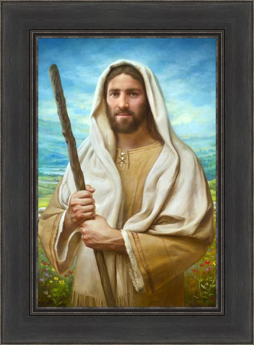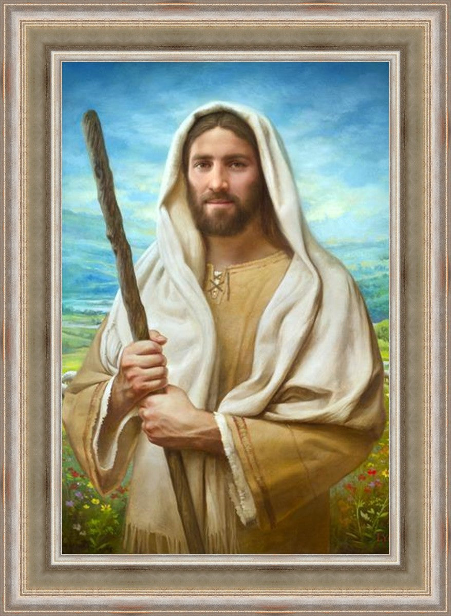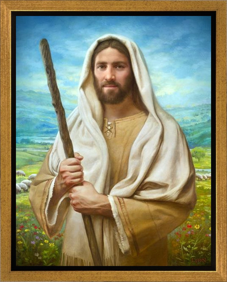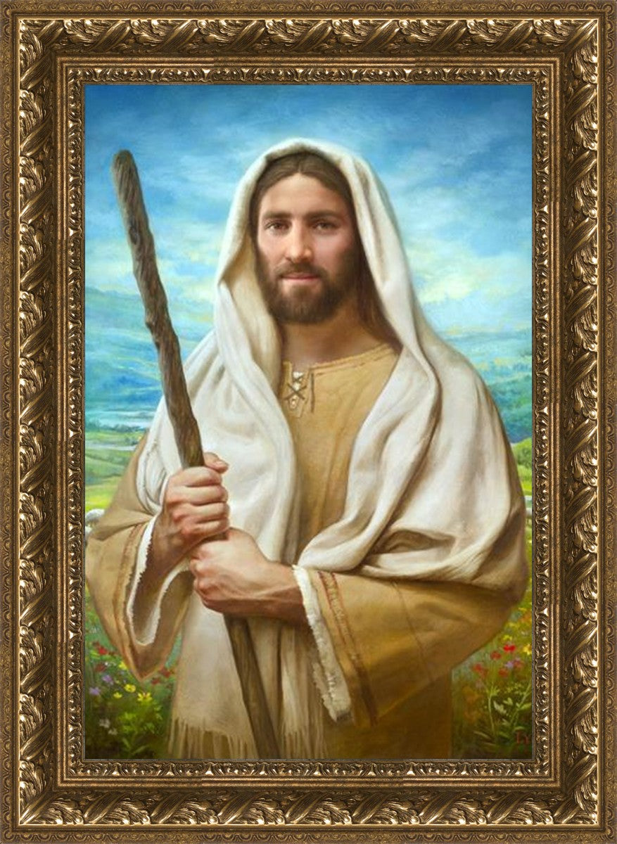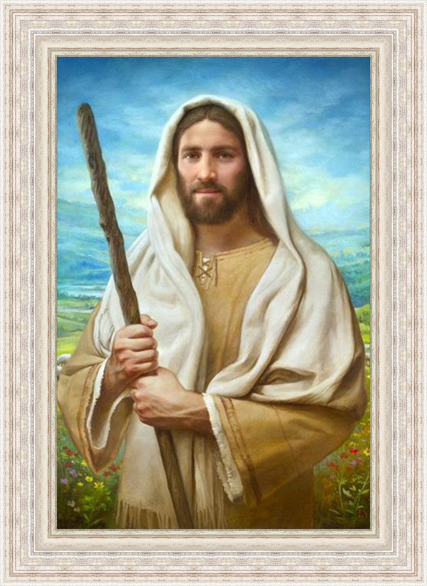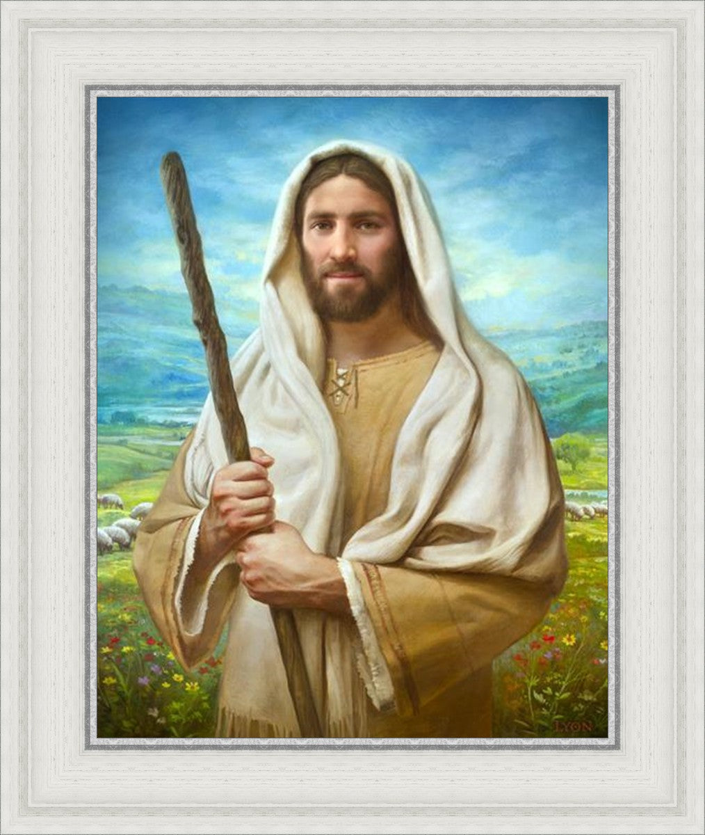 John 21:17 …Lovest thou me? And he said unto him, Lord, thou knowest all things; thou knowest that I love thee. Jesus saith unto him, Feed my sheep. **** In this painting, Christ is depicted in the role of the Good Shepherd. He holds firmly to the rod, representing the law of His Father. It symbolizes the commandments and teachings that help to keep us, His flock, safe. Christ’s countenance expresses the mercy of the Atonement and the path back to our Father. If we should stray from the safety of His flock in this life, we know that our Shepherd will find us if we call out to Him. We have also been given the charge, like Peter, to help our Savior in the work of bringing salvation to His flock, to feed His sheep. We will have the chance to bring nourishment to those who come across our way if we are willing to serve.