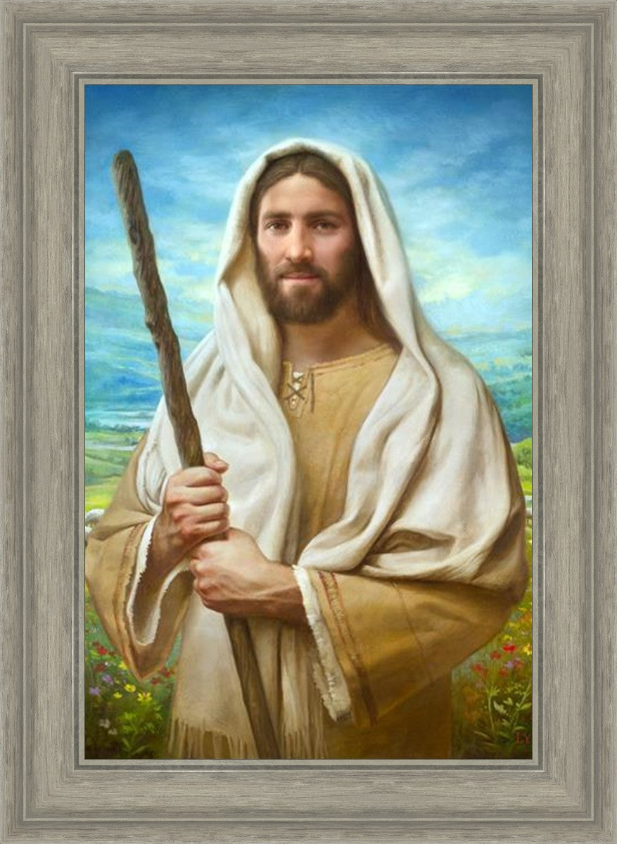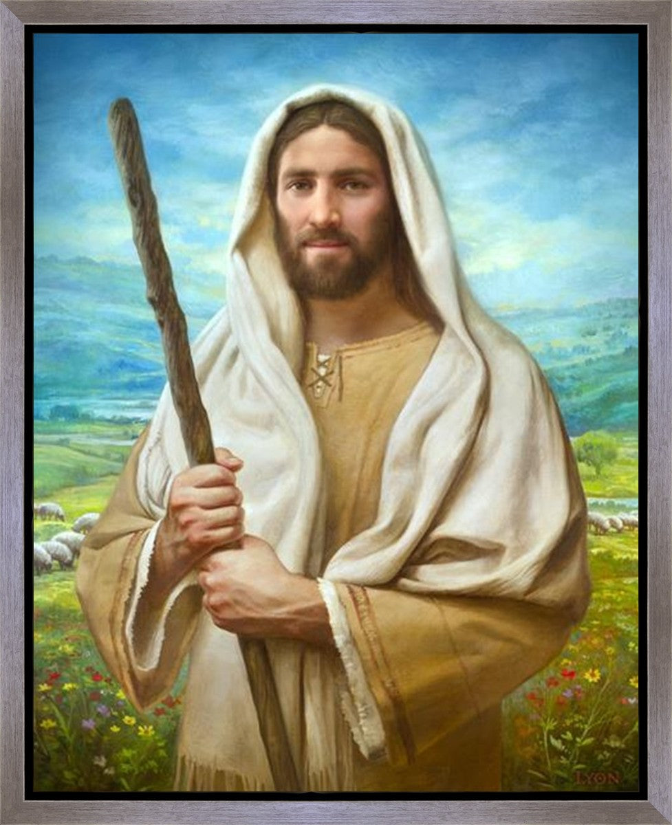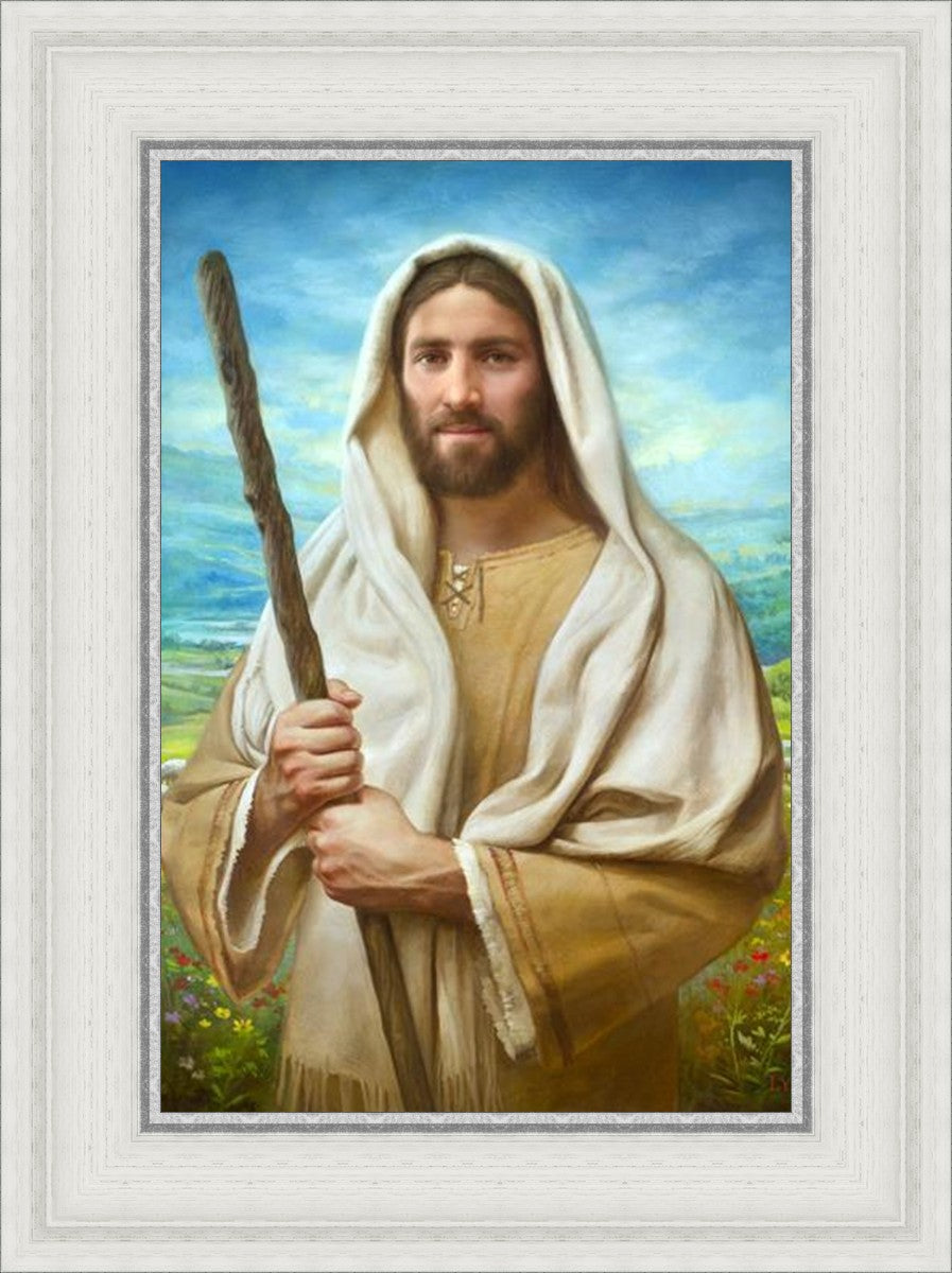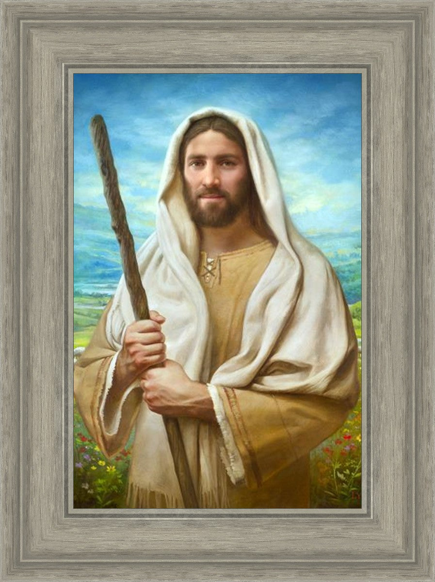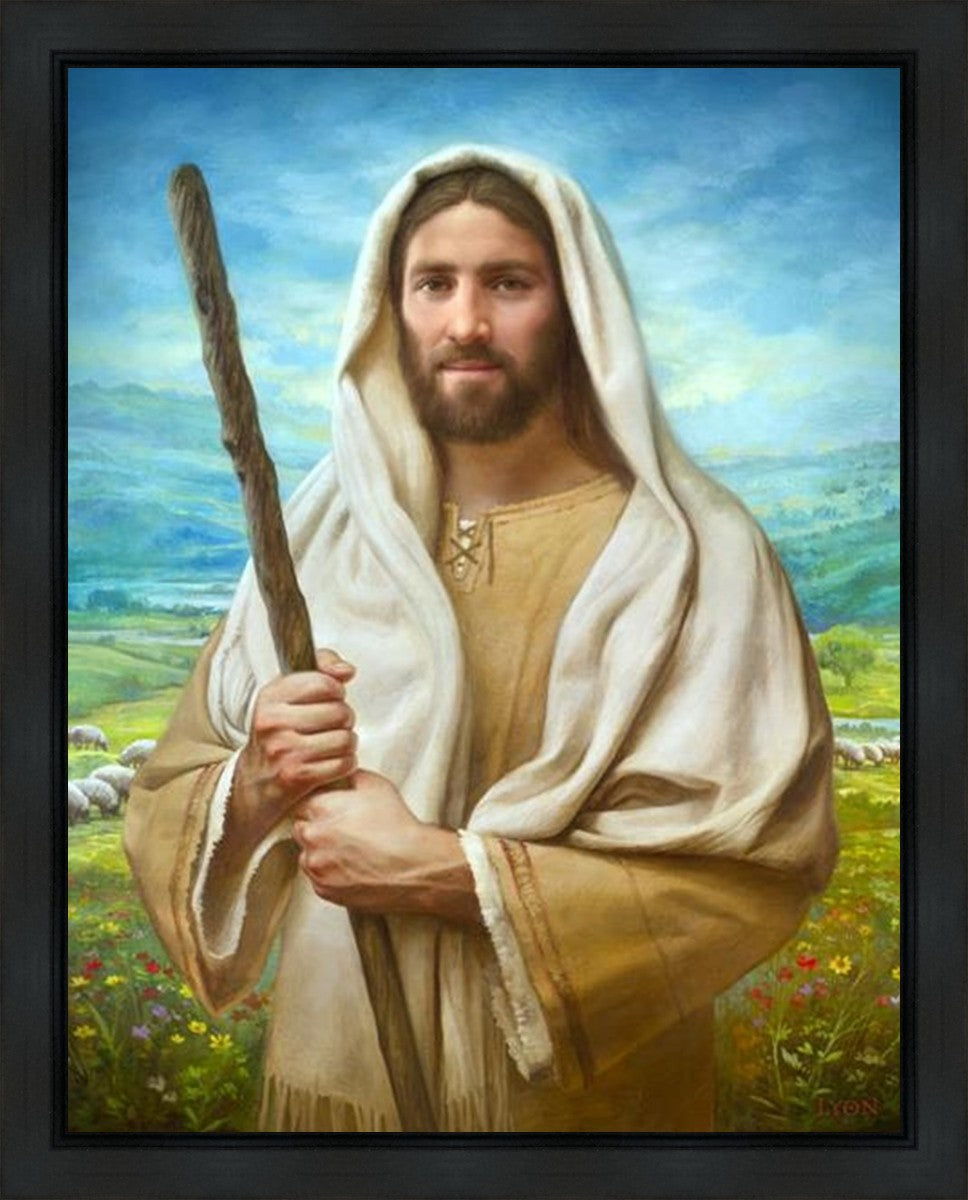 John 21:17 …Lovest thou me? And he said unto him, Lord, thou knowest all things; thou knowest that I love thee. Jesus saith unto him, Feed my sheep. **** In this painting, Christ is depicted in the role of the Good Shepherd. He holds firmly to the rod, representing the law of His Father. It symbolizes the commandments and teachings that help to keep us, His flock, safe. Christ’s countenance expresses the mercy of the Atonement and the path back to our Father. If we should stray from the safety of His flock in this life, we know that our Shepherd will find us if we call out to Him. We have also been given the charge, like Peter, to help our Savior in the work of bringing salvation to His flock, to feed His sheep. We will have the chance to bring nourishment to those who come across our way if we are willing to serve.