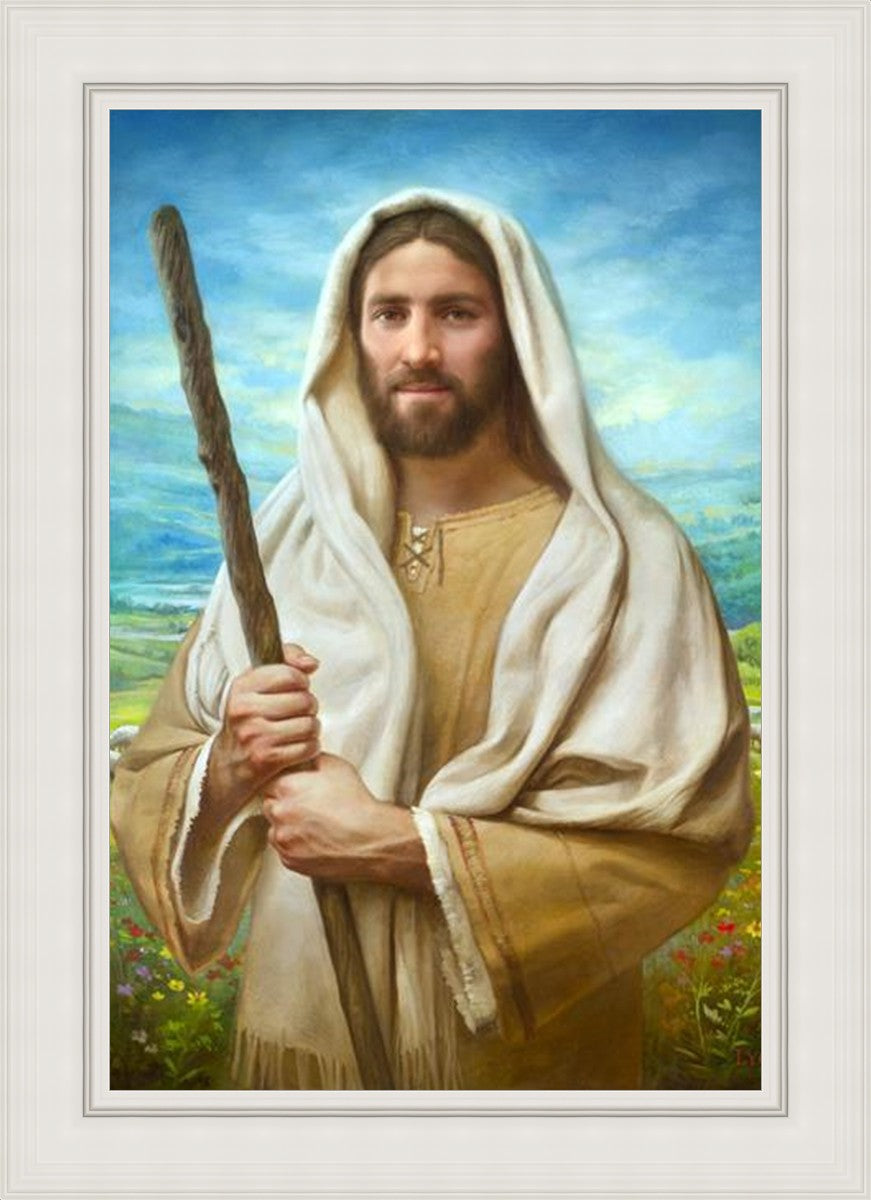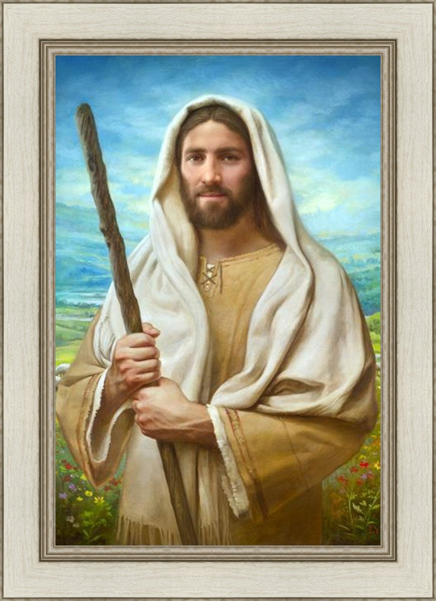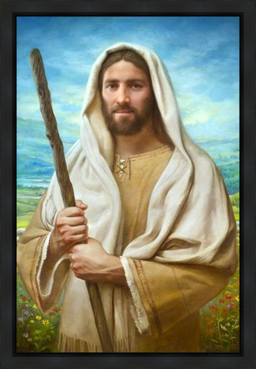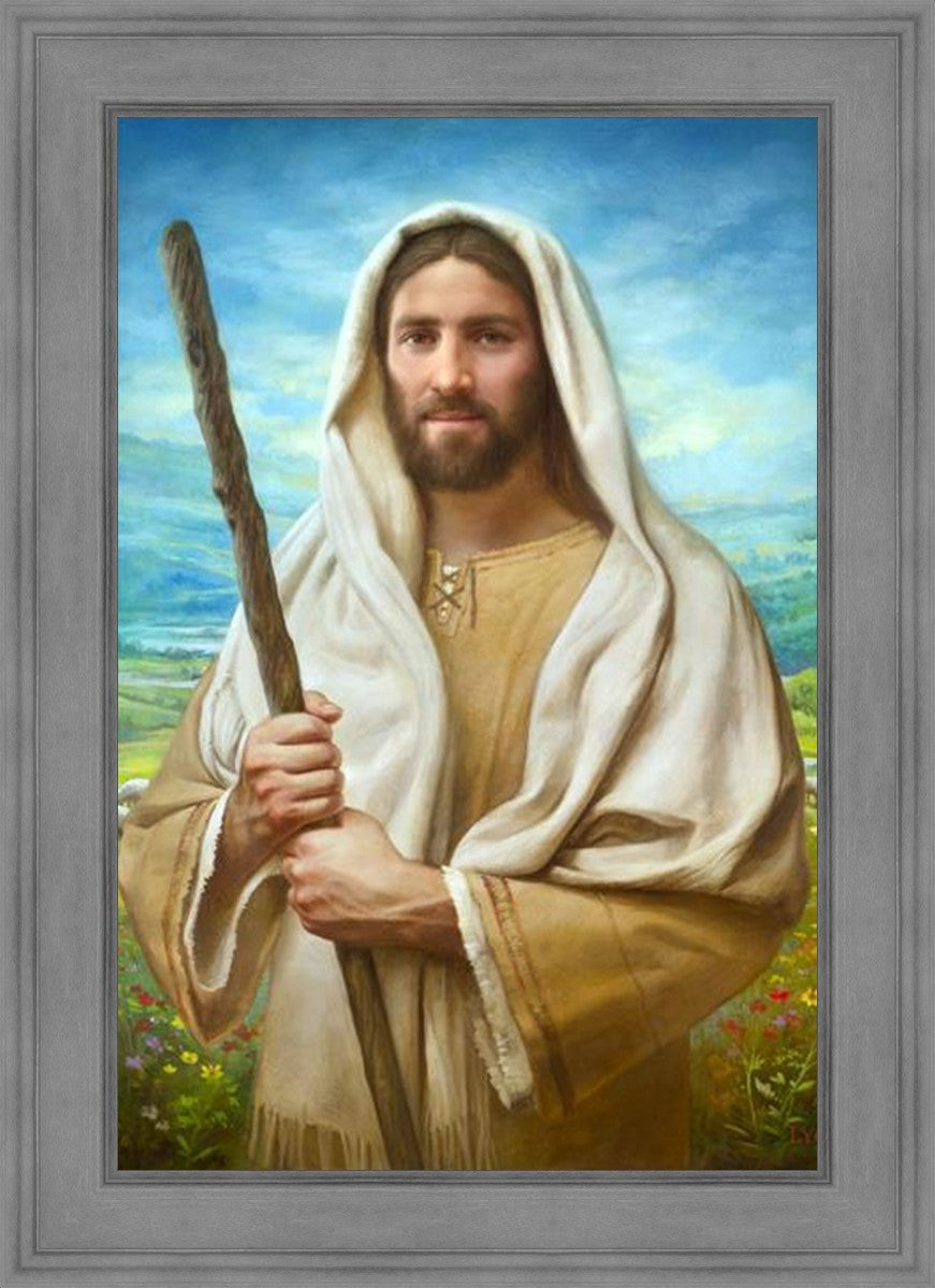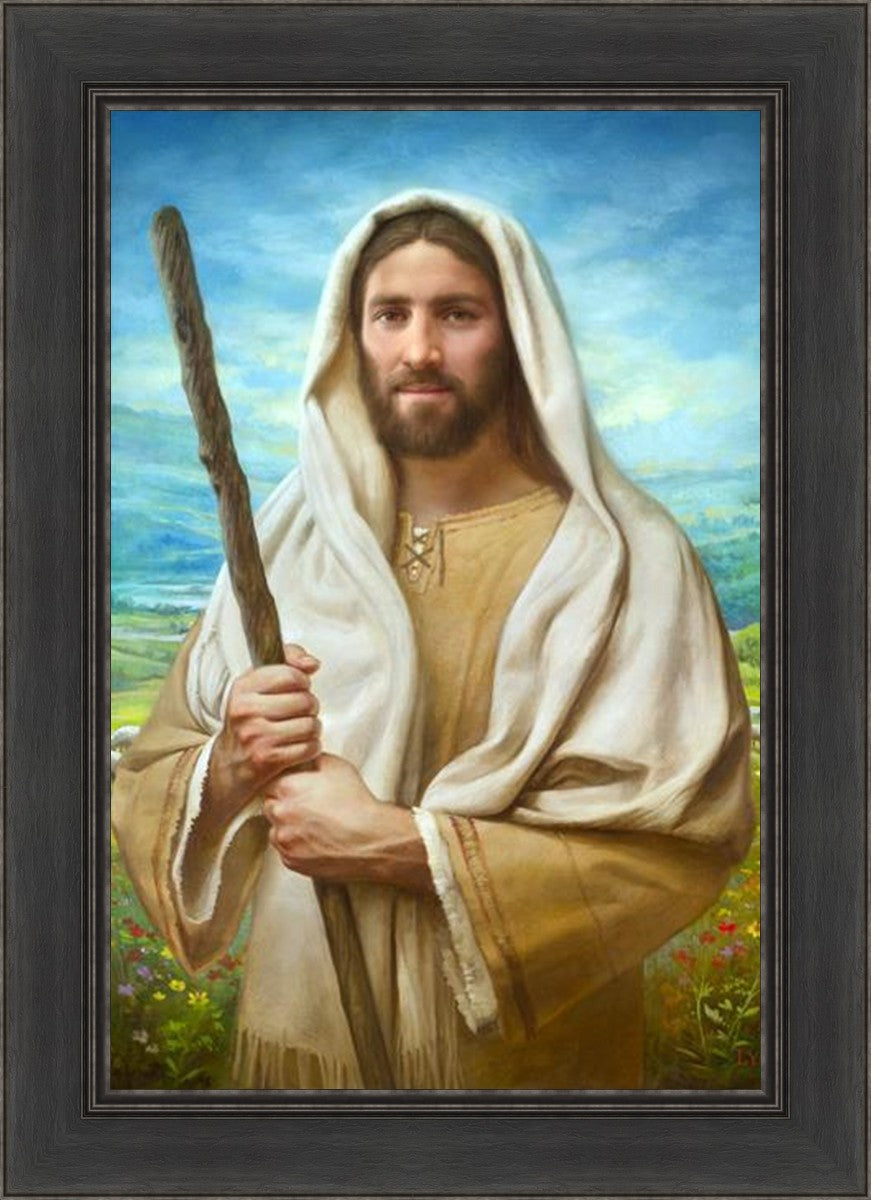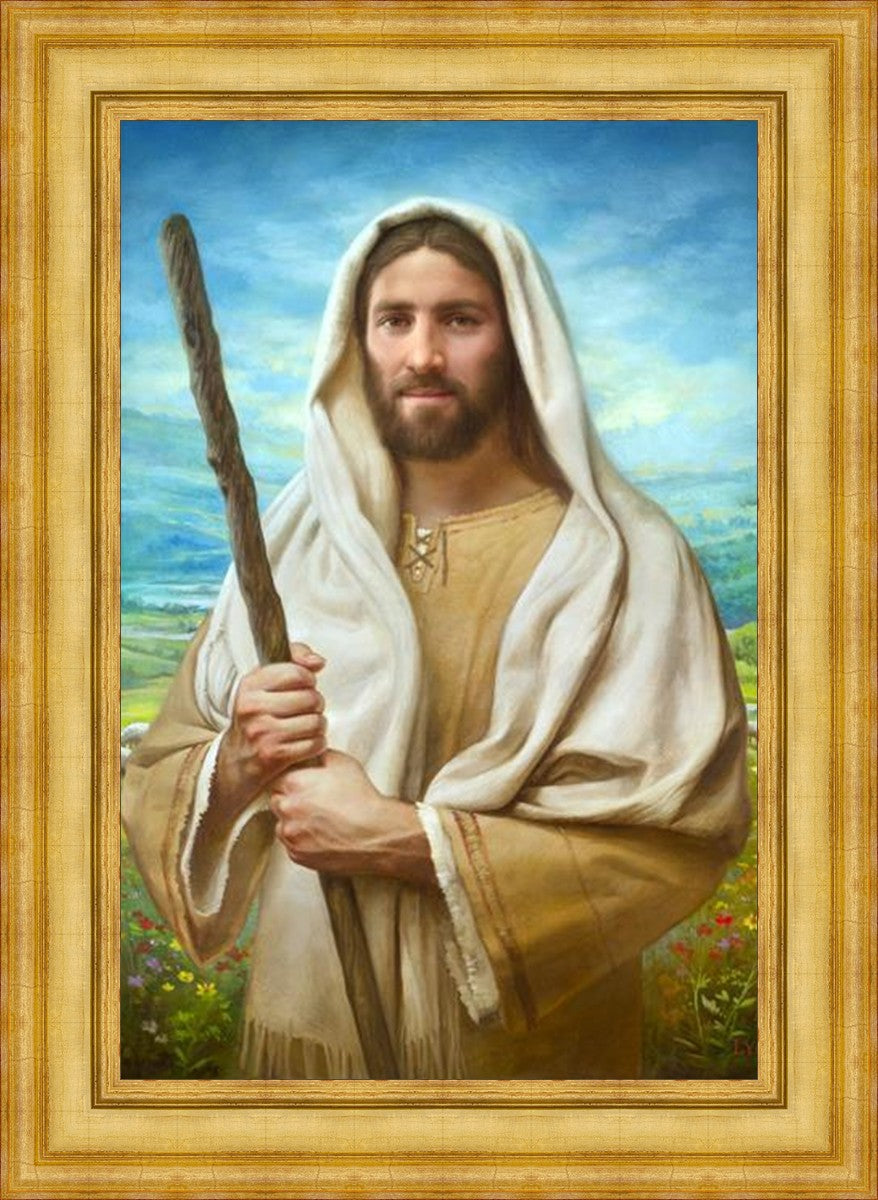 John 21:17 …Lovest thou me? And he said unto him, Lord, thou knowest all things; thou knowest that I love thee. Jesus saith unto him, Feed my sheep. **** In this painting, Christ is depicted in the role of the Good Shepherd. He holds firmly to the rod, representing the law of His Father. It symbolizes the commandments and teachings that help to keep us, His flock, safe. Christ’s countenance expresses the mercy of the Atonement and the path back to our Father. If we should stray from the safety of His flock in this life, we know that our Shepherd will find us if we call out to Him. We have also been given the charge, like Peter, to help our Savior in the work of bringing salvation to His flock, to feed His sheep. We will have the chance to bring nourishment to those who come across our way if we are willing to serve.