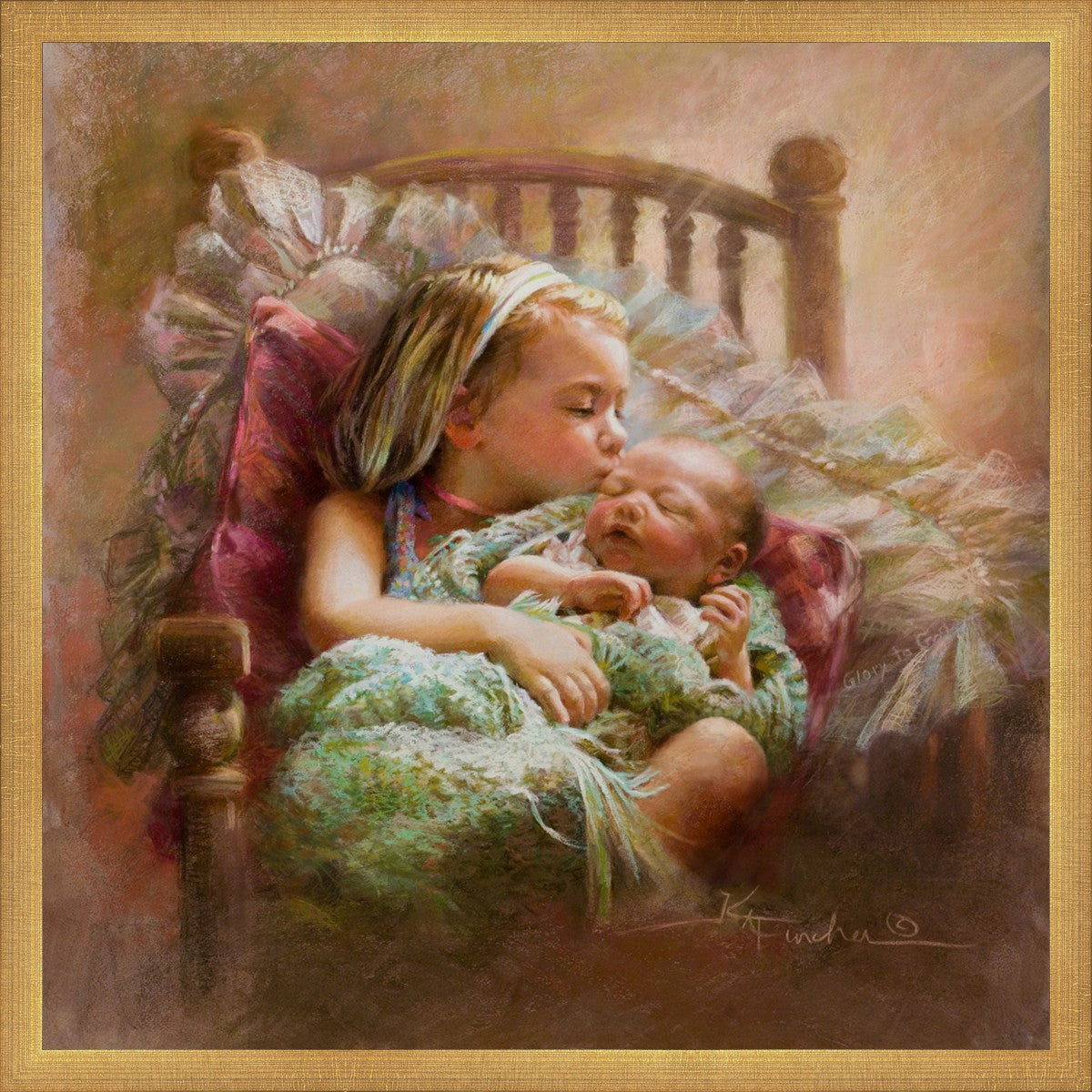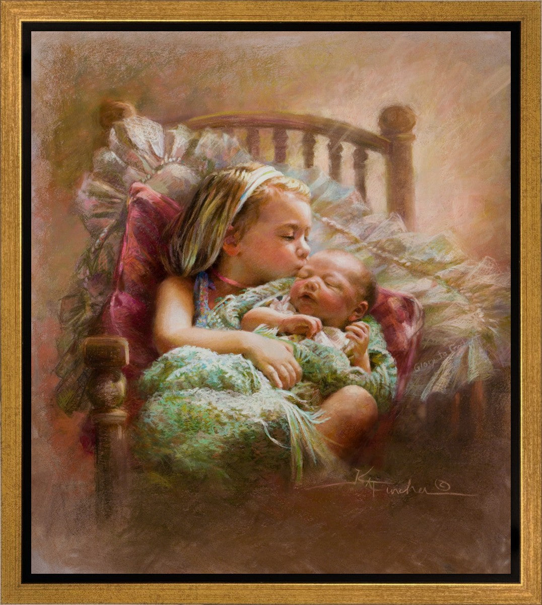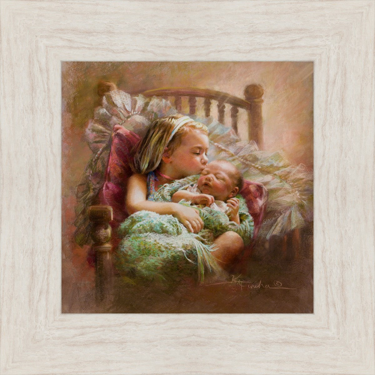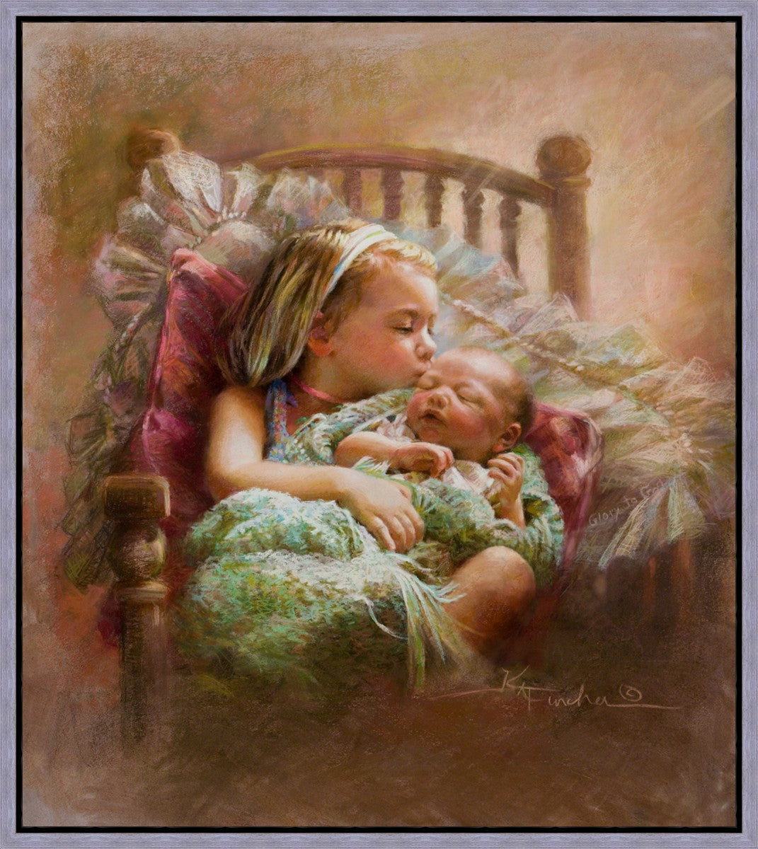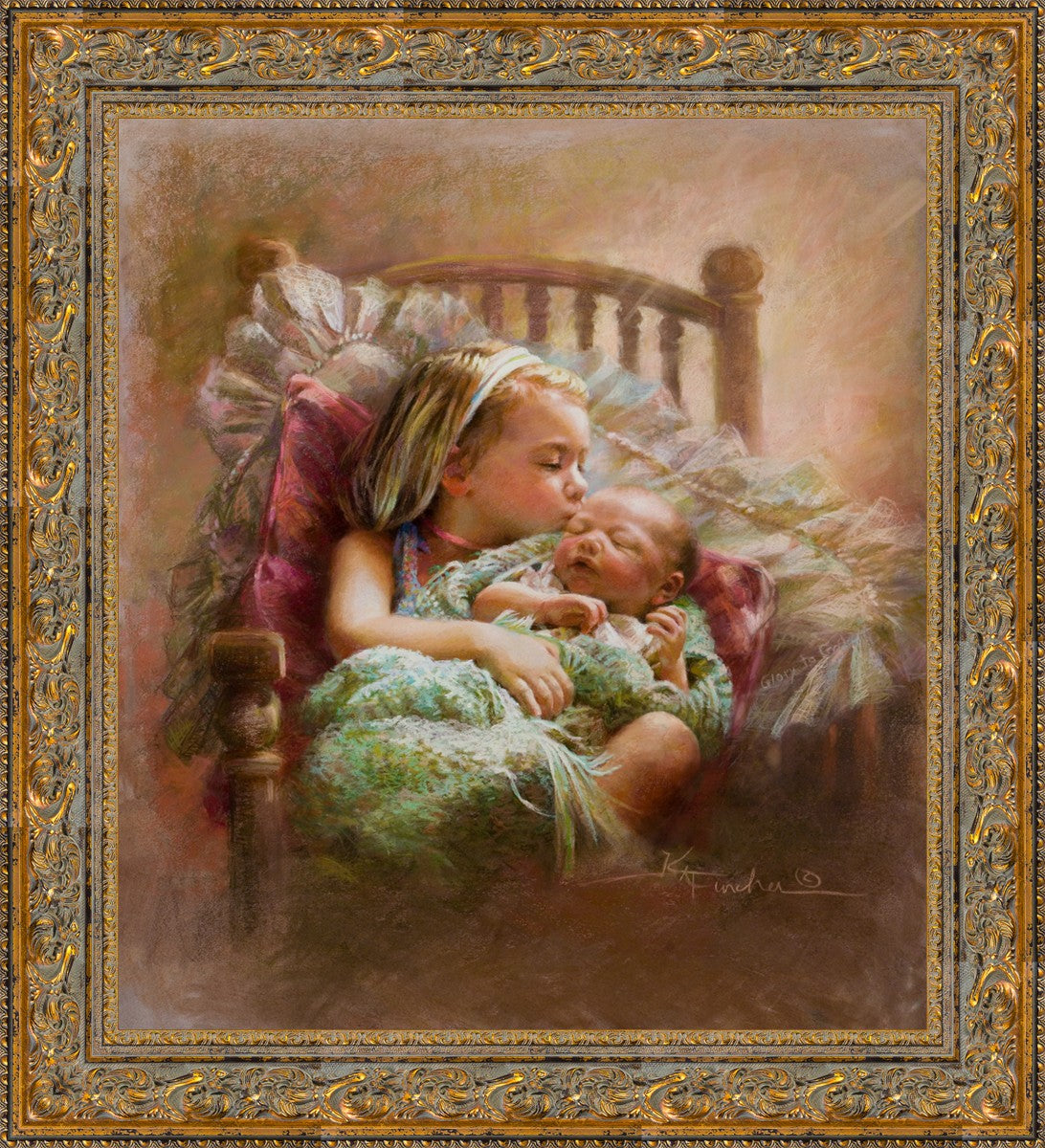 In Fresh from Heaven, an important part of this story lies on the floor, just beyond the painting’s frame. A doll that was once new, now worn from love, is tossed aside at the invitation to hold a living, breathing baby. Mom has prepared the generations-old rocking chair for the introduction. After securing pillows to support and cradle the baby, Mom positions her inquisitive child and places a sleeping baby in her open arms. And … the long-awaited union begins with a kiss.