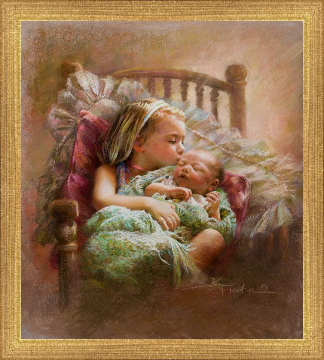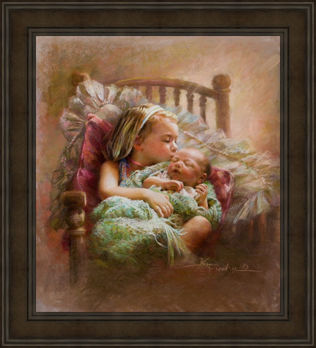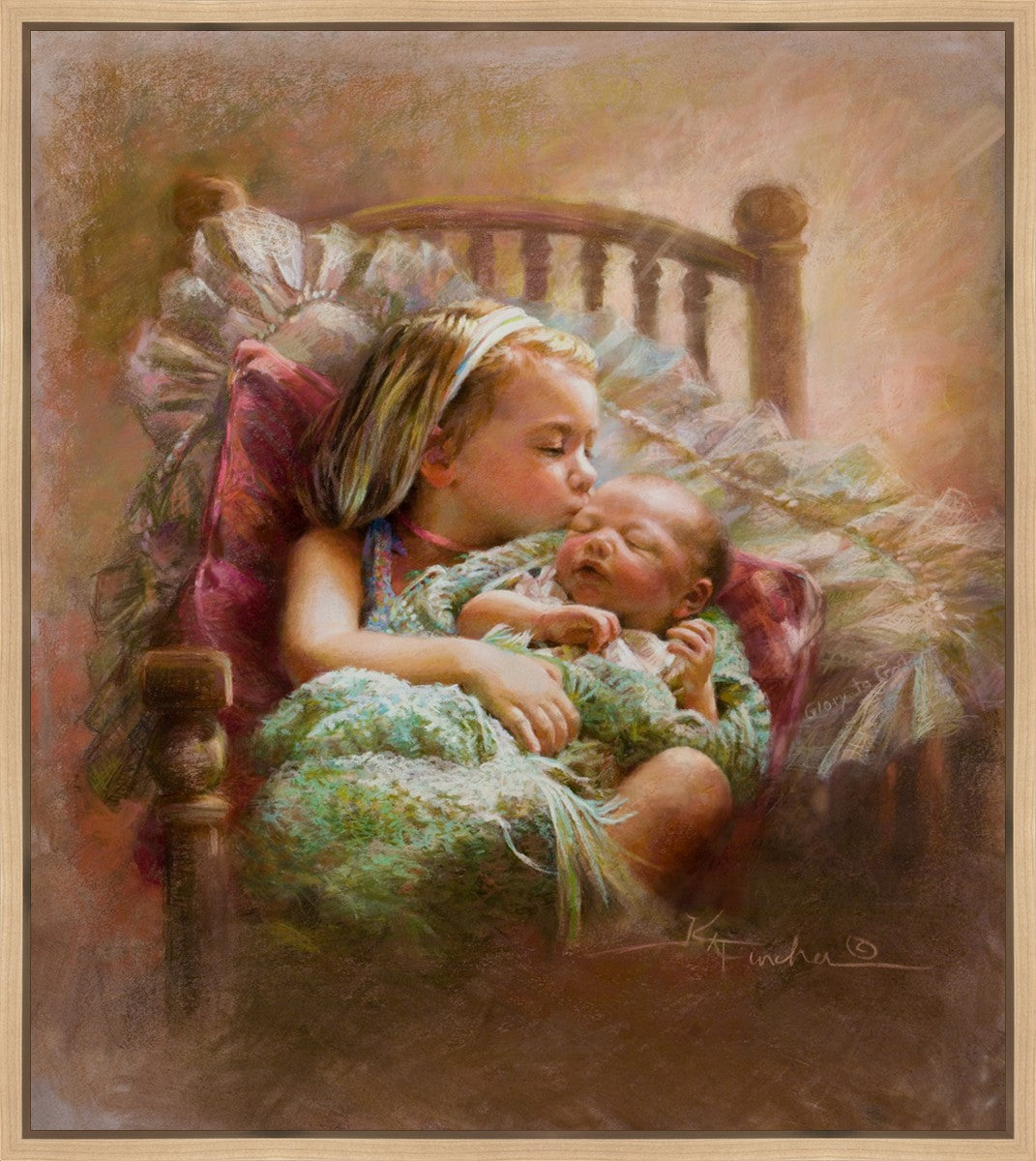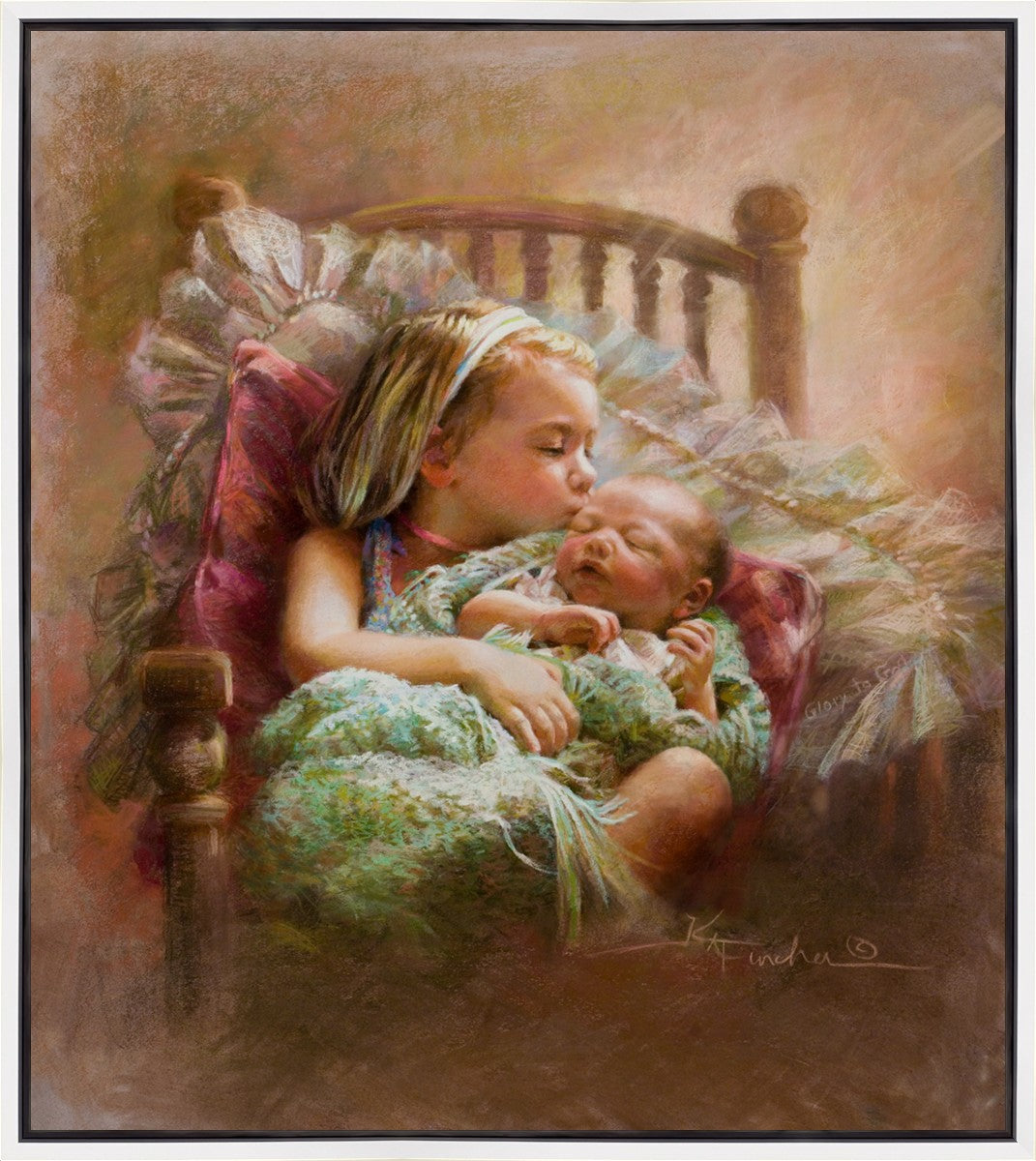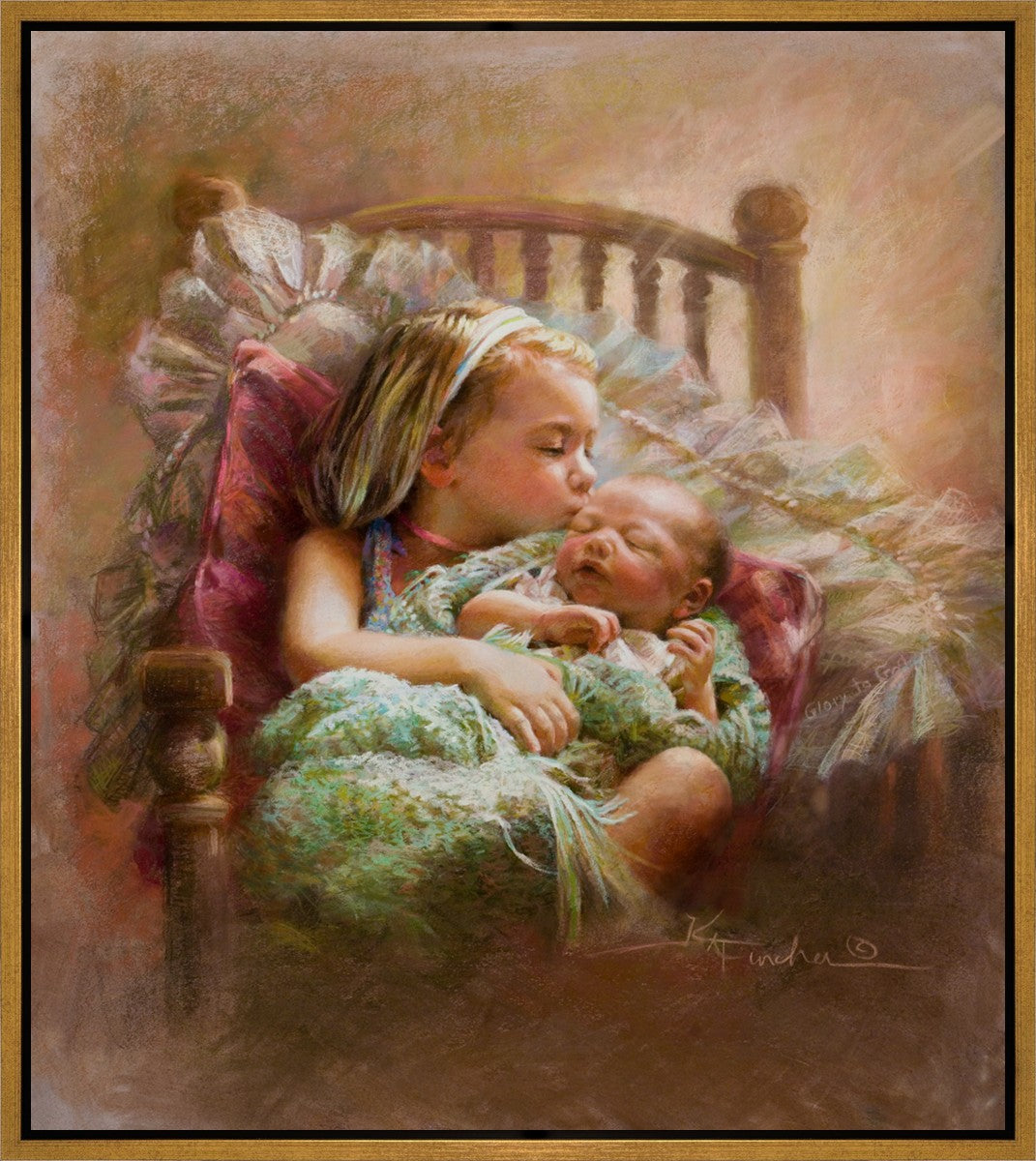 In Fresh from Heaven, an important part of this story lies on the floor, just beyond the painting’s frame. A doll that was once new, now worn from love, is tossed aside at the invitation to hold a living, breathing baby. Mom has prepared the generations-old rocking chair for the introduction. After securing pillows to support and cradle the baby, Mom positions her inquisitive child and places a sleeping baby in her open arms. And … the long-awaited union begins with a kiss.