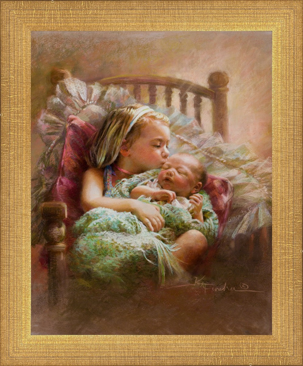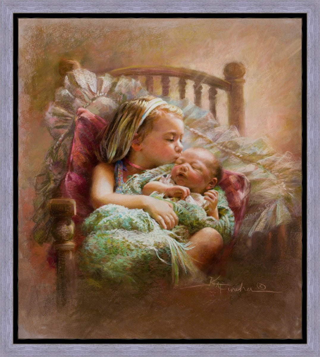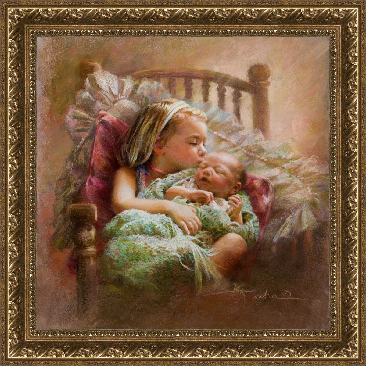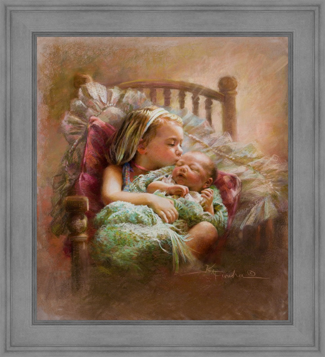 In Fresh from Heaven, an important part of this story lies on the floor, just beyond the painting’s frame. A doll that was once new, now worn from love, is tossed aside at the invitation to hold a living, breathing baby. Mom has prepared the generations-old rocking chair for the introduction. After securing pillows to support and cradle the baby, Mom positions her inquisitive child and places a sleeping baby in her open arms. And … the long-awaited union begins with a kiss.