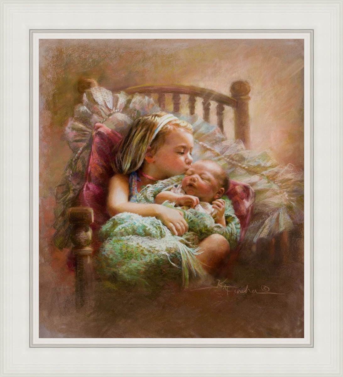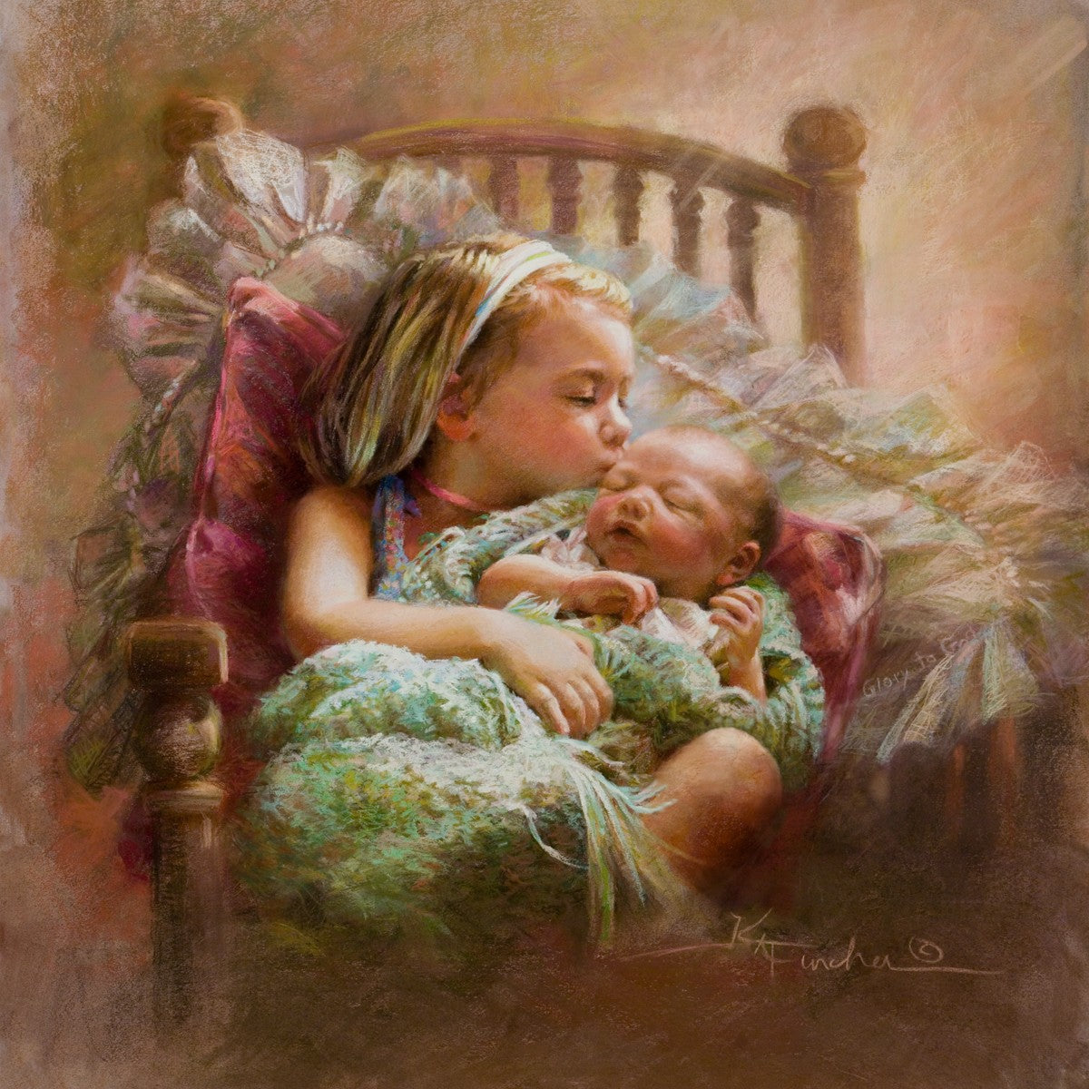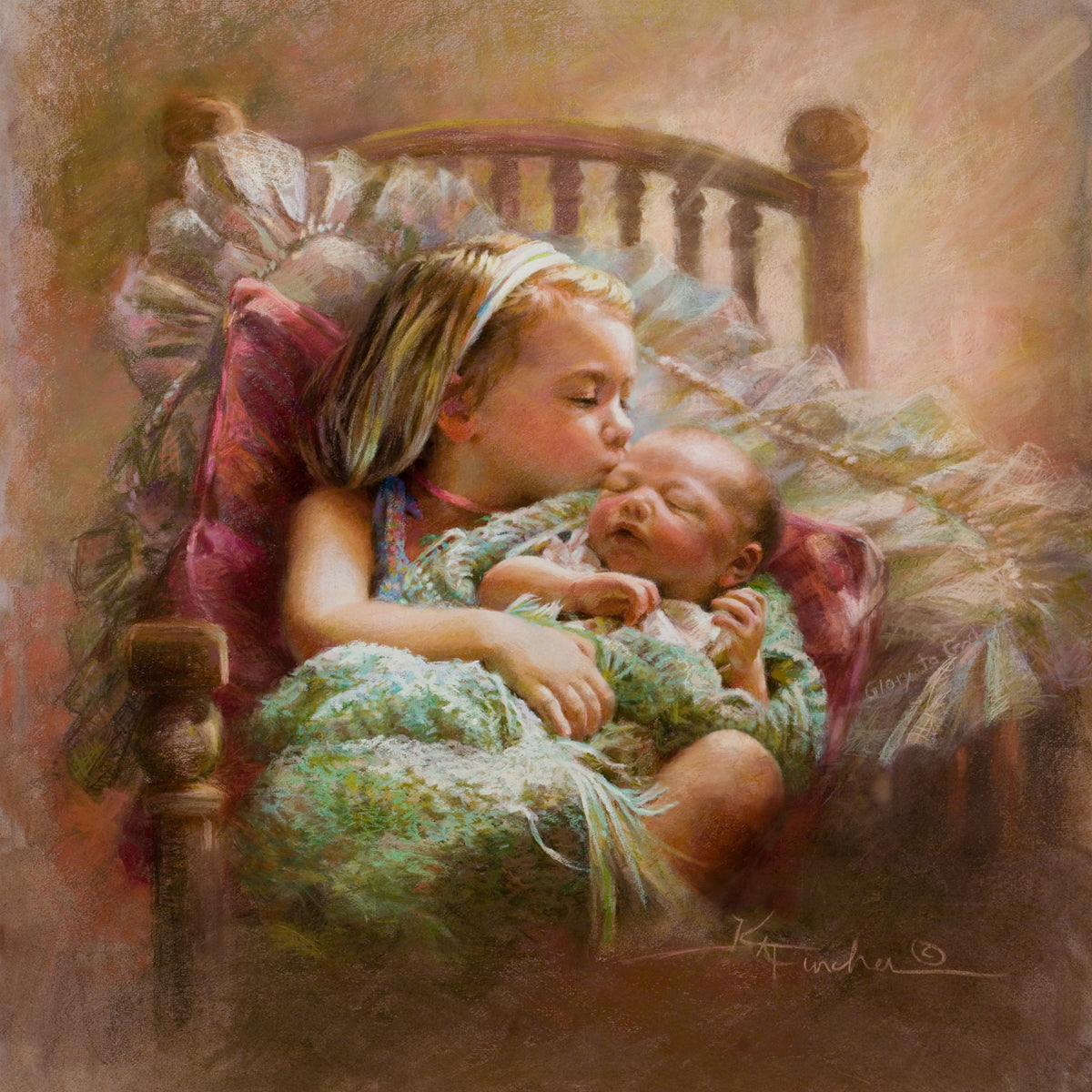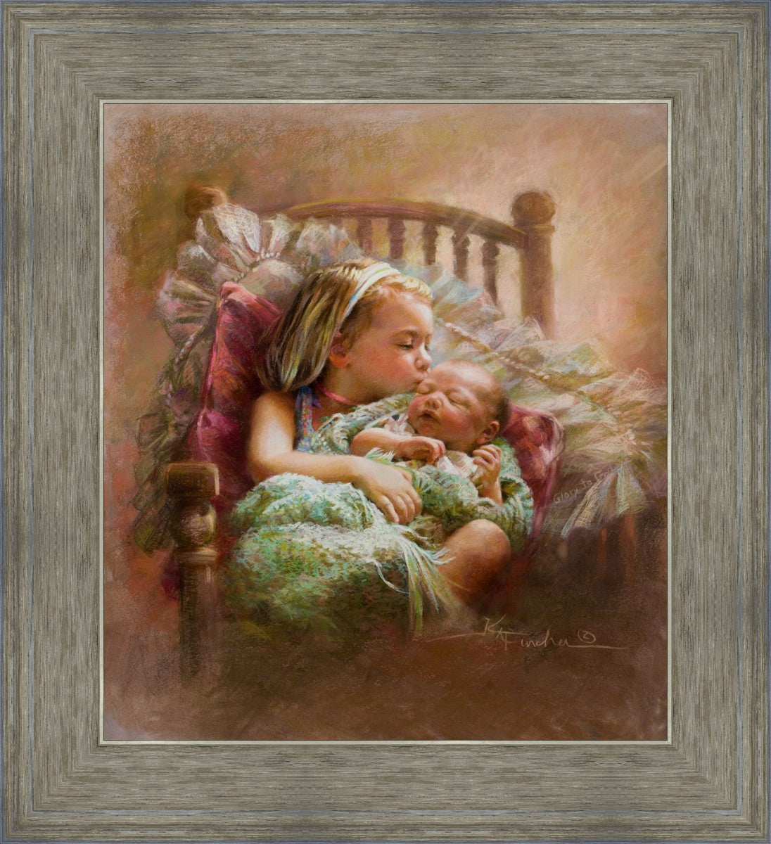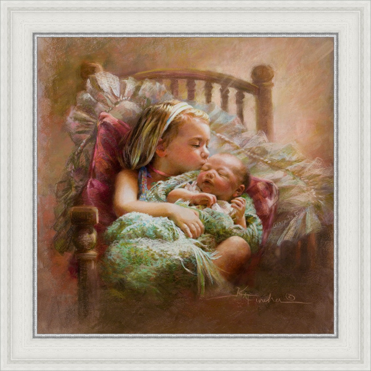 In Fresh from Heaven, an important part of this story lies on the floor, just beyond the painting’s frame. A doll that was once new, now worn from love, is tossed aside at the invitation to hold a living, breathing baby. Mom has prepared the generations-old rocking chair for the introduction. After securing pillows to support and cradle the baby, Mom positions her inquisitive child and places a sleeping baby in her open arms. And … the long-awaited union begins with a kiss.