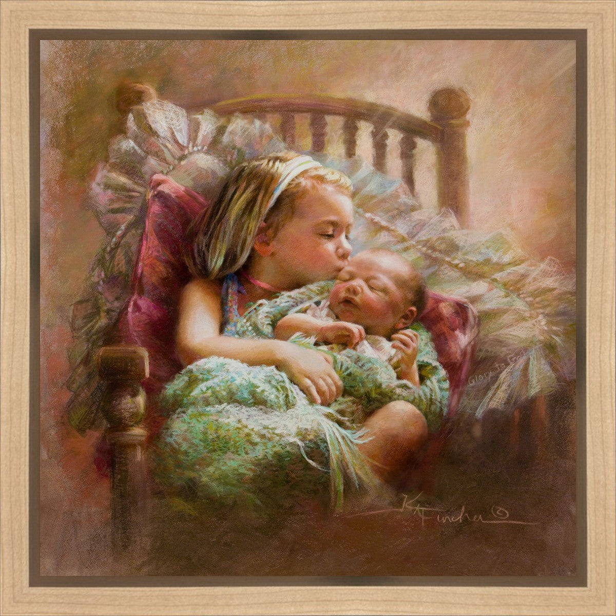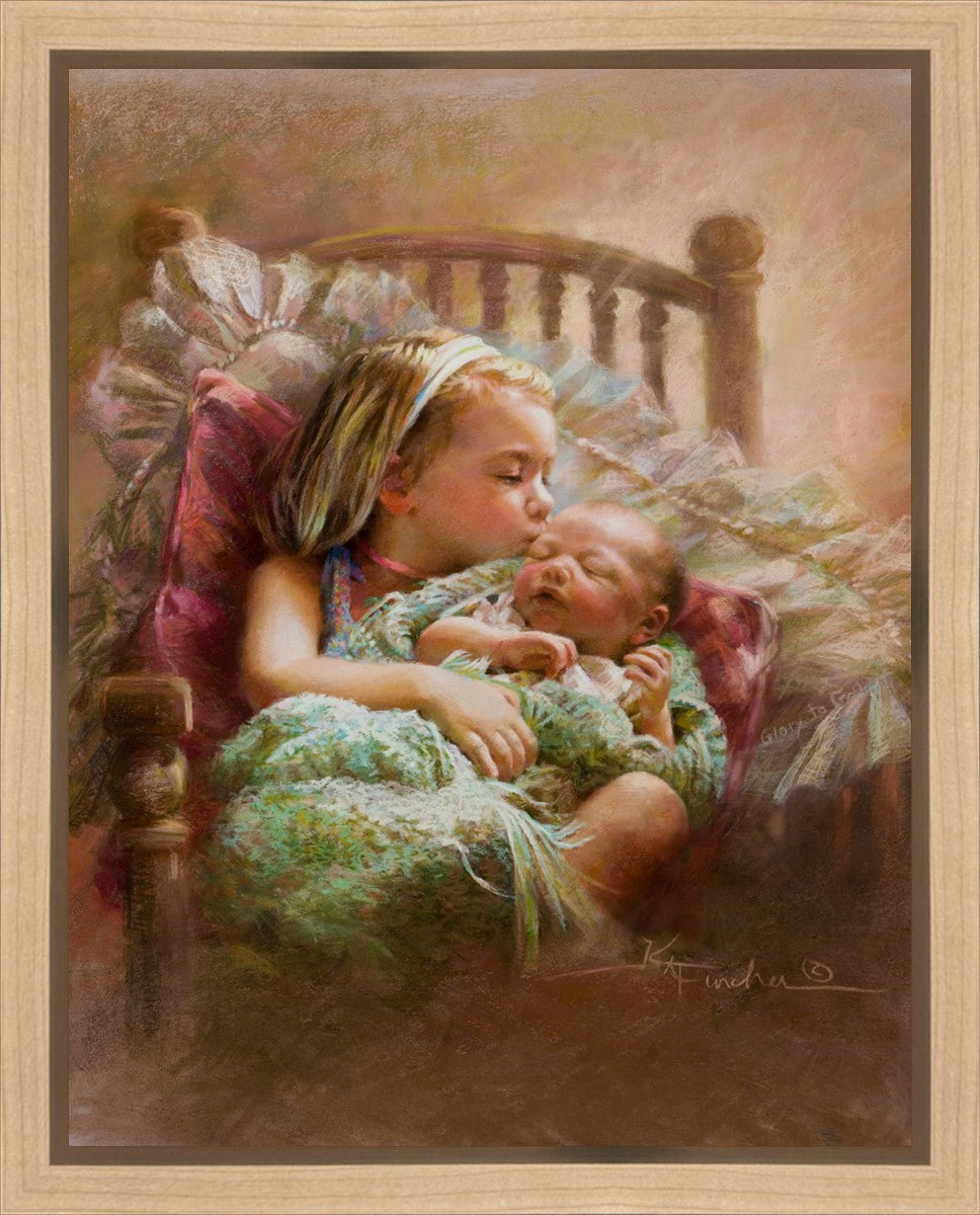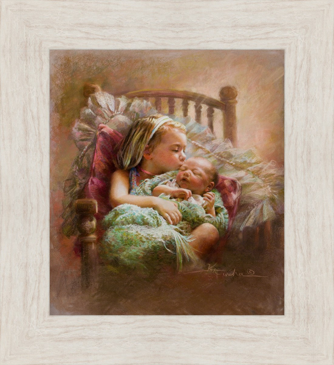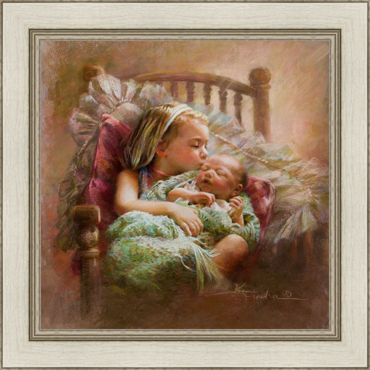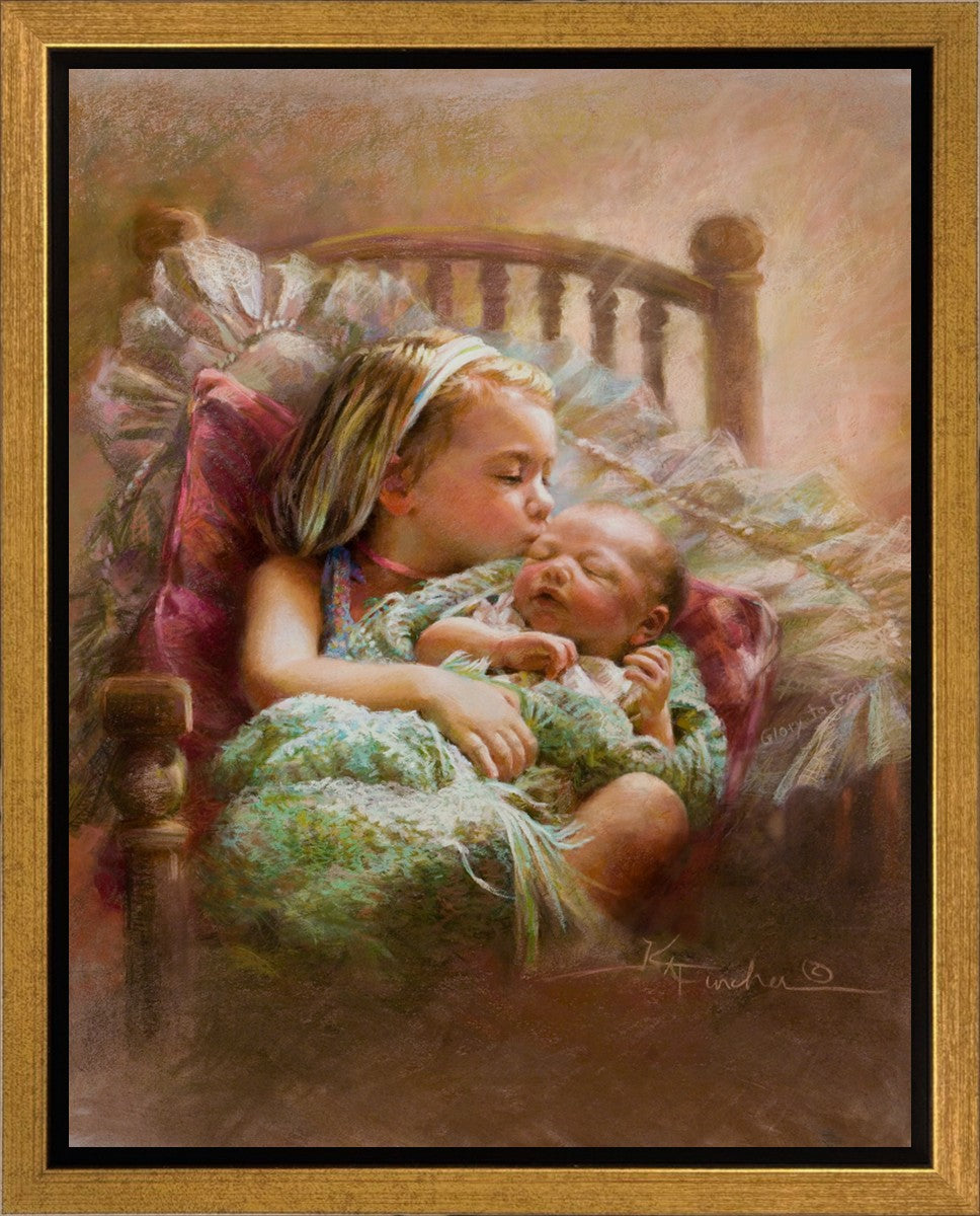 In Fresh from Heaven, an important part of this story lies on the floor, just beyond the painting’s frame. A doll that was once new, now worn from love, is tossed aside at the invitation to hold a living, breathing baby. Mom has prepared the generations-old rocking chair for the introduction. After securing pillows to support and cradle the baby, Mom positions her inquisitive child and places a sleeping baby in her open arms. And … the long-awaited union begins with a kiss.