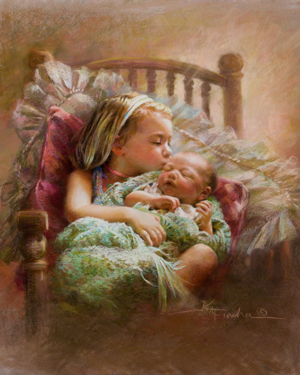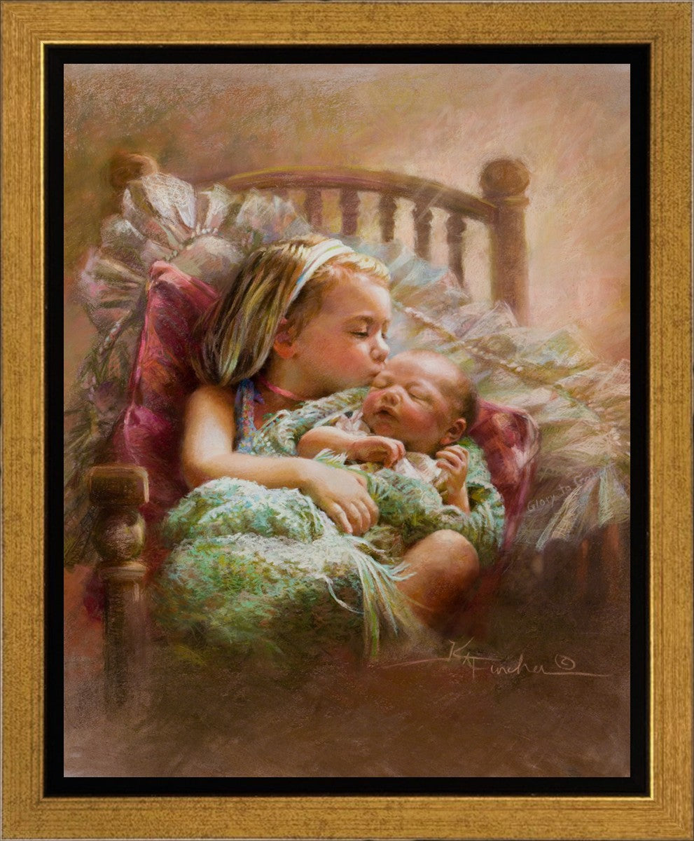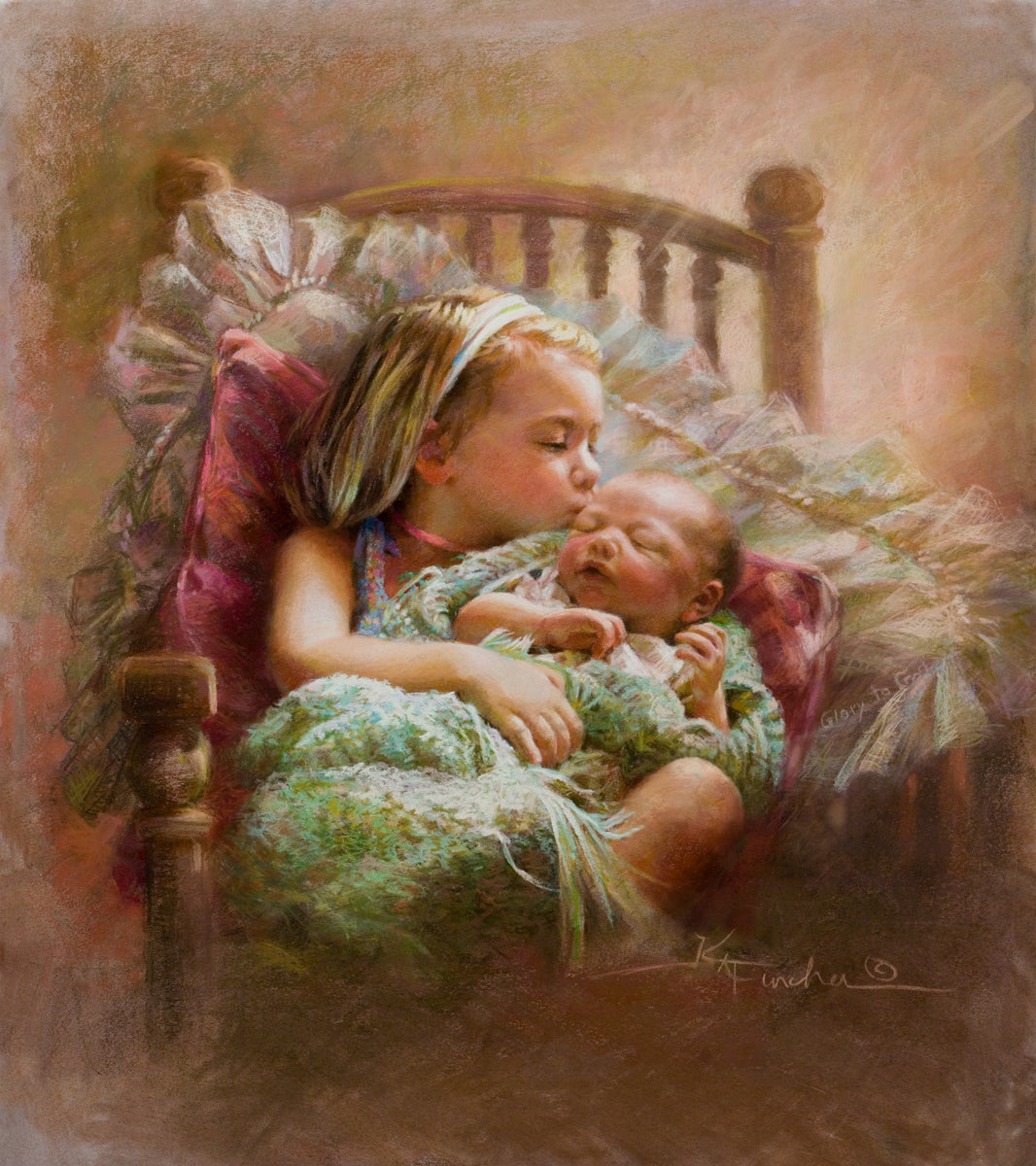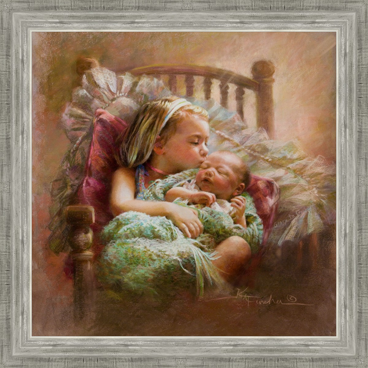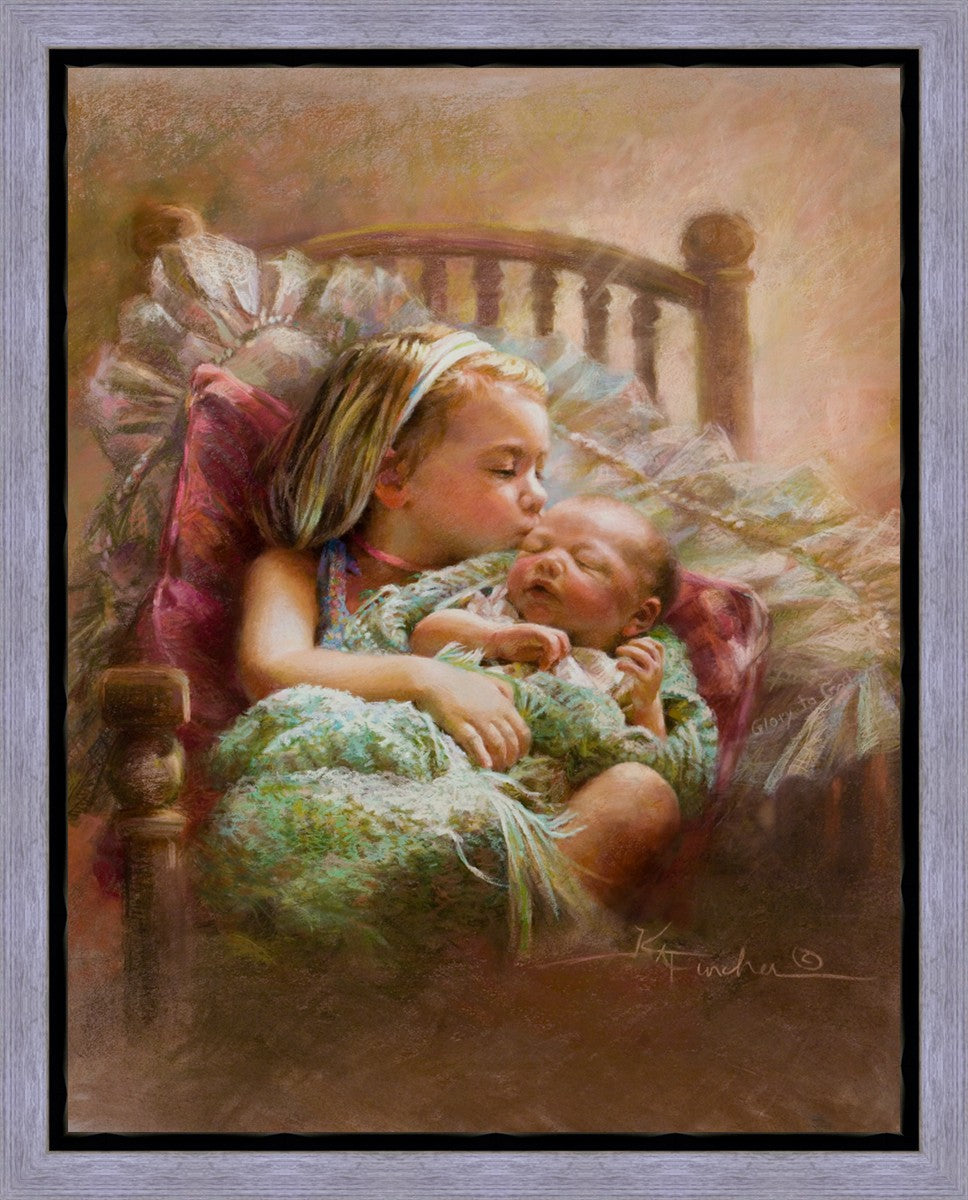 In Fresh from Heaven, an important part of this story lies on the floor, just beyond the painting’s frame. A doll that was once new, now worn from love, is tossed aside at the invitation to hold a living, breathing baby. Mom has prepared the generations-old rocking chair for the introduction. After securing pillows to support and cradle the baby, Mom positions her inquisitive child and places a sleeping baby in her open arms. And … the long-awaited union begins with a kiss.