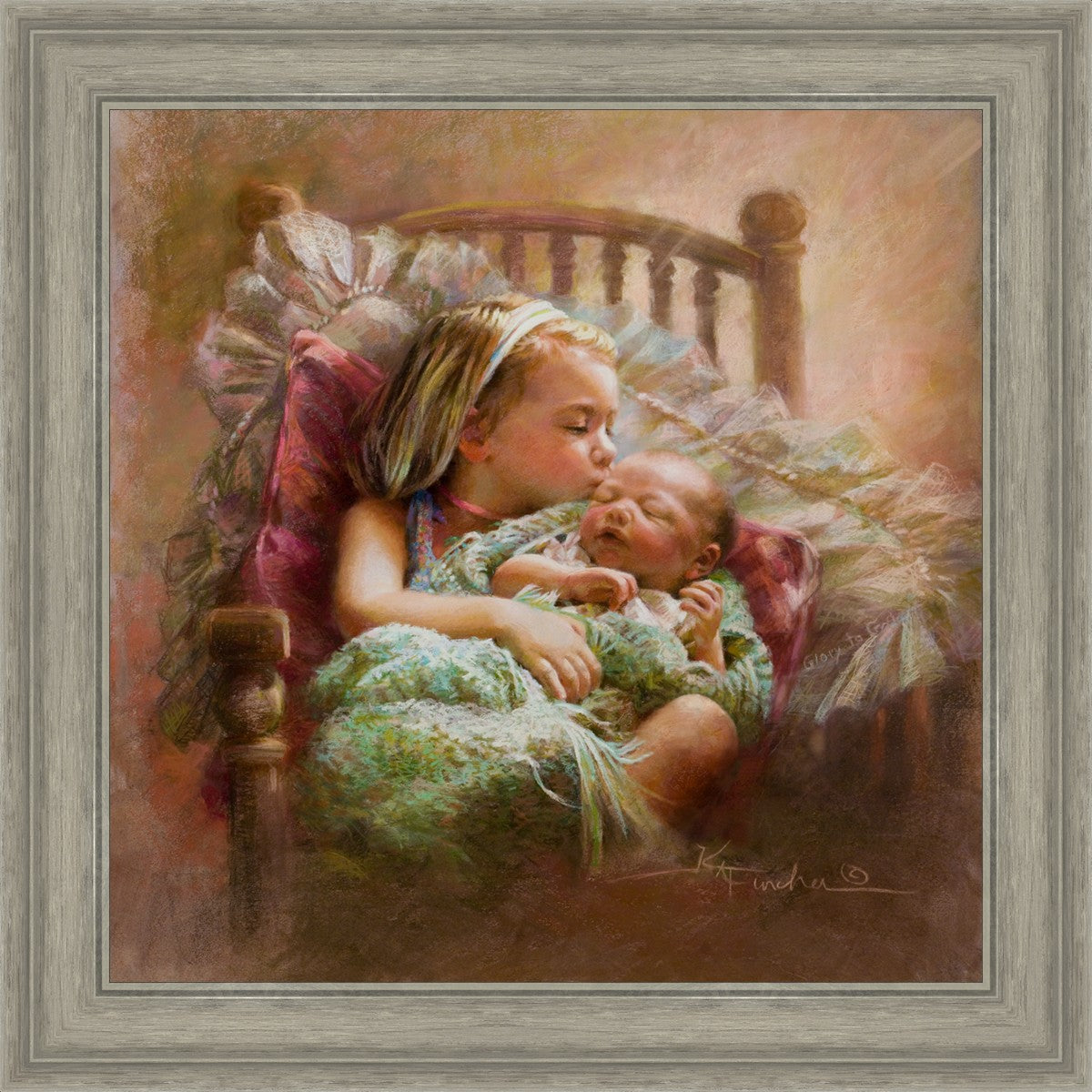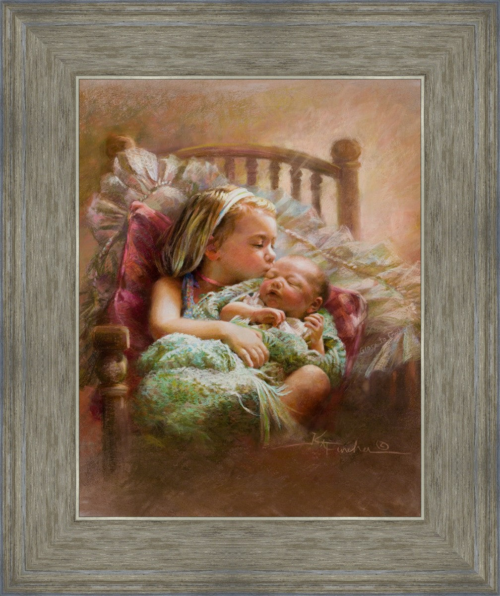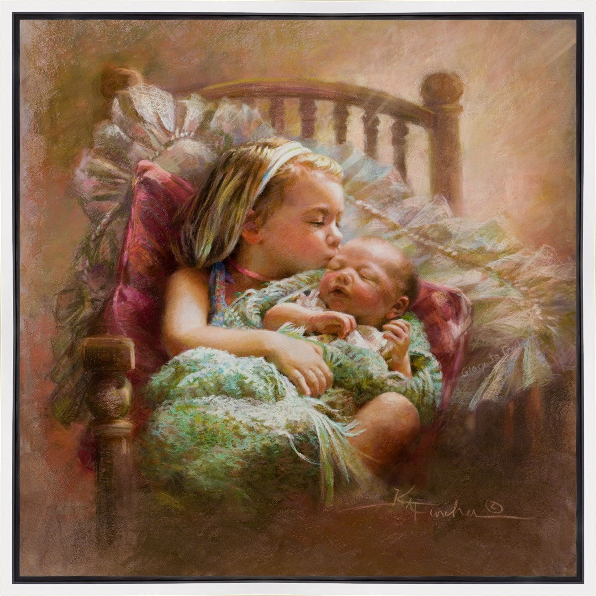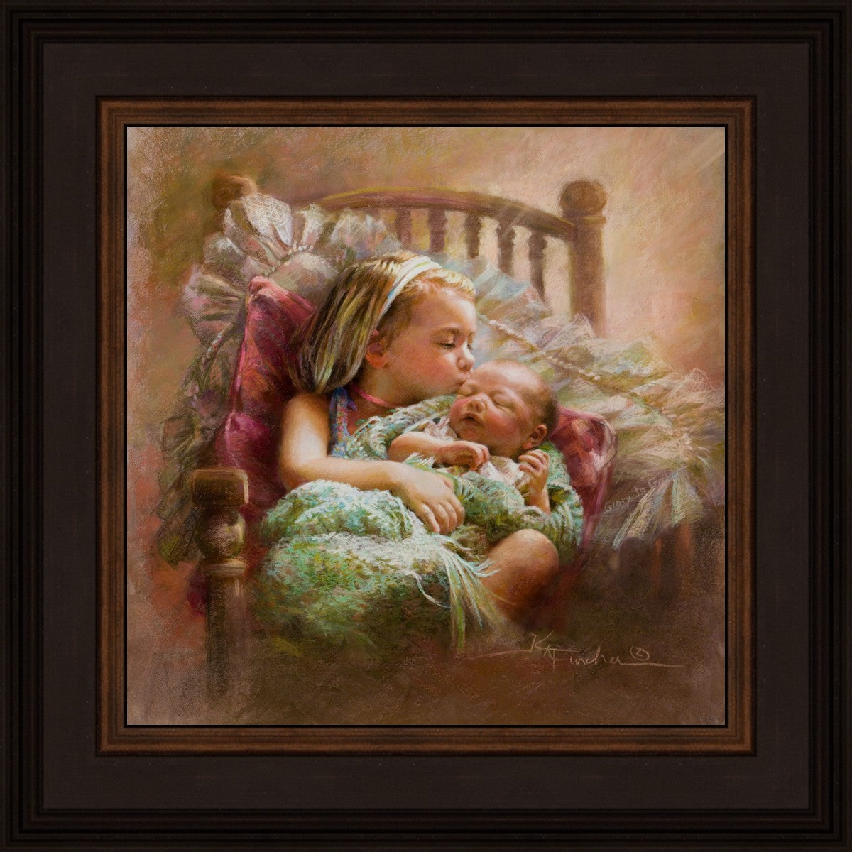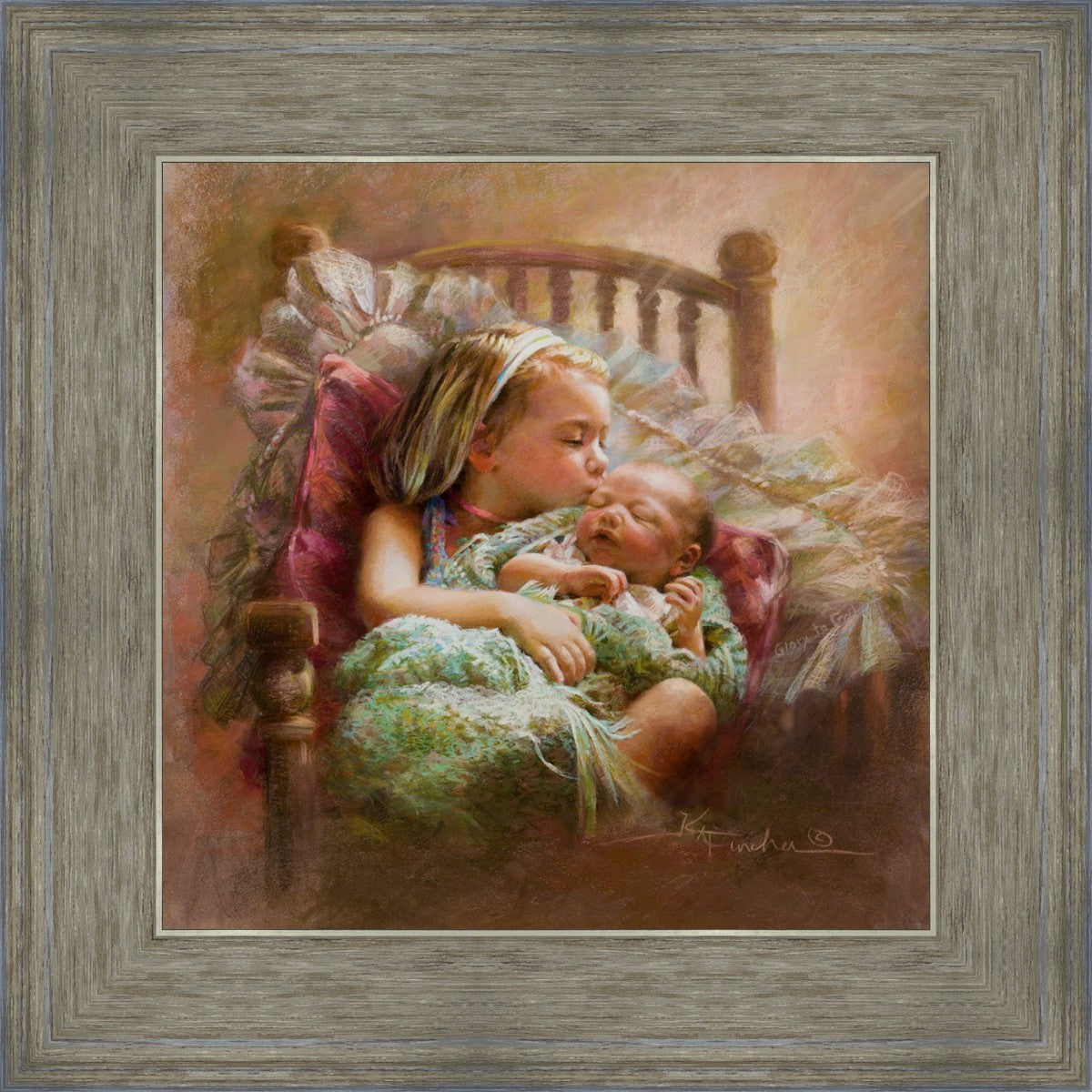 In Fresh from Heaven, an important part of this story lies on the floor, just beyond the painting’s frame. A doll that was once new, now worn from love, is tossed aside at the invitation to hold a living, breathing baby. Mom has prepared the generations-old rocking chair for the introduction. After securing pillows to support and cradle the baby, Mom positions her inquisitive child and places a sleeping baby in her open arms. And … the long-awaited union begins with a kiss.