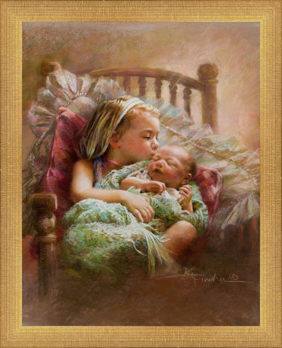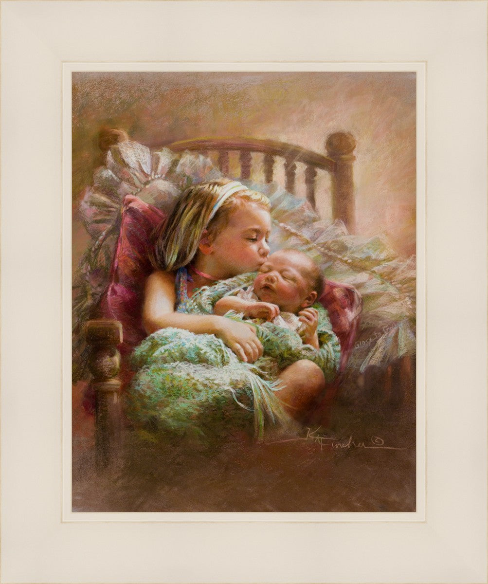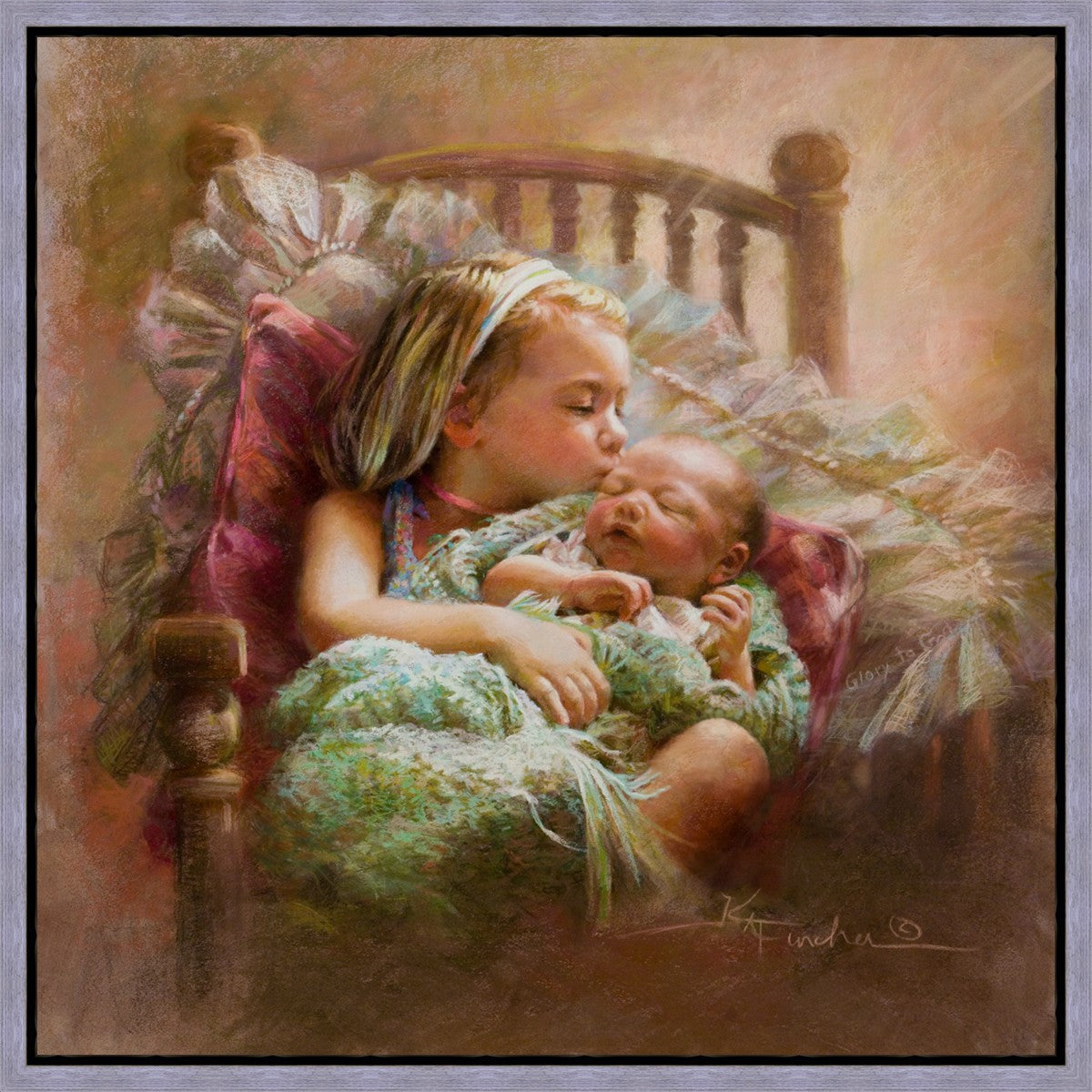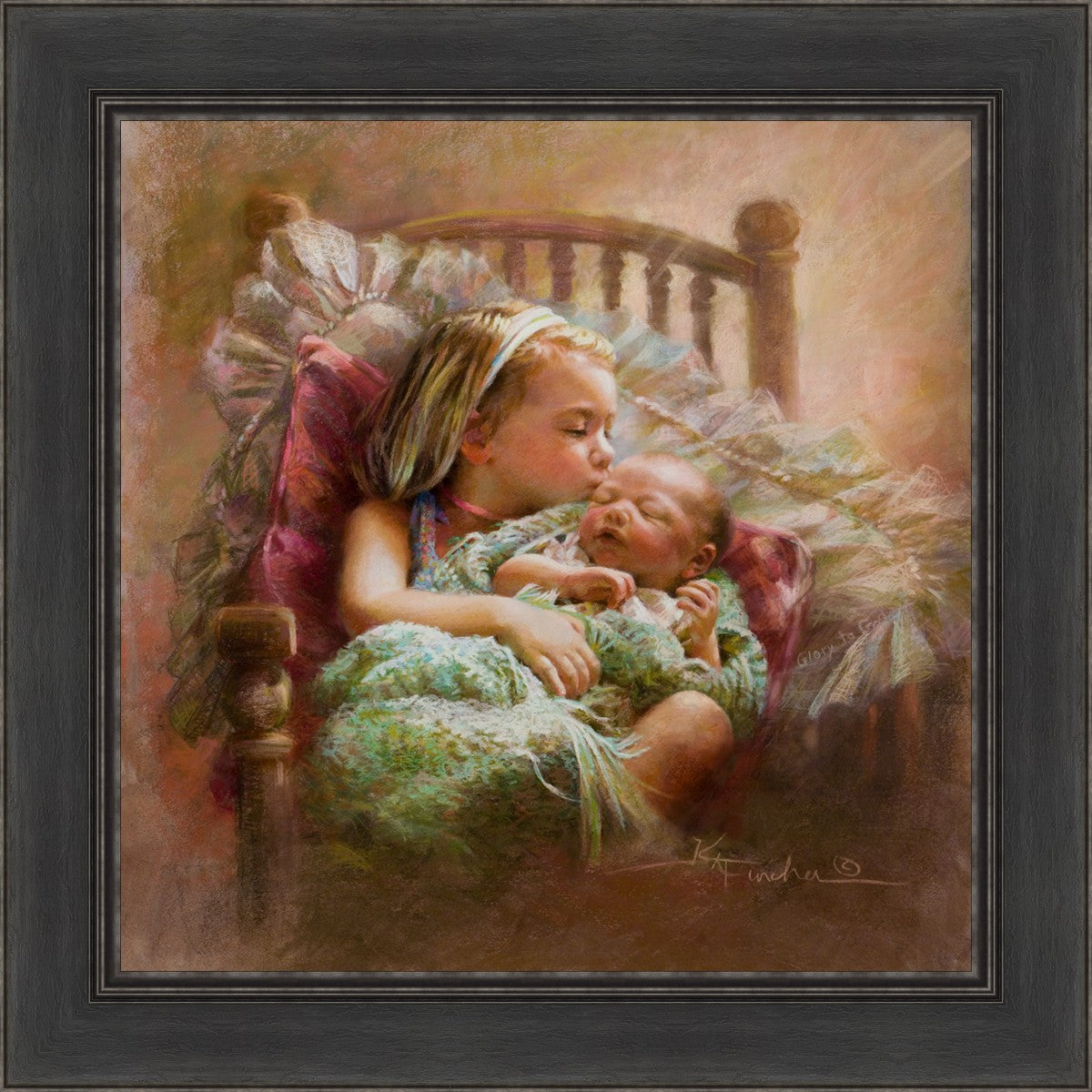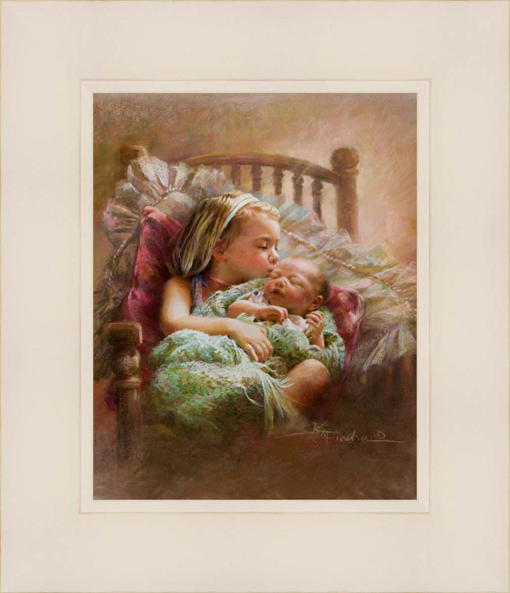In Fresh from Heaven, an important part of this story lies on the floor, just beyond the painting’s frame. A doll that was once new, now worn from love, is tossed aside at the invitation to hold a living, breathing baby. Mom has prepared the generations-old rocking chair for the introduction. After securing pillows to support and cradle the baby, Mom positions her inquisitive child and places a sleeping baby in her open arms. And … the long-awaited union begins with a kiss.